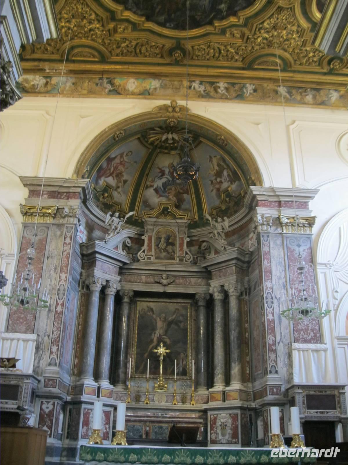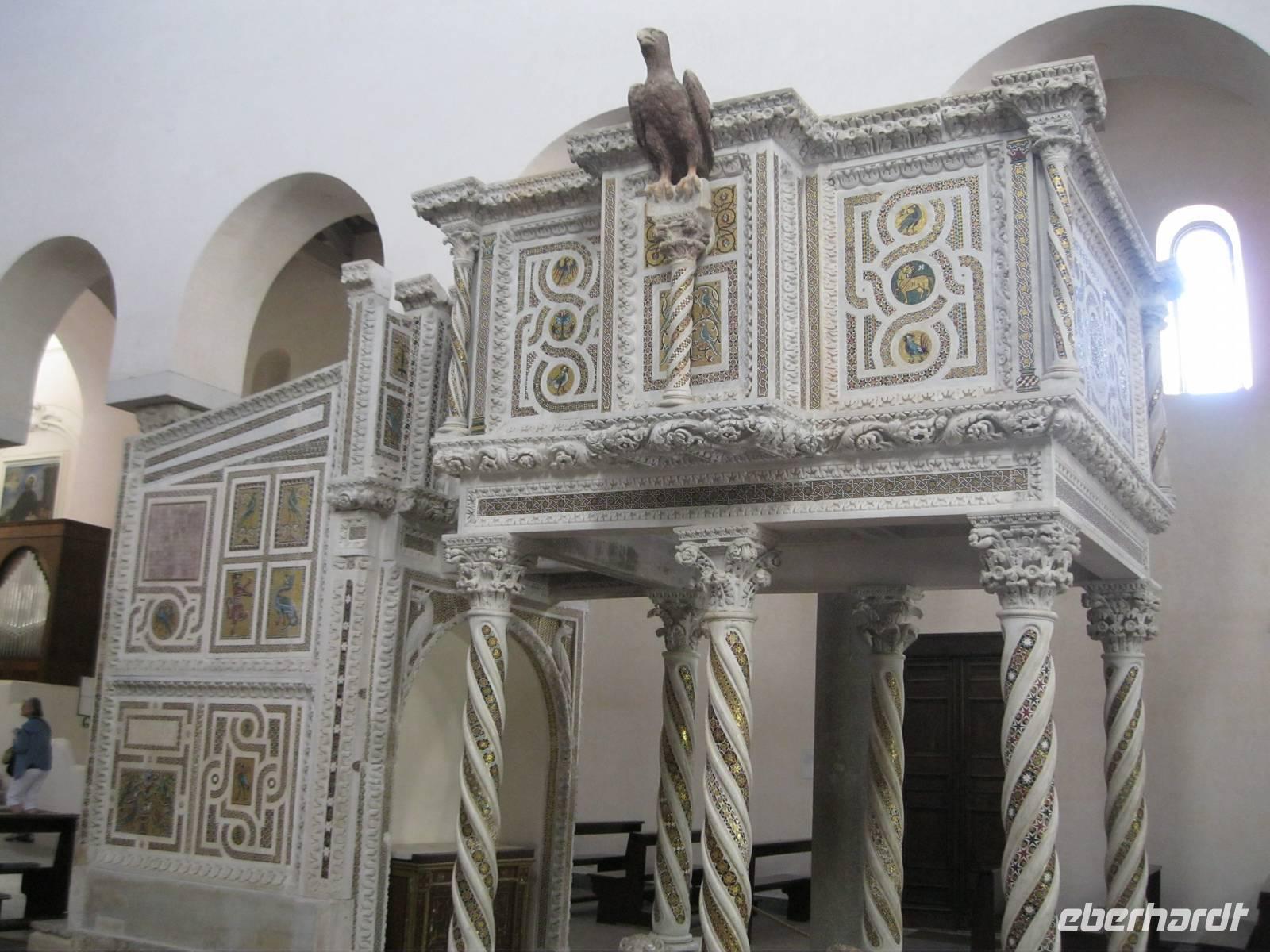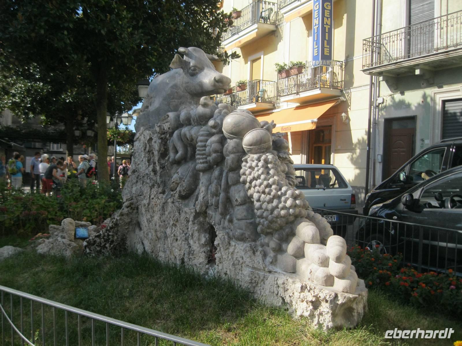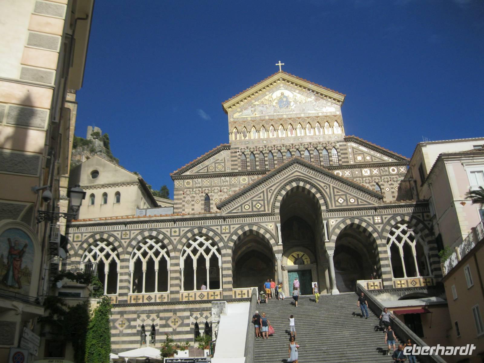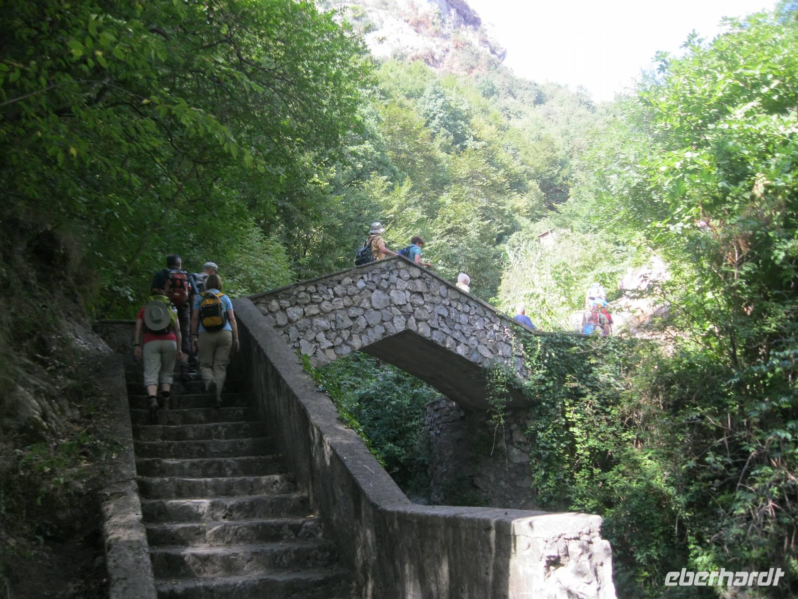 Gegen 09.00 Uhr verließen wir das Hotel in Richtung Hafen und trafen unsere Wanderreiseleiterin Anna. Mit dem Bus fuhren wir ins Zentrum von Amalfi und am Denkmal von Flavio Gioia, dem vermeintlichen Erfinder des Kompasses, stiegen wir aus. Anna führte uns vom Hafen über den Domplatz, weiter durch die engen Gassen, wo sich die vielen Geschäfte aneinanderreihten, zur Papiermühle. Es wurden uns alle historischen Arbeitsschritte der Papierherstellung vorgeführt. Es gäbe heute noch Aufträge vom Papst für dieses handgeschöpfte Papier. Abschließend stiegen wir auf einem Treppenweg, Richtung Pontone bergan. Unterwegs tranken wir in einer Hazienda Zitronenwasser auf Eis. Lecker! Am Wasserfall (mit der Beschilderung zum Naturschutzgebiet) wurde kurz Rast gemacht. Wir erreichten die Piazza in Pontone und stärkten uns mit Hausmannskost. Teilweise über steile Treppen und Wege passierten wir die Brücke (Ponte) und erreichten wieder Amalfi. Der Domplatz und die Domtreppen luden zum Verweilen ein. Vorher wollten wir den imposanten Dom von innen betrachten und Anna übernahm die Führung. Unsere Wanderschuhe wurden von einigen Leuten belächelt. Trotzdem hatten wir einen schönen ersten Wandertag. Beim Abendessen gaben wir eine Sammelbestellung für Getränke und Speisen auf und regelten auch die Abkassierung. Dieses "System" behielten wir die ganze Woche bei und einigten uns auf ein freundschaftliches DU. Dieses wurde mit einem Feuerwerk besiegelt.