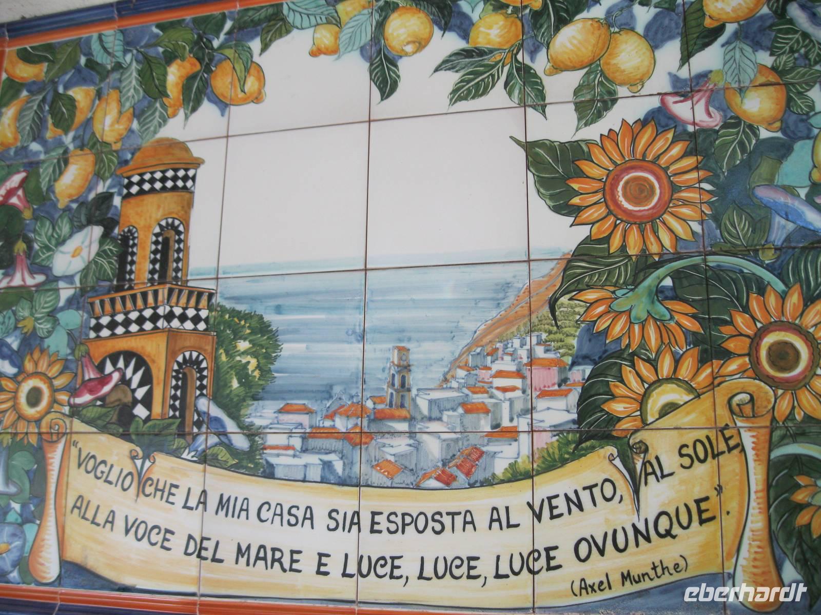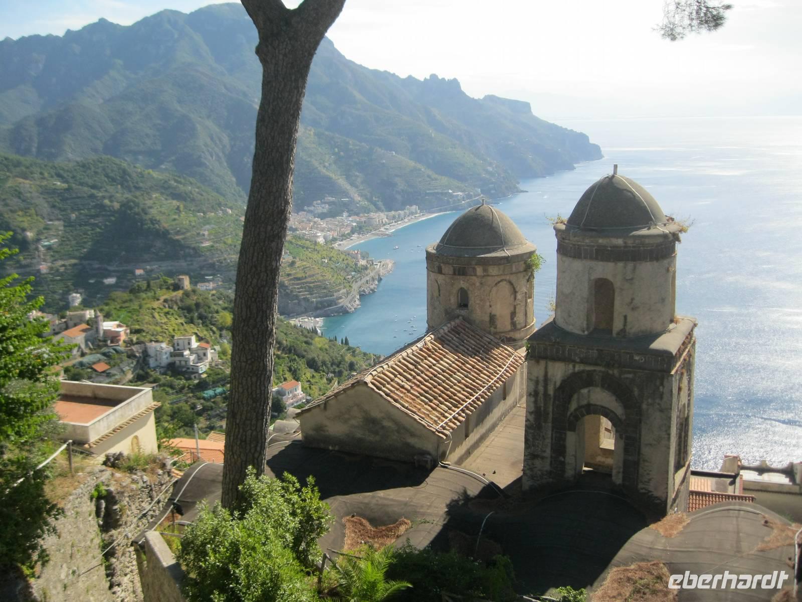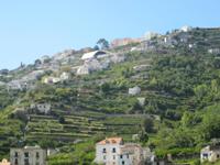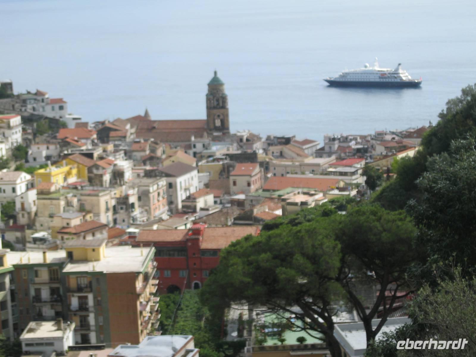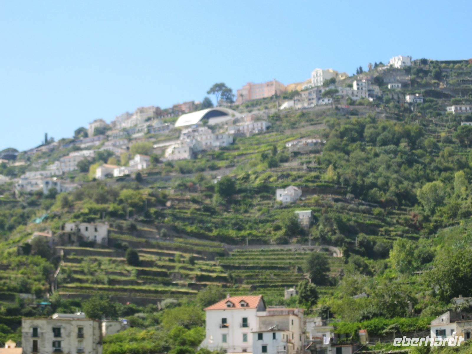 Der Bus brachte uns nach Ravello und setzte uns vor dem Stadttor ab. Von dort hatten wir einen schönen Blick auf das Auditorium, welches vom brasilianischen Stararchitekten Oscar Niemeyer entworfen wurde.(Kosten...nicht ganz billig !!!) Auf dem Piazza Duomo trafen wir Anna und besichtigten zuerst den Dom mit den beachtenswerten Bronzetüren, auf denen die Leidensgeschichte Christi nachgestellt wurde. In der Kapelle St.Pantaleon wird das Blut des Heiligen aufbewahrt. Danach besuchten wir die im sarazenischen Stil gestaltete Villa Rufolo. Der Ausblick auf die Küste, unser Städtchen Minori und den Golf von Salerno ist herrlich. In den Sommermonaten finden hier Konzerte statt. In den Gärten der Villa fand Richard Wagner 1880 die Inspiration für das Bühnenbild seiner Oper Parzival, den Garten Klingsors. Danach hatten wir Zeit, uns im romantischen Gebirgsstädtchen umzusehen. Über die Treppen ging es hinunter in Richtung Minori. Immer wieder hatten wir einen tollen Blick auf die Küste. Bei einem Weinbauern wurden wir zu einem "Probier - Schluck" eingeladen. Es war ein Rosé und schmeckte recht frisch. Anna erzählte viel über Umgebung, Früchte und Natur. Endlich erreichten wir unser Agriturismo "Villa Maria"oberhalb von Minori aber wir mussten noch einen steilen Wiesenweganstieg überwinden. Von der Veranda aus hatten wir eine herrliche Aussicht auf das Mittelmeer und Minori. Belohnt wurden wir auch mit einem tollen Essen. Unser Wanderfreund Wolfgang dankte im Namen der Gruppe mit einer Widmung für die Gastfreundschaft ins Gästebuch. Wir mussten natürlich die vielen Treppen wieder hinunter, um ins Hotel zu gelangen.