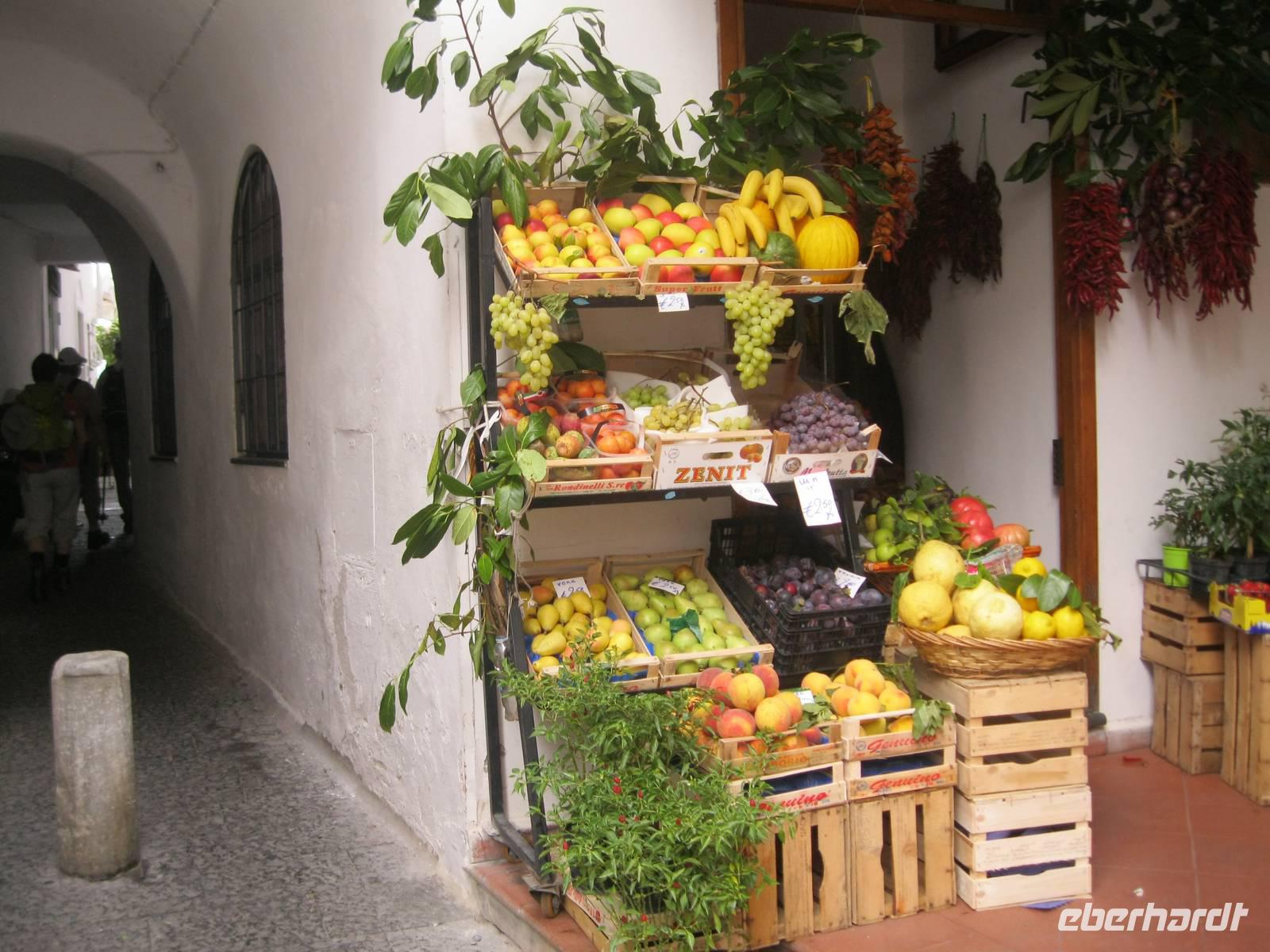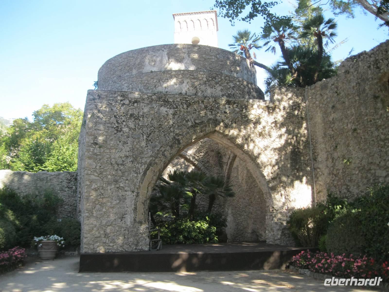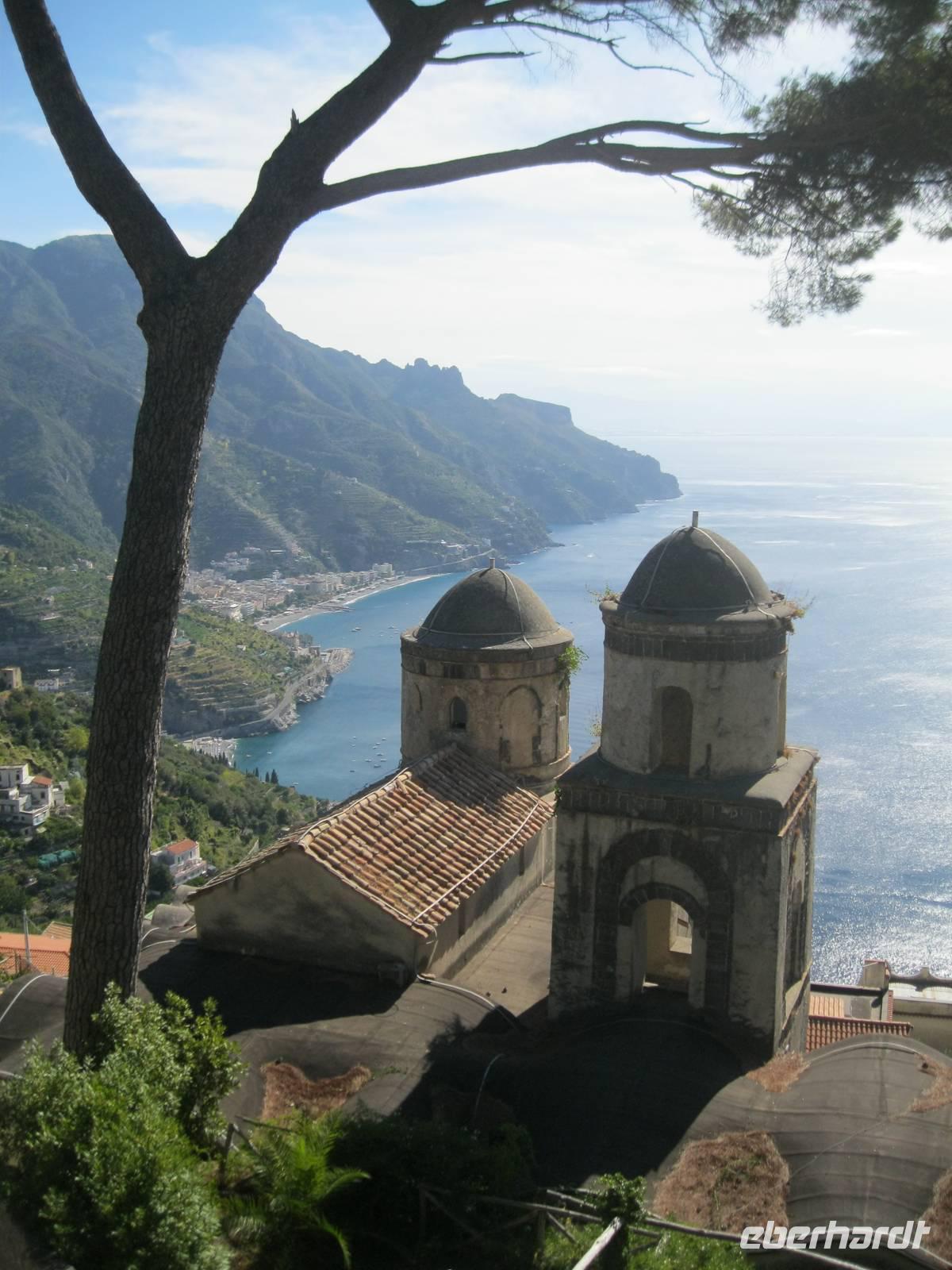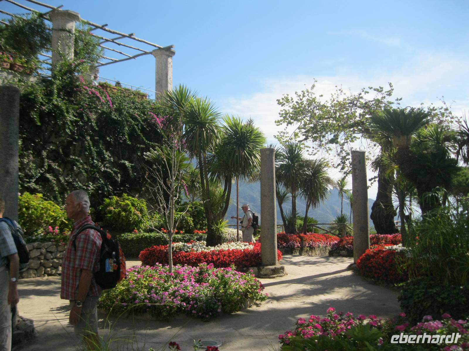 Der Bus brachte uns nach Ravello und setzte uns vor dem Stadttor ab. Von dort hatten wir einen schönen Blick auf das Auditorium, welches vom brasilianischen Stararchitekten Oscar Niemeyer entworfen wurde.(Kosten...nicht ganz billig !!!) Auf dem Piazza Duomo trafen wir Anna und besichtigten zuerst den Dom mit den beachtenswerten Bronzetüren, auf denen die Leidensgeschichte Christi nachgestellt wurde. In der Kapelle St.Pantaleon wird das Blut des Heiligen aufbewahrt. Danach besuchten wir die im sarazenischen Stil gestaltete Villa Rufolo. Der Ausblick auf die Küste, unser Städtchen Minori und den Golf von Salerno ist herrlich. In den Sommermonaten finden hier Konzerte statt. In den Gärten der Villa fand Richard Wagner 1880 die Inspiration für das Bühnenbild seiner Oper Parzival, den Garten Klingsors. Danach hatten wir Zeit, uns im romantischen Gebirgsstädtchen umzusehen. Über die Treppen ging es hinunter in Richtung Minori. Immer wieder hatten wir einen tollen Blick auf die Küste. Bei einem Weinbauern wurden wir zu einem "Probier - Schluck" eingeladen. Es war ein Rosé und schmeckte recht frisch. Anna erzählte viel über Umgebung, Früchte und Natur. Endlich erreichten wir unser Agriturismo "Villa Maria"oberhalb von Minori aber wir mussten noch einen steilen Wiesenweganstieg überwinden. Von der Veranda aus hatten wir eine herrliche Aussicht auf das Mittelmeer und Minori. Belohnt wurden wir auch mit einem tollen Essen. Unser Wanderfreund Wolfgang dankte im Namen der Gruppe mit einer Widmung für die Gastfreundschaft ins Gästebuch. Wir mussten natürlich die vielen Treppen wieder hinunter, um ins Hotel zu gelangen.