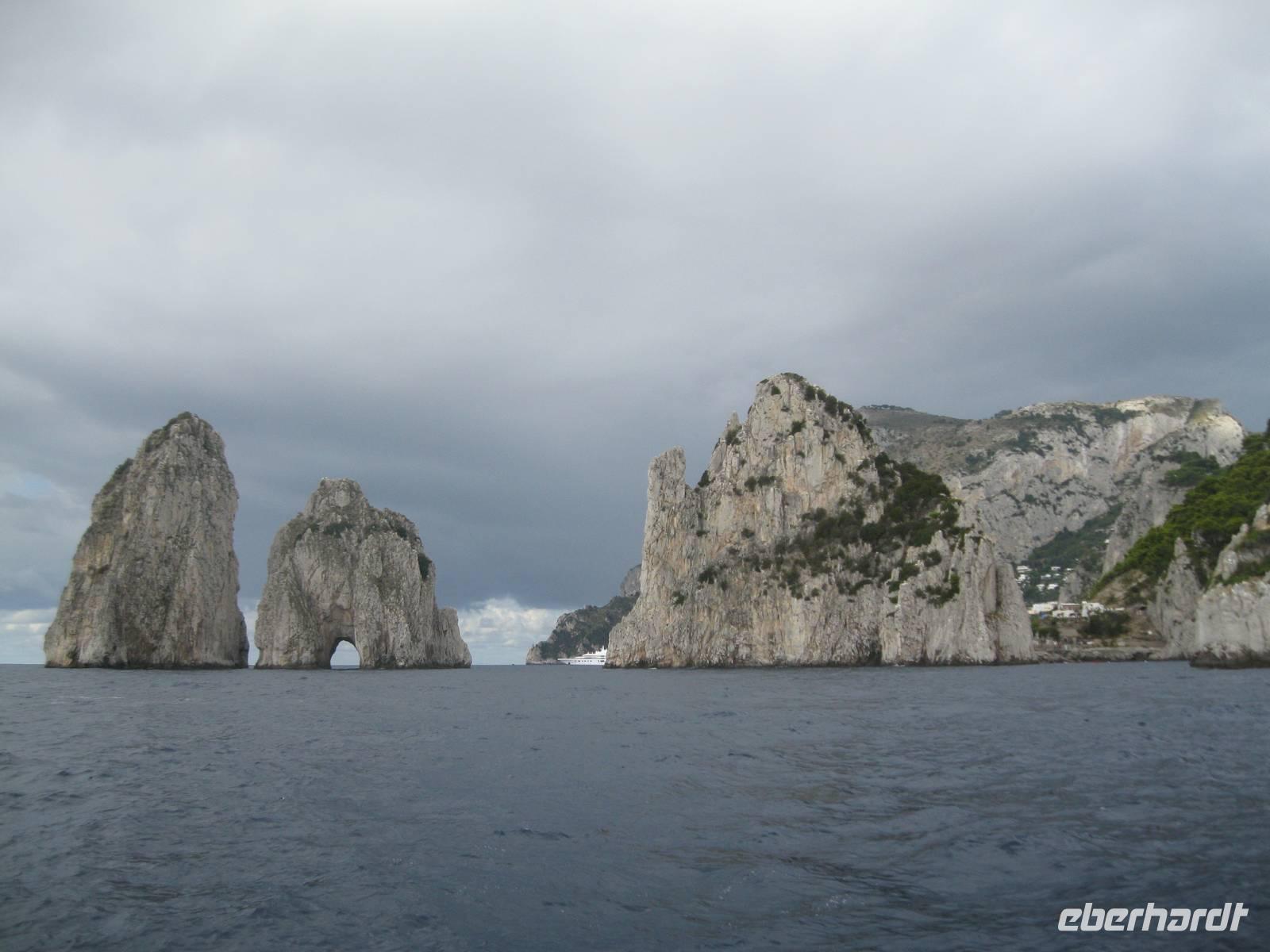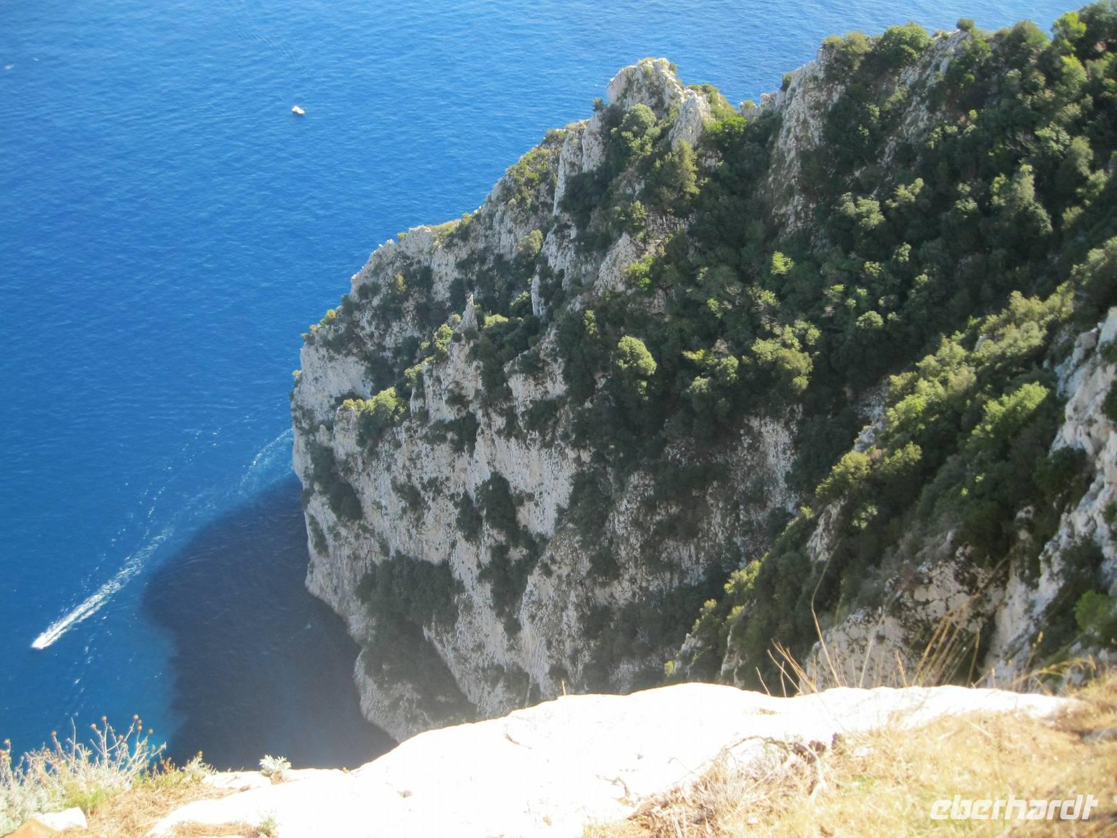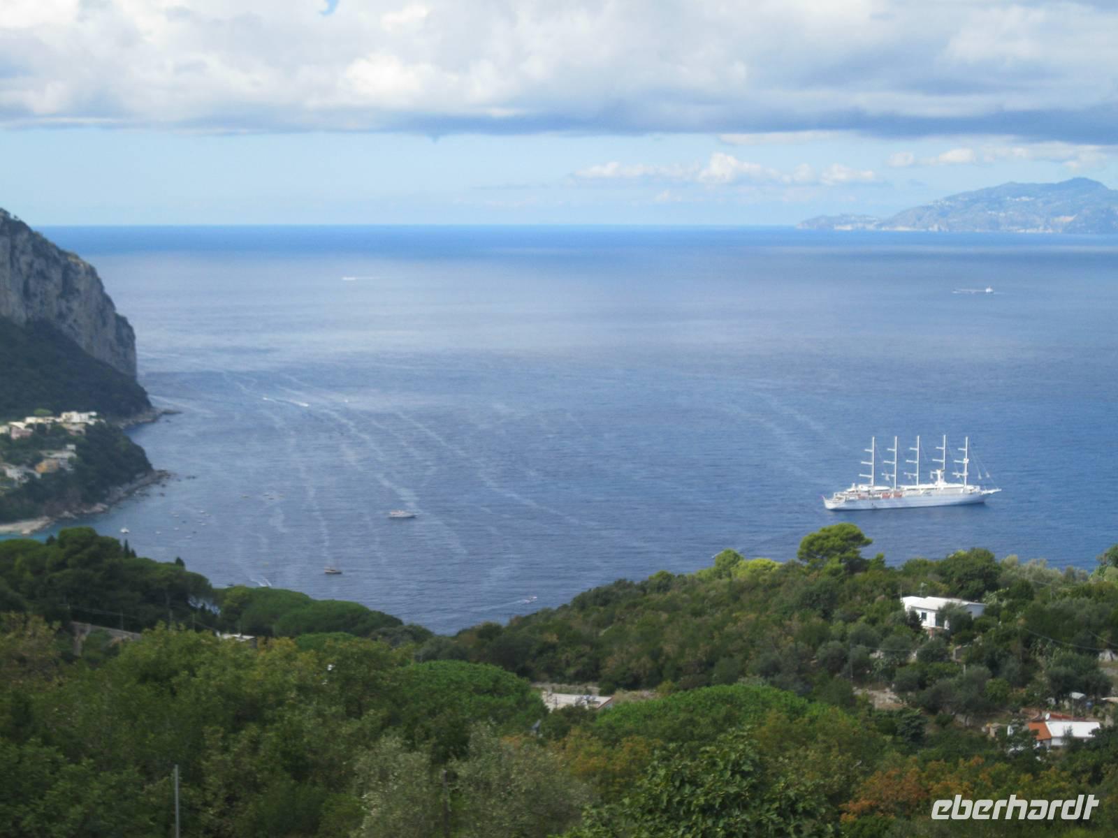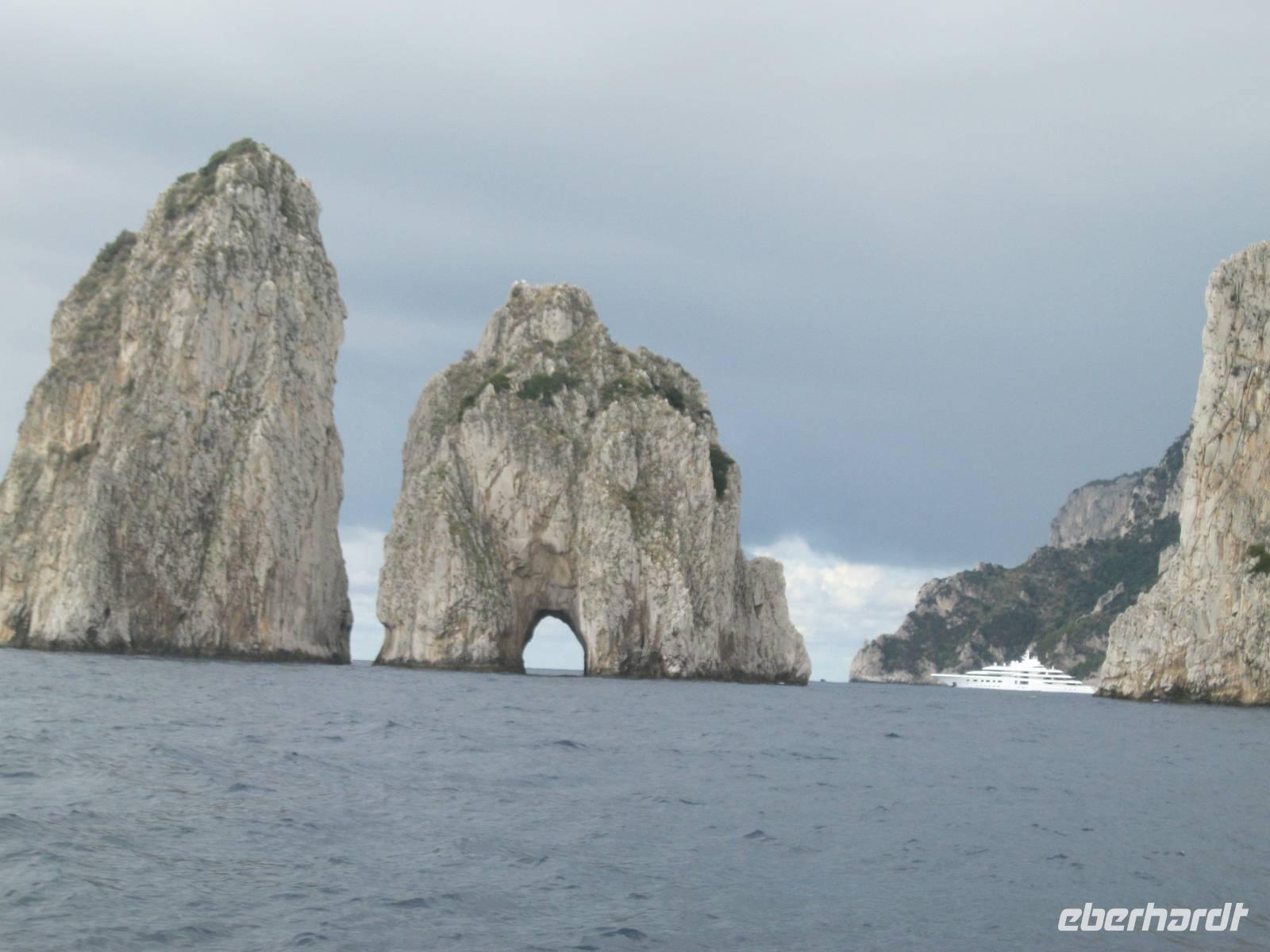 Auch heute nutzten wir den Seeweg. Mit einem Privatboot fuhren wir direkt nach Capri und legten im Hafen "Marina Grande"an. Eigentlich wollten wir mit der Funicolare hinauf nach Capri-Stadt. Aufgrund der Menschenmassen, die wohl das Gleiche vorhatten, entschlossen wir uns zu laufen (wir waren doch eine Wandergruppe). Nach einer kleinen Erkundung, wobei Anna Erläuterungen gab, setzten wir unseren Weg Richtung Villa Jovis fort. Unterwegs leisteten wir uns einen Espresso und genossen das Flair Capris. Nach dem Rundgang durch das Areal der Villa Jovis, picknickten wir auf diesem Gelände. Die dort lebenden Ziegen hatten nur darauf gewartet und belagerten uns sofort. Wir setzten unsere Wanderung zur Felsformation "Arco Naturale" fort. Später liefen wir auch die Treppen zum Hafen wieder hinunter und beobachteten dort das bunte Treiben der Touristen. Mit dem Boot ging es auch wieder zurück nach Minori. Hier verabschiedeten wir uns herzlich von Anna.