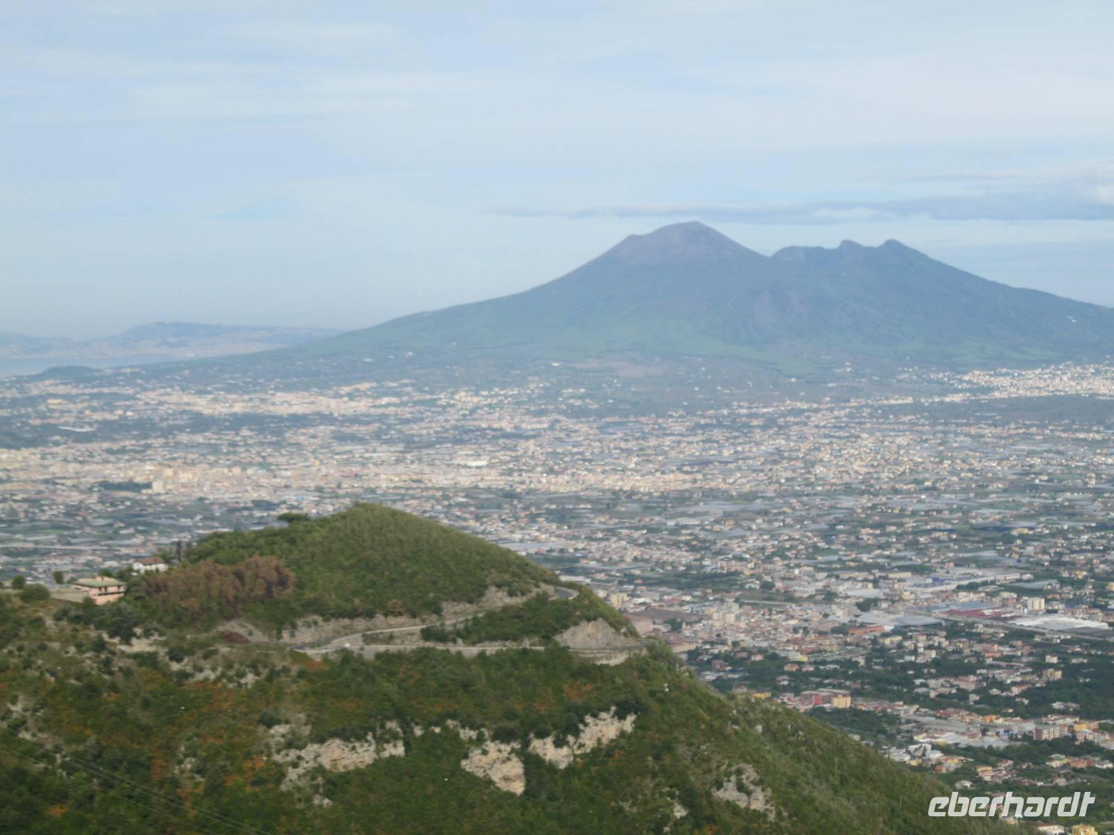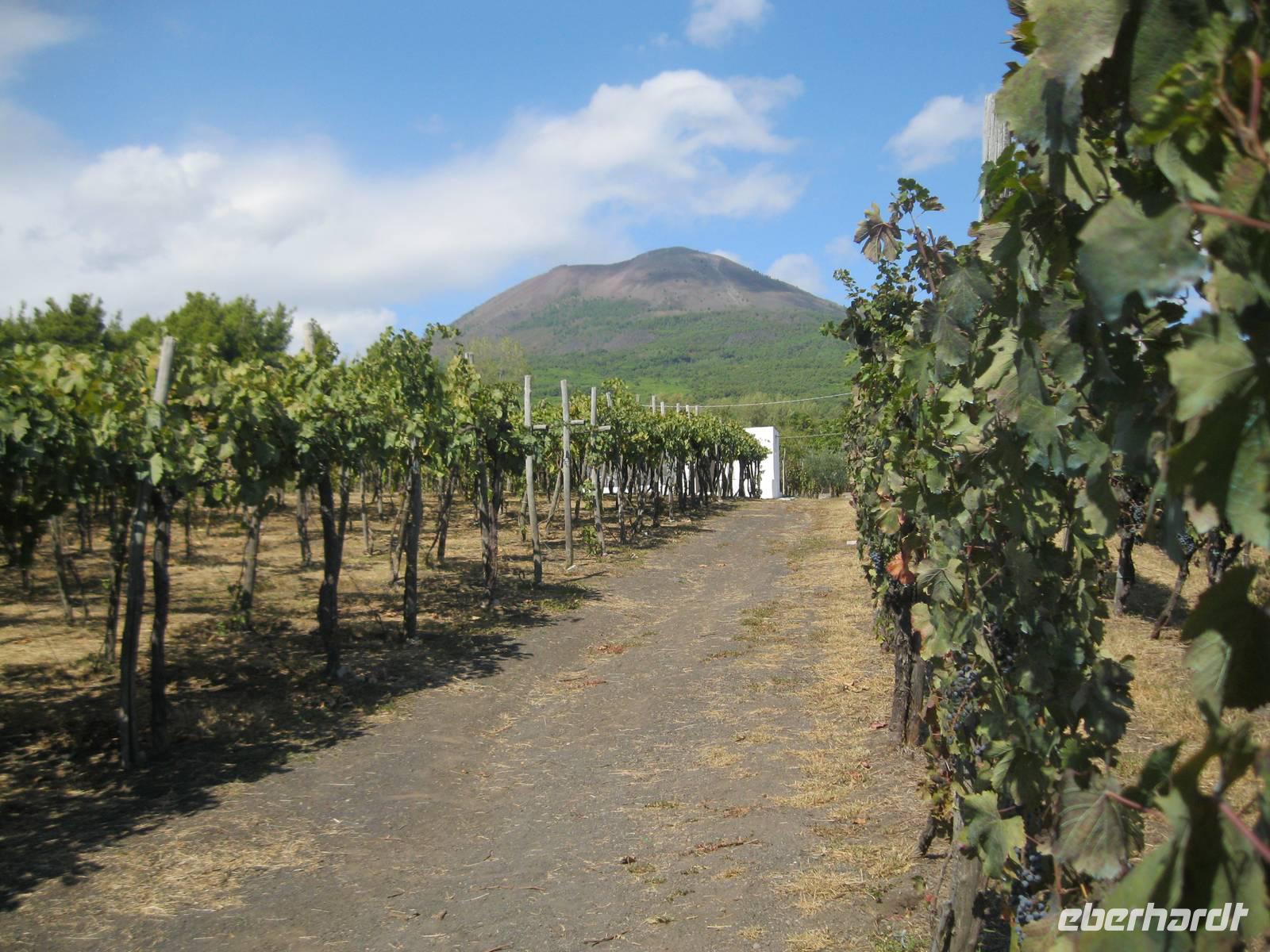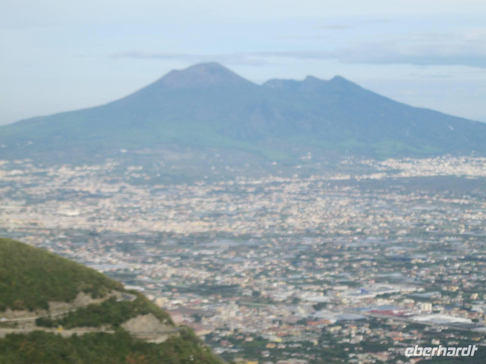 Das Wetter war trocken und der Himmel wolkenlos. Einfach toll. Wir fuhren die Amalfitana vorbei an Vietri, Richtung Salerno. Auf der Küstenfahrt erzählte uns Kerstin viel über die Geschichte und Sehenswürdigkeiten der Region. In Pompeji erwartete uns Anna und nachdem wir alle mit Eintrittskarten und Audiogeräten ausgestattet waren, ging es in die Ruinenstadt. Pompeji war für uns alle eine Zeitreise in die römische Antike. Anna gab zu den geschichtsträchtigen Ruinen exakte Erklärungen. Danke! So viel Geschichte macht müde Beine. Die konnten wir jetzt ganz entspannt, nach einer kleinen Führung im Weingut "Cantina del Vesuvio", ausruhen. Von hieraus hatten wir einen ganz klaren Blick auf den Gipfel des Vesuvs. Der schlafende Feuerberg steht als Nationalpark und UNESCO -Biosphärenreservat unter Naturschutz. Wir wollten ja noch ganz nach oben. Also nahmen wir einen letzten Schluck Wein und los ging es. Am Parkplatz Vesuv herrschte jedoch leichter Nebel, der sich immer mehr zuzog. Von der Kontrollstelle führte ein ziemlich sandiger und relativ steiler Weg zum Gipfel. Als wir diesen erreicht hatten, konnten wir Neapel im Tal nicht sehen. Am Kraterrand konnten wir aber in den "Schlund des Vesuvs" hinein schauen. Auf dem Grund des "Schlundes" wuchsen Gras und kleine Sträucher. Die Wissenschaft begründet dies, dass verfestigte Magma die Schlotöffnung verschließt. Wann der Vesuv wieder "speien"sollte, wissen nur San Gennaro und hoffentlich rechtzeitig die Experten vom Observatorium auf dem Berg. Auf der Rückfahrt ging noch ein heftiger Regenguss nieder. Eine schwarze Wolke hatte sich auf den Gipfel des Vesuvs gesetzt. Am Abend war "Pizza Party". Als unsere "Tischgesellschaft" das 4.Riesen-Tablett kommen sah, protestierten wir. Wie im Märchen, bekamen wir keinen Bissen mehr runter. Statt Nachtisch gab es Kräuterschnaps!!! Ernesto, unser Wanderführer für den morgigen Tag, schaute am Abend schon mal vorbei. In dieser Nacht gab es starke Gewitter.