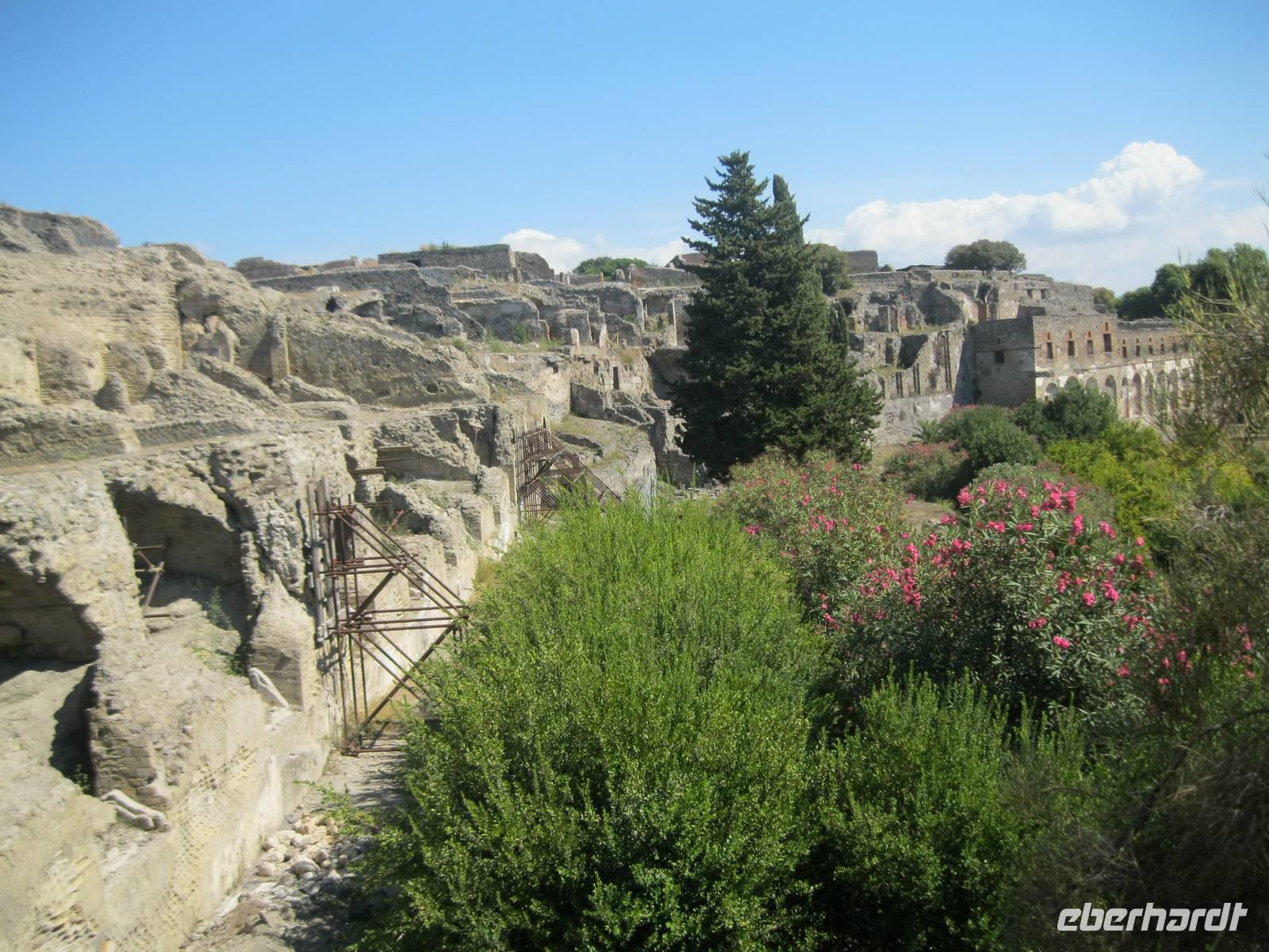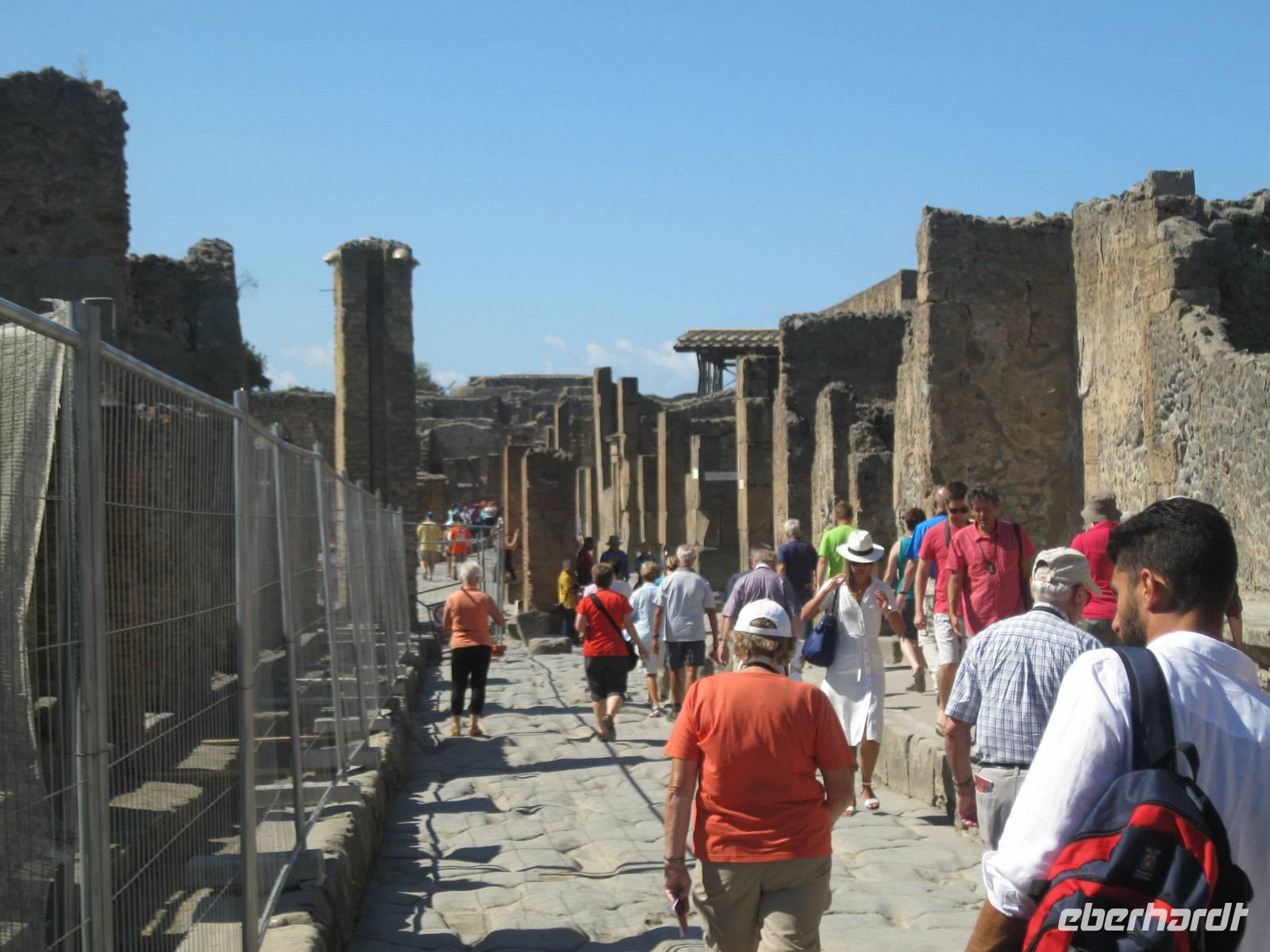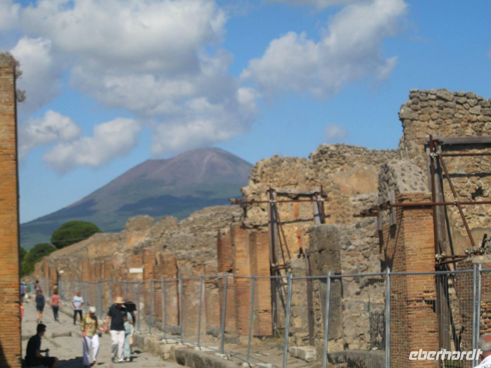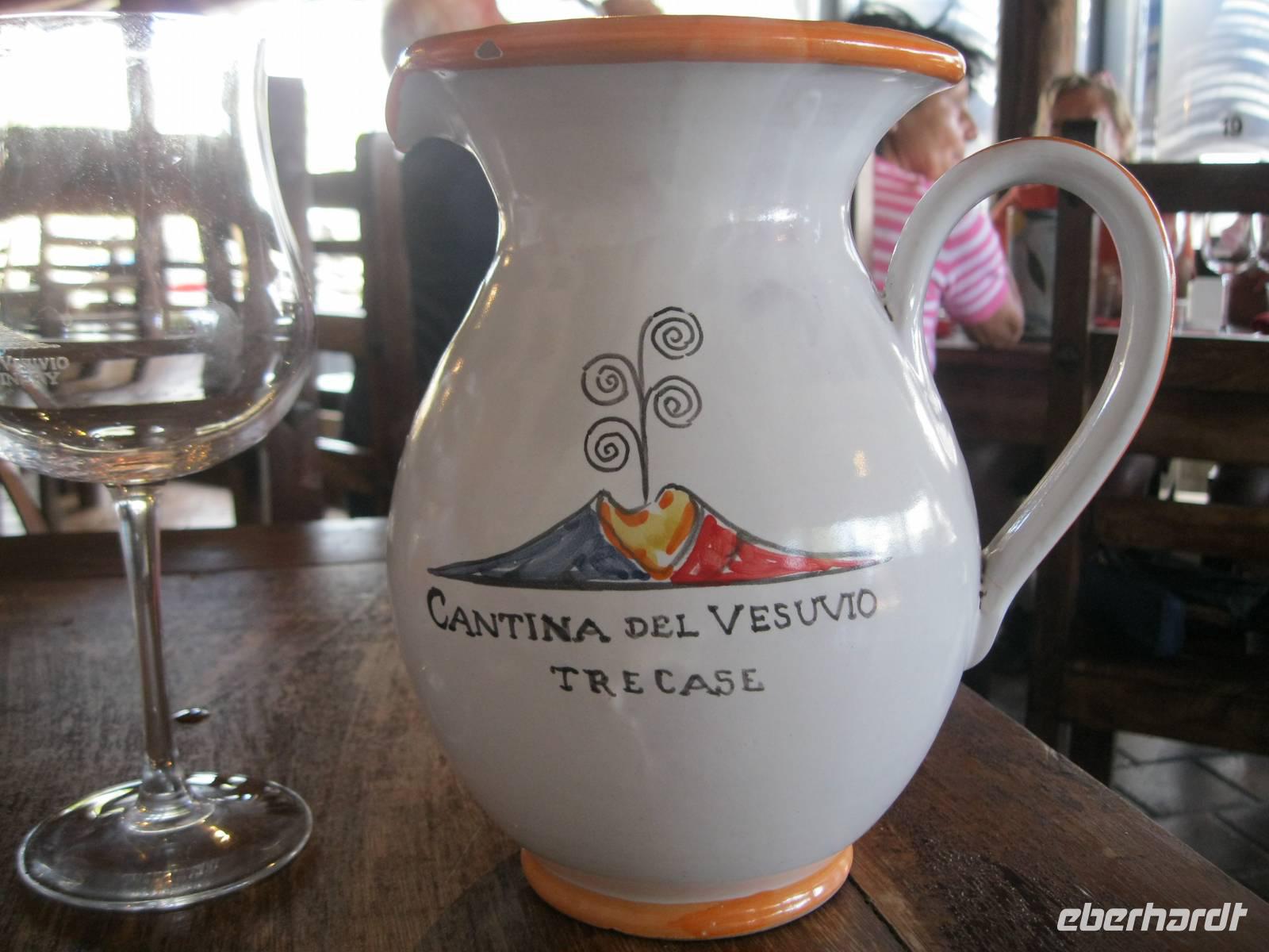 Das Wetter war trocken und der Himmel wolkenlos. Einfach toll. Wir fuhren die Amalfitana vorbei an Vietri, Richtung Salerno. Auf der Küstenfahrt erzählte uns Kerstin viel über die Geschichte und Sehenswürdigkeiten der Region. In Pompeji erwartete uns Anna und nachdem wir alle mit Eintrittskarten und Audiogeräten ausgestattet waren, ging es in die Ruinenstadt. Pompeji war für uns alle eine Zeitreise in die römische Antike. Anna gab zu den geschichtsträchtigen Ruinen exakte Erklärungen. Danke! So viel Geschichte macht müde Beine. Die konnten wir jetzt ganz entspannt, nach einer kleinen Führung im Weingut "Cantina del Vesuvio", ausruhen. Von hieraus hatten wir einen ganz klaren Blick auf den Gipfel des Vesuvs. Der schlafende Feuerberg steht als Nationalpark und UNESCO -Biosphärenreservat unter Naturschutz. Wir wollten ja noch ganz nach oben. Also nahmen wir einen letzten Schluck Wein und los ging es. Am Parkplatz Vesuv herrschte jedoch leichter Nebel, der sich immer mehr zuzog. Von der Kontrollstelle führte ein ziemlich sandiger und relativ steiler Weg zum Gipfel. Als wir diesen erreicht hatten, konnten wir Neapel im Tal nicht sehen. Am Kraterrand konnten wir aber in den "Schlund des Vesuvs" hinein schauen. Auf dem Grund des "Schlundes" wuchsen Gras und kleine Sträucher. Die Wissenschaft begründet dies, dass verfestigte Magma die Schlotöffnung verschließt. Wann der Vesuv wieder "speien"sollte, wissen nur San Gennaro und hoffentlich rechtzeitig die Experten vom Observatorium auf dem Berg. Auf der Rückfahrt ging noch ein heftiger Regenguss nieder. Eine schwarze Wolke hatte sich auf den Gipfel des Vesuvs gesetzt. Am Abend war "Pizza Party". Als unsere "Tischgesellschaft" das 4.Riesen-Tablett kommen sah, protestierten wir. Wie im Märchen, bekamen wir keinen Bissen mehr runter. Statt Nachtisch gab es Kräuterschnaps!!! Ernesto, unser Wanderführer für den morgigen Tag, schaute am Abend schon mal vorbei. In dieser Nacht gab es starke Gewitter.