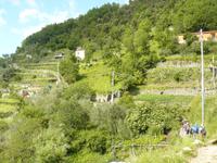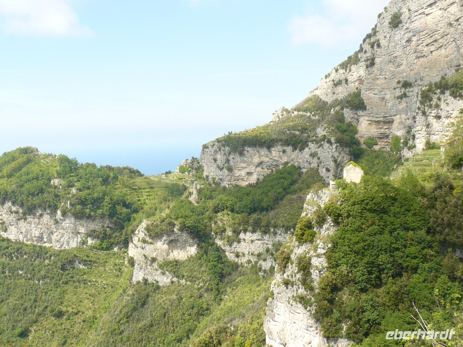 Eigentlich stand heute Capri auf unserem Programm, aber die Wettervorhersage war nass und trübe und so tauschten wir die Tage. Und anstatt von Agerola aus starteten wir von Scala nach Pogerola. Dieser Weg, der in rund 300 m Höhe durch das wunderschöne Valle delle Ferriere führt, ist eine passende Alternative, wenn oben in den Bergen die Wolken hängen. Der Weg schlängelt sich zwischen Felswänden über dem Valle dei Mulini hindurch. Er erfordert Konzentration ist aber doch überwiegend einfach zu gehen. Unten im Tal wurden Papiermühlen betrieben, hoch oben in den Bergen standen früher Eisenhütten. Die Wasserkraft wurde überall genutzt. Ganz hinten im Tal mussten wir bei einigen schönen Wasserfällen den Bach überqueren. Morgens war das Wetter noch freundlich, aber nun konnte man die Wolken oben in den Bergspitzen hängen sehen. Es folgte ein etwas mühsameres Stück, das Aufmerksamkeit erforderte. Die Gäste halfen sich gegenseitig über höhere Stufen und Schmalstellen hinweg. Träumer landen hier doch glatt auf dem Boden der Tatsachen. Aber auf unsere Österreicher war Verlass - sie griffen blitzschnell helfend unter die Achseln!