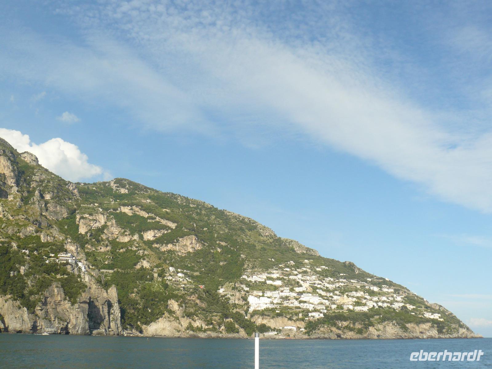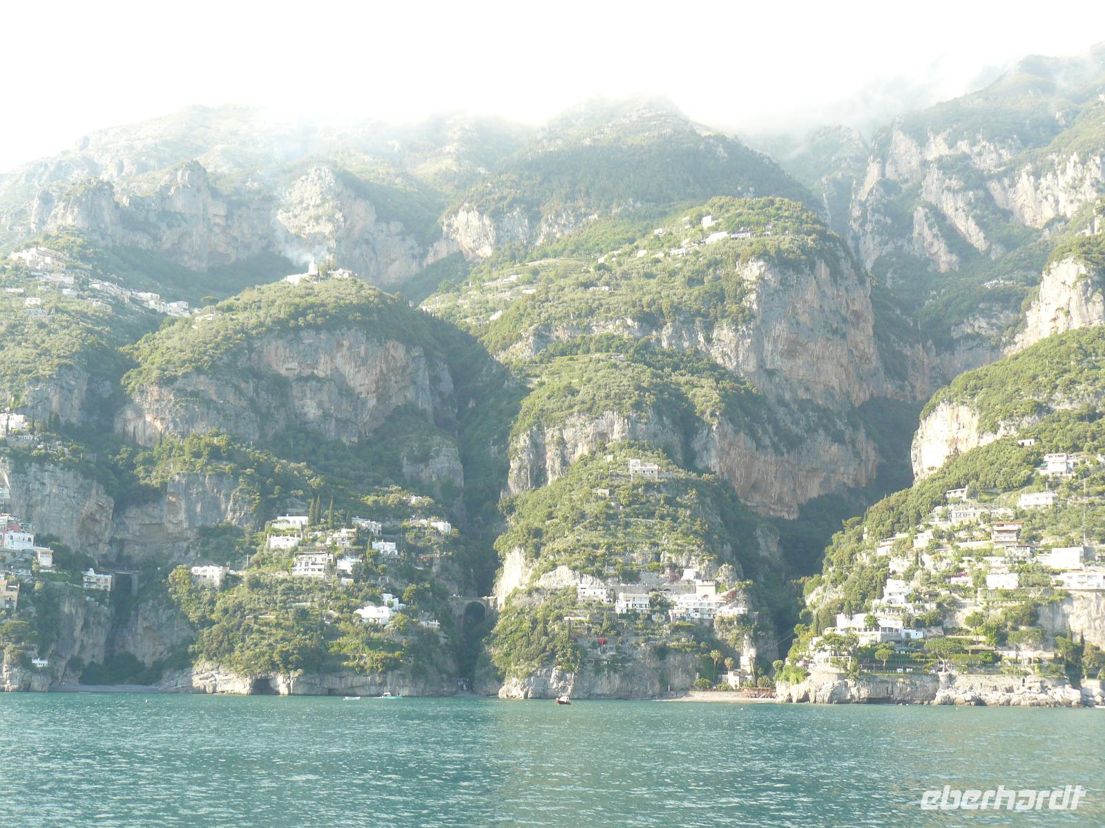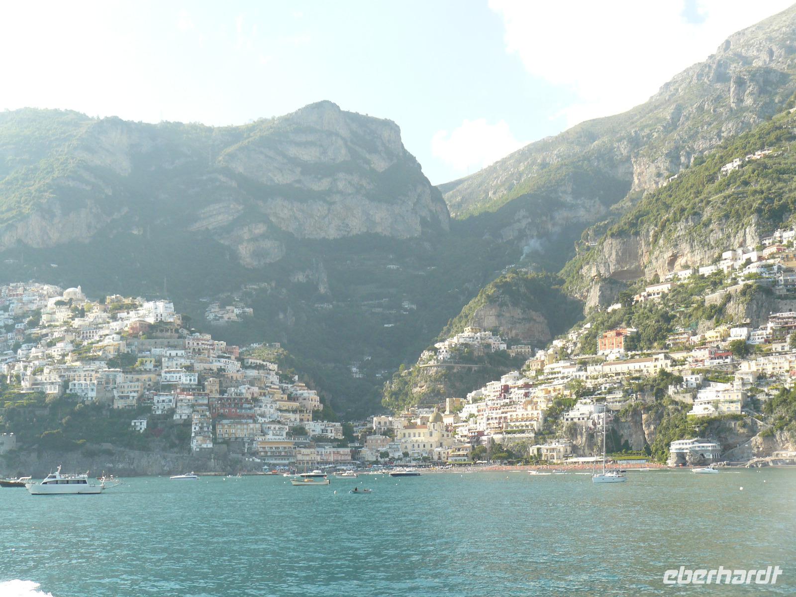 Dann wanderten wir weiter bis nach Montepertuso. Dort trennten wir uns: die einen erreichten Positano zu Fuß, die anderen per Linienbus. Wie man die dichteste Kugelpackung erreicht haben die Busfahrer schnell gelernt. Neben Japsen drang aber bald schon auch Kichern an mein Ohr. Ich flüchtete schließlich mit einigen Gästen am oberen Ortsrand von Positano auf einen weiteren Treppenpfad aus dem Bus. Dieser führte uns auf ungewöhnliche Art und Weise durch das Tal bis an den Strand von Positano. Nun hatten die Gäste die Qual der Wahl: Eis oder Shopping oder Fotosafari...? Den Rückweg traten wir übers Wasser an. Ganz besonders schön war, dass wir ein ganzes Schiff für uns hatten, denn das Linienschiff war mehr als voll. So genossen wir bei herrlich ruhiger See die Abendstimmung auf dem Wasser.