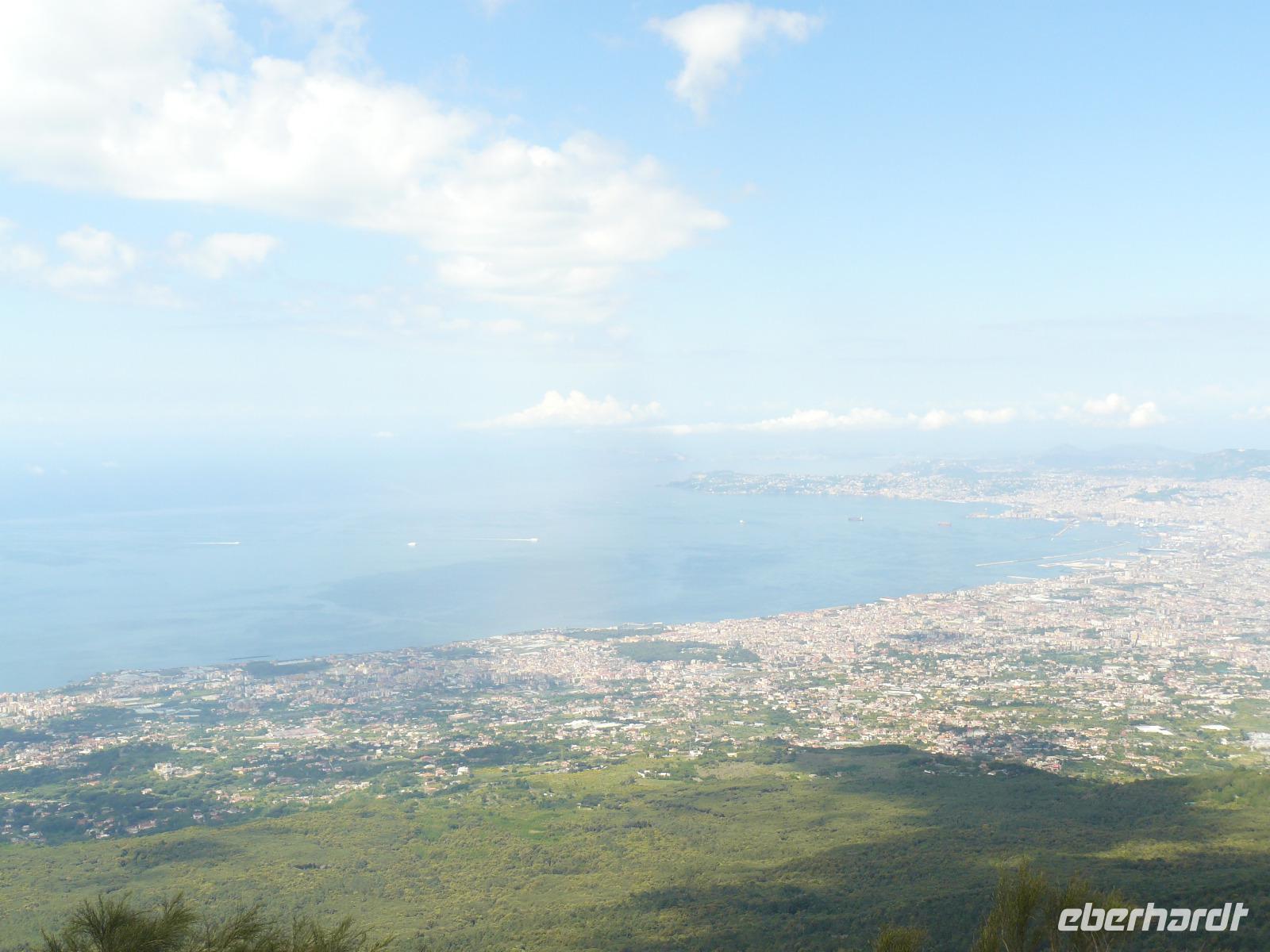 Unserem Busfahrer hatten wir einen ruhigen Fahrstil empfohlen - ganz in seinem eigenen Interesse. Und er hielt sich daran, so dass keine Zwangspause von Nöten war. Lagen die Kurven der Amalfitana erst mal hinter uns, sausten wir auf der Autobahn in Richtung Neapel. Nun tauchte der Vesuv vor uns auf - das war uns bei der Anreise nicht vergönnt gewesen. Da war er in Wolken gehüllt gewesen. Nun also lag er vor uns, der gefährlichste Vulkan Europas, und sah doch so friedlich aus. Dass der Vesuv zwar gefährlich ist, aber nicht so sehr, dass man unverhoffter Dinge von Lava überrascht wird, erklärte uns unser guide Roberto. Ein Vulkanausbruch kündigt sich immer einige Tage vorher an. Dass die Bewohner Pompeis und Hercolaneums vom Vulkanausbruch überrascht wurden lag v.a. daran, dass sie nicht wussten, dass dieser Berg ein Vulkan ist, denn der Vesuv ruhte damals mehrere Jahrhunderte lang. Oben war es nicht so kalt wie erwartet. Die Aussicht war herrlich. Uns zu Füßen erstreckte sich die Küstenebene von Neapel und aus dem Meer erhoben sich im Schönwetterdunst Ischia und Capri. Ein letzter Blick, und es ging wieder abwärts.