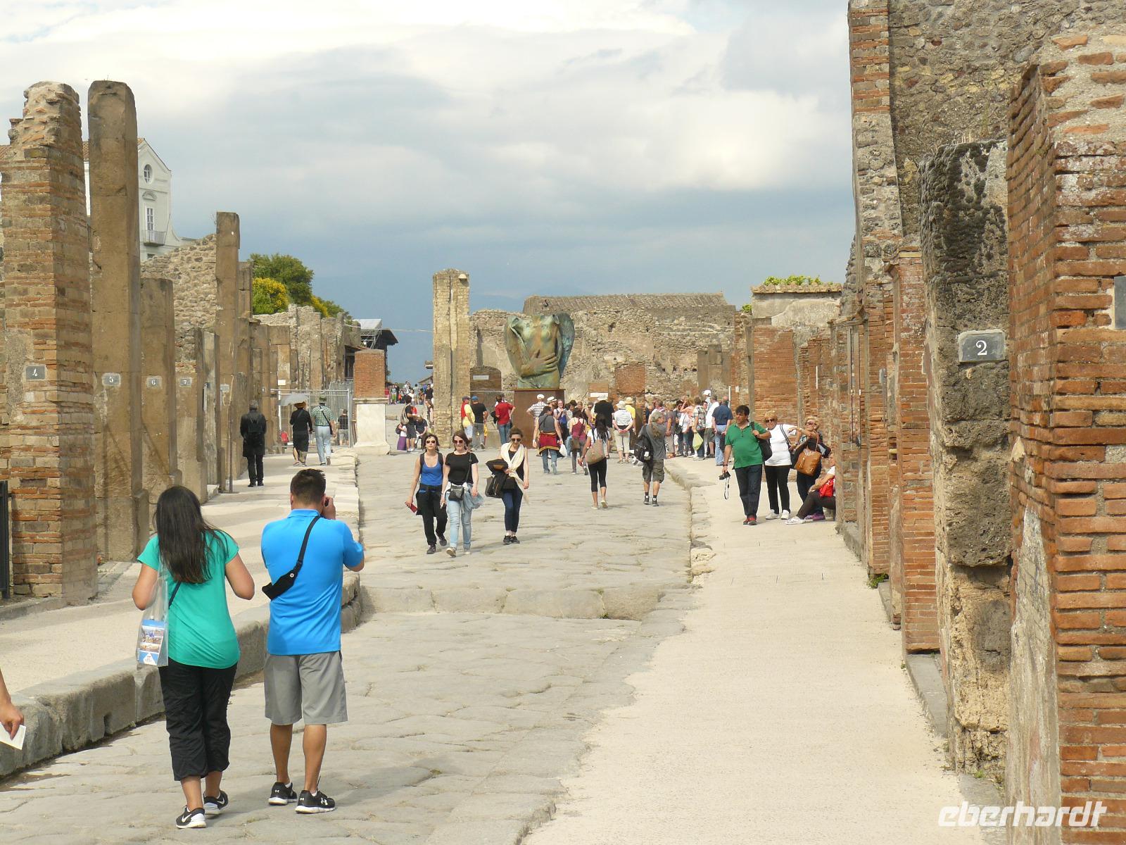 Dort erwartete uns Alfonso. Er vermittelte uns anschaulich die Vergangenheit der untergegangenen Stadt, zeigte uns Märkte, Tempel und Theater. Und ganz nebenher hatte er so auch seine private Bühne, auf der er sich und das süditalienische Temperament demonstrieren konnte. In diesen zwei Stunden haben wir nur einen sehr kleinen Teil der Stadt gesehen, aber wir haben doch viel erlebt: Bedrückendes wie die Gipsfiguren, Erheiterndes wie Alfonsos Gebrauchsanweisung gewisser Etablissements für fremdsprachige Seemänner. Der Vesuv, der am Morgen noch in der Sonne gelegen hatte, versteckte sich nun hinter düsteren Gewitterwolken. Im Abendlicht gings dann schließlich wieder südwärts zurück an die Amalfitana, wo in unserem Hotel natürlich wieder ein gutes Essen auf uns wartete, wie jeden Abend.