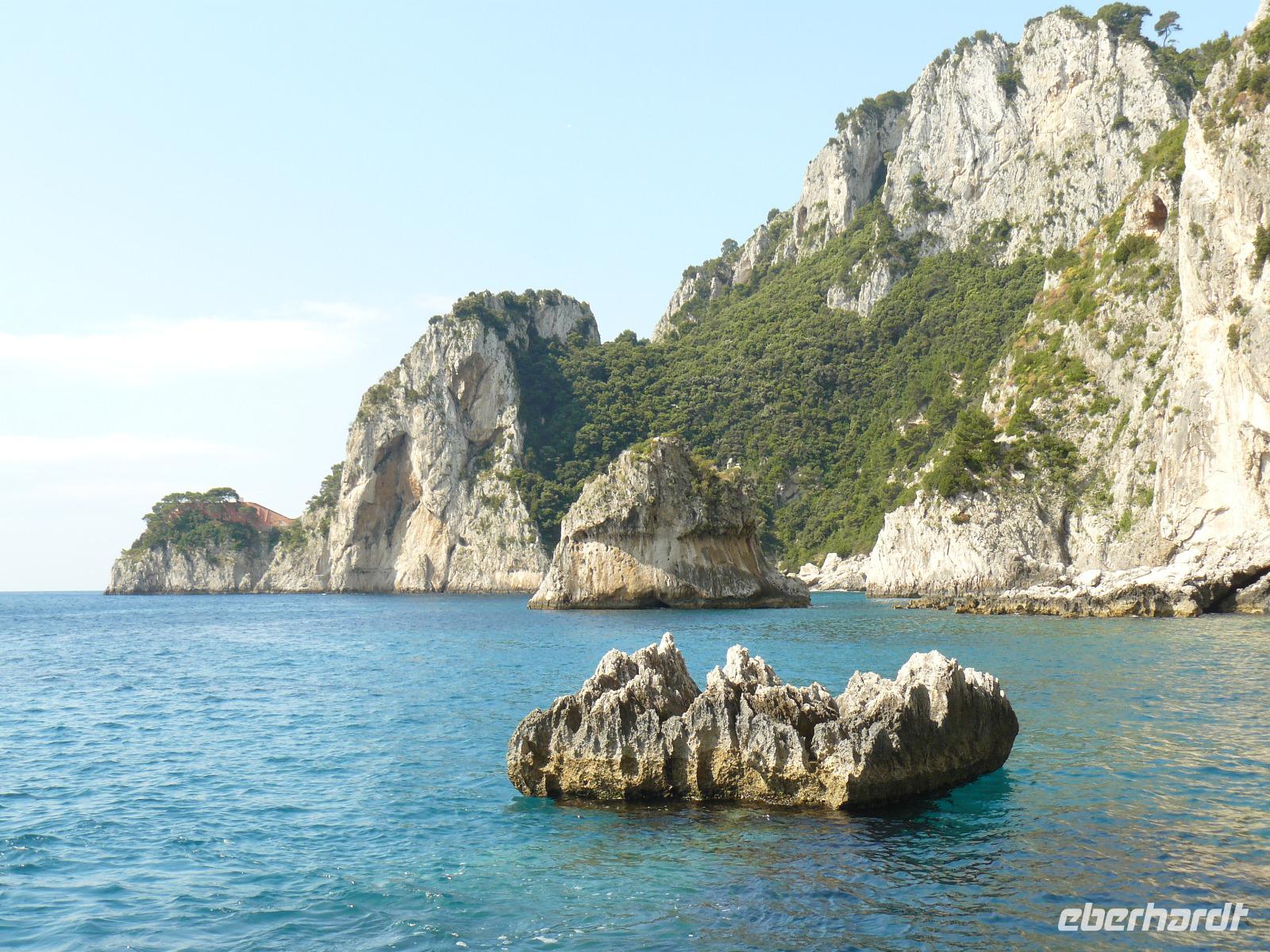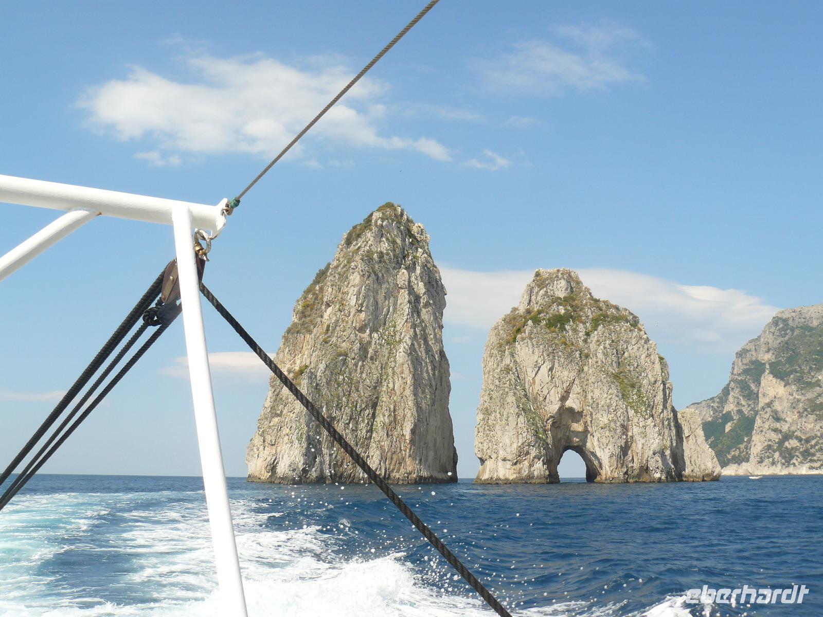 Es hatte sich gelohnt die Tage zu tauschen: ein strahlend sonniger Tag erwartete uns nun! Eigentlich wollten alle Gäste mit nach Capri, aber ein Gast musste passen und verbrachte einen erholsamen Tag in Minori. Dieses Mal hatten wir kein Schiff für uns alleine. Die See war ruhig und wir fuhren über Amalfi (das Schiff wurde noch voller) und Positano (nun war das Schiff richtig voll) nach Capri. Dort machten wir einen Abstecher und warfen einen Blick in die hübschen Grotten am südöstlichen Ende der Insel und näherten uns den berühmten Faraglioni-Inseln. Wir schauten zu, wie die kleinen Boote durch den Tunnel der mittleren Insel fuhren und unsere Fotografen hatten mal wieder viel zu tun.