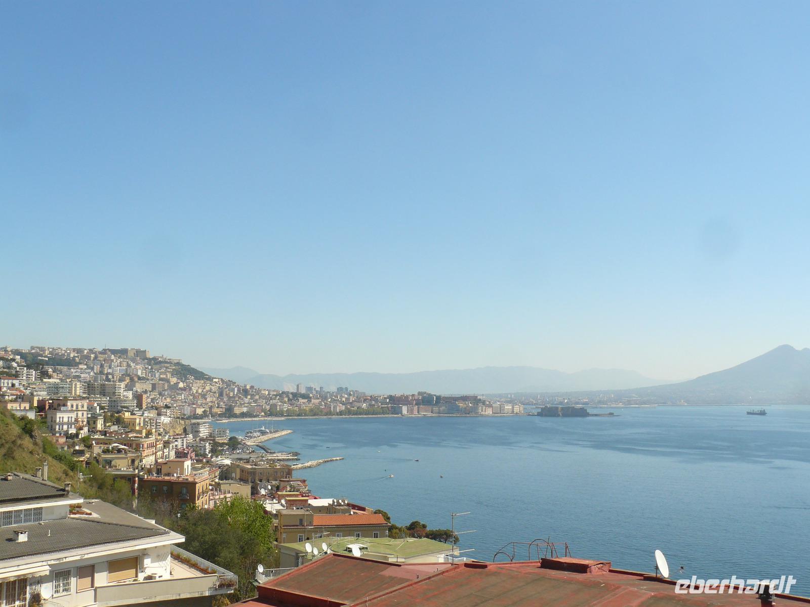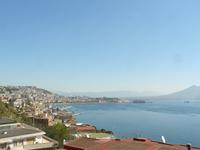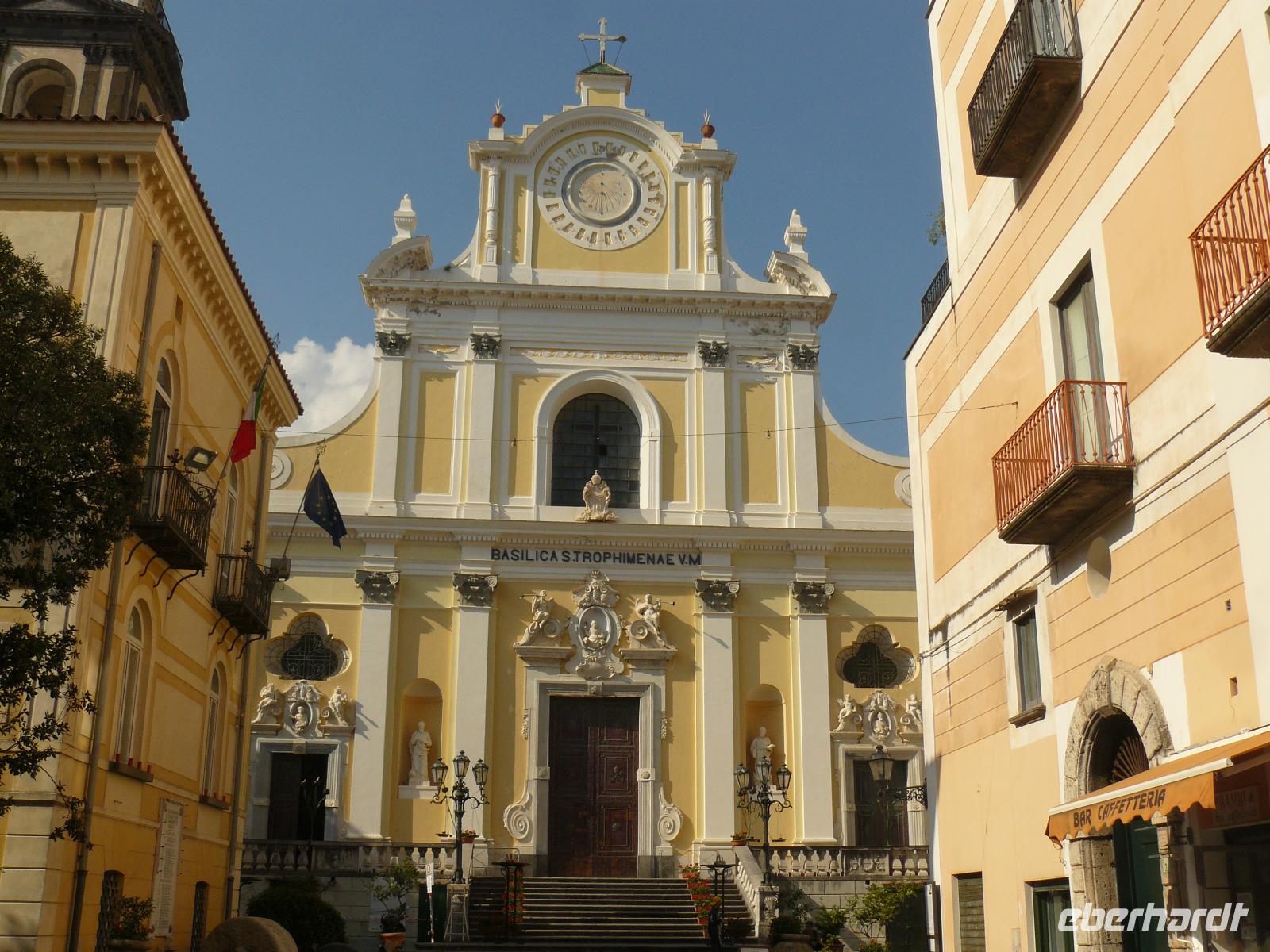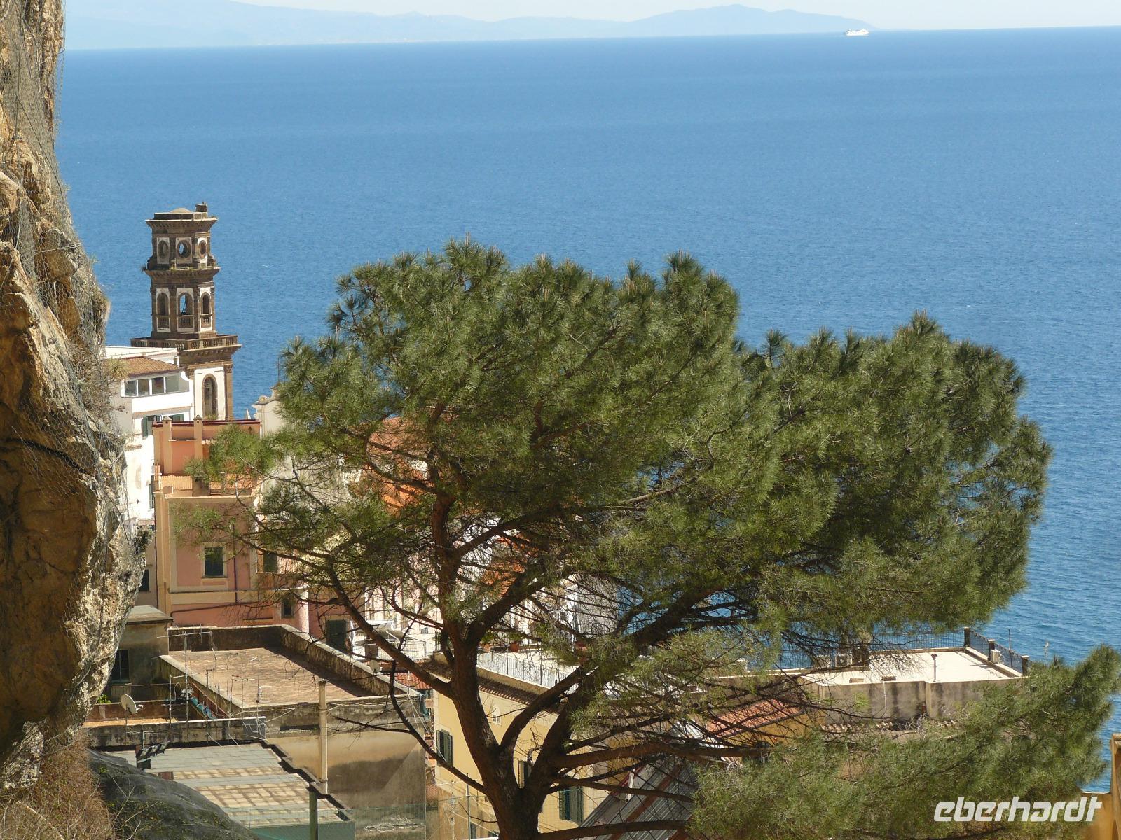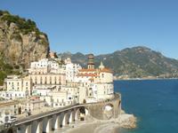 Bei strahlend blauem Himmel landeten die Berliner samt Reiseleiterin schon am frühen Vormittag in Neapel. Hier erwartete uns Beate, die Stadtführerin, am Flughafen. Der Bus brachte uns zu verschiedenen Aussichtspunkten rund um die Stadt, bevor wir uns dem Zentrum Neapels näherten. Beate zeigte uns kleine Läden, wo wir uns ein Mittagessen kaufen konnten und Cafés mit herrlichen dolce, also süßen Backwaren. Davon gibt es in Neapel viele. Am frühen Nachmittag brachte uns der Bus dann nach Minori. Wir sausten über die Autobahn am Vesuv und an Pompeji vorbei bis nach Vietri sul Mare. Hier verließen wir die Autobahn und fuhren über die „schönste Straße der Welt". So wird die Küstenstraße an der Amalfitana in Büchern beschrieben. Der Fahrer mag das anders sehen, denn diese Straße zu befahren kostet Nerven. Und so waren alle Gäste froh, dass sie diese Aufgabe dem Busfahrer überlassen konnten und nicht hinter dem Steuer eines Autos saßen. Bei strahlendem Sonnenschein tauchte das Meer vor uns auf. Wir passierten malerische Dörfer mit bunten Kirchturmkuppeln, die an steilen Hängen klebten. Schließlich erreichten wir Minori. Der Nachmittag wurde je nach Wunsch zum Schlafen oder zur ersten Ortserkundung genutzt. Kurz vor unserem herrlich leckeren Abendessen trafen dann auch die letzten Gäste aus Stuttgart und Frankfurt ein. Das Wetter war herrlich und bei strahlendem Sonnenschein starteten wir in unseren 2. Tag.