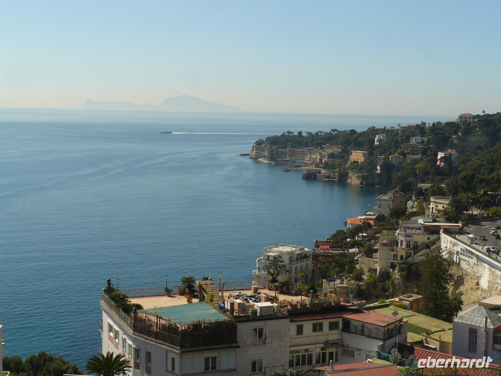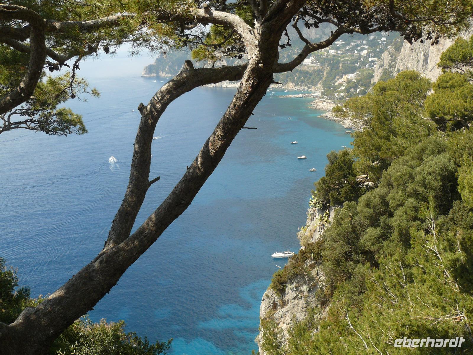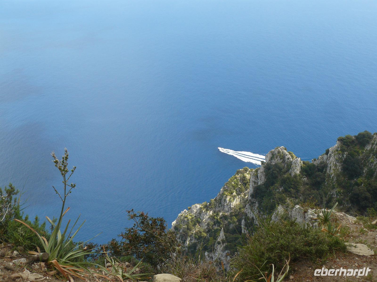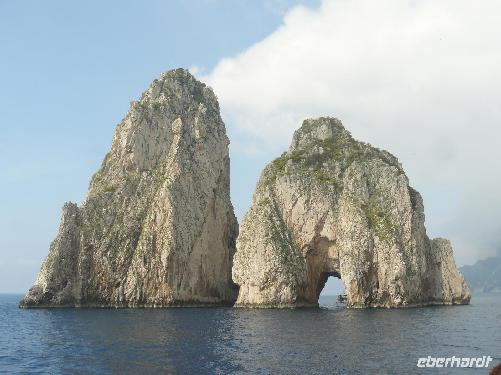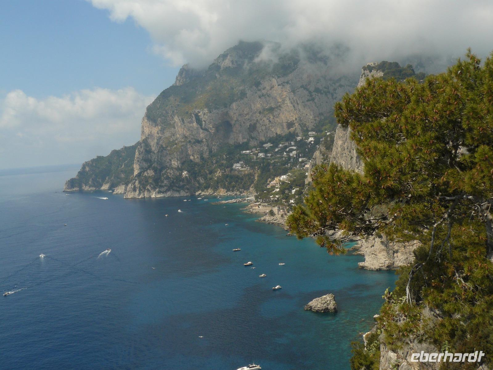 "Ich möchte gerne ausspannen, shoppen und meine eigenen Wege gehen". Das wünschte sich ein Gast und hat dies auch getan. Alle anderen waren erlebnishungrig und wollten sich Capri nicht entgehen lassen. Früher Vogel fängt den Wurm. Demnach hatten wir heute Wurm-Tag. Unser Bus zum Schiff fuhr schon um 7:45 Uhr, denn der Pier in Minori hielt noch Winterschlaf und daher legten hier keine Schiffe an. Dieses Mal hatten wir kein Schiff für uns alleine, aber wir waren die ersten Gäste an Bord in Maiori und konnten uns die Plätze aussuchen. Dann fuhren wir über Amalfi und Positano nach Capri. Dort fuhren wir an der Südküste entlang, bekammen die Korallengrotte und die Weiße Grotte gezeigt und sahen hinauf zur Villa Malapartes und zum Arco Naturale. Hier oben würden wir wenig später wandern. Dann näherten wir uns den berühmten Faraglioni-Inseln. Und nun bekamen wir gleich noch eine Inselrundfahrt per Schiff geboten. Das Boot umrundete Capri und wir sahen den Eingang zur Blauen Grotte, vor dem sich kleine Holzruderboote und die Zubringerboote tummelten. Der Inselgipfel und Anacapri lagen zwar in Wolken, aber wir hatten ja andere Ziele. In Marina Grande besorgte ich ein Picknick und ab ging's mit der Funicolare-Bahn hoch auf den Hauptplatz von Capri. Wir spazierten über den Bergrücken zu den Augustusgärten und genossen den Ausblick auf die Via Krupp, die sich im wahrsten Sinne des Wortes nach Marina Piccola den Hang hinunter schlängelt. Oberhalb des Kartäuserklosters starteten wir mit unserer Wanderung und machten unweit der Faraglioni-Inseln an einer aussichtsreichen, sonnigen Stelle unsere Picknickpause. Nun lachte für uns die Sonne wieder und das Meer schimmerte in türkisblauen Tönen. Auch dieses Mal war unser Mahl sehr sättigend und sehr gut. „ Ach was sind diese Paninis doch lecker! Die Italiener können das einfach, Essen ist ihre Spezialität..." Zufriedenheit auf der ganzen Linie. Dann wanderten wir an der Villa Malaparte vorüber, stiegen hoch zur Kultfelsengrotte Matermania, machten einen Abstecher zum Felsentor Arco Naturale, der nach der Renovierung nicht mehr wirklich naturale ist. Das Felsentor wurde mit Beton befestigt und so am Einsturz gehindert. Aber den Beton sieht man ja nicht. Dann wanderten wir zurück nach Capri. Hier trennten wir uns, denn einige Gäste wollten den Nachmittag etwas ruhiger angehen.