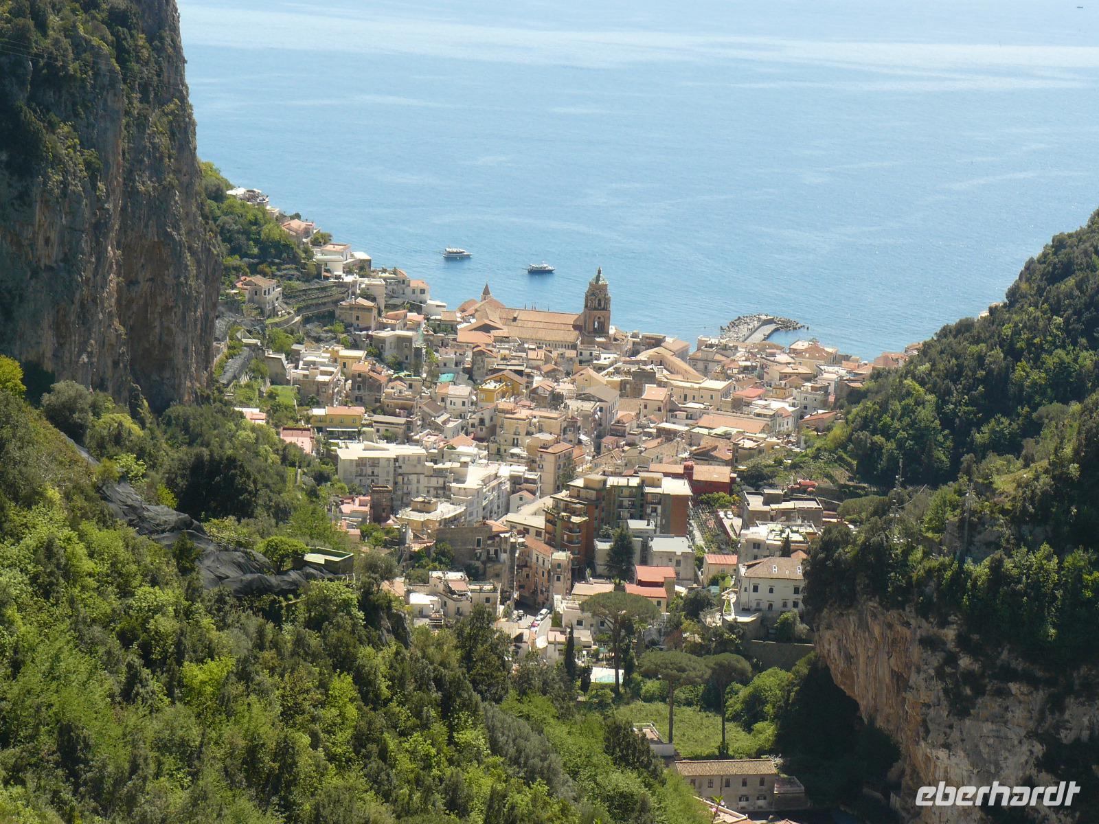 Unser gecharterter Bus, in dem wir herrlich viel Platz hatten, brachte uns nach Amalfi. Dort bewunderten wir die ganzjährig aufgestellten Weihnachtskrippen und besichtigten das Papiermuseum. Danach zogen wir los, durch Zitronenhaine am Ortsrand aufwärts ins Mühlental. Überall leuchteten uns die gelben Früchte entgegen: ...bis sie einst sprachen „wir Zitronen, wir wollen groß sein wie Melonen! Auch finden wir das Gelb abscheulich, wir wollen rot sein oder bläulich!" Ach wie gut, dass Gott nicht alle Wünsche der Zitronen berücksichtigt hat und sie heute nicht blau an den Bäumen hängen! Die Fotographen teilen sicher nicht den Farbgeschmack mit Heinz Erhardt. Gott hörte zwar deren Beschwerden, sagte aber „daraus kann nichts werden!" - aber er kam immerhin an einer Stellen den Zitronenwünschen entgegen: die Zitronatzitrone, von den Italienern „Cedro" genannt, ist so groß wie eine Honigmelone und wiegt bis zu 4 kg. Überall an der Straße werden die großen Früchte von Händlern angeboten. Bald schon ließen wir die Zitronenbäumchen hinter uns und durchwanderten das herrliche Valle die Mulini, das Mühlental, passierten überwucherte alte Gemäuer und malerische Wasserfälle. Unser Weg schlängelte sich durch Wald aufwärts. An einer alten Eisenhütte machten wir eine kurze Pause. Dann folgte ein letzter Anstieg und es bot sich eine herrliche Aussicht auf Amalfi hinunter, bevor man uns in Pontone bei unserer Mittagspause mitten auf dem Kirchplatz leckere Antipasti servierte. Unsere Fotografen hatten heute wirklich viel Arbeit, denn nach der Mittagspause wanderten wir bei strahlendem Sonnenschein an weiteren Zitronenplantagen und blühenden Glyzinien vorüber in das Valle del Dragone hinunter. Der Drache hatte wohl gerade Urlaub und war nicht zu Hause. Und in seiner Heimat blühte es wunderschön. Am unteren Ende des Tales erreichten wir das hübsche Atrani. Dort gönnten sich einige Gäste ein Eis, bevor wir nach Amalfi zurückwanderten. Hier besichtigten wir dann noch den beeindruckenden Dom Sant' Andrea und bummelten noch ein wenig durch den Ort, bevor unser Bus uns wieder zu unserem angenehmen Hotel in Minori zurückbrachte. Hier ließen wir uns ein weiteres schmackhaftes Abendessen munden.