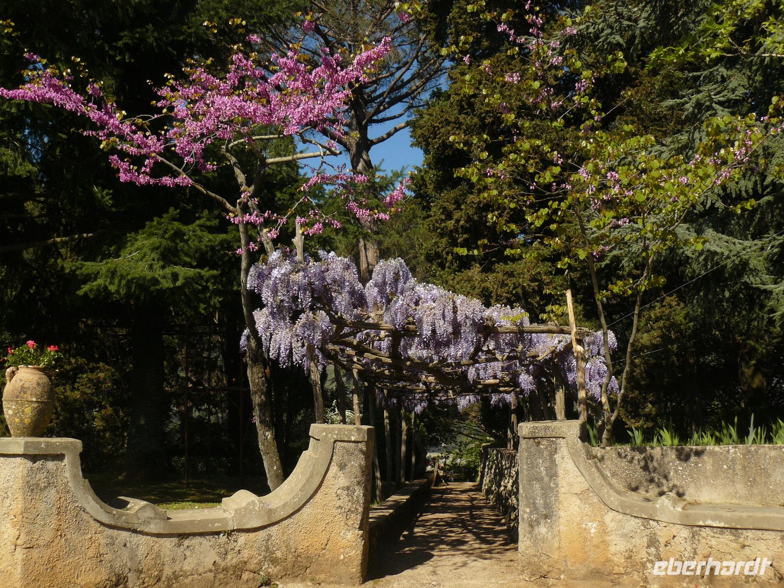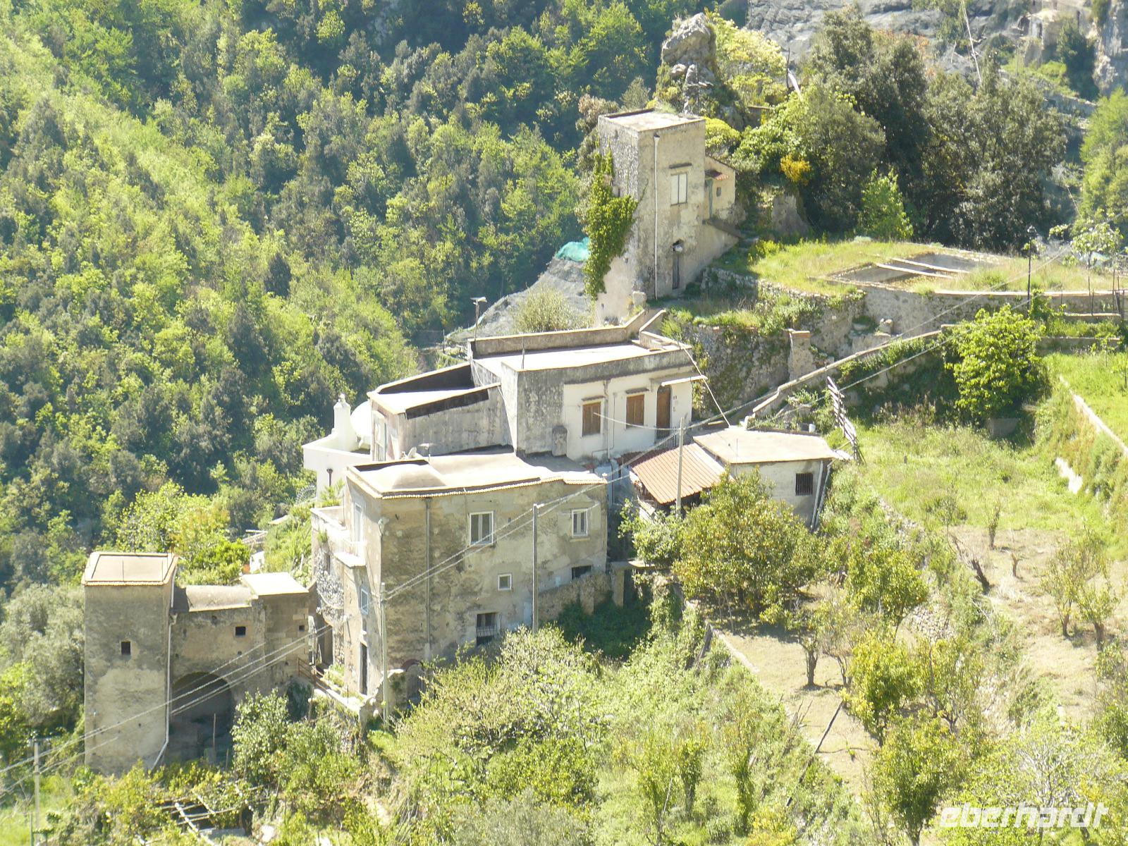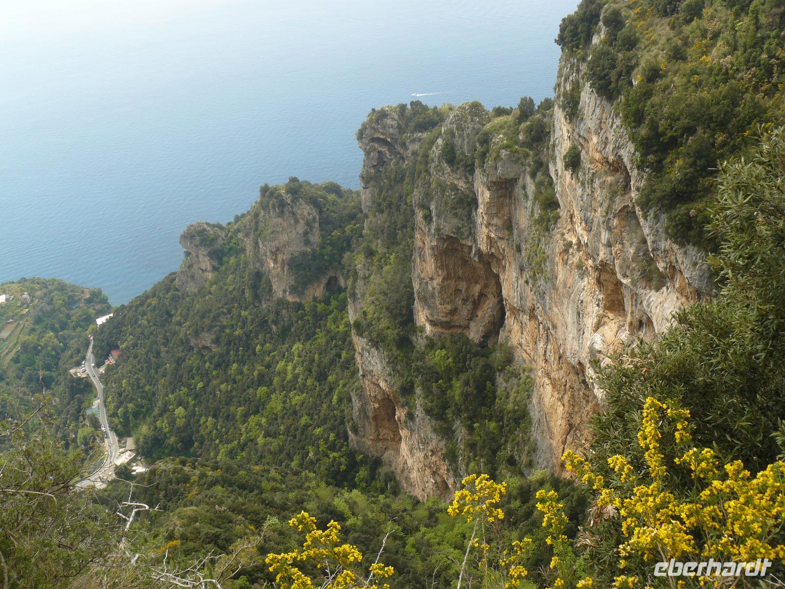 Zwei Gästen hatte die Gesundheit ein Schnäppchen geschlagen und sie ruhten sich heute aus. Die anderen zogen gut gelaunt noch einmal mit mir los. Diese Wanderung führte uns ins Tal der Eisenhütten, Valle delle Ferriere. Der Weg schlängelte sich nach einem kurzen steilen Anstieg bei Minuto zwischen Felswänden durch blühende Baumheide über dem Valle dei Mulini in rund 300 m Höhe hindurch und war doch einfach zu gehen. Unten im Tal wurden Papiermühlen betrieben, hoch oben in den Bergen standen früher Eisenhütten, die dem oberen Tal den Namen gaben. Die Wasserkraft wurde überall genutzt. Ganz hinten im Tal mussten wir bei einigen schönen Wasserfällen den Bach überqueren, was uns mühelos gelang. Das Wetter war freundlich, aber an den Bergspitzen hingen Wolken. Es folgte ein etwas mühsameres Stück, aber nach dieser Woche waren alle gut trainiert und auch das brachte niemanden mehr aus der Fassung. Zur Stärkung hatte ich noch Zitronenkekse mitgebracht. Man half sich gegenseitig über die höheren Stufen hinweg und die Reiseleiterin war ja auch noch da. Man war sich einig: Das ist eine schöne Tour! Und wir hatten das ganze Tal für uns. In Pogerola gab es dann wieder einen kulinarischen Exkurs. Dieses Mal wurde uns nebst leckerer Antipasti auch noch eine Pizza serviert! Die Gruppe war putzmunter und keiner fuhr Bus. Alle nahmen die 700 Stufen zwischen Pogerola und Amalfi abwärts locker. In Amalfi angekommen, trennten wir uns. Einige bummelten noch durch Amalfi, während andere Gäste mit mir zusammen nach Minori fuhren und ein Grüppchen wollte unbedingt noch weiterwandern und fuhr bis Maiori mit dem Bus.
