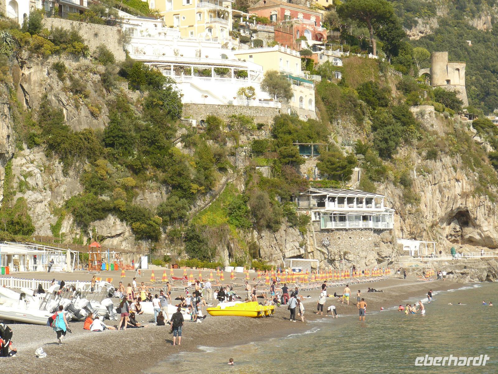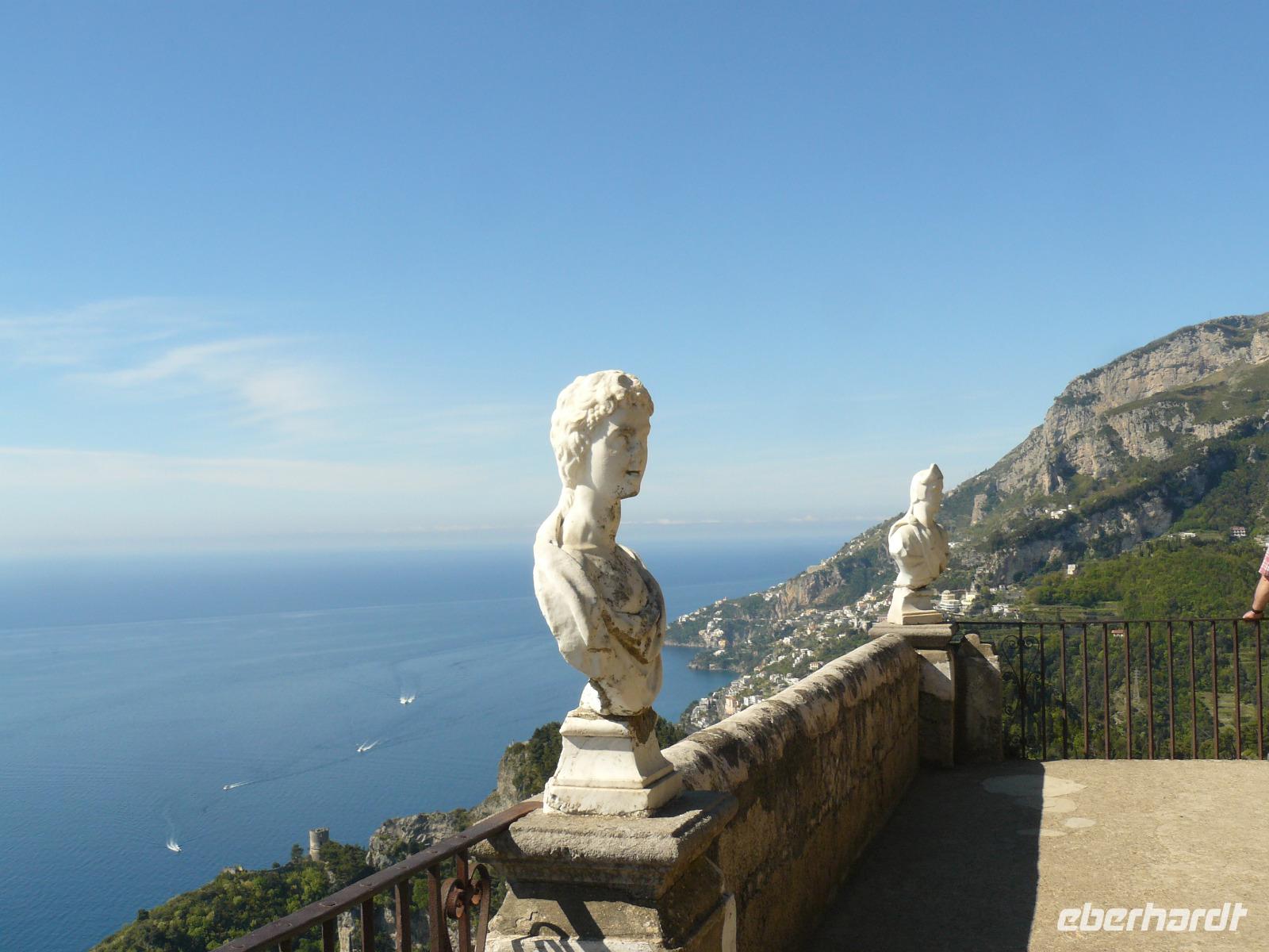 Bei strahlend blauem Himmel verließen wir gegen 9 Uhr das Hotel und fuhren nach Ravello. Dort erfreuten wir uns der herrlichen Blumen, der schönen Aussicht und der malerisch plazierten Plastiken im Park der Villa Cimbrone. Wir hatten den Garten fast für uns alleine, was sehr selten der Fall ist! Zahlreiche Sträucher, Glyzinien und Judasbäume standen in voller Blüte und der Blick über die ganze Küste begeisterte uns. Ein Gast übte Mundharmonika, was zu einem späteren Straßenkonzert führen sollte. Ich hatte wirkliche Talente mit auf Reisen! Danach spazierten wir auf einem ruhigen Weg rund um Ravello herum. Wie dicht an den mondänen Restaurants und Hotels liegen doch ursprüngliche Weiler verschlafen in der Sonne! Wir waren eine schnelle Gruppe und erreichten Ravello bald schon wieder. Dort hatten wir Freizeit, die einige zum Besuch der 2. Villa von Ravello, der Villa Rufolo, nutzten. Welche Villa war denn nun schöner, fragte ich. „Keine, beide Villen wollte ich nicht missen", kam von den Gartenliebhabern als Antwort. Andere Gäste gingen lieber shoppen und einige Gäste folgten mir noch in die älteren oberen Ortsteile. Per Bus erreichten wir schließlich nach einem ziemlichen Verkehrschaos die Villa Maria. Vittorio, unser Busfahrer, hatte die Ruhe weg. Es hilft ja auch nichts wenn man sich ärgert über einen Stau. Wir waren alle froh, dass wir nicht die Verursacher dieses Staus waren, denn ein Unfall hatte den Verkehr lahmgelegt. Das Agrituismo Villa Maria liegt mitten in einem Zitronenhain mit herrlicher Aussicht aufs Meer. Nun wurde uns wieder aufgetischt. Anni, das kugelrunde Haushundchen, ließ sich mit Streicheleinheiten verwöhnen, bevor wir auf einer aussichtsreichen Route hinab zum Hotel wanderten. Ein paar Gäste wollten noch mit mir in die römische Villa von Minori gehen. Sie schaut nur zur Hälfte aus dem Erdreich heraus. Die andere Hälfte ist zwar ausgegraben, aber nicht öffentlich zugänglich, denn über den Resten der alten Villa erheben sich Häuser. Aber nicht alle Gäste zog es zur Kultur. Einige strandeten bei Maria im Café und andere vergnügten sich am Strand. Wer im Herbst nach Italien kommt, kann am netten Strand von Minori herrlich baden, denn dann hat das Wasser angenehme Temperaturen. Im April schafften es einige Gäste immerhin bis zum Knie und zwei Wasserratten von der harten Sorte tauchten auch im April schon in die dann doch noch recht kühlen Fluten des Mittelmeers. So nutzte jeder seine freie Zeit nach persönlichem Interesse, bevor wir uns abends wieder auf das leckere Hotelessen stürzten.