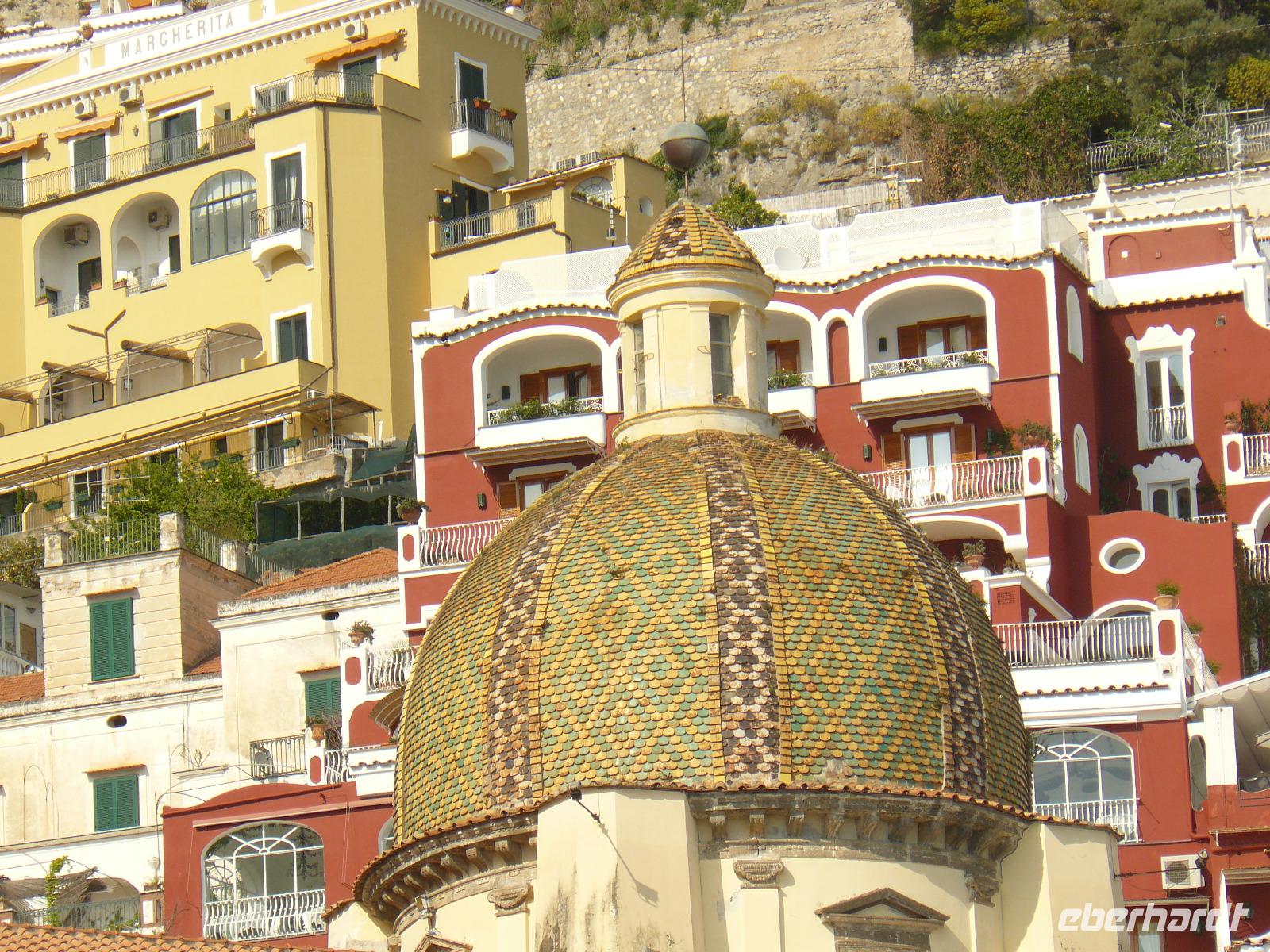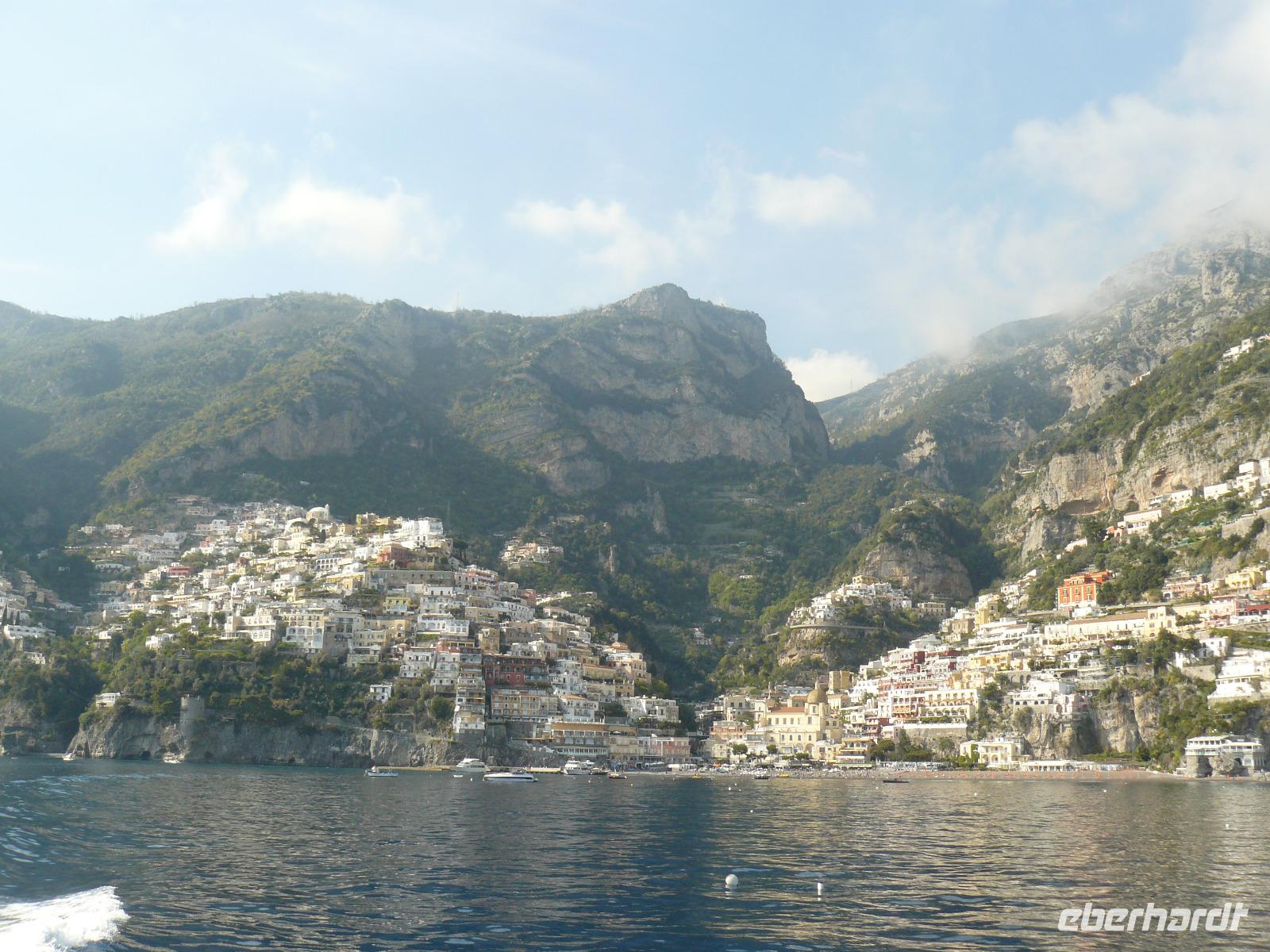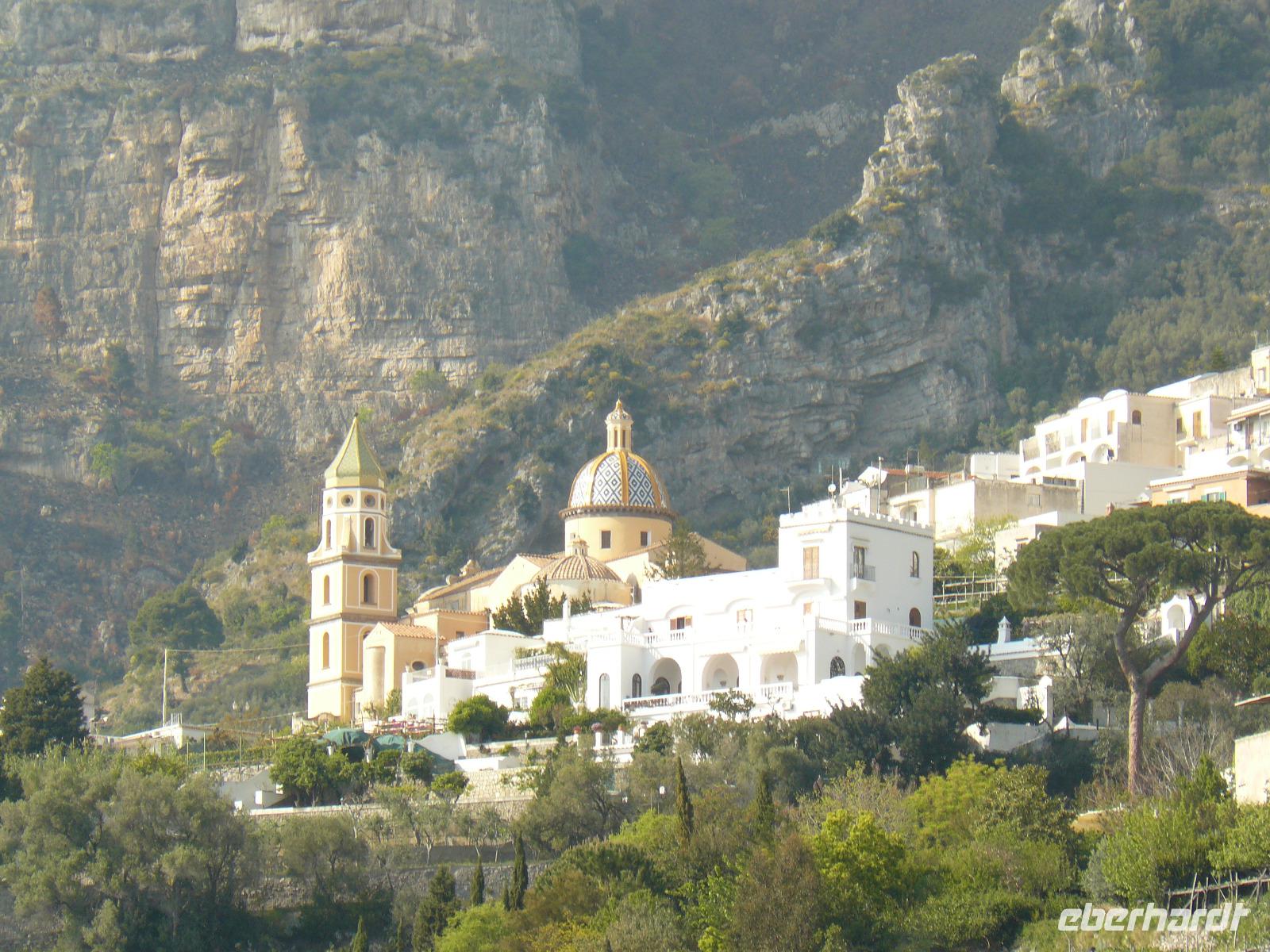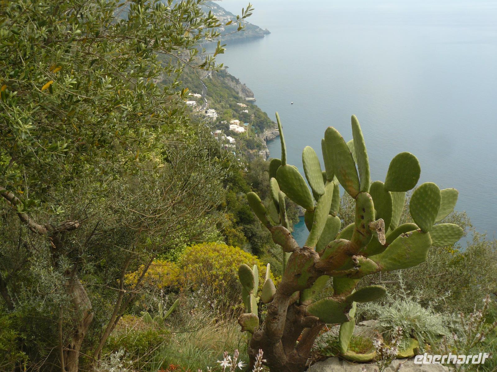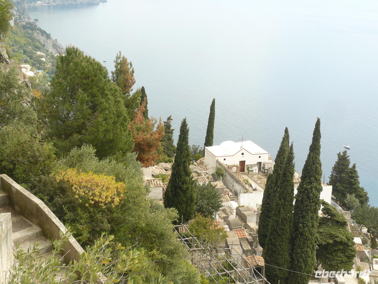 Ausgerechnet an diesem Tag hingen Wolken in den Bergen, während am Meer die Sonne schien. Die Götter wollten wohl keine Gesellschaft. Ob sie wollten oder nicht - wir kamen zu ihnen. In Bomerano gönnten wir uns noch einen Kaffee. Dann ging's los, über Stock und Stein, v.a. über Stein. Über uns waren die Bergkuppen nicht zu sehen, aber wir wanderten unter den Wolken mit Aussicht aufs Meer. Und während wir sonst auf unseren Wanderungen überwiegend die Bergwelt für uns alleine hatten, bekamen wir hier viel Gesellschaft. Eine belgische Gruppe trafen wir immer wieder. So viele Wanderer in einer Gruppe - wie gut dass wir nicht mit 30 Personen in die Berge ziehen! Wir suchten uns einen netten Pausenplatz, an dem die große Gruppe nicht genug Platz gehabt hätte und genossen unsere Pause. Das Wetter war angenehm, zwar nicht strahlend blau, aber da diese Wanderung eben doch ein bisschen schweißtreibender ist, war es genau richtig. In Nocelle, einem kleinen Weiler, der hoch oben am Hang klebt, erwartete uns - ja was wohl...?? Klar, Leckeres aus der Küche. Sehr gute Antipasti, eine herzliche Signora, die ständig Nachschub brachte, und wir hatten die ganze Terrasse für uns alleine. Auf meine Frage hin, ob irgendjemand per Bus weiterreisen wolle, wurde ich verständnislos angeschaut. Wieso denn das? Wir sind noch nicht müde! „Ich krieg Euch schon noch müde, wartet's ab!", dachte sich derweil die Reiseleiterin. Diese Gruppe war wanderstark und ließ sich nicht unterkriegen. Das war ich gar nicht gewöhnt, denn bei den meisten Wanderreisen an dieser Steilküste möchte doch der eine oder andere die Wanderungen abkürzen. Dass meine „Bergziegen" auch auf ihre Kosten kamen, dafür sorgte ich, indem ich sie in ihrem eigenen Tempo vorausziehen ließ. So konnte jeder selbst bestimmen wie schnell es denn vorwärts gehen sollte, und unsere gut konditionierten Vorauswanderer warteten regelmäßig auf den Rest der Gruppe. Ein bellendes kleines Vierbeinerchen erregte sich fürchterlich, als wir an seinem Territorium vorüberwanderten und steckte gleich mal seine Artgenossen an. So waren alle im Dorf Montepertuso informiert über unsere Ankunft. Und weiter ging's auf Schusters Rappen über einen Treppenweg abwärts, mit Blick auf den malerischen Friedhof von Positano. In Positano bummelte jeder noch ein bisschen nach den persönlichen Wünschen durchs Dorf. Den Rückweg traten wir übers Wasser an. Ganz besonders schön war, dass wir ein ganzes Schiff für uns alleine hatten, denn das Linienschiff war voll. So genossen wir bei herrlich ruhiger See die Abendstimmung auf dem Wasser. Da der Bootsanlegesteg in Minori noch Winterschlaf machte, legte unser Boot in Maiori an. Eigentlich erfolgt nun die Weiterfahrt per Bus, was auch rund die Hälfte der Gruppe machte. Aber unsere flotten Wanderer hatten immer noch nicht genug und wanderten von Maiori aus über den Sentiero dei Limoni noch zurück nach Minori. Dann war der Tag zu Ende und weitere Wanderungen nicht mehr möglich...