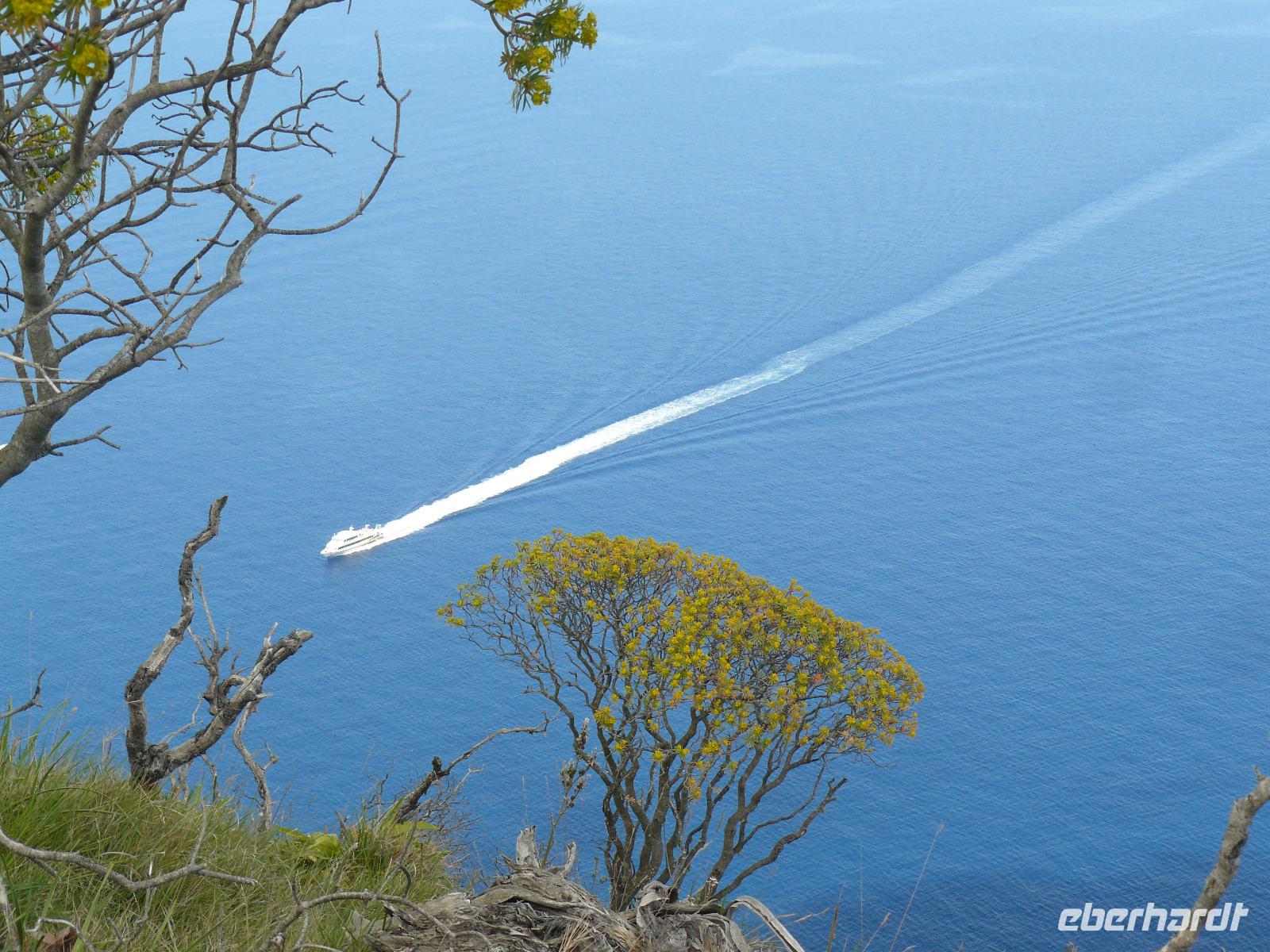 Die halbe Gruppe wanderte noch weiter mit mir hoch zur Villa Jovis. Wir genossen die Aussicht auf die Küste und durchschritten das Zuhause von Kaiser Tiberius oder das, was noch davon übrig ist. Einige Gäste wanderten mit mir zusammen zu Fuß zum Hafen hinunter, andere zogen es vor mit der Funicolare abwärts zu fahren. Am Hafen von Marina Grande trafen wir uns wieder und zum Abschluss besorgte ich noch Eis für alle, die auffindbar waren. Das Meer war ruhig und wir genossen die Abendstimmung auf dem Wasser bei unserer Rückreise per Boot. Und mir wurde an diesem Tag ein neuer „Titel" verliehen. „capo di gruppo" heißt so viel wie „der Leiter der Gruppe" und so werden Reiseleiter ab und zu mal genannt von den Italienern. Ich weiß nicht wer darauf kam, aber aus „capo" wurde irgendwie „polpo". Ein polpo ist ein Polyp, ein Oktopuss, einer mit vielen Fangarmen, durchaus essbar, gegrillt oder gegart und oft mit Essig und Öl als Salat serviert... Ich hatte Glück - ich wurde nicht gefressen. Und manchmal wünschte ich mir wirklich viele Fangarme um Euch alle mal richtig zusammenhalten zu können! Mein neuer Rufname lautete nun also „polpo di gruppo". Schmunzelnde Italiener warfen mir nun sobald ich gerufen wurde sonderbare Blicke zu.