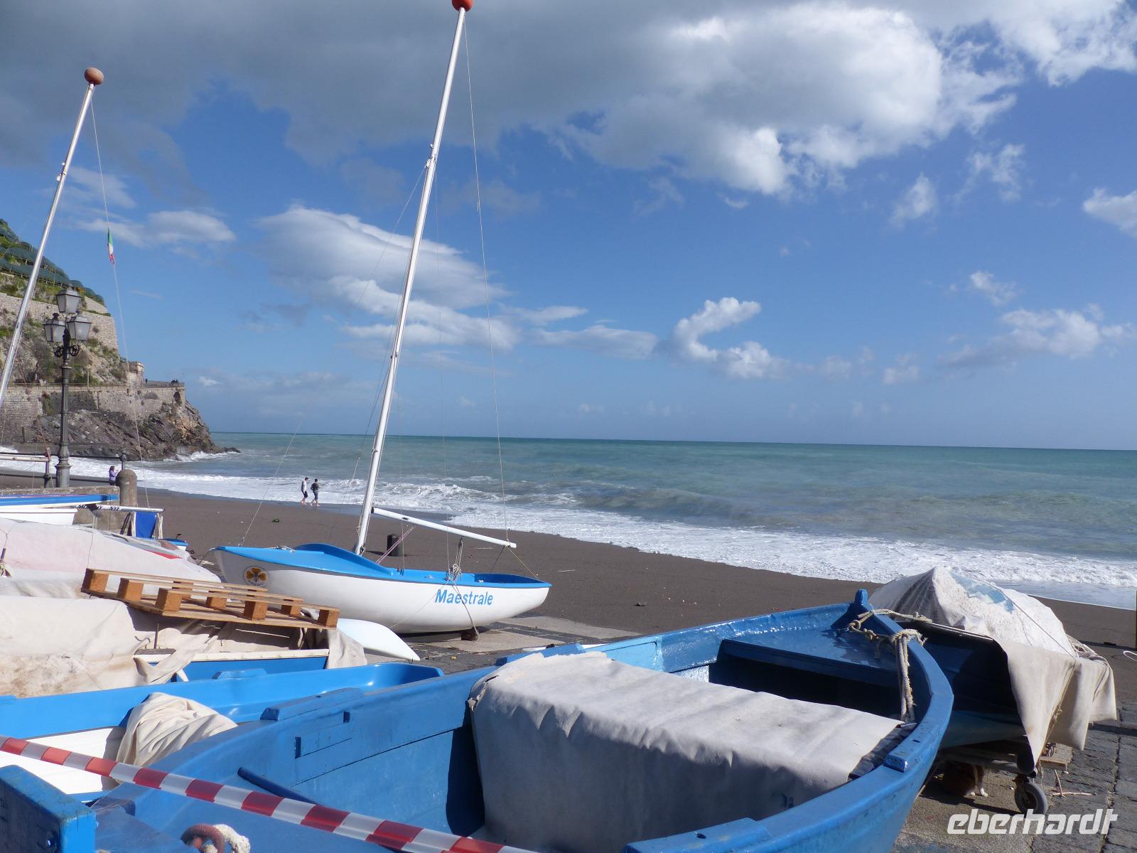 In Berlin sollte es schneien am 1. April, dem Ostersonntag, unserem Abreisetag. Doch bevor der Schneefall einsetzte trafen wir uns im warmen Flughafen Tegel. Ich hatte meine Berliner am Telefon schon vorgewarnt: ich habe Übergepäck, Ostereier und Hasen für 20 Personen sind doch sehr schwer - habt Ihr noch Platz im Koffer?? Und so reisten unsere Lindthasen gut verpackt auf verschiedene Koffer verteilt nach Italien. Unser Steward hielt bald schon einen Vortrag über die neuen Beförderungsbedingungen, gültig seit 1. April, bei denen die Lufthansa für Eiswürfelchen 20 Cent und pro Zuckepäckchen für den Kaffee 15 Cent dem Passagier in Rechnung stelle. Spinnen Sie jetzt??? „April, April!!!" Und das Geburtstagskind bekam sogar eine Flasche Sekt von der Lufthansa geschenkt! So heiter ging unsere Reise los. In Frankfurt ließen sich die Dresdner Gäste einfach finden. Und auch unsere Hamburgerin und alle, die ab Frankfurt neu zustiegen, tauchen bald schon auf. Der Himmel war blau - aber unter uns befanden sich weiße dicke Wolken. Vom Vesuv sahen wir vor und nach der Landung nicht viel, obwohl in Neapel Sonnenstrahlen sichtbar waren. Dort trafen wir noch unsere Schweizerin und ab gings per Bus nach Minori. Wir sausten über die Autobahn nach Pompei. Dort staute sich der Verkehr, denn alle waren auf dem Weg zur Kirche. In Vietri sul Mare verließen wir die Autobahn und fuhren über die wunderschöne Küstenstraße weiter. Der Fahrer mag das anders sehen, denn diese Straße zu befahren kostet Nerven. Und so waren alle Gäste froh, dass sie diese Aufgabe dem Busfahrer überlassen konnten und nicht hinter dem Steuer eines Autos saßen. Wir passierten malerische Dörfer mit bunten Kirchturmkuppeln, die an steilen Hängen klebten. Ach was war das Meer doch herrlich blau. Der Nachmittag wurde je nach Wunsch zum Schlafen oder zur ersten Ortserkundung genutzt. Dummerweise hatte am Ostersonntag fast alles geschlossen, leider auch die Supermärkte. Und niemand wollte ans Telefon gehen, was der Reiseleiterin einen klingelreichen Nachmittag einbrachte. Aber gegen Abend, als sich die Sonne gegen die Wolken durchgesetzt hatte, trafen wir uns mit unseren unverbrauchten Zahnputzbechern und dem Geburtstagssekt am Strand und starteten beschwingt in eine herrliche Reise.