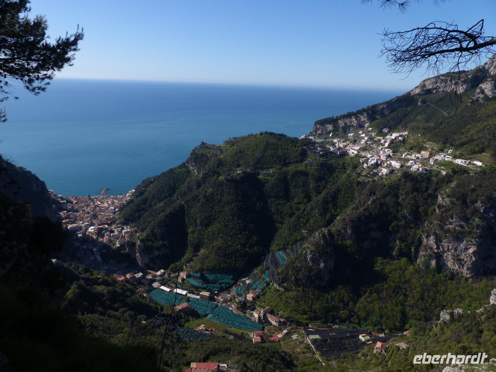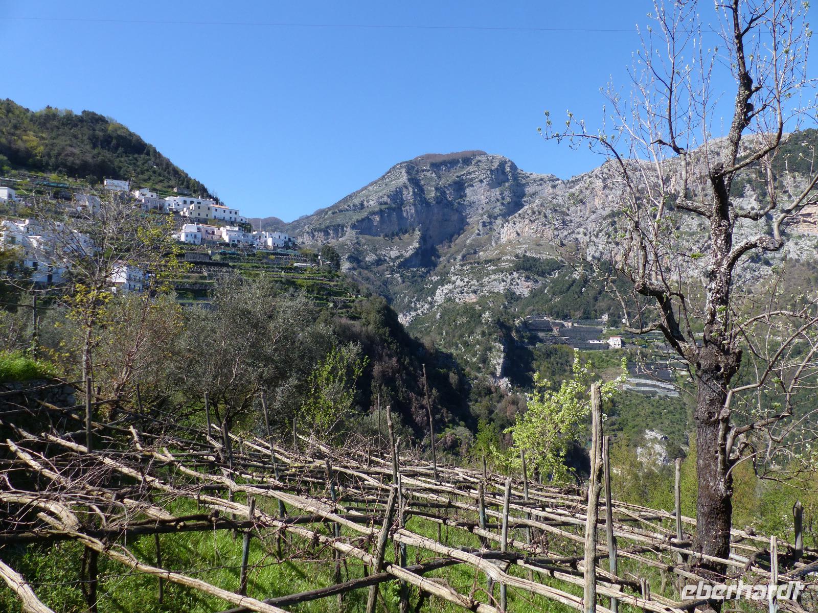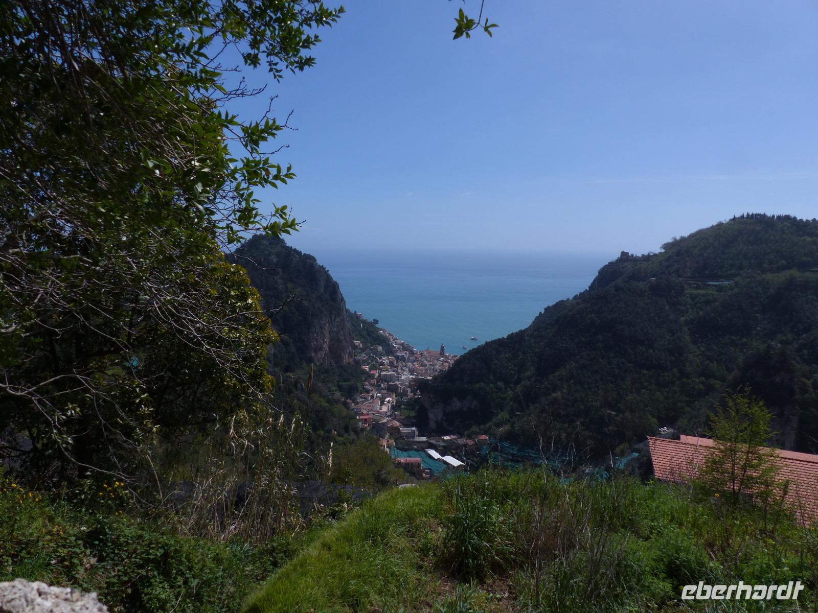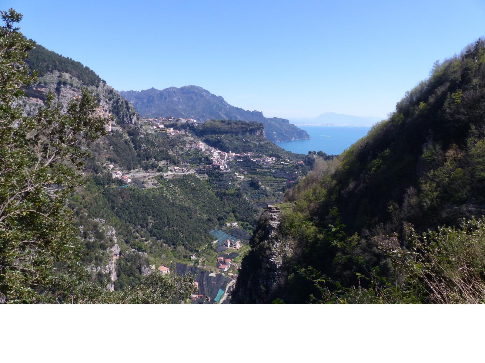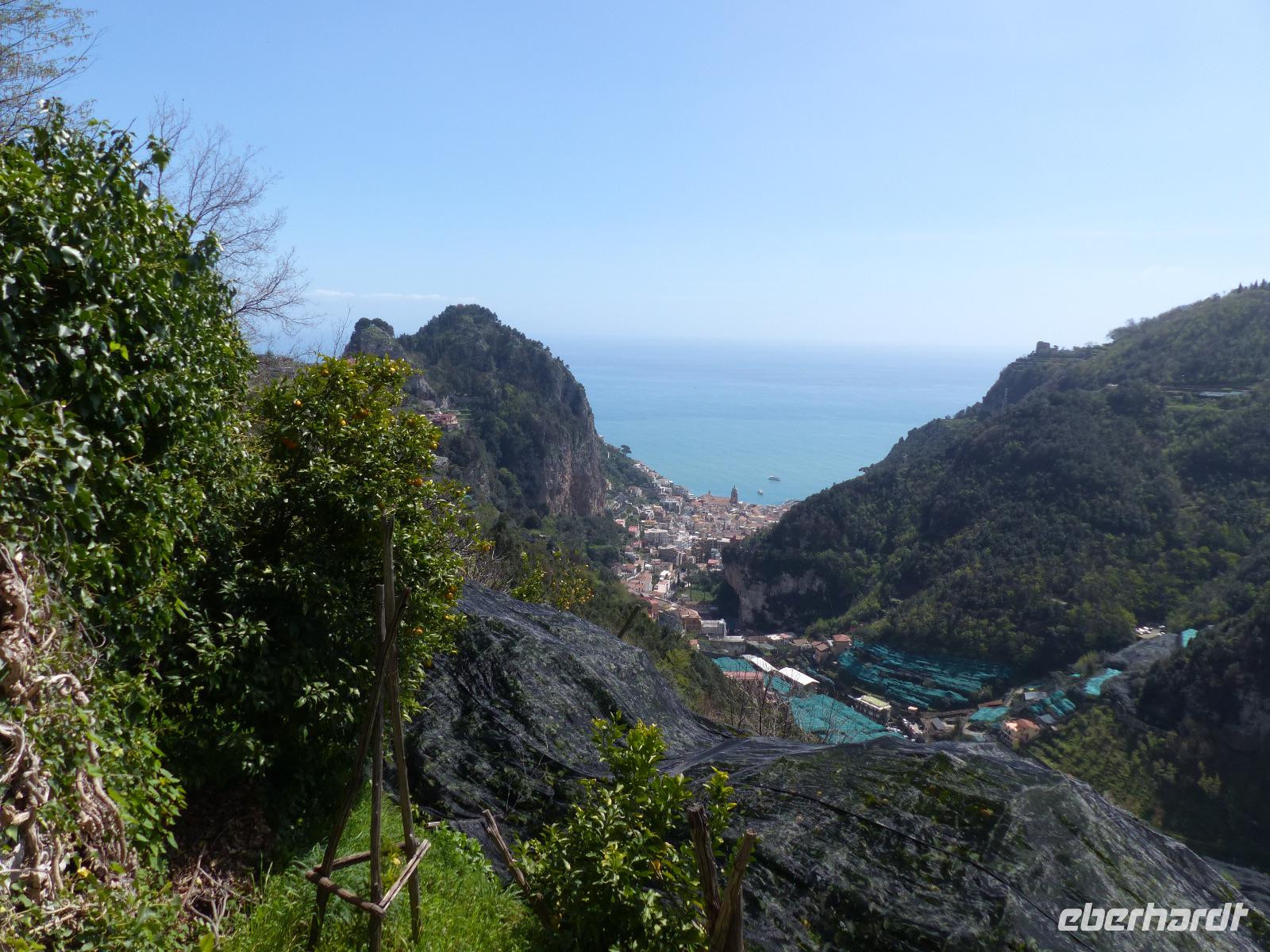 Unser gecharterter Bus brachte uns nach Amalfi. Am Morgen des Ostermontags war Amalfi fast menschenleer. Dort bewunderten wir die ganzjährig aufgestellten Weihnachtskrippen und besichtigten das Papiermuseum. Danach zogen wir los, durch Zitronenhaine am Ortsrand aufwärts ins Mühlental. Überall leuchteten uns die gelben Früchte entgegen. Aber fast alle waren mit schwarzen Netzen überzogen, die die reifen Früchte schützen. Bald schon ließen wir die Zitronenbäumchen hinter uns und durchwanderten das herrliche Valle dei Mulini, das Mühlental, passierten überwucherte alte Gemäuer und malerische Wasserfälle, und zwar an Stellen, wo sie eigentlich gar nicht hingehörten. In den vergangenen Wochen hatte es schrecklich viel geregnet. So wurden aus Rinnsalen richtige Flüsse. Unser Weg schlängelte sich durch Wald aufwärts. An einer alten Eisenhütte machten wir noch einen Abstecher zu einem Prachtexemplar von Wasserfall und suchten uns eine sonnige ruhigere Stelle für ein Picknick, denn die Jugend Neapels nutzte an Ostern das Tal zum Feiern. Dann folgte ein letzter Anstieg und es bot sich eine herrliche Aussicht auf Amalfi hinunter, bevor wir in Pontone auf dem Kirchplatz noch Kaffee tranken. In Atrani, das wir am Nachmittag erreichten, gönnten wir uns ein Eis, bevor wir nach Amalfi zurückwanderten. In Amalfi besichtigten wir dann noch den beeindruckenden Dom Sant' Andrea, bevor unser Bus uns wieder zu unserem angenehmen Hotel in Minori zurückbrachte. Hier ließen wir uns wie jeden Abend das schmackhafte Abendessen munden. Und jeder Gast bekam von Eberhardt-Travel noch eine frische Zitrone zum Abschluß dieses schönen ersten Wandertages geschenkt.