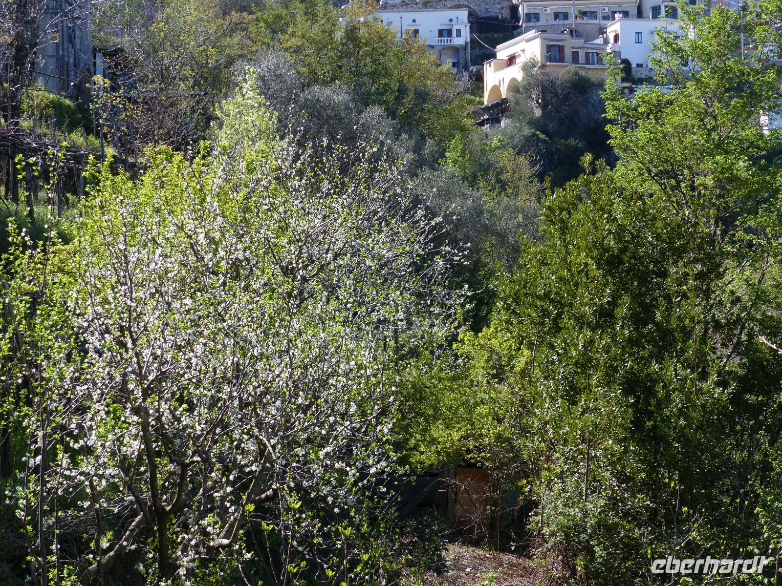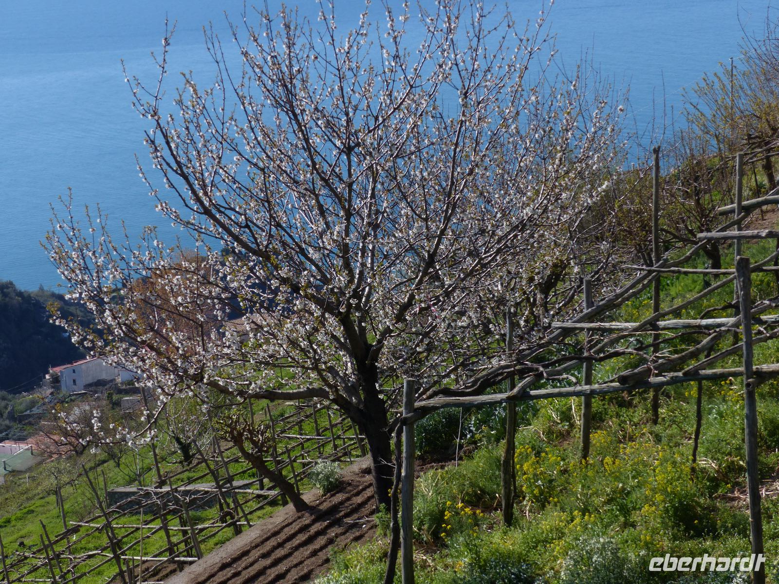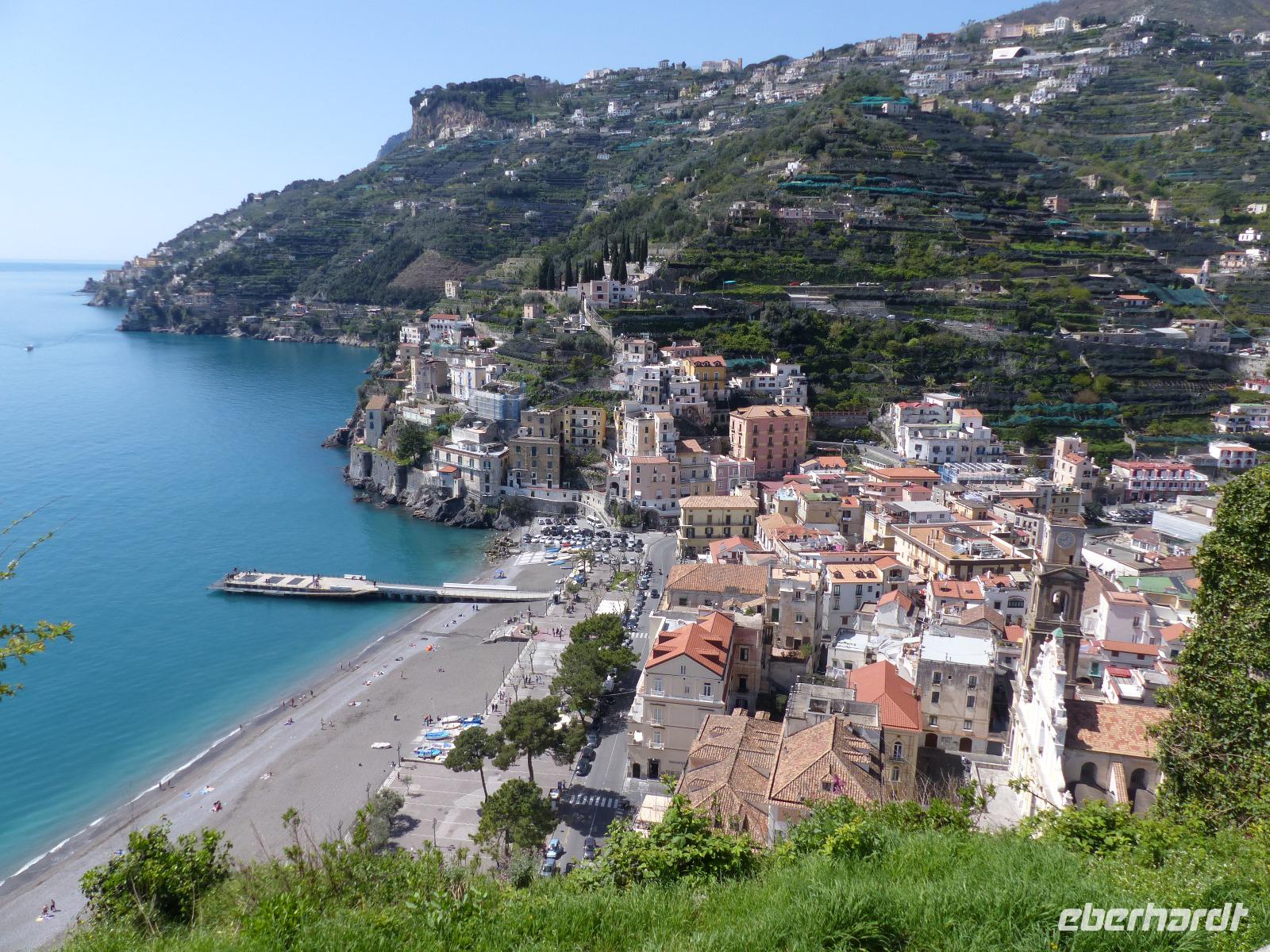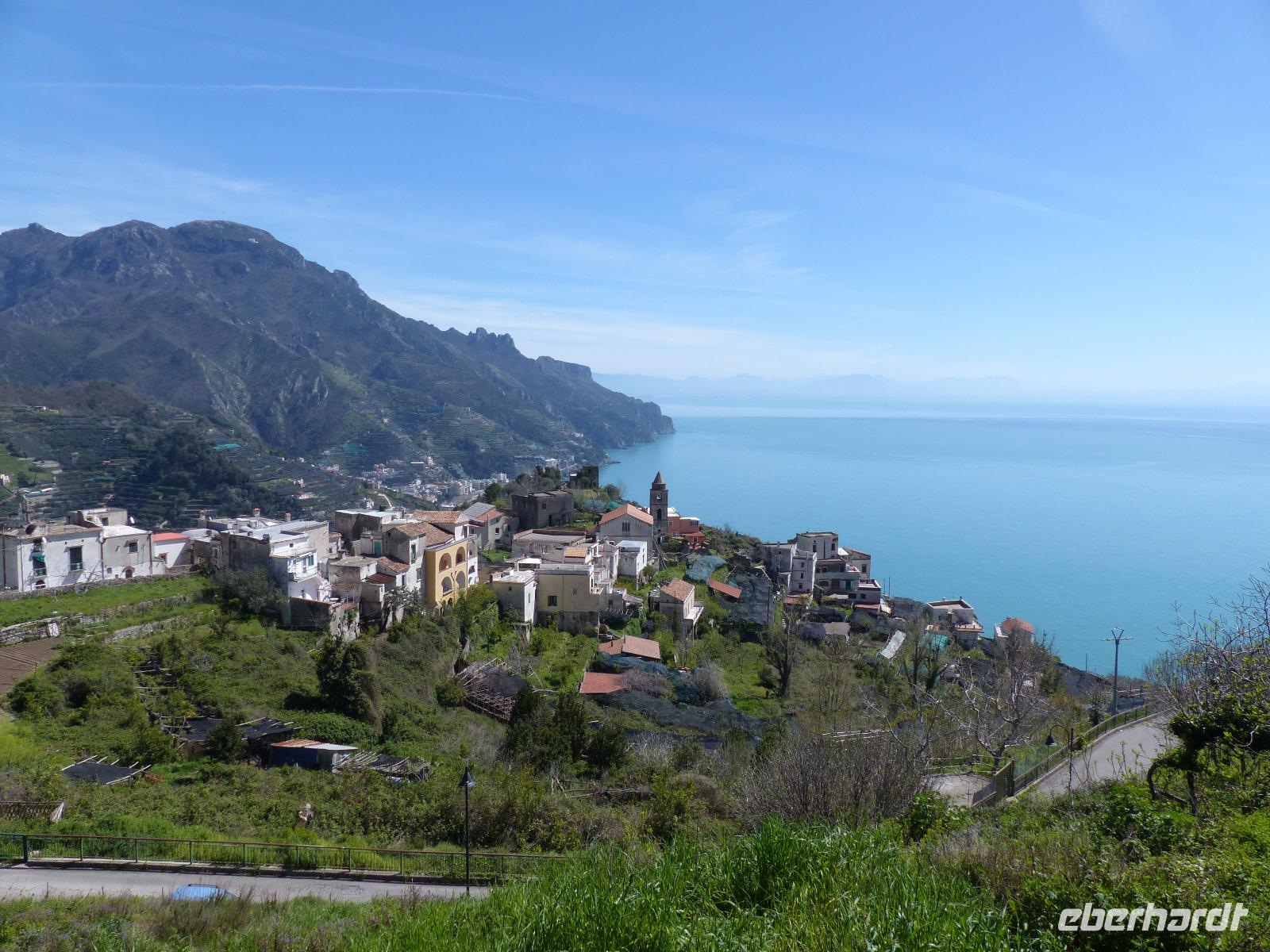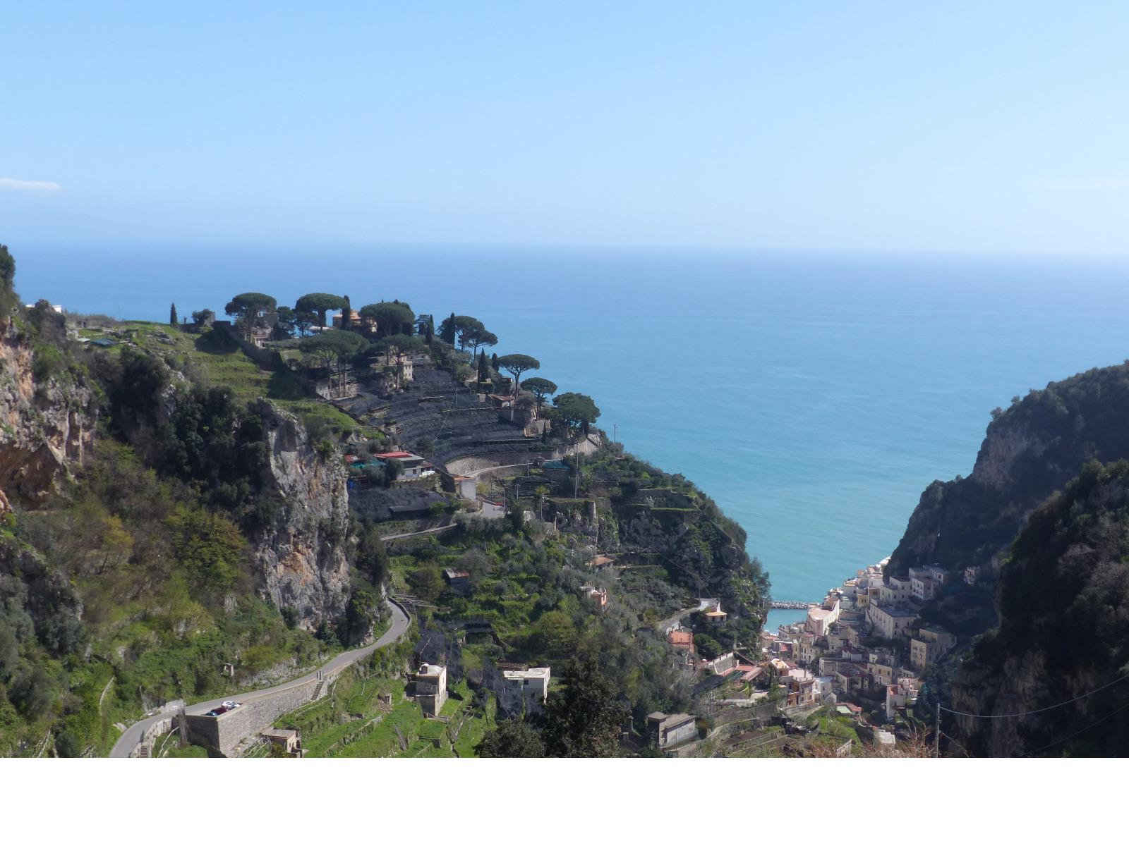 Unser gecharterter Bus brachte uns nach Amalfi. Am Morgen des Ostermontags war Amalfi fast menschenleer. Dort bewunderten wir die ganzjährig aufgestellten Weihnachtskrippen und besichtigten das Papiermuseum. Danach zogen wir los, durch Zitronenhaine am Ortsrand aufwärts ins Mühlental. Überall leuchteten uns die gelben Früchte entgegen. Aber fast alle waren mit schwarzen Netzen überzogen, die die reifen Früchte schützen. Bald schon ließen wir die Zitronenbäumchen hinter uns und durchwanderten das herrliche Valle dei Mulini, das Mühlental, passierten überwucherte alte Gemäuer und malerische Wasserfälle, und zwar an Stellen, wo sie eigentlich gar nicht hingehörten. In den vergangenen Wochen hatte es schrecklich viel geregnet. So wurden aus Rinnsalen richtige Flüsse. Unser Weg schlängelte sich durch Wald aufwärts. An einer alten Eisenhütte machten wir noch einen Abstecher zu einem Prachtexemplar von Wasserfall und suchten uns eine sonnige ruhigere Stelle für ein Picknick, denn die Jugend Neapels nutzte an Ostern das Tal zum Feiern. Dann folgte ein letzter Anstieg und es bot sich eine herrliche Aussicht auf Amalfi hinunter, bevor wir in Pontone auf dem Kirchplatz noch Kaffee tranken. In Atrani, das wir am Nachmittag erreichten, gönnten wir uns ein Eis, bevor wir nach Amalfi zurückwanderten. In Amalfi besichtigten wir dann noch den beeindruckenden Dom Sant' Andrea, bevor unser Bus uns wieder zu unserem angenehmen Hotel in Minori zurückbrachte. Hier ließen wir uns wie jeden Abend das schmackhafte Abendessen munden. Und jeder Gast bekam von Eberhardt-Travel noch eine frische Zitrone zum Abschluß dieses schönen ersten Wandertages geschenkt.