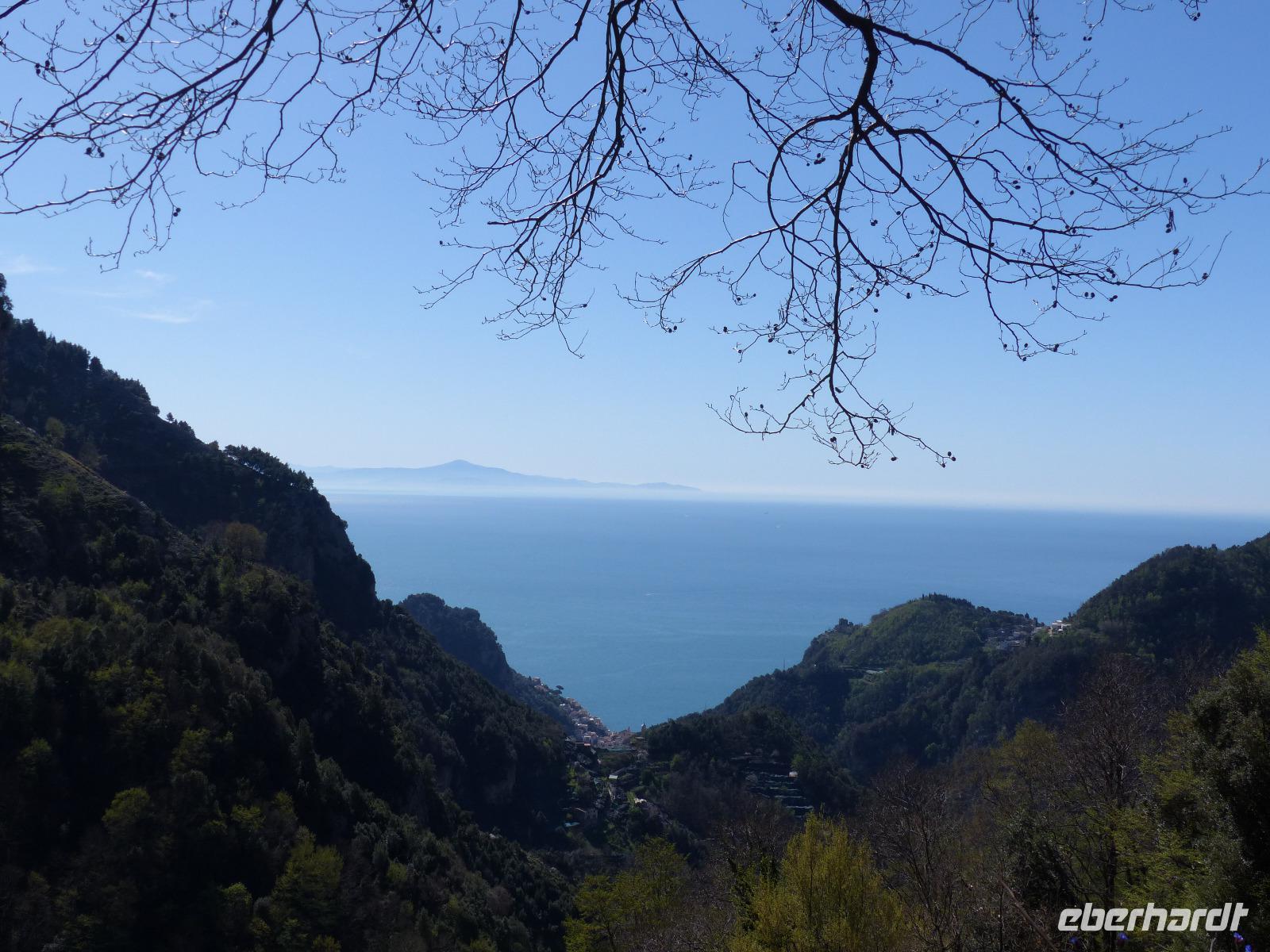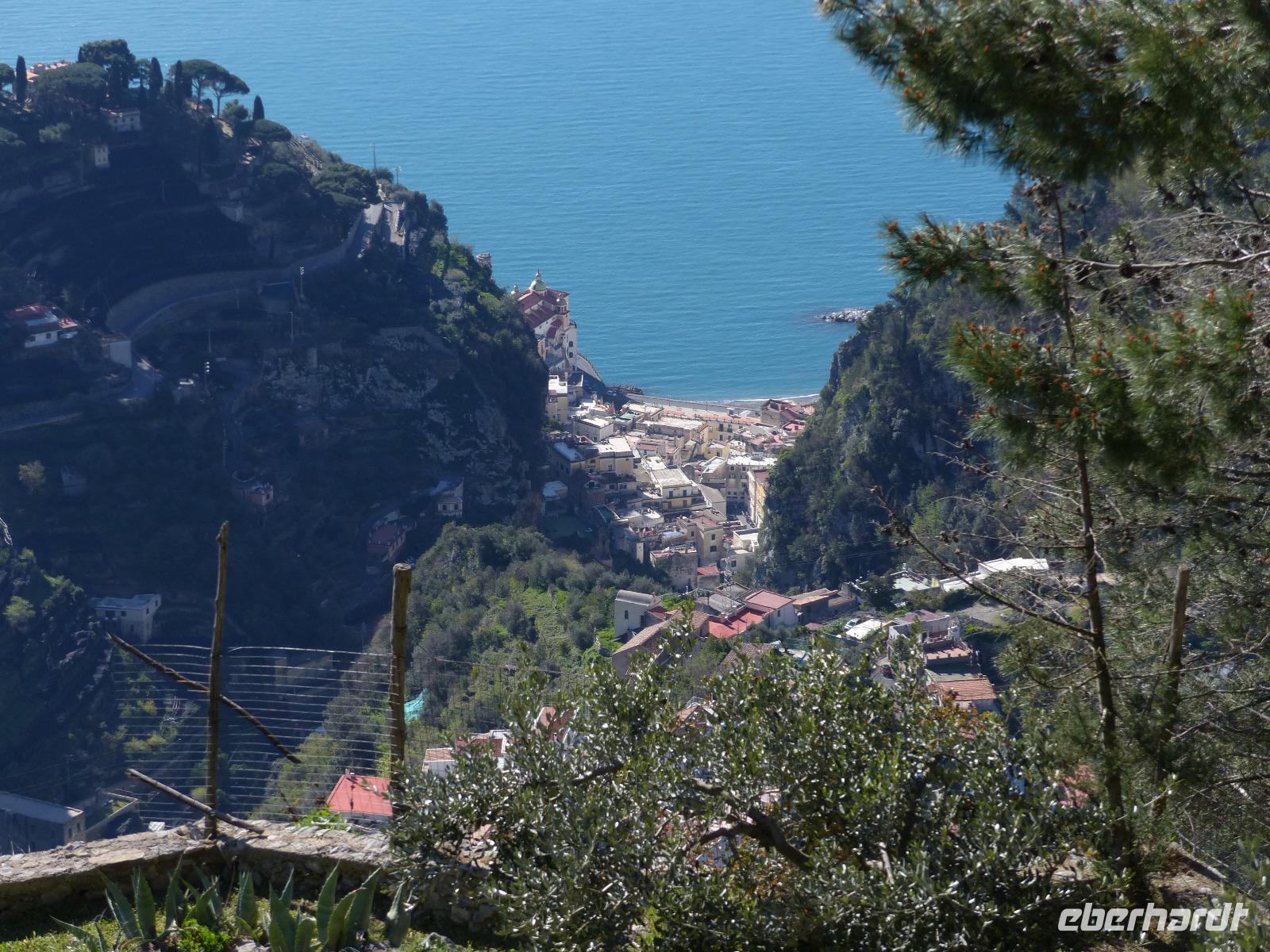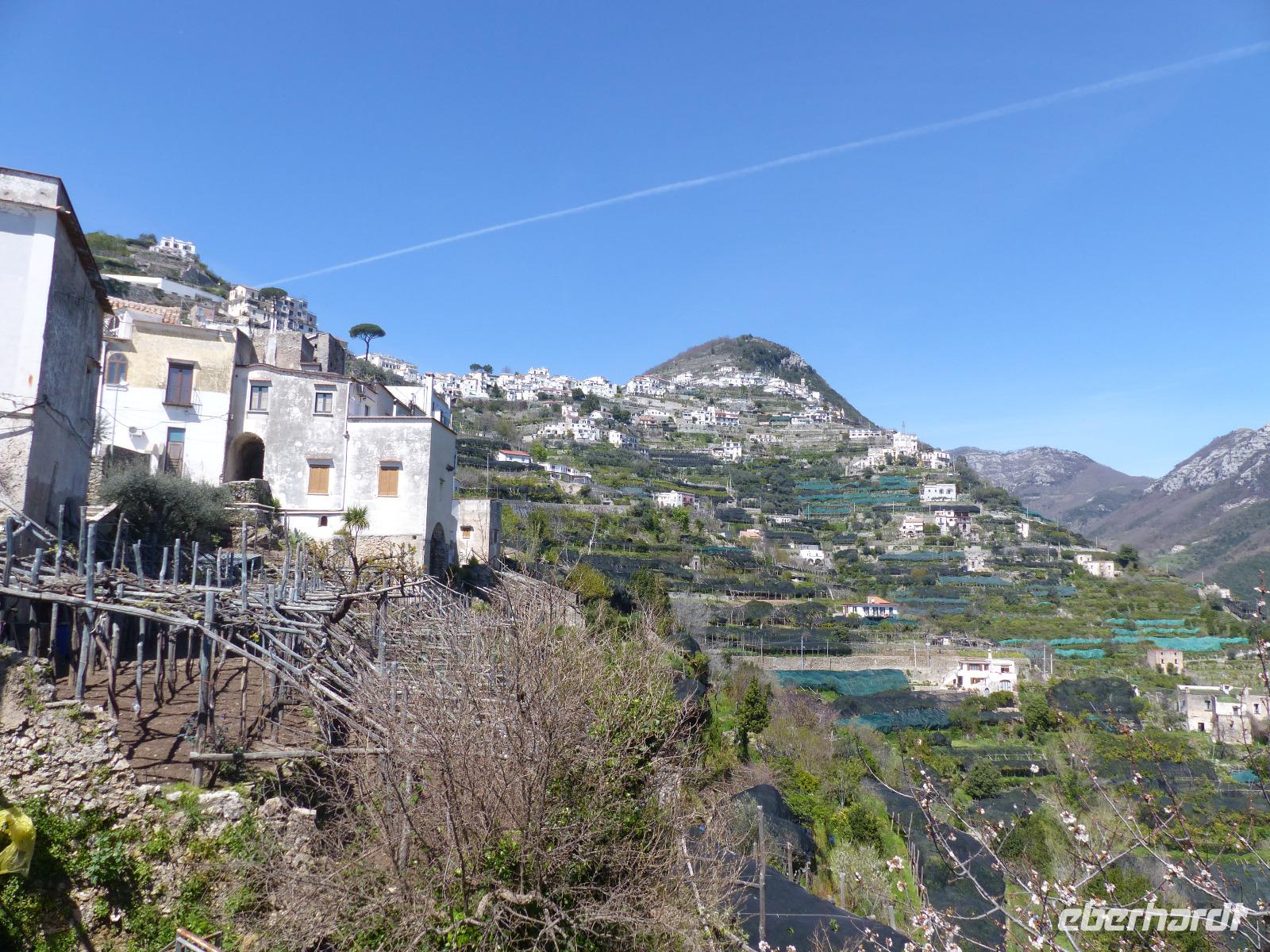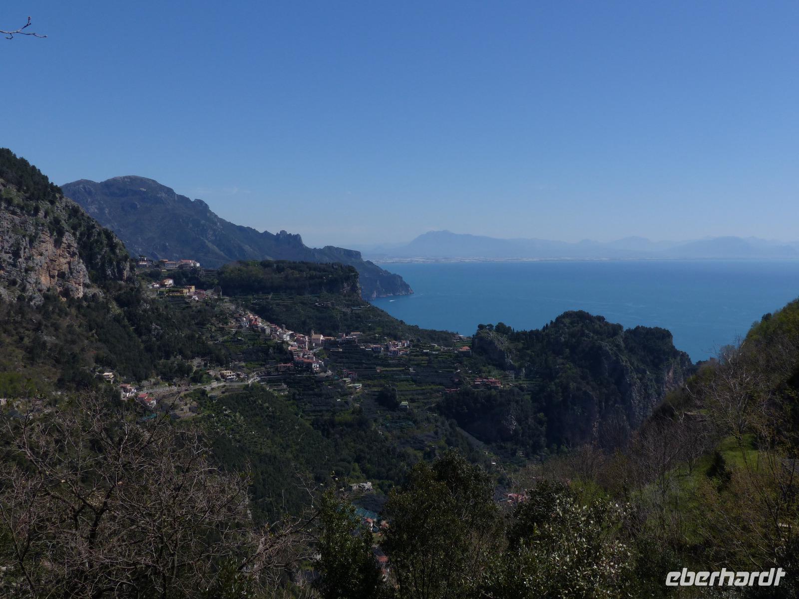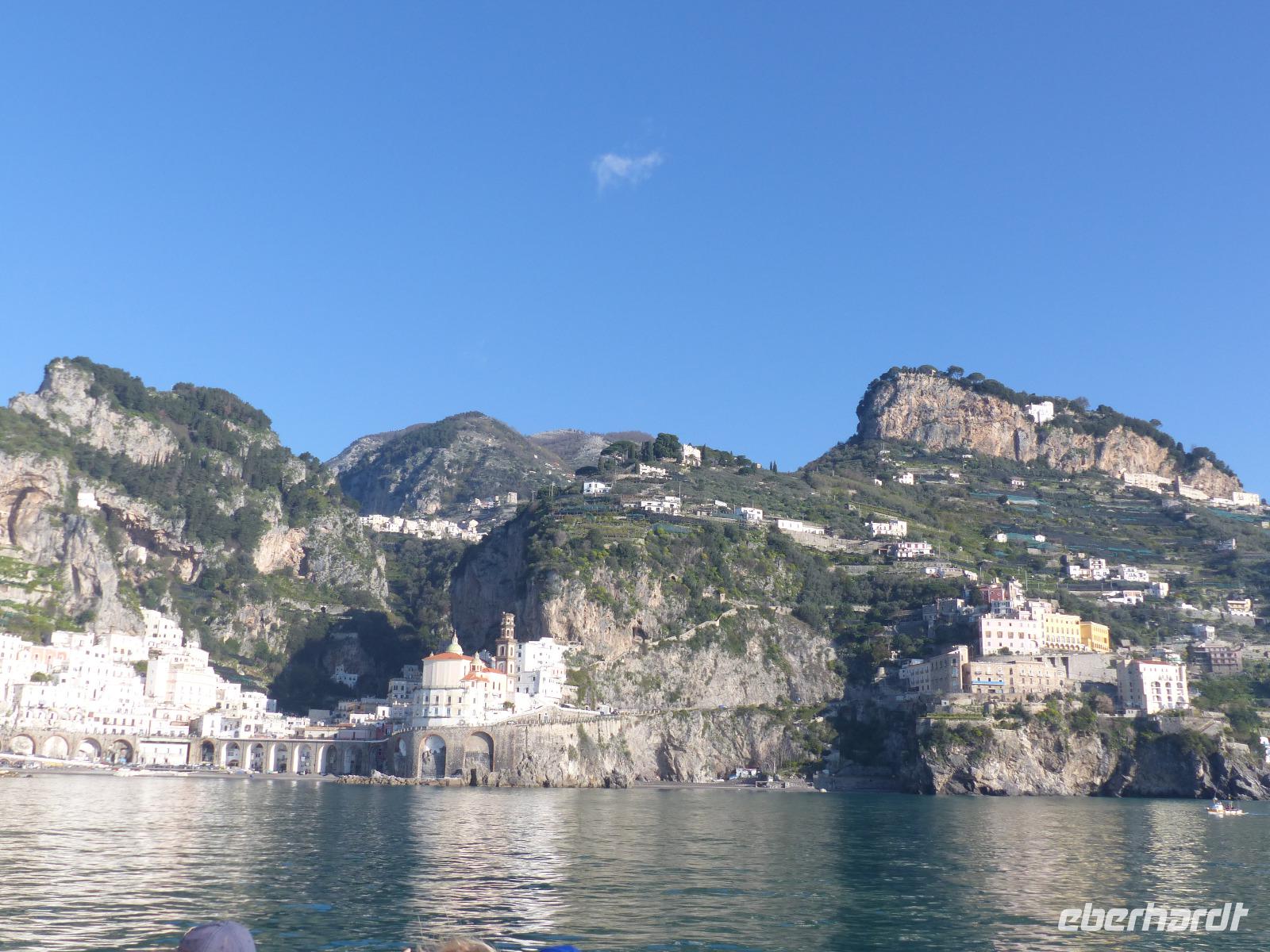 Unser gecharterter Bus brachte uns nach Amalfi. Am Morgen des Ostermontags war Amalfi fast menschenleer. Dort bewunderten wir die ganzjährig aufgestellten Weihnachtskrippen und besichtigten das Papiermuseum. Danach zogen wir los, durch Zitronenhaine am Ortsrand aufwärts ins Mühlental. Überall leuchteten uns die gelben Früchte entgegen. Aber fast alle waren mit schwarzen Netzen überzogen, die die reifen Früchte schützen. Bald schon ließen wir die Zitronenbäumchen hinter uns und durchwanderten das herrliche Valle dei Mulini, das Mühlental, passierten überwucherte alte Gemäuer und malerische Wasserfälle, und zwar an Stellen, wo sie eigentlich gar nicht hingehörten. In den vergangenen Wochen hatte es schrecklich viel geregnet. So wurden aus Rinnsalen richtige Flüsse. Unser Weg schlängelte sich durch Wald aufwärts. An einer alten Eisenhütte machten wir noch einen Abstecher zu einem Prachtexemplar von Wasserfall und suchten uns eine sonnige ruhigere Stelle für ein Picknick, denn die Jugend Neapels nutzte an Ostern das Tal zum Feiern. Dann folgte ein letzter Anstieg und es bot sich eine herrliche Aussicht auf Amalfi hinunter, bevor wir in Pontone auf dem Kirchplatz noch Kaffee tranken. In Atrani, das wir am Nachmittag erreichten, gönnten wir uns ein Eis, bevor wir nach Amalfi zurückwanderten. In Amalfi besichtigten wir dann noch den beeindruckenden Dom Sant' Andrea, bevor unser Bus uns wieder zu unserem angenehmen Hotel in Minori zurückbrachte. Hier ließen wir uns wie jeden Abend das schmackhafte Abendessen munden. Und jeder Gast bekam von Eberhardt-Travel noch eine frische Zitrone zum Abschluß dieses schönen ersten Wandertages geschenkt.