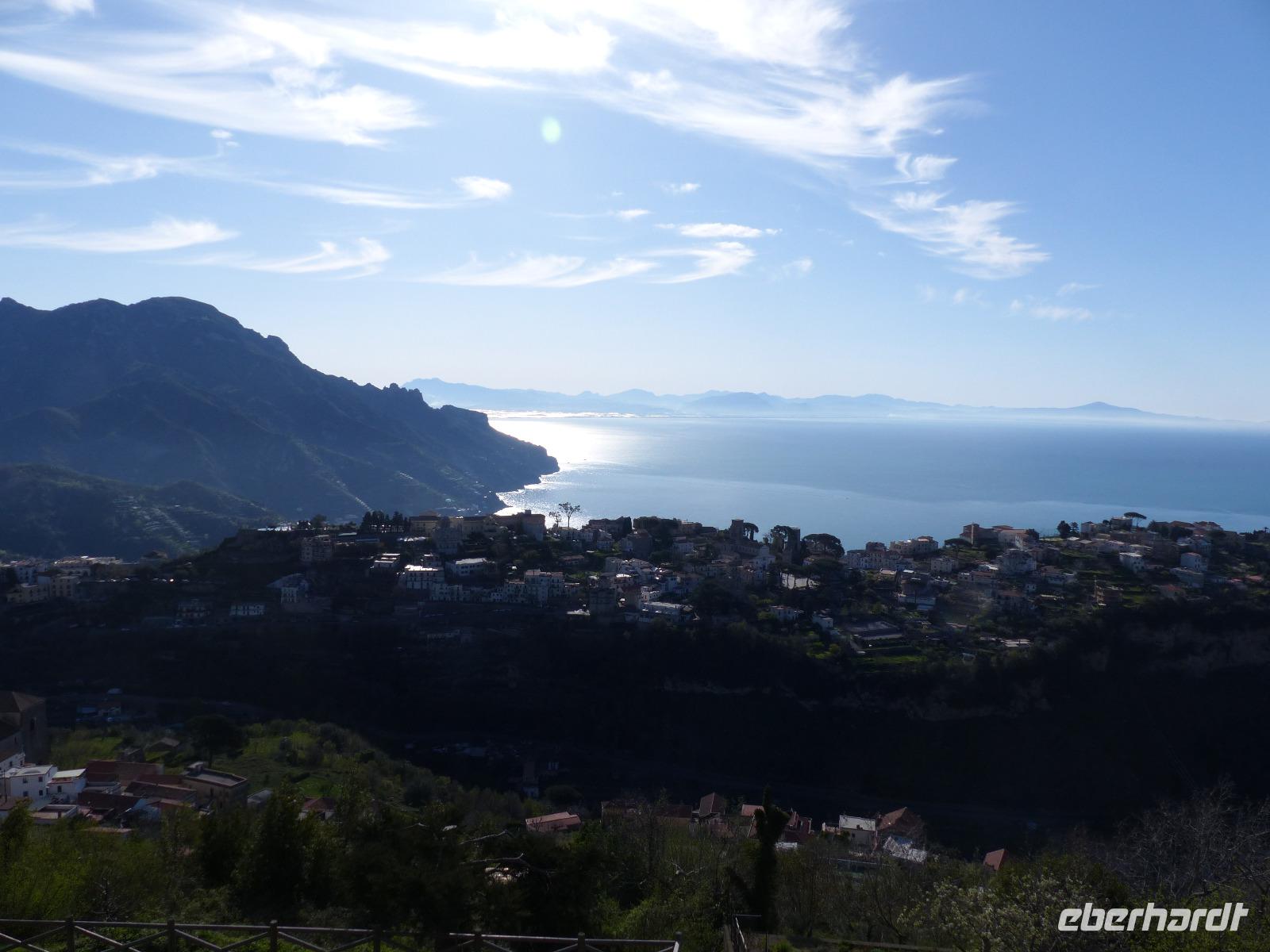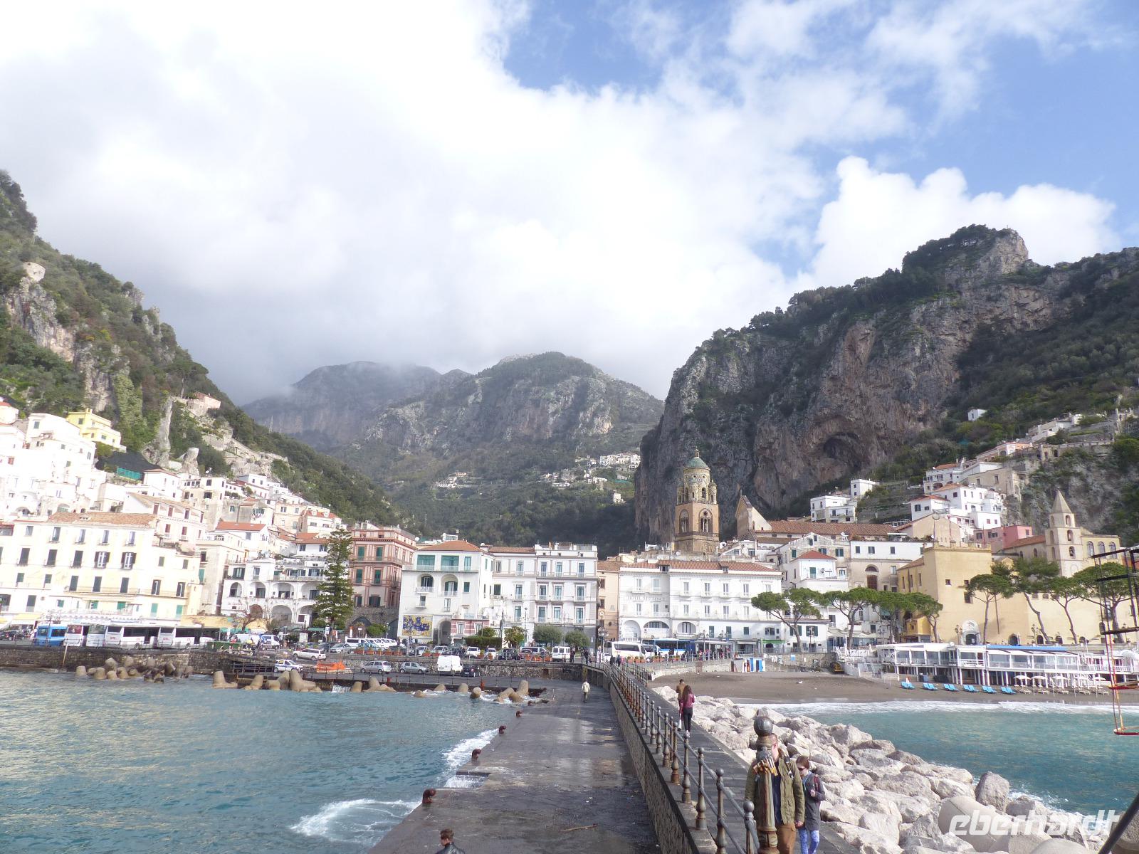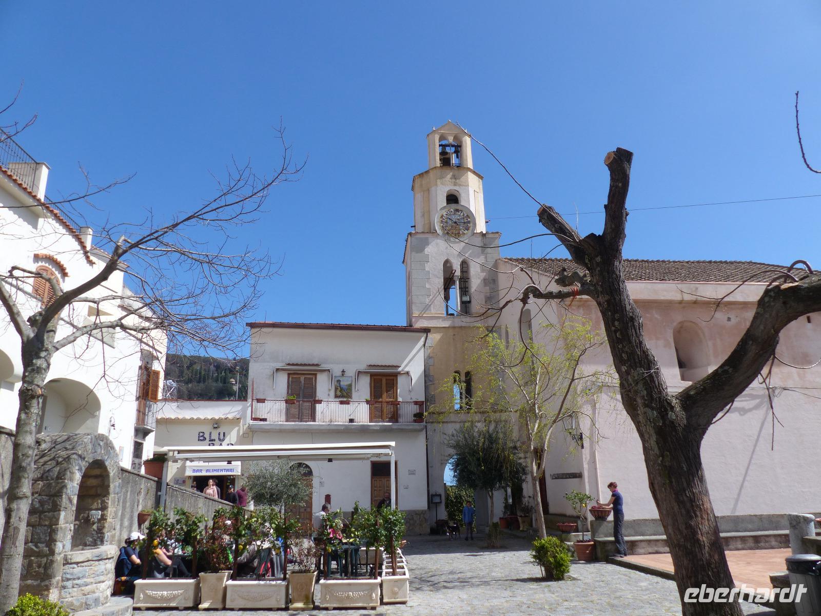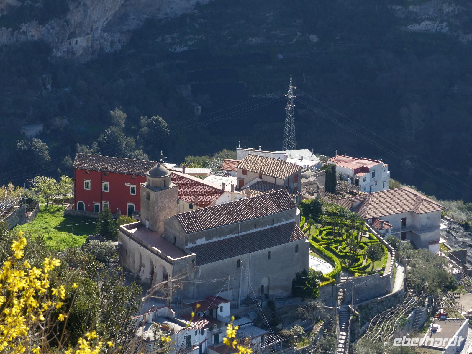 Unser gecharterter Bus brachte uns nach Amalfi. Am Morgen des Ostermontags war Amalfi fast menschenleer. Dort bewunderten wir die ganzjährig aufgestellten Weihnachtskrippen und besichtigten das Papiermuseum. Danach zogen wir los, durch Zitronenhaine am Ortsrand aufwärts ins Mühlental. Überall leuchteten uns die gelben Früchte entgegen. Aber fast alle waren mit schwarzen Netzen überzogen, die die reifen Früchte schützen. Bald schon ließen wir die Zitronenbäumchen hinter uns und durchwanderten das herrliche Valle dei Mulini, das Mühlental, passierten überwucherte alte Gemäuer und malerische Wasserfälle, und zwar an Stellen, wo sie eigentlich gar nicht hingehörten. In den vergangenen Wochen hatte es schrecklich viel geregnet. So wurden aus Rinnsalen richtige Flüsse. Unser Weg schlängelte sich durch Wald aufwärts. An einer alten Eisenhütte machten wir noch einen Abstecher zu einem Prachtexemplar von Wasserfall und suchten uns eine sonnige ruhigere Stelle für ein Picknick, denn die Jugend Neapels nutzte an Ostern das Tal zum Feiern. Dann folgte ein letzter Anstieg und es bot sich eine herrliche Aussicht auf Amalfi hinunter, bevor wir in Pontone auf dem Kirchplatz noch Kaffee tranken. In Atrani, das wir am Nachmittag erreichten, gönnten wir uns ein Eis, bevor wir nach Amalfi zurückwanderten. In Amalfi besichtigten wir dann noch den beeindruckenden Dom Sant' Andrea, bevor unser Bus uns wieder zu unserem angenehmen Hotel in Minori zurückbrachte. Hier ließen wir uns wie jeden Abend das schmackhafte Abendessen munden. Und jeder Gast bekam von Eberhardt-Travel noch eine frische Zitrone zum Abschluß dieses schönen ersten Wandertages geschenkt.