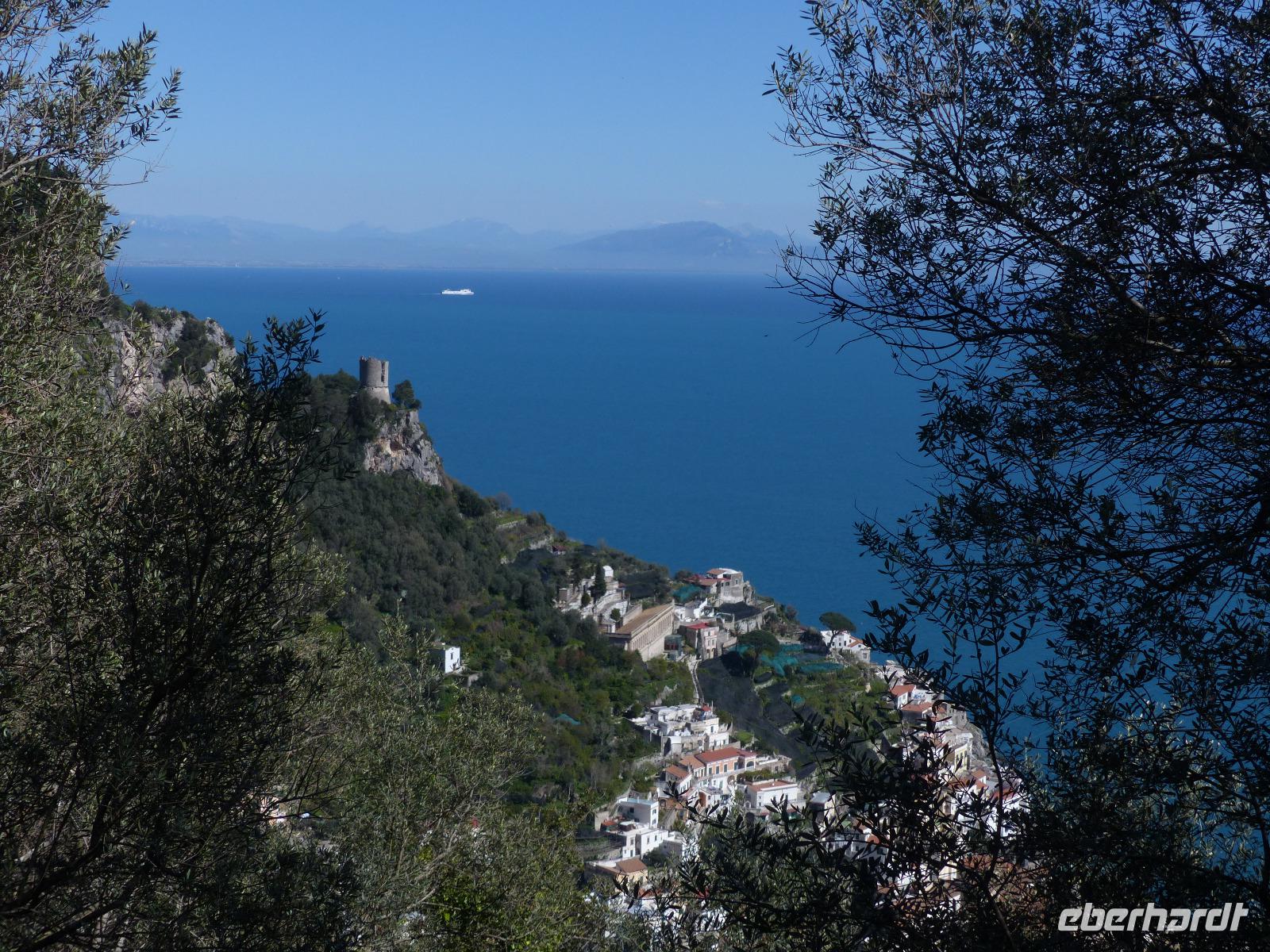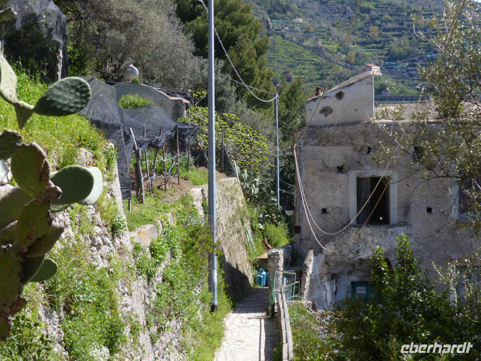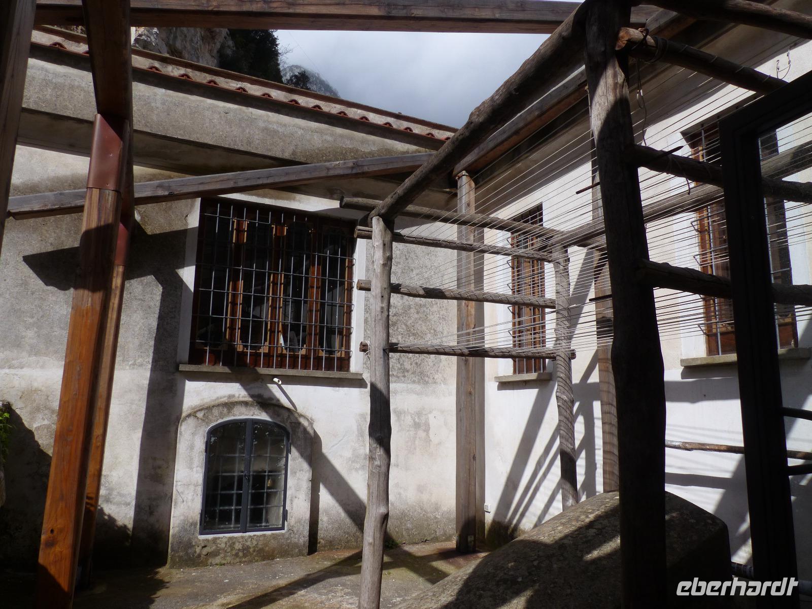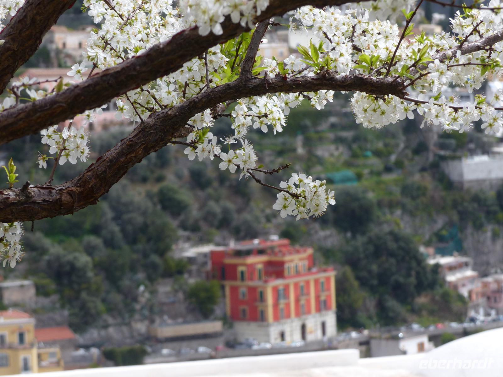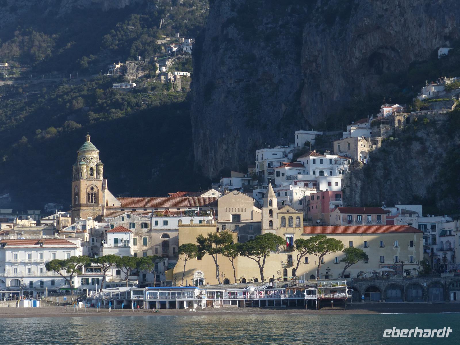 Unser gecharterter Bus brachte uns nach Amalfi. Am Morgen des Ostermontags war Amalfi fast menschenleer. Dort bewunderten wir die ganzjährig aufgestellten Weihnachtskrippen und besichtigten das Papiermuseum. Danach zogen wir los, durch Zitronenhaine am Ortsrand aufwärts ins Mühlental. Überall leuchteten uns die gelben Früchte entgegen. Aber fast alle waren mit schwarzen Netzen überzogen, die die reifen Früchte schützen. Bald schon ließen wir die Zitronenbäumchen hinter uns und durchwanderten das herrliche Valle dei Mulini, das Mühlental, passierten überwucherte alte Gemäuer und malerische Wasserfälle, und zwar an Stellen, wo sie eigentlich gar nicht hingehörten. In den vergangenen Wochen hatte es schrecklich viel geregnet. So wurden aus Rinnsalen richtige Flüsse. Unser Weg schlängelte sich durch Wald aufwärts. An einer alten Eisenhütte machten wir noch einen Abstecher zu einem Prachtexemplar von Wasserfall und suchten uns eine sonnige ruhigere Stelle für ein Picknick, denn die Jugend Neapels nutzte an Ostern das Tal zum Feiern. Dann folgte ein letzter Anstieg und es bot sich eine herrliche Aussicht auf Amalfi hinunter, bevor wir in Pontone auf dem Kirchplatz noch Kaffee tranken. In Atrani, das wir am Nachmittag erreichten, gönnten wir uns ein Eis, bevor wir nach Amalfi zurückwanderten. In Amalfi besichtigten wir dann noch den beeindruckenden Dom Sant' Andrea, bevor unser Bus uns wieder zu unserem angenehmen Hotel in Minori zurückbrachte. Hier ließen wir uns wie jeden Abend das schmackhafte Abendessen munden. Und jeder Gast bekam von Eberhardt-Travel noch eine frische Zitrone zum Abschluß dieses schönen ersten Wandertages geschenkt.