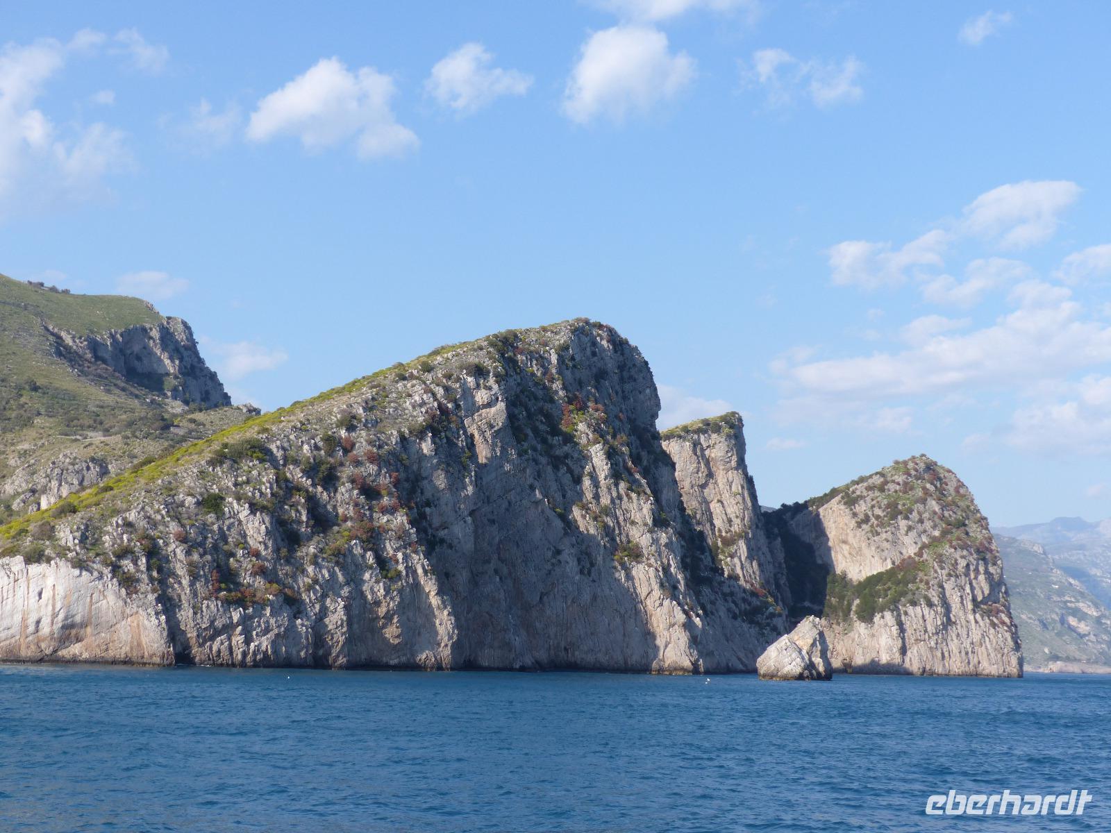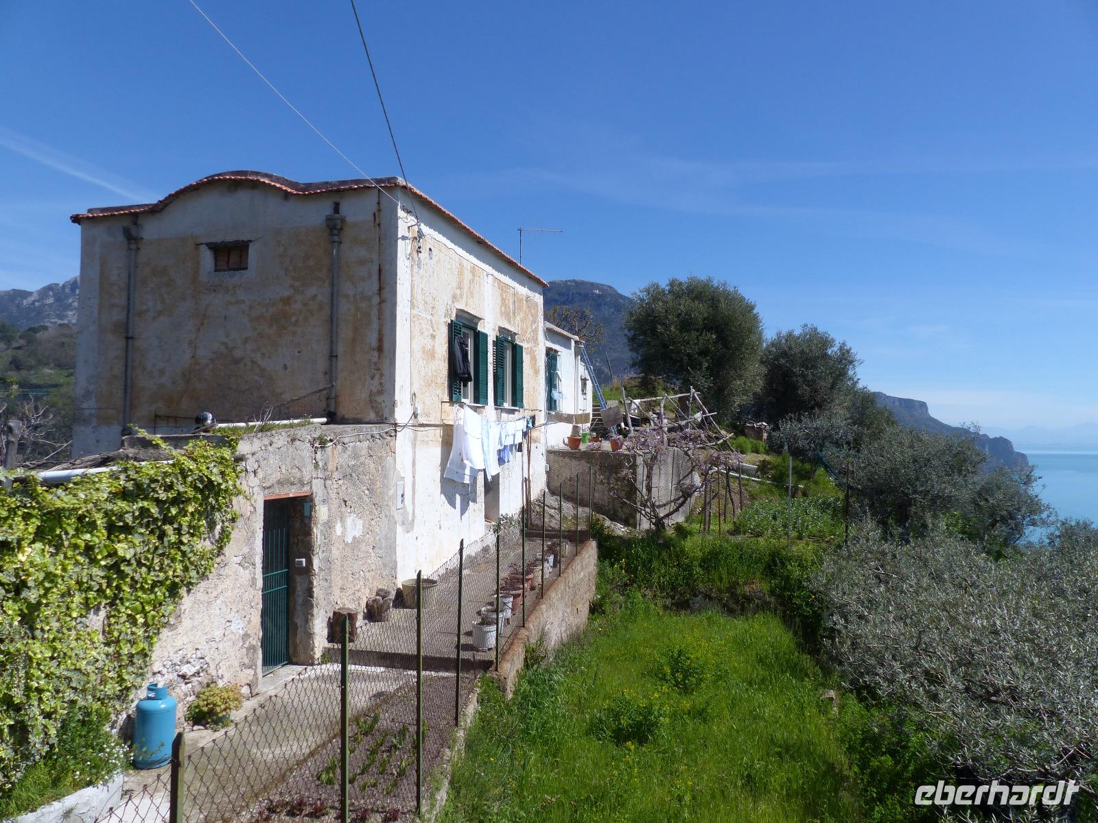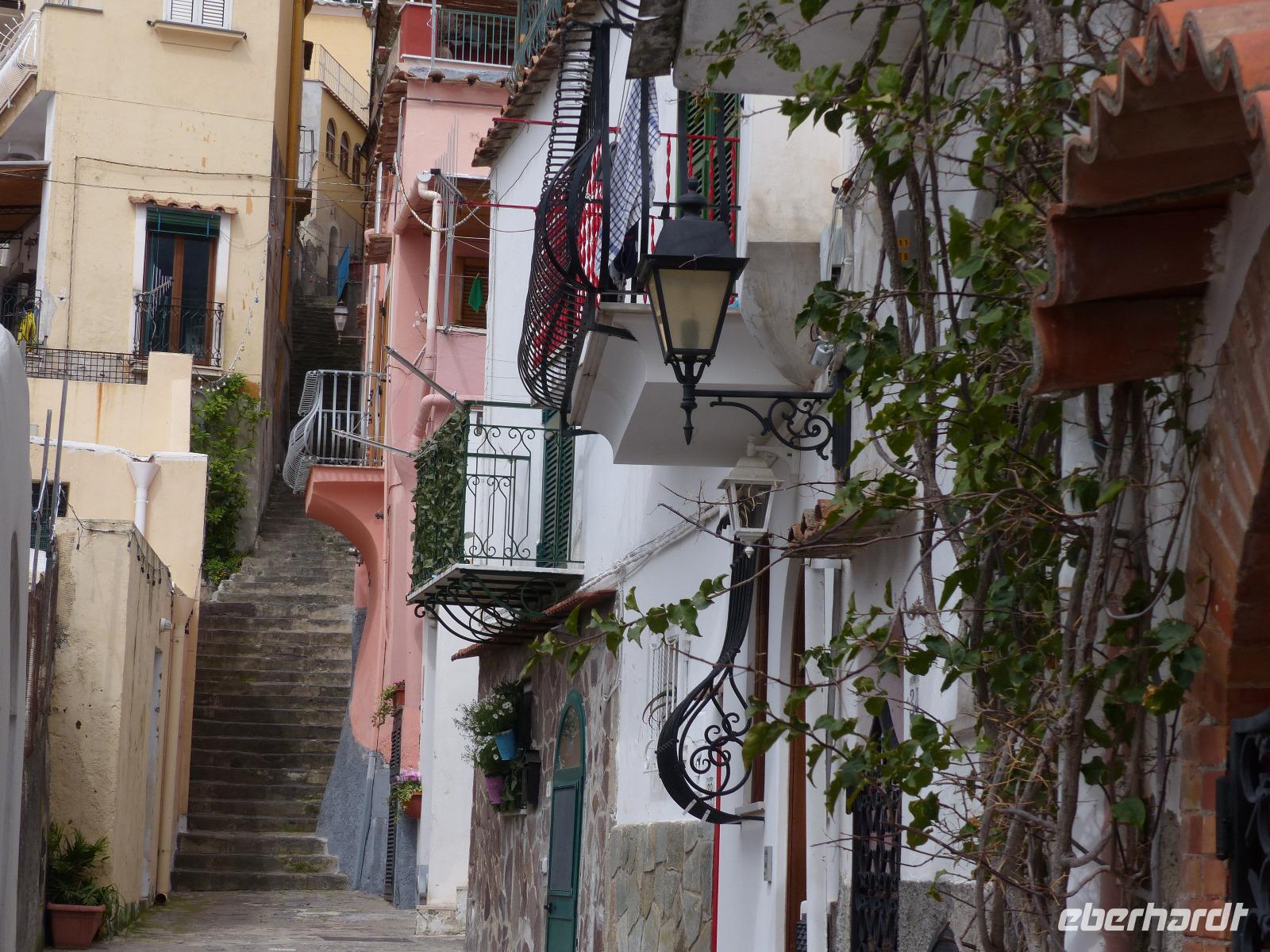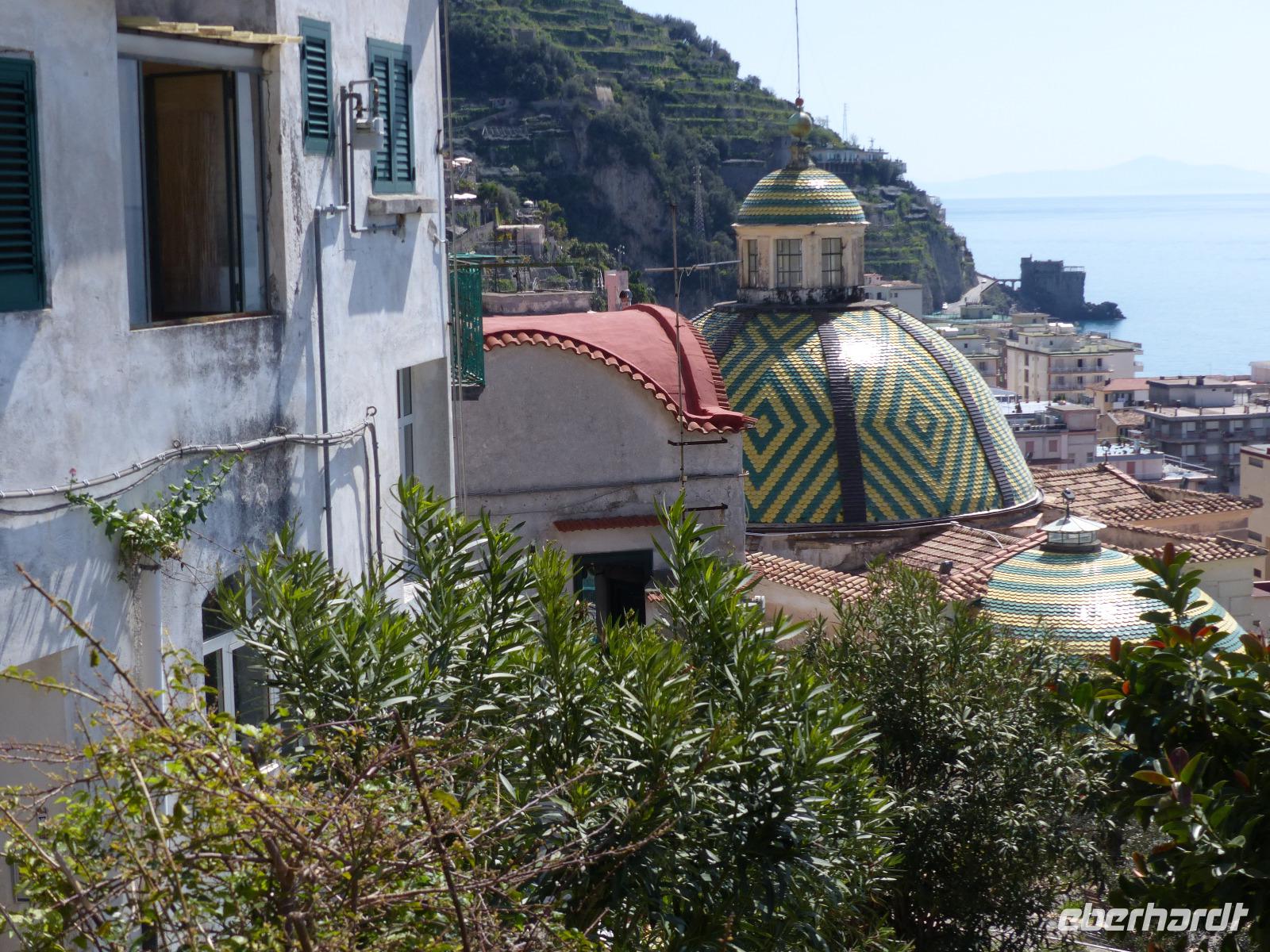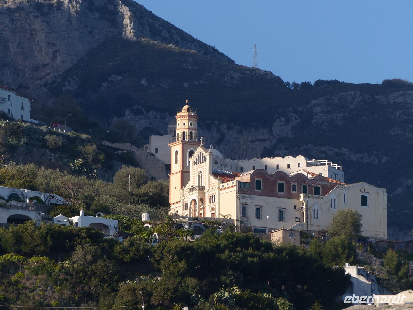 Unser gecharterter Bus brachte uns nach Amalfi. Am Morgen des Ostermontags war Amalfi fast menschenleer. Dort bewunderten wir die ganzjährig aufgestellten Weihnachtskrippen und besichtigten das Papiermuseum. Danach zogen wir los, durch Zitronenhaine am Ortsrand aufwärts ins Mühlental. Überall leuchteten uns die gelben Früchte entgegen. Aber fast alle waren mit schwarzen Netzen überzogen, die die reifen Früchte schützen. Bald schon ließen wir die Zitronenbäumchen hinter uns und durchwanderten das herrliche Valle dei Mulini, das Mühlental, passierten überwucherte alte Gemäuer und malerische Wasserfälle, und zwar an Stellen, wo sie eigentlich gar nicht hingehörten. In den vergangenen Wochen hatte es schrecklich viel geregnet. So wurden aus Rinnsalen richtige Flüsse. Unser Weg schlängelte sich durch Wald aufwärts. An einer alten Eisenhütte machten wir noch einen Abstecher zu einem Prachtexemplar von Wasserfall und suchten uns eine sonnige ruhigere Stelle für ein Picknick, denn die Jugend Neapels nutzte an Ostern das Tal zum Feiern. Dann folgte ein letzter Anstieg und es bot sich eine herrliche Aussicht auf Amalfi hinunter, bevor wir in Pontone auf dem Kirchplatz noch Kaffee tranken. In Atrani, das wir am Nachmittag erreichten, gönnten wir uns ein Eis, bevor wir nach Amalfi zurückwanderten. In Amalfi besichtigten wir dann noch den beeindruckenden Dom Sant' Andrea, bevor unser Bus uns wieder zu unserem angenehmen Hotel in Minori zurückbrachte. Hier ließen wir uns wie jeden Abend das schmackhafte Abendessen munden. Und jeder Gast bekam von Eberhardt-Travel noch eine frische Zitrone zum Abschluß dieses schönen ersten Wandertages geschenkt.