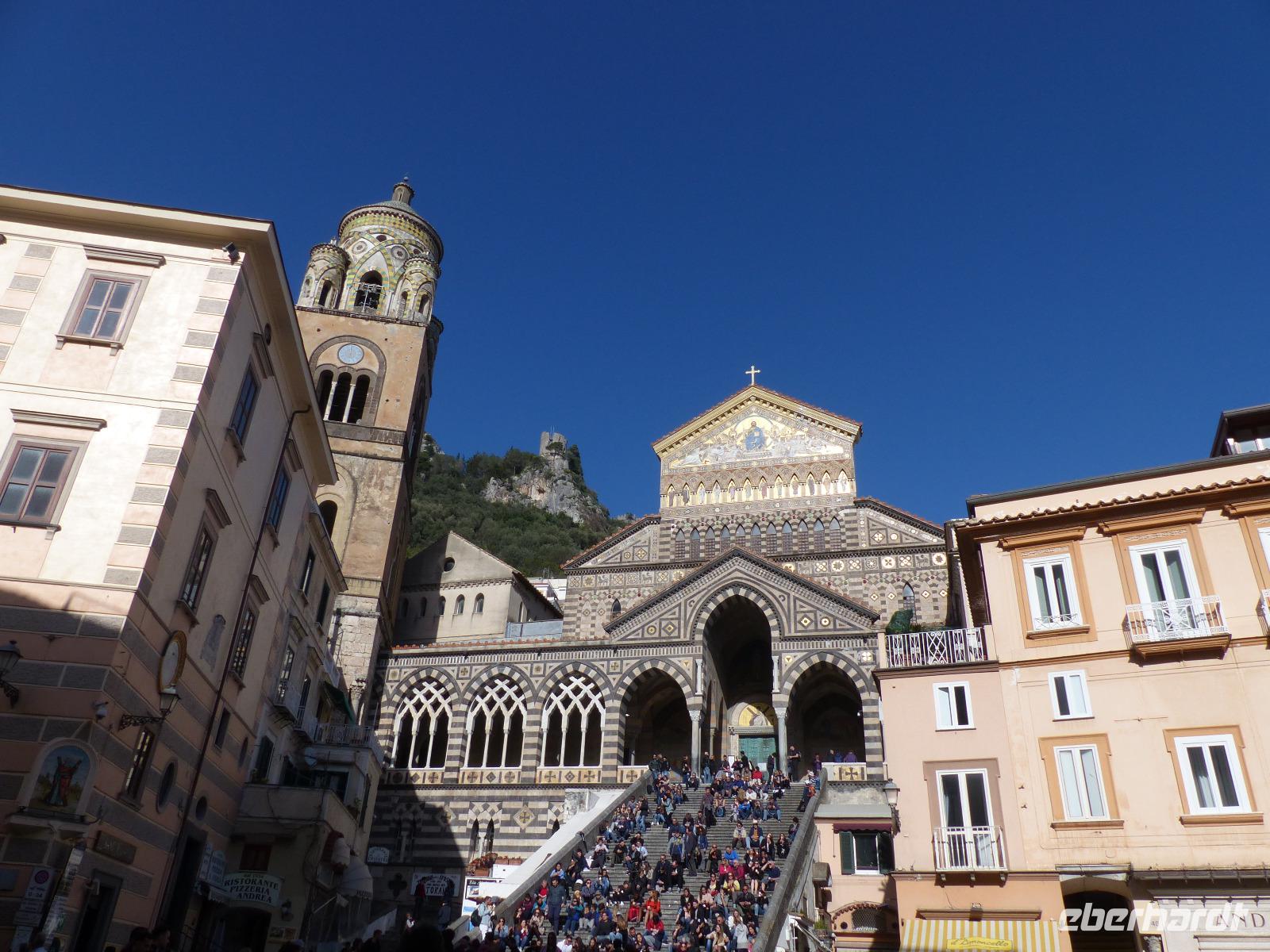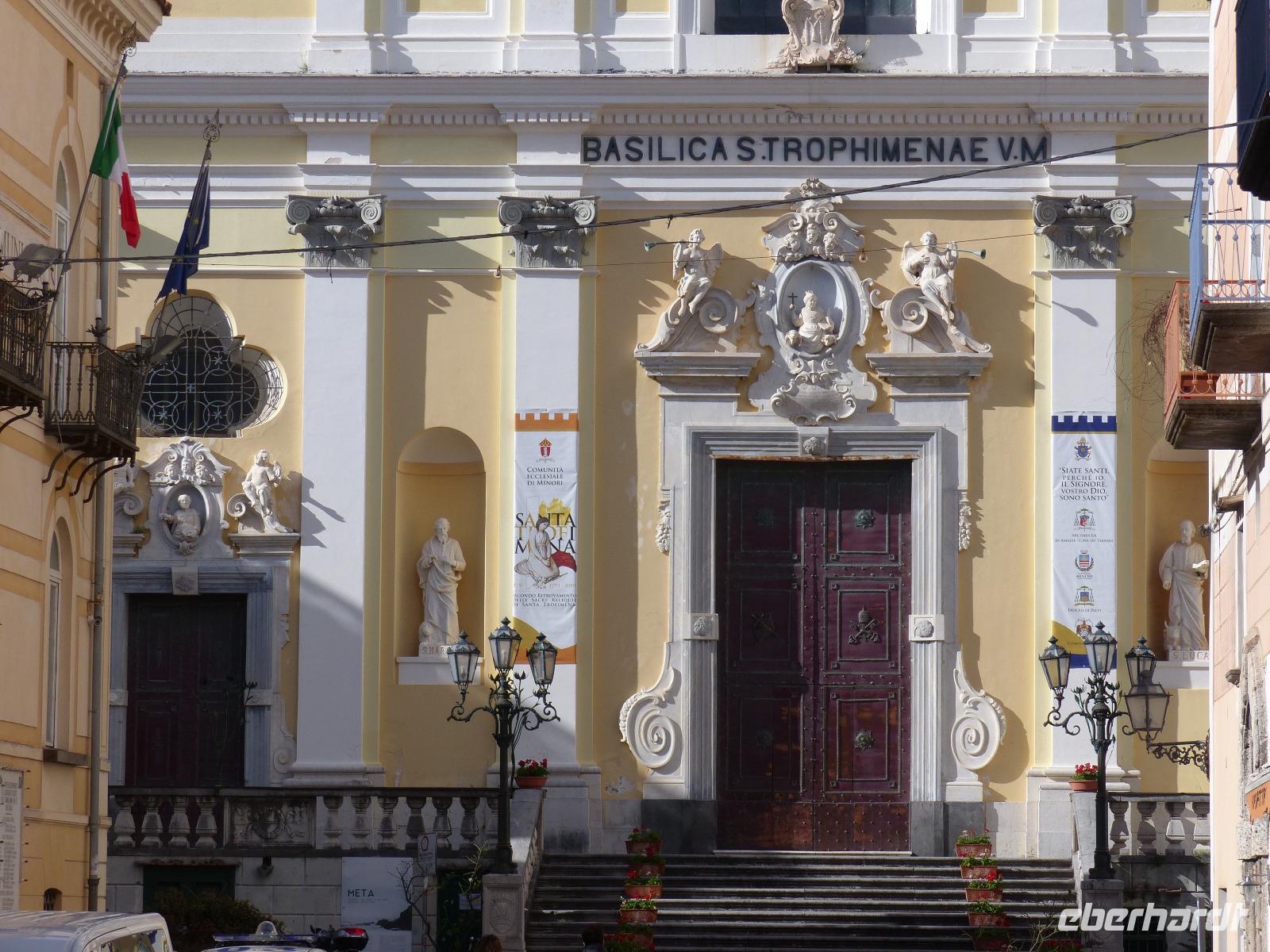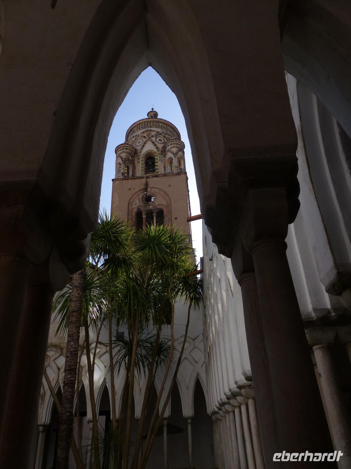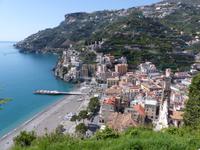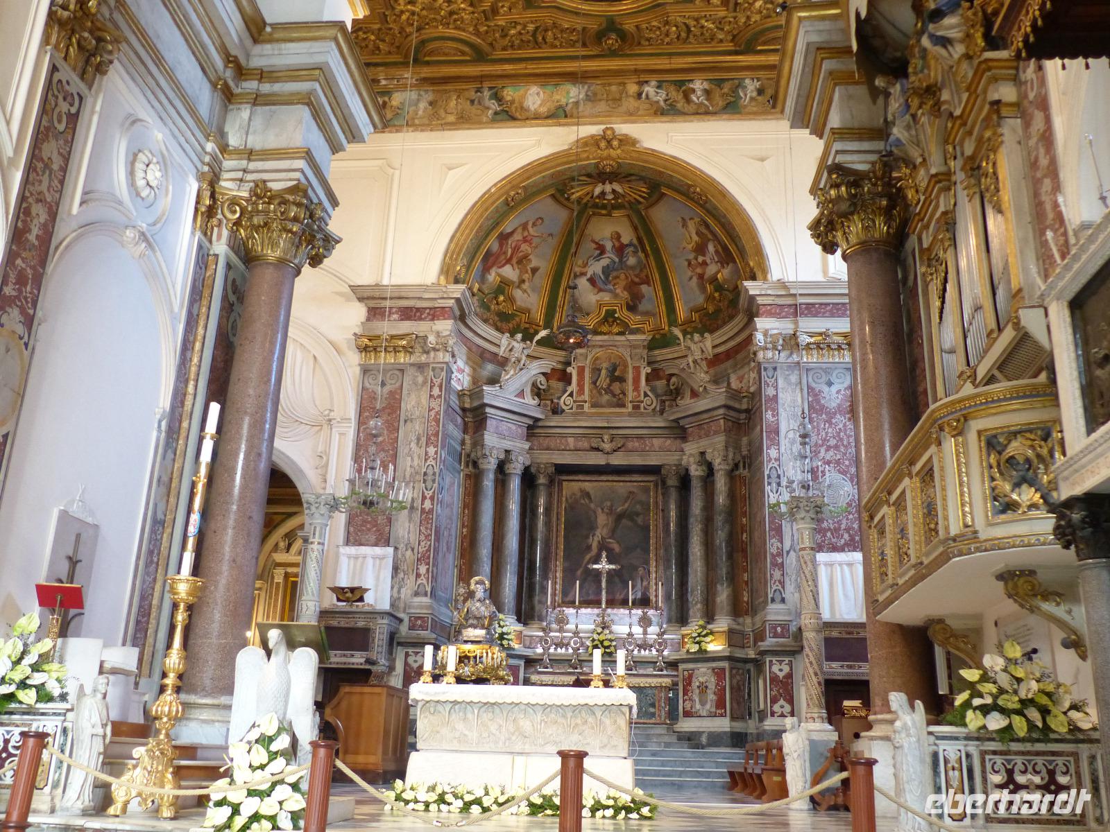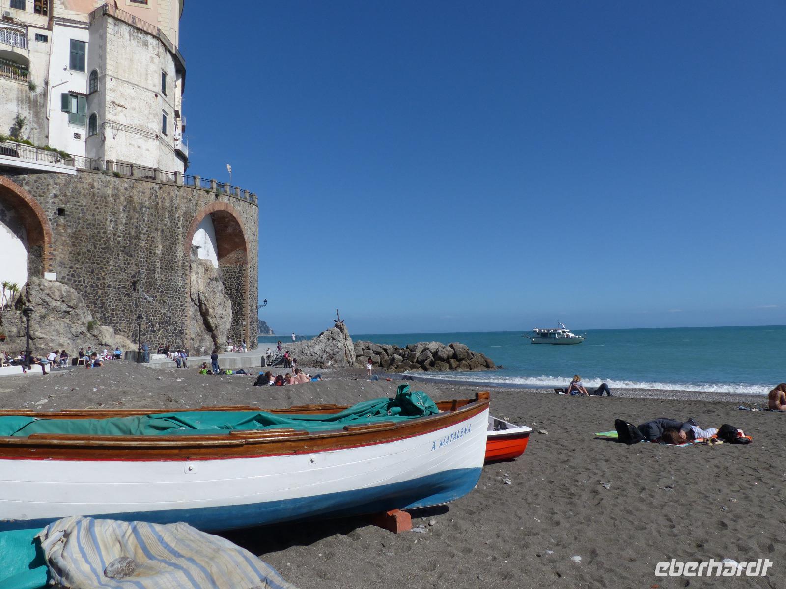 Unser gecharterter Bus brachte uns nach Amalfi. Am Morgen des Ostermontags war Amalfi fast menschenleer. Dort bewunderten wir die ganzjährig aufgestellten Weihnachtskrippen und besichtigten das Papiermuseum. Danach zogen wir los, durch Zitronenhaine am Ortsrand aufwärts ins Mühlental. Überall leuchteten uns die gelben Früchte entgegen. Aber fast alle waren mit schwarzen Netzen überzogen, die die reifen Früchte schützen. Bald schon ließen wir die Zitronenbäumchen hinter uns und durchwanderten das herrliche Valle dei Mulini, das Mühlental, passierten überwucherte alte Gemäuer und malerische Wasserfälle, und zwar an Stellen, wo sie eigentlich gar nicht hingehörten. In den vergangenen Wochen hatte es schrecklich viel geregnet. So wurden aus Rinnsalen richtige Flüsse. Unser Weg schlängelte sich durch Wald aufwärts. An einer alten Eisenhütte machten wir noch einen Abstecher zu einem Prachtexemplar von Wasserfall und suchten uns eine sonnige ruhigere Stelle für ein Picknick, denn die Jugend Neapels nutzte an Ostern das Tal zum Feiern. Dann folgte ein letzter Anstieg und es bot sich eine herrliche Aussicht auf Amalfi hinunter, bevor wir in Pontone auf dem Kirchplatz noch Kaffee tranken. In Atrani, das wir am Nachmittag erreichten, gönnten wir uns ein Eis, bevor wir nach Amalfi zurückwanderten. In Amalfi besichtigten wir dann noch den beeindruckenden Dom Sant' Andrea, bevor unser Bus uns wieder zu unserem angenehmen Hotel in Minori zurückbrachte. Hier ließen wir uns wie jeden Abend das schmackhafte Abendessen munden. Und jeder Gast bekam von Eberhardt-Travel noch eine frische Zitrone zum Abschluß dieses schönen ersten Wandertages geschenkt.