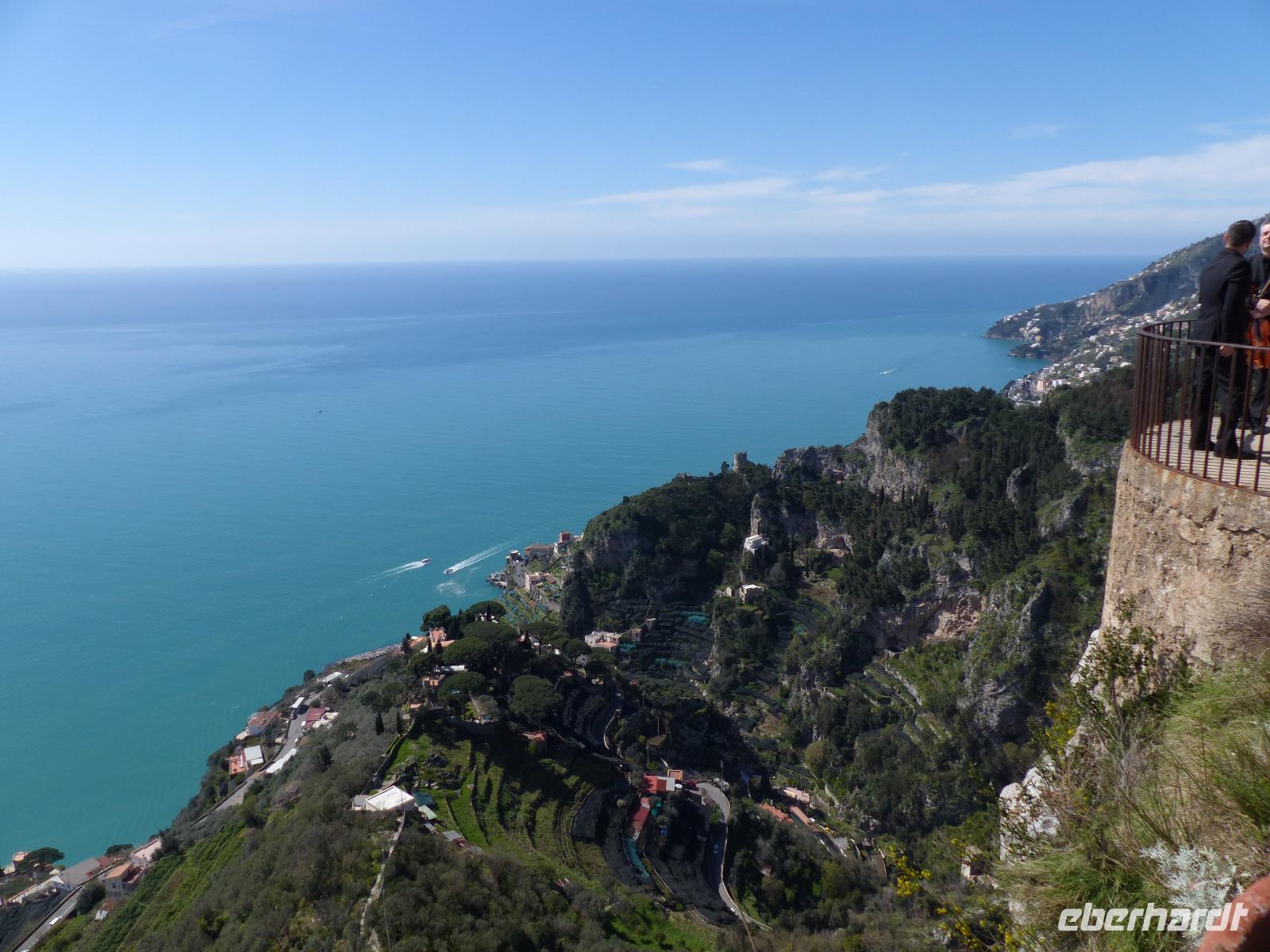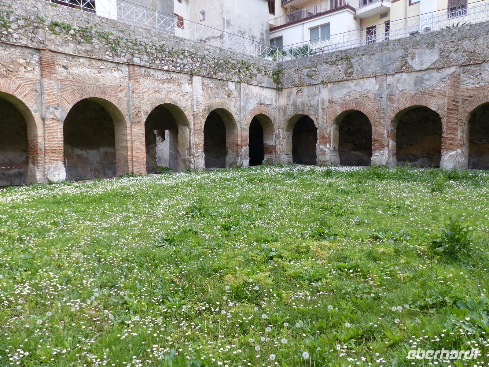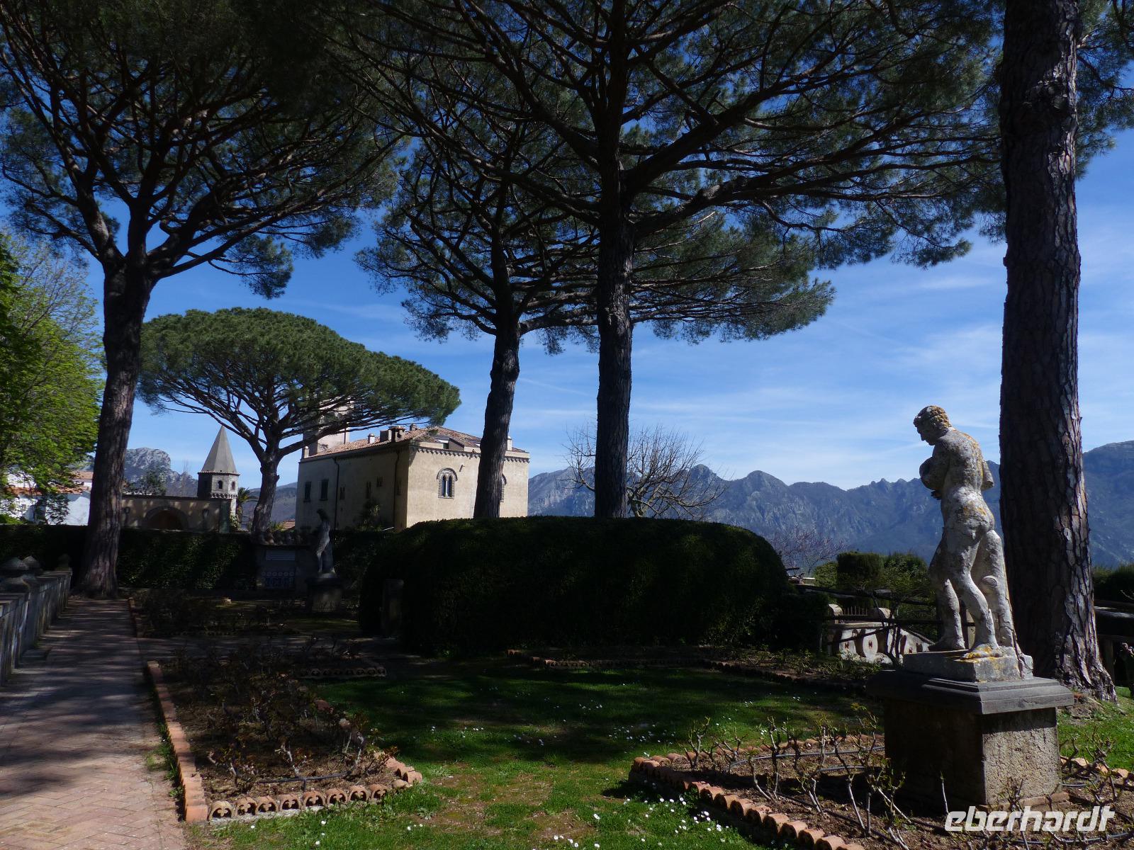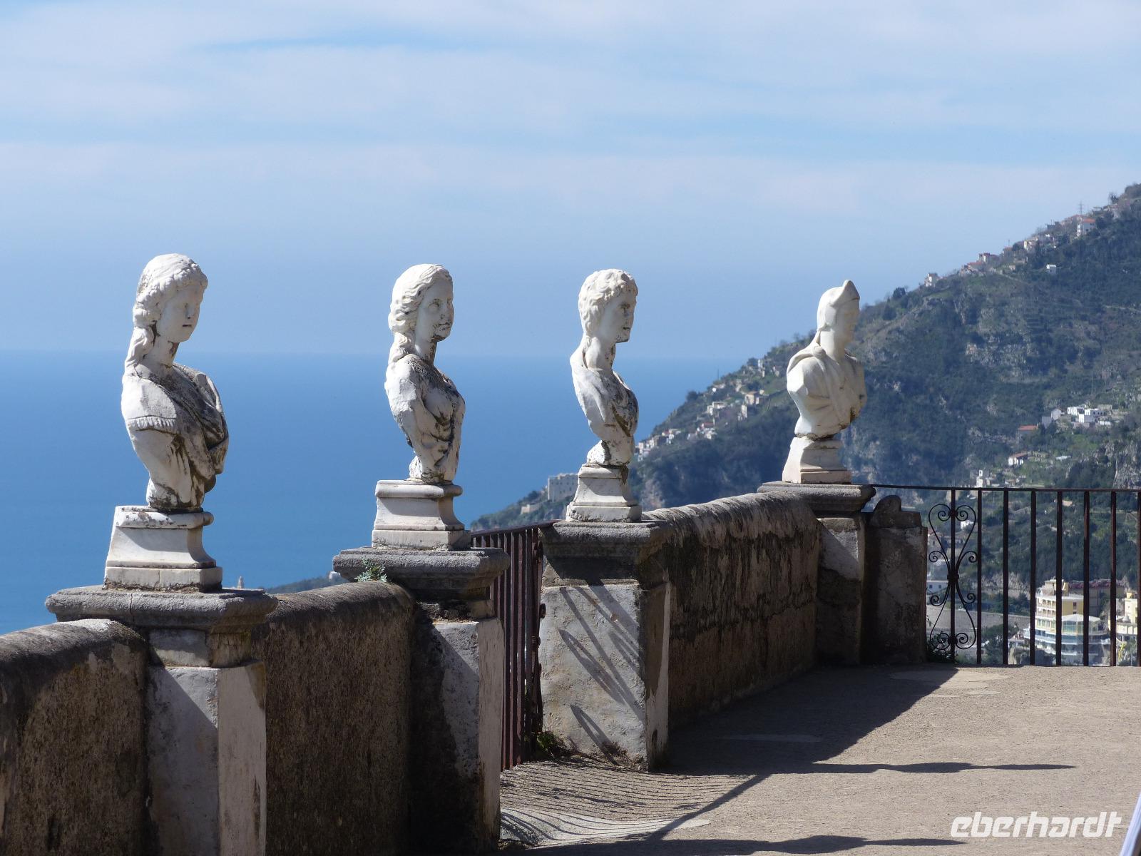 Bei strahlend blauem Himmel verließen wir gegen 9 Uhr das Hotel und fuhren nach Ravello. Dort erfreuten wir uns der herrlichen Blumen, der schönen Aussicht und der malerisch plazierten Plastiken im Park der Villa Cimbrone. Wir hatten den Garten fast für uns alleine, was sehr selten der Fall ist. Und ein paar Musikanten nutzen die Terrasse für eine Videoaufnahme. Wir hatten also ein Gratiskonzert. Der Blick über die ganze Küste begeisterte uns. Und ich nutzte die Zeit meine schwere Eier- und Hasenfracht in Osternestchen im Garten zu verstecken. Nach erfolgreicher Suchaktion spazierten wir auf einem ruhigen Weg rund um Ravello herum und abwärts nach Torello und weiter nach Maiori. Dann gings wieder bergauf zur Villa Maria. Das Agrituismo Villa Maria liegt mitten in einem Zitronenhain mit herrlicher Aussicht aufs Meer. Hier stammten die Zitronen her, die ich tags zuvor den Gästen überreicht hatte. Nun wurde uns aufgetischt. Hier bleiben wir, beschlossen einige Gäste, als die anderen nach diesem herrlichen Nachmittagsmahl aufbrachen. Aber die meisten wollten noch mit mir in die römische Villa von Minori gehen. Sie schaut nur zur Hälfte aus dem Erdreich heraus. Die andere Hälfte ist zwar ausgegraben, aber nicht öffentlich zugänglich, denn über den Resten der alten Villa erheben sich Häuser. Das Triklinum sieht eigentlich aus wie ein Lokus, stellten wir fest. Aber irgendwo über diesen Becken müssen die Klinen, die Essensliegen, gestanden haben. Auch das Internet half uns nicht weiter und als wir später unseren Guide im Pompei mit all diesen Fragen beglückten erwischten wir auch ihn auf dem falschen Fuß. Und ein bisschen Zeit blieb uns noch, die wir nach persönlichem Interesse verbringen konnten, bevor wir uns abends wieder auf das leckere Hotelessen stürzten.
