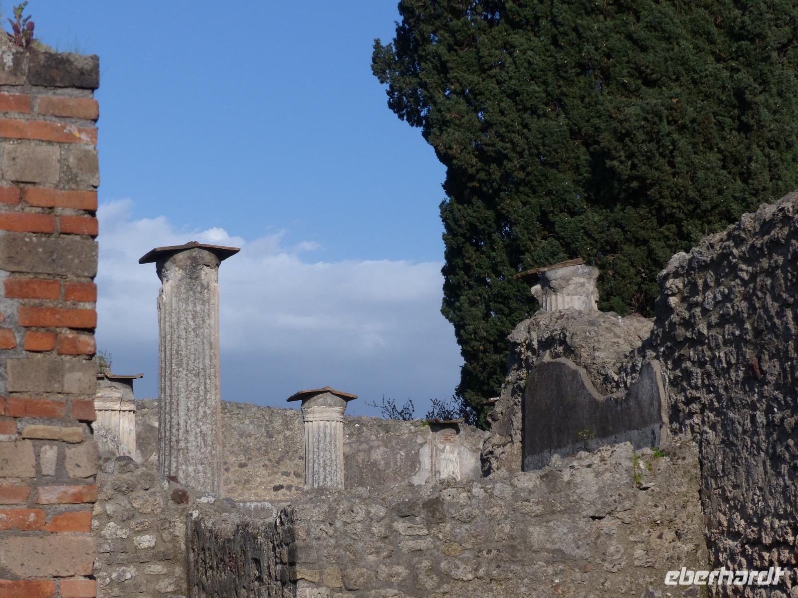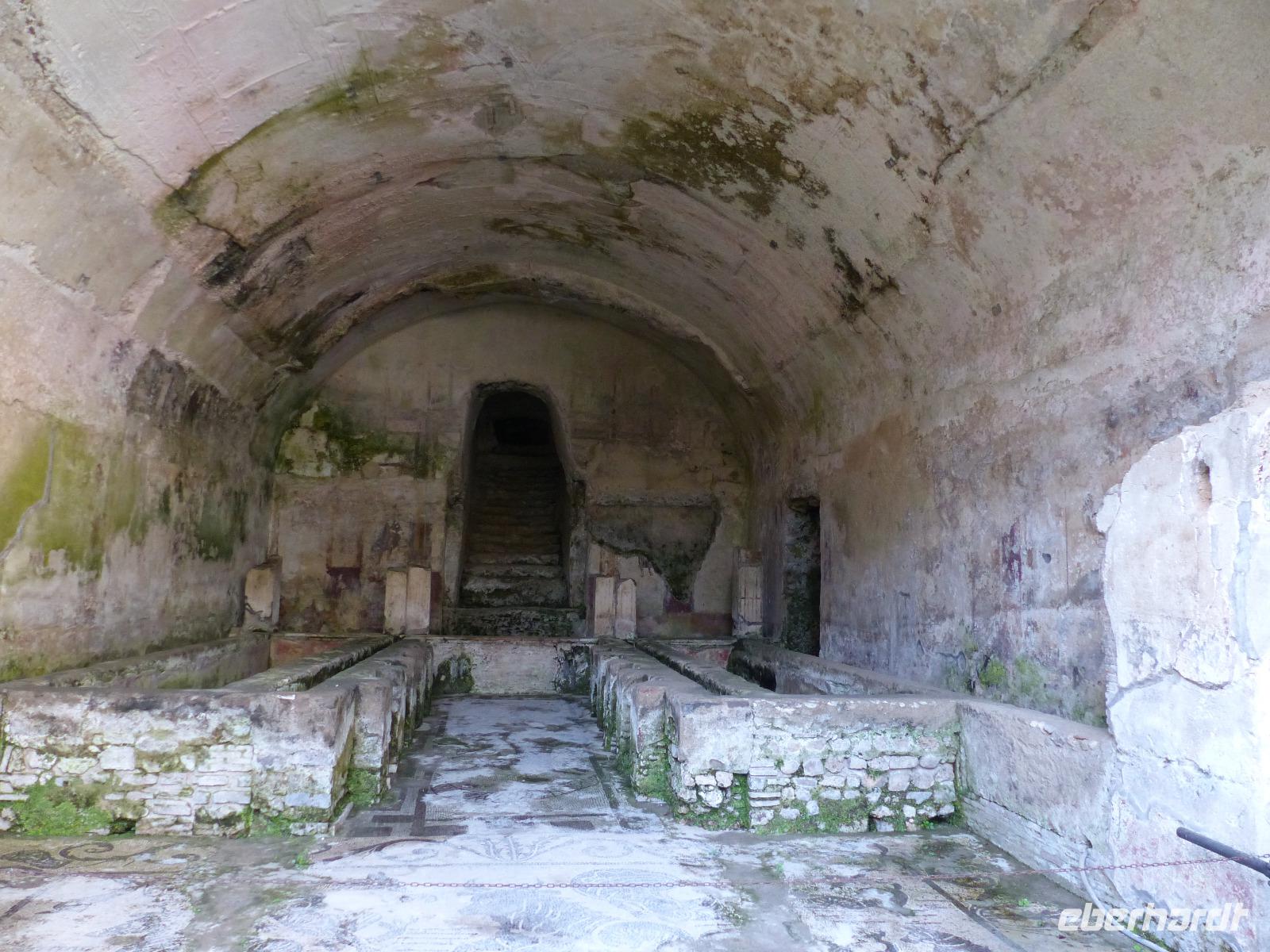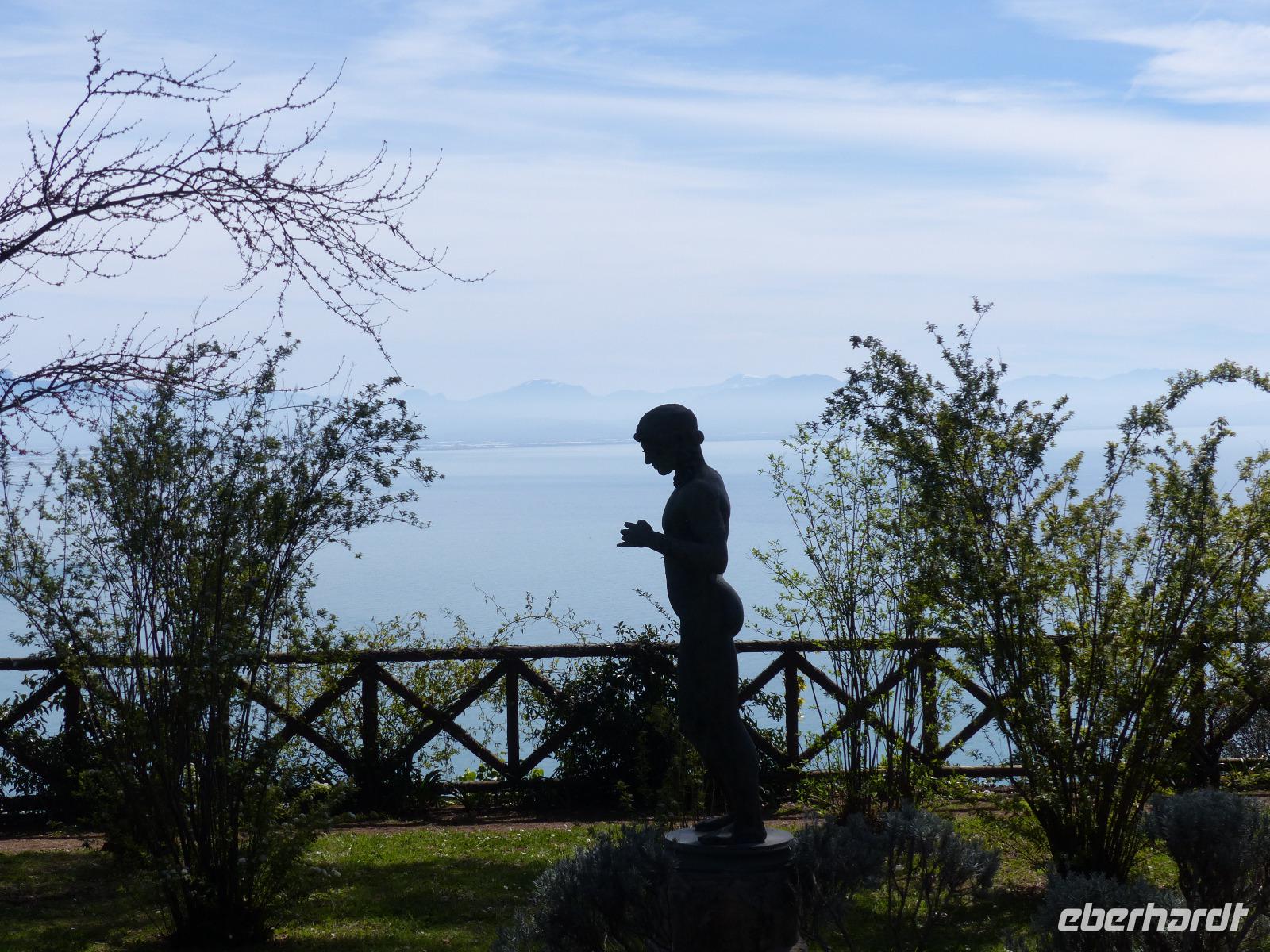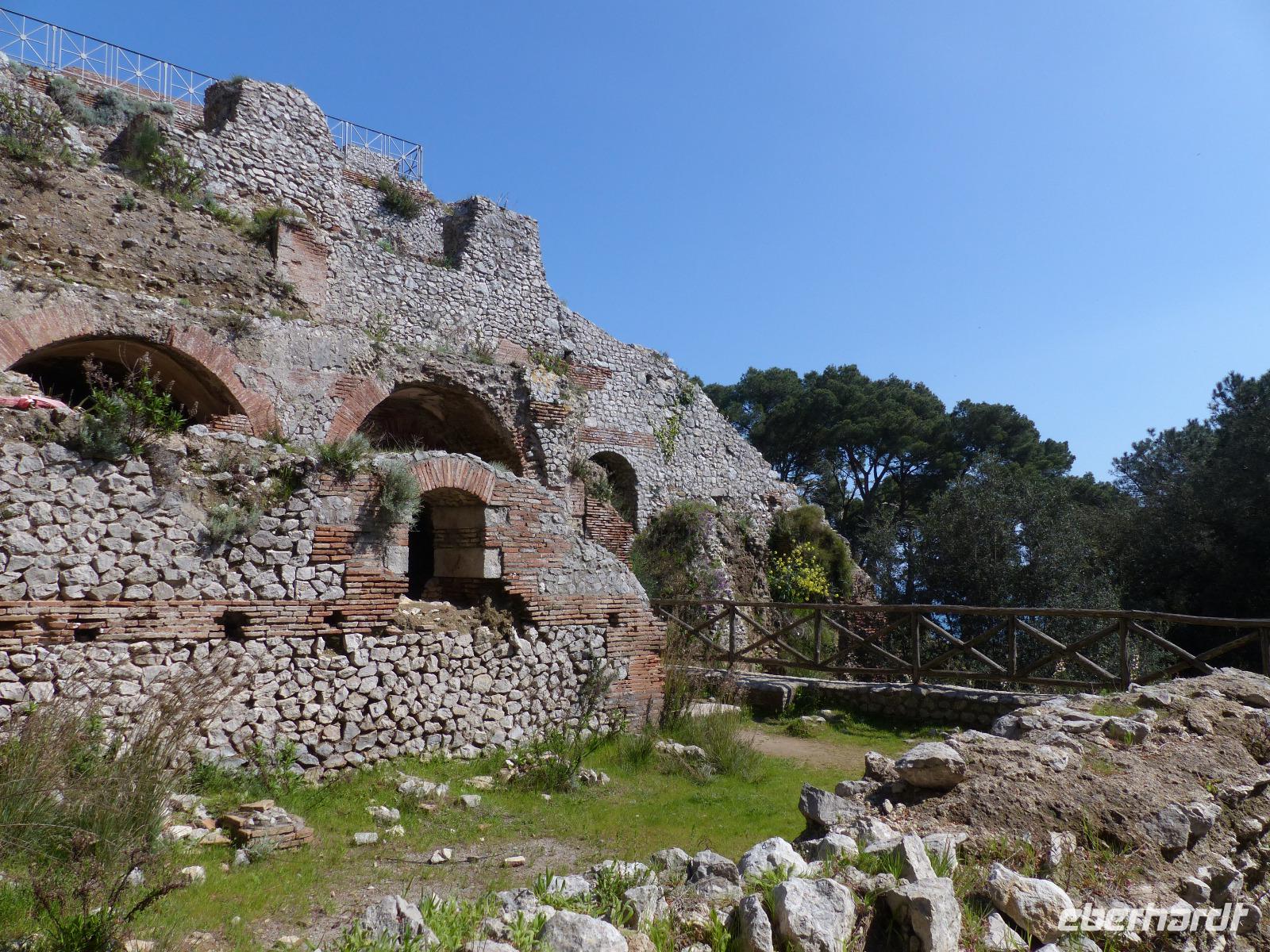 Bei strahlend blauem Himmel verließen wir gegen 9 Uhr das Hotel und fuhren nach Ravello. Dort erfreuten wir uns der herrlichen Blumen, der schönen Aussicht und der malerisch plazierten Plastiken im Park der Villa Cimbrone. Wir hatten den Garten fast für uns alleine, was sehr selten der Fall ist. Und ein paar Musikanten nutzen die Terrasse für eine Videoaufnahme. Wir hatten also ein Gratiskonzert. Der Blick über die ganze Küste begeisterte uns. Und ich nutzte die Zeit meine schwere Eier- und Hasenfracht in Osternestchen im Garten zu verstecken. Nach erfolgreicher Suchaktion spazierten wir auf einem ruhigen Weg rund um Ravello herum und abwärts nach Torello und weiter nach Maiori. Dann gings wieder bergauf zur Villa Maria. Das Agrituismo Villa Maria liegt mitten in einem Zitronenhain mit herrlicher Aussicht aufs Meer. Hier stammten die Zitronen her, die ich tags zuvor den Gästen überreicht hatte. Nun wurde uns aufgetischt. Hier bleiben wir, beschlossen einige Gäste, als die anderen nach diesem herrlichen Nachmittagsmahl aufbrachen. Aber die meisten wollten noch mit mir in die römische Villa von Minori gehen. Sie schaut nur zur Hälfte aus dem Erdreich heraus. Die andere Hälfte ist zwar ausgegraben, aber nicht öffentlich zugänglich, denn über den Resten der alten Villa erheben sich Häuser. Das Triklinum sieht eigentlich aus wie ein Lokus, stellten wir fest. Aber irgendwo über diesen Becken müssen die Klinen, die Essensliegen, gestanden haben. Auch das Internet half uns nicht weiter und als wir später unseren Guide im Pompei mit all diesen Fragen beglückten erwischten wir auch ihn auf dem falschen Fuß. Und ein bisschen Zeit blieb uns noch, die wir nach persönlichem Interesse verbringen konnten, bevor wir uns abends wieder auf das leckere Hotelessen stürzten.