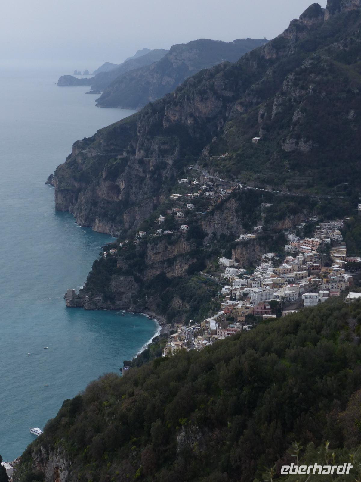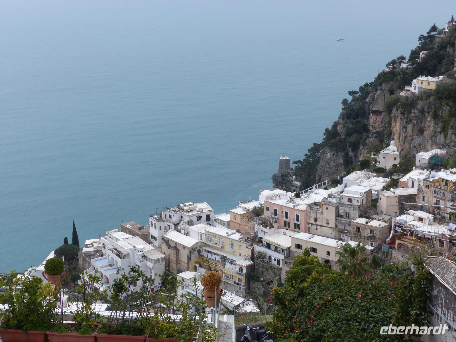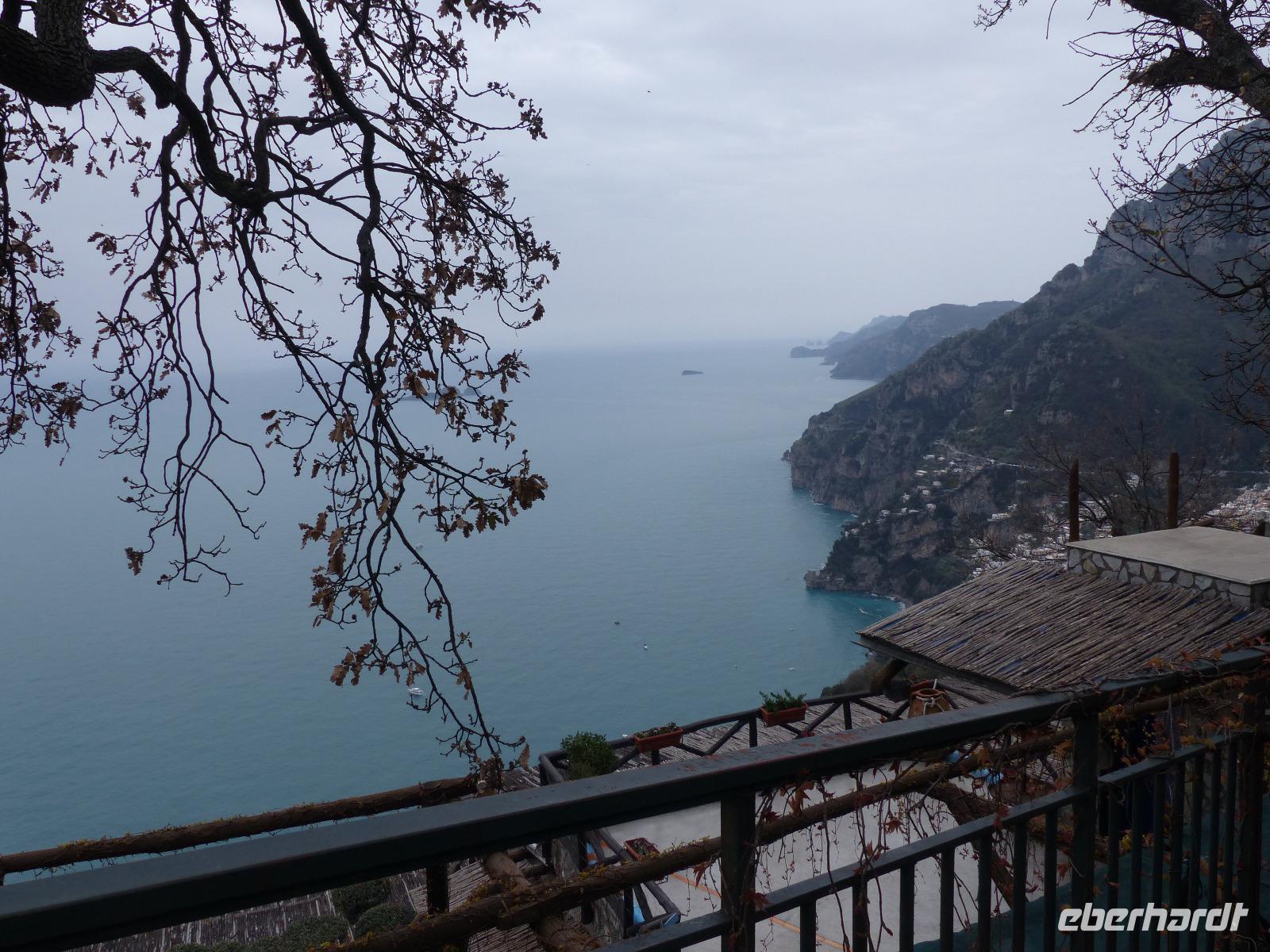 Eigentlich stand heute der Sentiero degli Dei - Der Wanderweg der Götter - auf unserem Programm. Aber (ich hatte es den Gästen schon vor der Reise mitgeteilt) ein Erdrutsch, der im Winter die Berge herunter kam, hatte dazu geführt, dass der Weg gesperrt wurde. Manche Mühlen mahlen langsam. Die Mühlen in den Gemeinden Positano und Praiano gehören da wohl dazu. Ostern. Hauptsaison. Aber keine offizielle Freigabe der Wanderung. Und ausgerechnet an diesem Tag hingen Wolken in den Bergen. Die Götter wollten keine Gesellschaft. Wir haben also umgeplant und starteten am östlichen Ortsrand von Positano. Hinab zum Hafen und wieder auf der Westseite hinauf. Herrliche Ausblicke aber viele Stufen und steiles Gelände. Positano ist gebaut wie ein Amphitheater. Unser Versuch ein Gruppenfoto zu machen brachte gewisse Schwierigkeiten mit sich, denn ein Fotograf sollte eigentlich in die richtige Richtung sehen. Soo zum Objekt hin... Der ältere Herr, der meine Kamera betrachtete wie eine eklige Spinne, hatte den gepflasterten Platz vor uns fest im Blick. Wir durften auch noch mit aufs Bild - am Rand. Aber man kann Bilder mit größerer Pixelanzahl ja zum Glück ausschneiden. Unsere Mittagspause verbrachten wir im verträumten Montepertuso. Eine herrliche Antipasti landete vor uns auf einem riesigen Teller. Und bald schon herrschte reger Andrang vor dem Damenklo. Wir bekamen sogar männlichen Geleitschutz - von Fenster des Damenklos hat man einfach die beste Aussicht weit und breit! Der gleiche Blick wie vom Sentiero degli Dei. Aber heute war das Wetter nun mal etwas schwieriger. Mausgrau. Und zu allem Überfluß klingelte dann auch noch mein Telefon - nein, heute fahren unsere kleinen Boote nicht. Die Wellen sind zu groß. Das große Linienschiff fährt aber.... oh je, ich werde doch so leicht seekrank, hörte ich es raunen. Alle haben diese Fahrt trotz Wellen gut überstanden und genossen am Abend wieder das leckere Essen im Hotel.