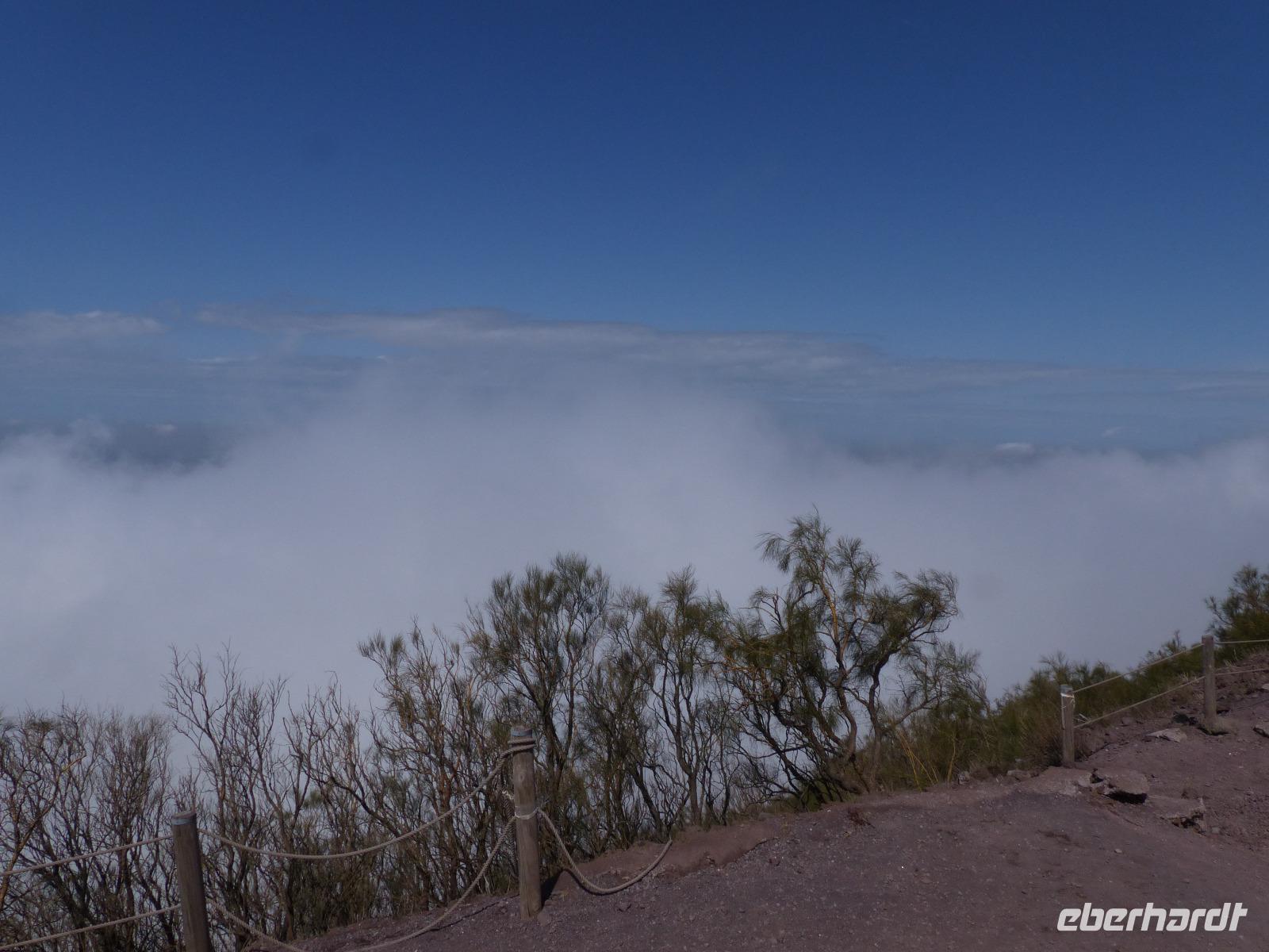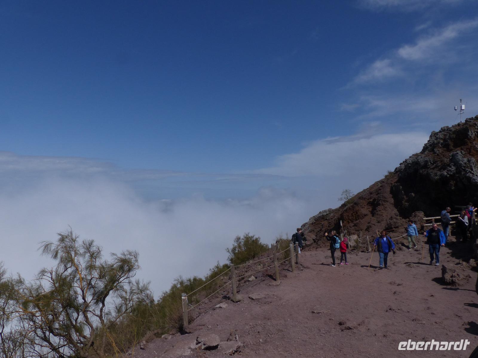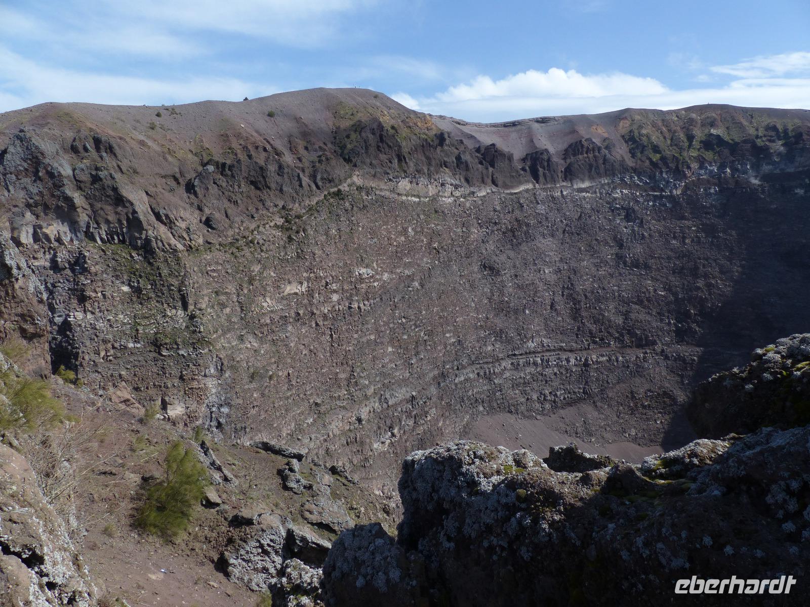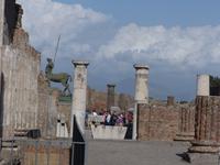 Regen war vorhergesagt für den Vormittag. Aber allen Unkenrufen zum Trotz war das Wetter an der Küste freundlich und wir starteten voller Erwartungen in Richtung Neapel. Bei Torre del Greco verließen wir die Autobahn und wenig später schon quälte sich der Bus zwischen erstarrter Lava und Pinien aufwärts. Die Spuren des Feuers aus dem letzten Sommer waren noch gut sichtbar, aber die Natur erobert sich ihr Territorium zurück. Und die Brandzone liegt weit weg von unserem Ziel, am Fuße des Berges. Oben war es kühler als an der Küste, aber lange nicht so kühl wie wir erwartet hatten. Ich hatte Handschuhe mitgebracht, die ich nun doch recht schnell im Rucksack verschwinden ließ. Wir hatten zunächst noch Aussicht bis nach Neapel hinunter. Dann tauchten Wolkenfetzen auf und es entstand eine mystische Stimmung. Der Vesuv wirkte wie ein riesiger Suppenkessel. Schulklassen bevölkerten den Kraterrand, so dass wir manchmal Mühe hatten, dem interessanten Vortrag unserer Vesuvführerin Julia zu folgen. Leopoldo, unser geduldiger Busfahrer, wurde nun gefordert, denn unsere Weinverkostung fand an Ende eines sehr schmalen Sträßchens statt. Wir landeten in einem kleinen Weinberg, verborgen hinter hohen Mauern und vergnügten uns mit den Tränen Christi. Diese sind trinkbar und bestehen aus Wein. Und dazu gab es wieder etwas Leckeres zu Essen. Und eine herzliche Dame, die uns sehr gut verköstigte, führte uns auch durch die Kelterei und erklärte uns wie man Weinstöcke verjüngt. Manch einer nahm die Tränen von Christus sorgfältig verpackt im Koffer mit nach Hause. Am Nachmittag fuhren wir dann etwas beschwingt weiter in Richtung Pompei. Dort erwartete uns Alphonso. Dass die Bewohner Pompeis einen flotten Lebenstil hatten, erfuhren wir und auch wie man sich bildlich über Sprachbarrieren hinweghalf. Wir folgten eindeutigen Wegweisern zu noch eindeutigeren Herbergen, besichtigten Tempel, Märkte und das Theater, und sangen mit einer amerikanischen Reisegruppe um die Wette.