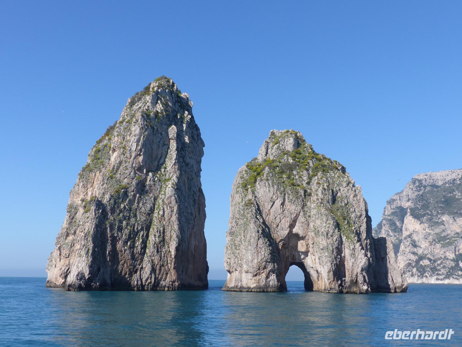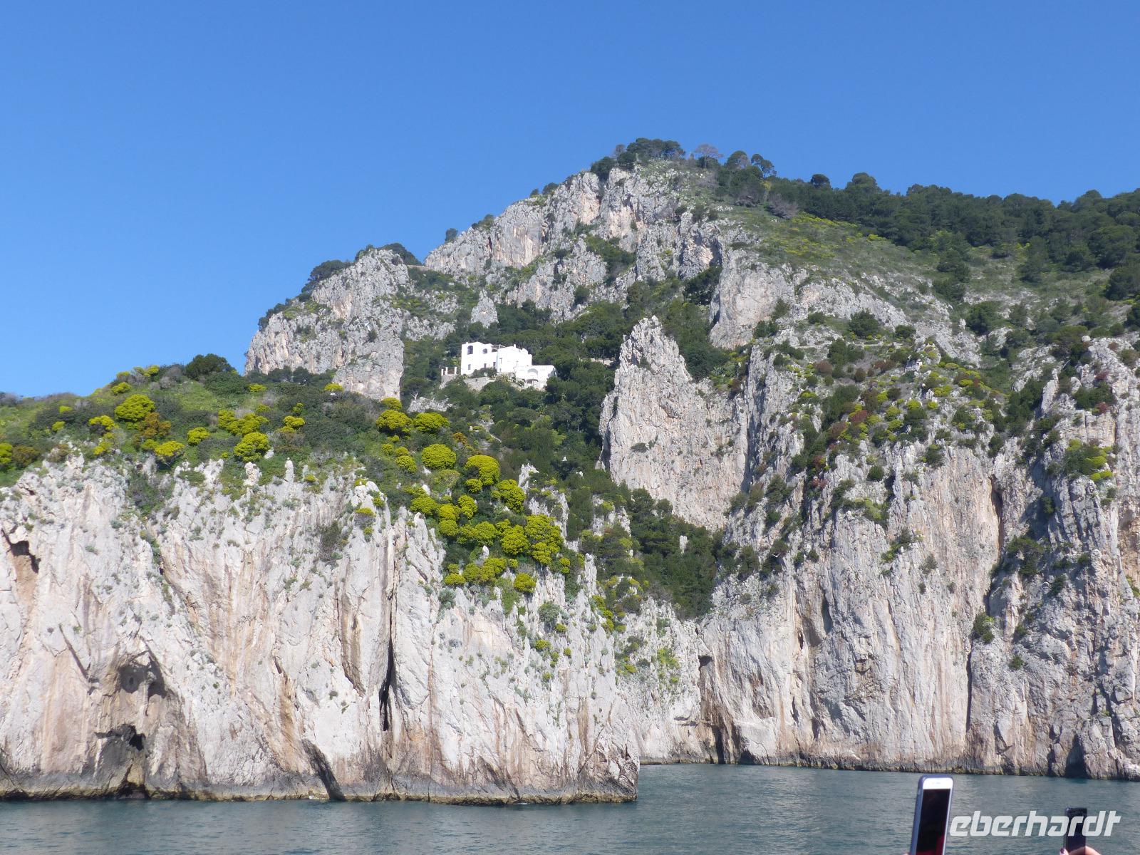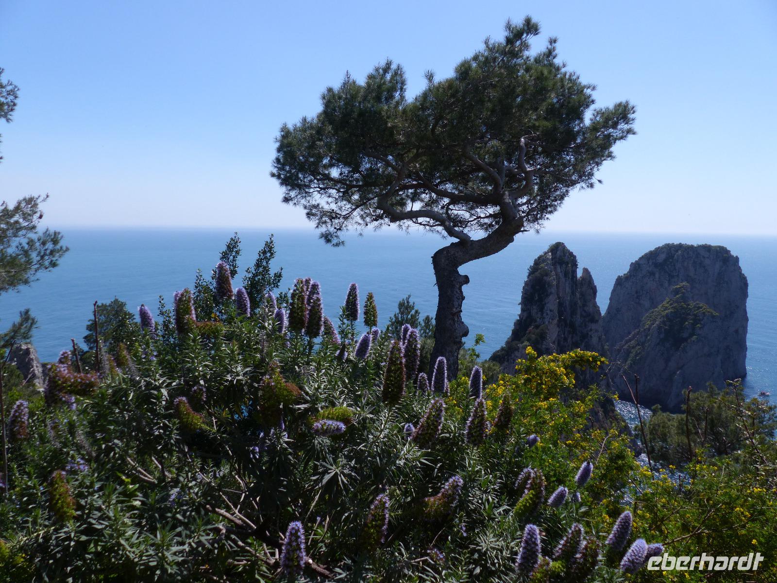 "Ich war schon mal auf Capri und freue mich heute mal Zeit für mich selbst zu haben". Aber nur 2 Gäste blieben zurück, alle anderen kamen mit. Unser Bus zum Schiff fuhr schon vor 8 Uhr, denn der Pier in Minori hielt noch Winterschlaf und daher legten hier keine Schiffe an. Wir waren die ersten Gäste an Bord in Maiori und konnten uns die Plätze aussuchen. Dann fuhren wir über Amalfi und Positano nach Capri. Dort fuhren wir an der Südküste entlang, bekammen die Weiße Grotte gezeigt und sahen hinauf zur Villa Malapartes. Dann näherten wir uns den berühmten Faraglioni-Inseln. Und nun bekamen wir gleich noch eine Inselrundfahrt per Schiff geboten. Das Boot umrundete Capri. Auf dem Schiff hatte ich erfahren, dass die Funicolare-Bahn wegen Reparaturarbeiten außer Betrieb und die Busse total überfüllt wären. In Marina Grande besorgte ich ein Picknick und ab ging's dann eben zu Fuß hoch auf den Hauptplatz von Capri. Wir spazierten über den Bergrücken zu den Augustusgärten und genossen den Ausblick auf die Via Krupp, die sich im wahrsten Sinne des Wortes nach Marina Piccola den Hang hinunter schlängelt. Dann starteten wir mit unserer Wanderung. Nun lachte für uns die Sonne und das Meer schimmerte in türkisblauen Tönen. „Ach was sind diese Paninis doch lecker!" Auch dieses Mal war unser Mahl sehr gut. Dann wanderten wir an der Villa Malaparte vorüber, stiegen hoch zur Grotte Matermania und machten einen Abstecher zum Felsentor Arco Naturale. Uff - so viele Stufen! Sie lagen zwar im Schatten aber heute war es wirklich warm. Die Sonnencreme floss in Strömen. Dann wanderten wir zurück nach Capri. Hier trennten wir uns, denn einige Gäste wollten den Nachmittag etwas ruhiger angehen. Die anderen wanderten noch weiter mit mir hoch zur Villa Jovis. Wir genossen die Aussicht auf die Küste und durchschritten das Zuhause von Kaiser Tiberius. Dann ging's abwärts, an herrlich blühenden Gärten vorüber zu Fuß zum Hafen hinunter. Am Hafen von Marina Grande trafen wir uns alle wieder und zum Abschluss besorgte ich noch Eis für alle. Das Meer war ruhig und wir genossen die Abendstimmung auf dem Wasser bei unserer Rückreise per Boot. Von Maiori aus ging es wieder per Bus nach Minori zurück. Was für ein schöner Tag war dies doch gewesen!