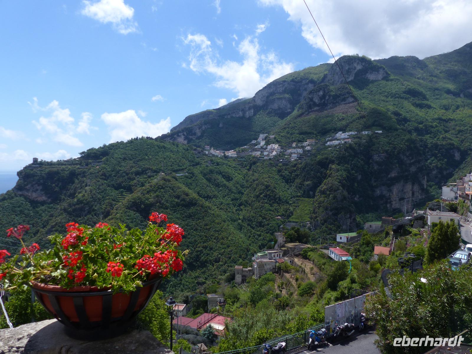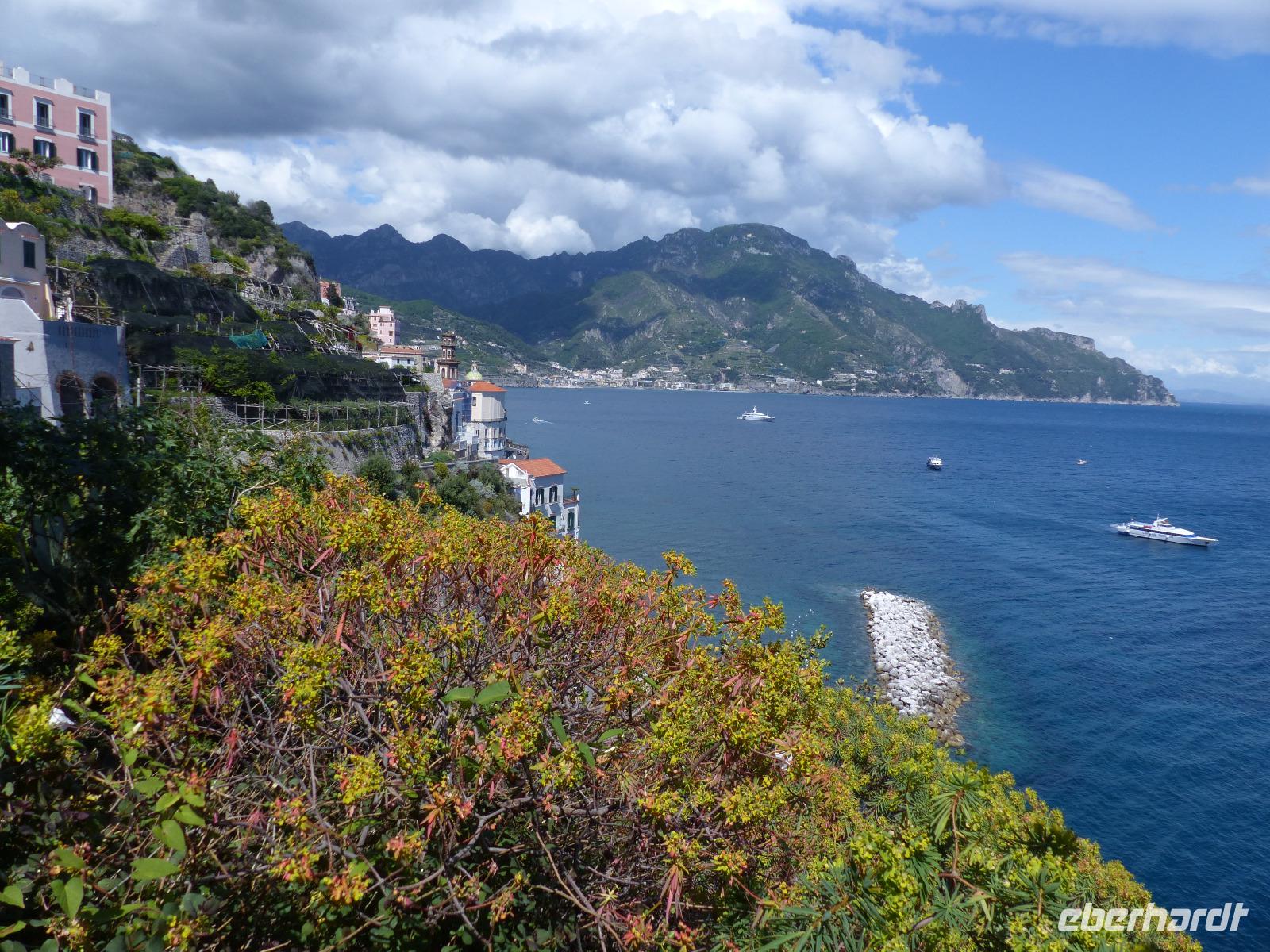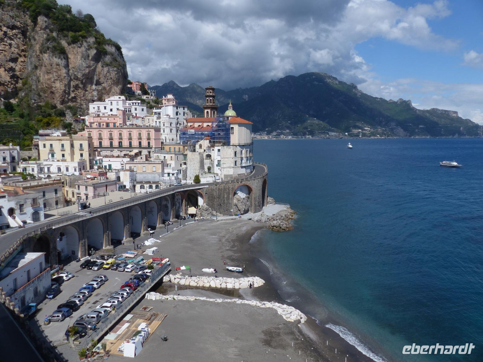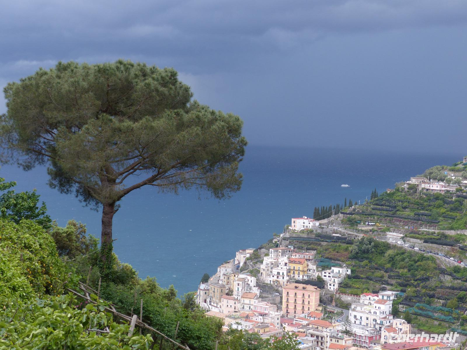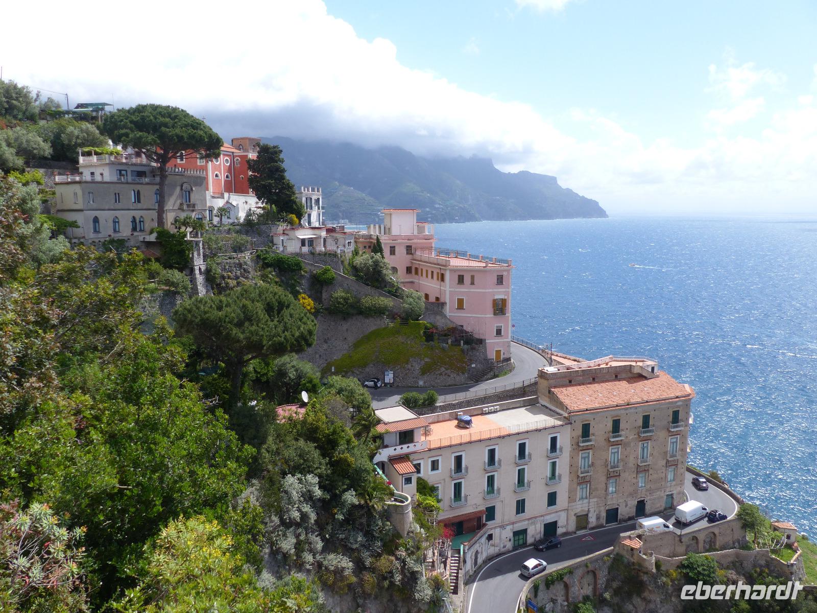 Unsere Gäste von Leipzig und Dresden flogen nach München, wo sie auf die Reiseleiterin trafen, die von Berlin aus angeflogen kam und wo auch unsere Münchner zur Gruppe fanden. Unsere Frankfurter dagegen trafen wir erst in Neapel am Flughafen. Die Anreise klappte genau so wie geplant. Keinerlei größere Hindernisse erschwerten uns diesen Anreisetag. In Neapel stiegen wir um in einen Bus, der uns nach Minori, unseren Urlaubsort brachte. Graue Wolken zogen über den Himmel, aber es war trocken. Wir umrundeten die Stadt Neapel und sausten auf der Autobahn am wolkenverhangenen Vesuv vorüber, passierten Pompei und erreichten bei Vietri sul Mare schließlich die Amalfitana, die Südküste der Monte Lateri. Nun arbeitete sich der Bus auf der Küstenstraße entlang, die sich hoch über dem Meer am Hang zwischen Zitronenplantagen und Hotels entlang windet und die malerischen Orte der Küste miteinander verbindet. Italien hatte bisher ein regenreiches Frühjahr durchlebt, denn nachdem ich an Ostern Gäste bei blitzblauem Himmel durch diese Region geführt hatte, begann wieder eine feuchte Zeit, wie schon im März, wo es auch so viel geregnet hatte. Und die Wettervorhersage war auch nicht wirklich erheiternd. Aber das Wetter wurde dann im Laufe der Woche doch wieder wunderschön, allen Unkenrufen zum Trotz. Gegen Abend erreichten noch unsere beiden Stuttgarter das Hotel, bevor wir uns das leckere Abendessen im Hotel gut schmecken ließen. Danach verschwanden die meisten Gäste ziemlich schnell ins Bett, denn Anreisetage machen müde.