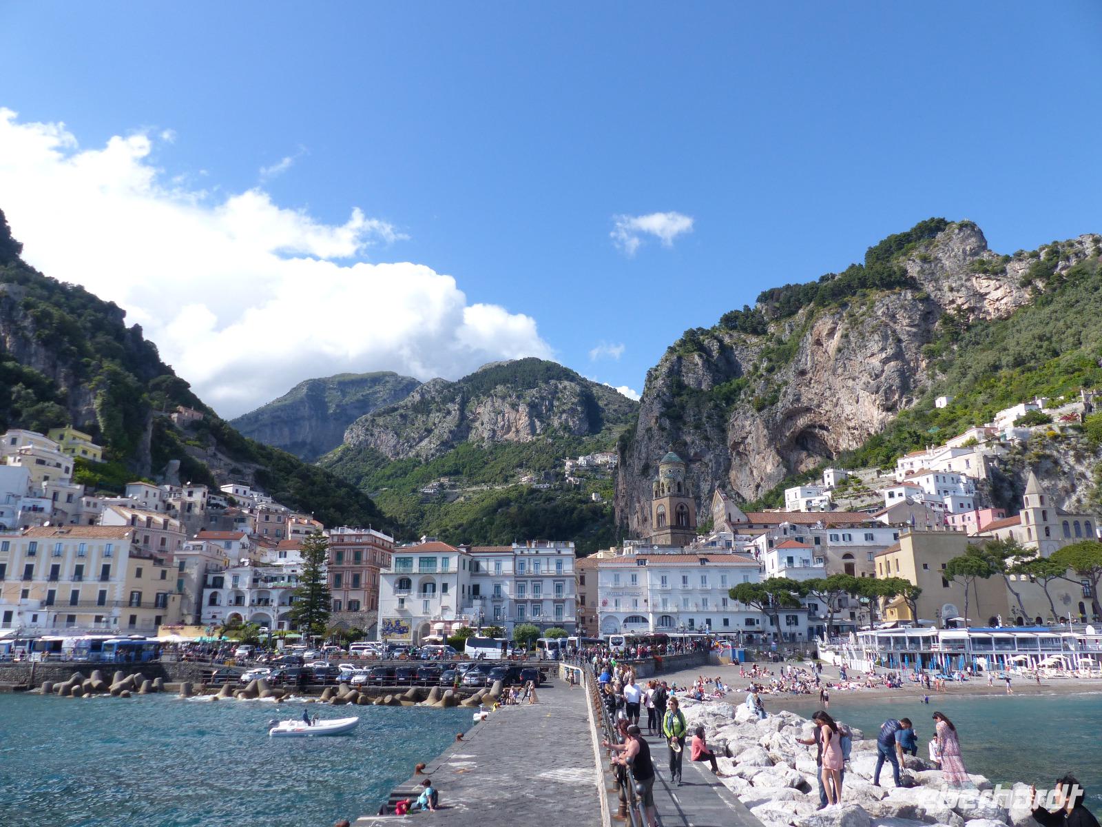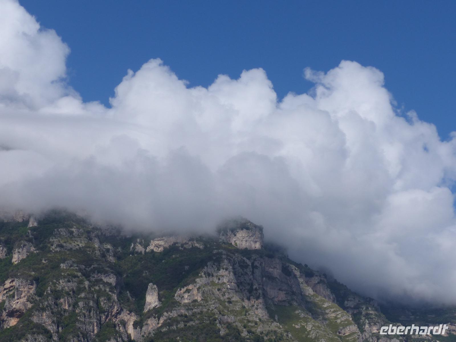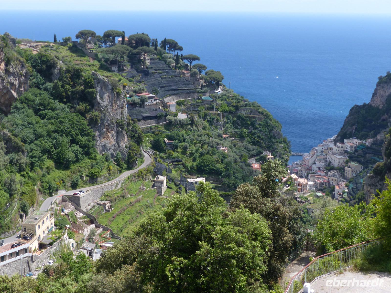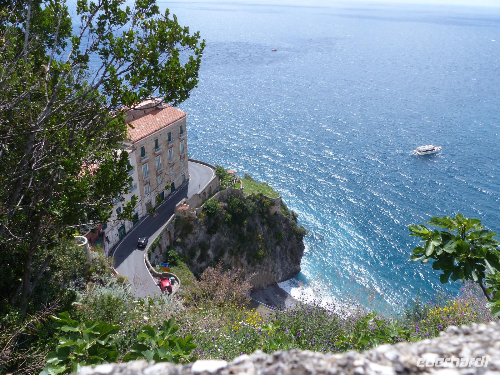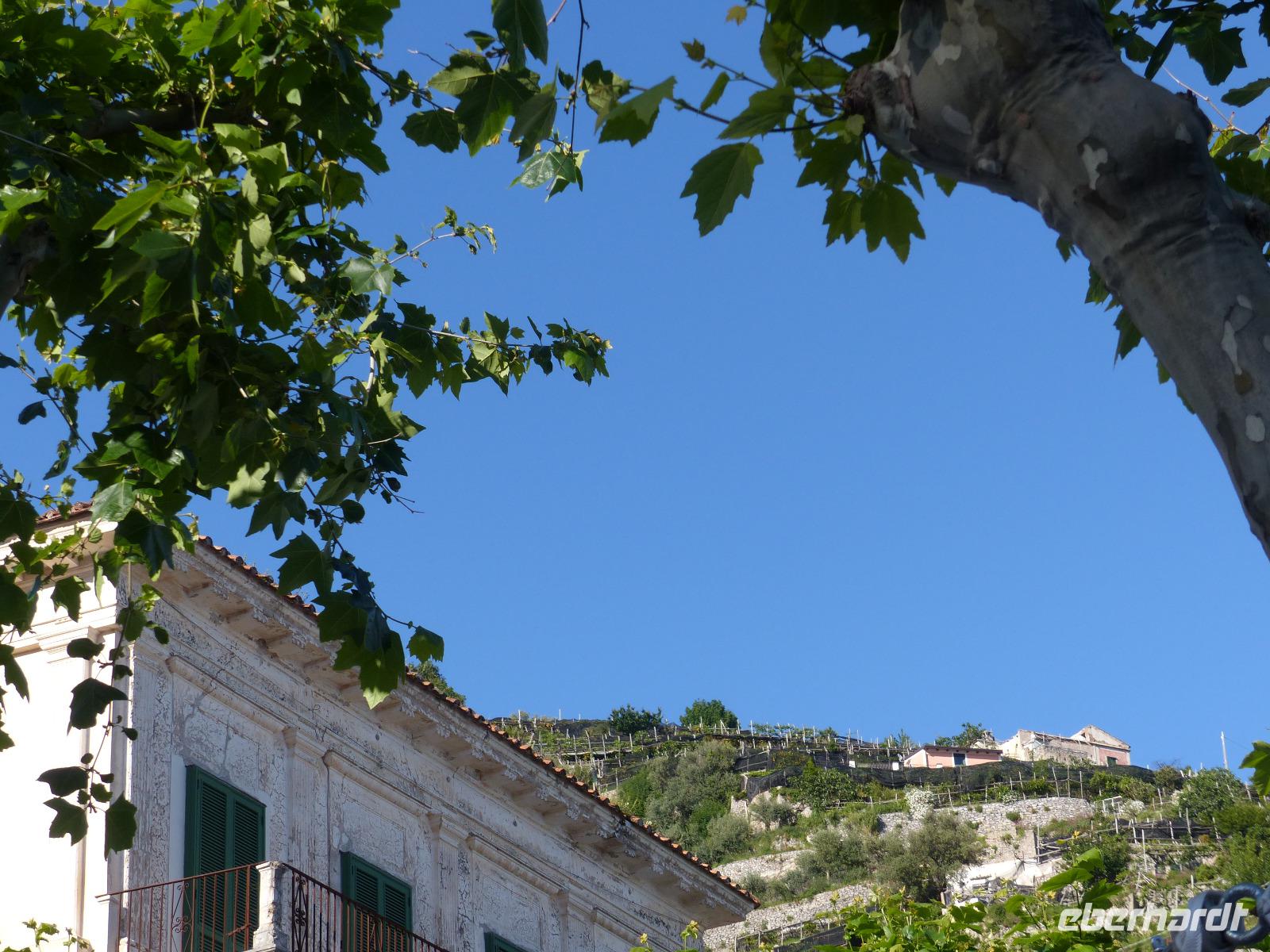 Unsere Gäste von Leipzig und Dresden flogen nach München, wo sie auf die Reiseleiterin trafen, die von Berlin aus angeflogen kam und wo auch unsere Münchner zur Gruppe fanden. Unsere Frankfurter dagegen trafen wir erst in Neapel am Flughafen. Die Anreise klappte genau so wie geplant. Keinerlei größere Hindernisse erschwerten uns diesen Anreisetag. In Neapel stiegen wir um in einen Bus, der uns nach Minori, unseren Urlaubsort brachte. Graue Wolken zogen über den Himmel, aber es war trocken. Wir umrundeten die Stadt Neapel und sausten auf der Autobahn am wolkenverhangenen Vesuv vorüber, passierten Pompei und erreichten bei Vietri sul Mare schließlich die Amalfitana, die Südküste der Monte Lateri. Nun arbeitete sich der Bus auf der Küstenstraße entlang, die sich hoch über dem Meer am Hang zwischen Zitronenplantagen und Hotels entlang windet und die malerischen Orte der Küste miteinander verbindet. Italien hatte bisher ein regenreiches Frühjahr durchlebt, denn nachdem ich an Ostern Gäste bei blitzblauem Himmel durch diese Region geführt hatte, begann wieder eine feuchte Zeit, wie schon im März, wo es auch so viel geregnet hatte. Und die Wettervorhersage war auch nicht wirklich erheiternd. Aber das Wetter wurde dann im Laufe der Woche doch wieder wunderschön, allen Unkenrufen zum Trotz. Gegen Abend erreichten noch unsere beiden Stuttgarter das Hotel, bevor wir uns das leckere Abendessen im Hotel gut schmecken ließen. Danach verschwanden die meisten Gäste ziemlich schnell ins Bett, denn Anreisetage machen müde.