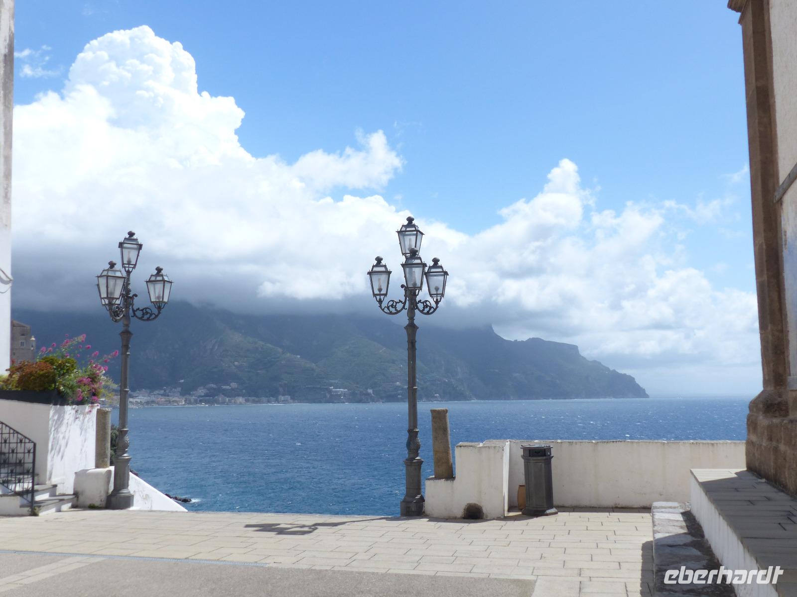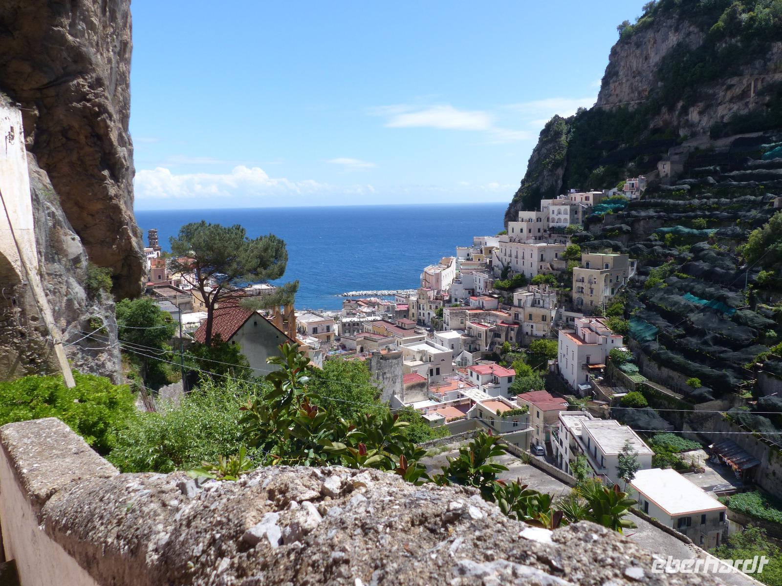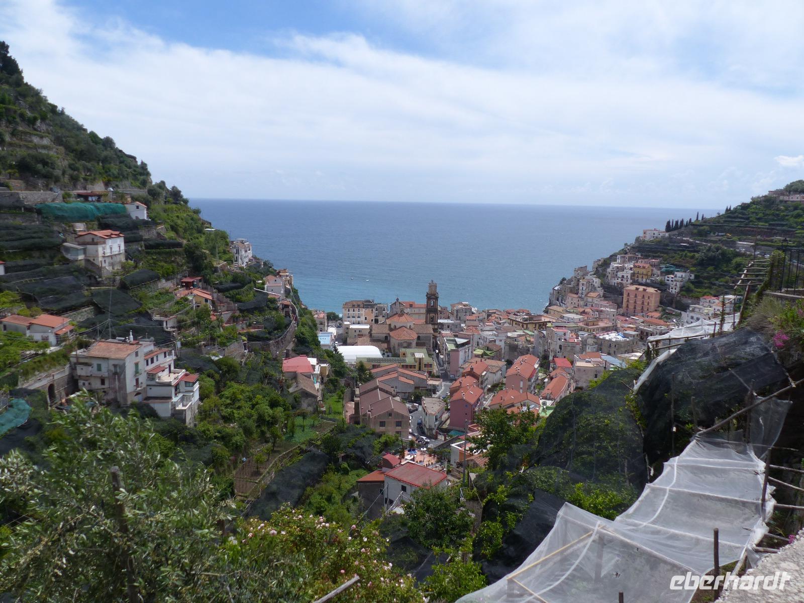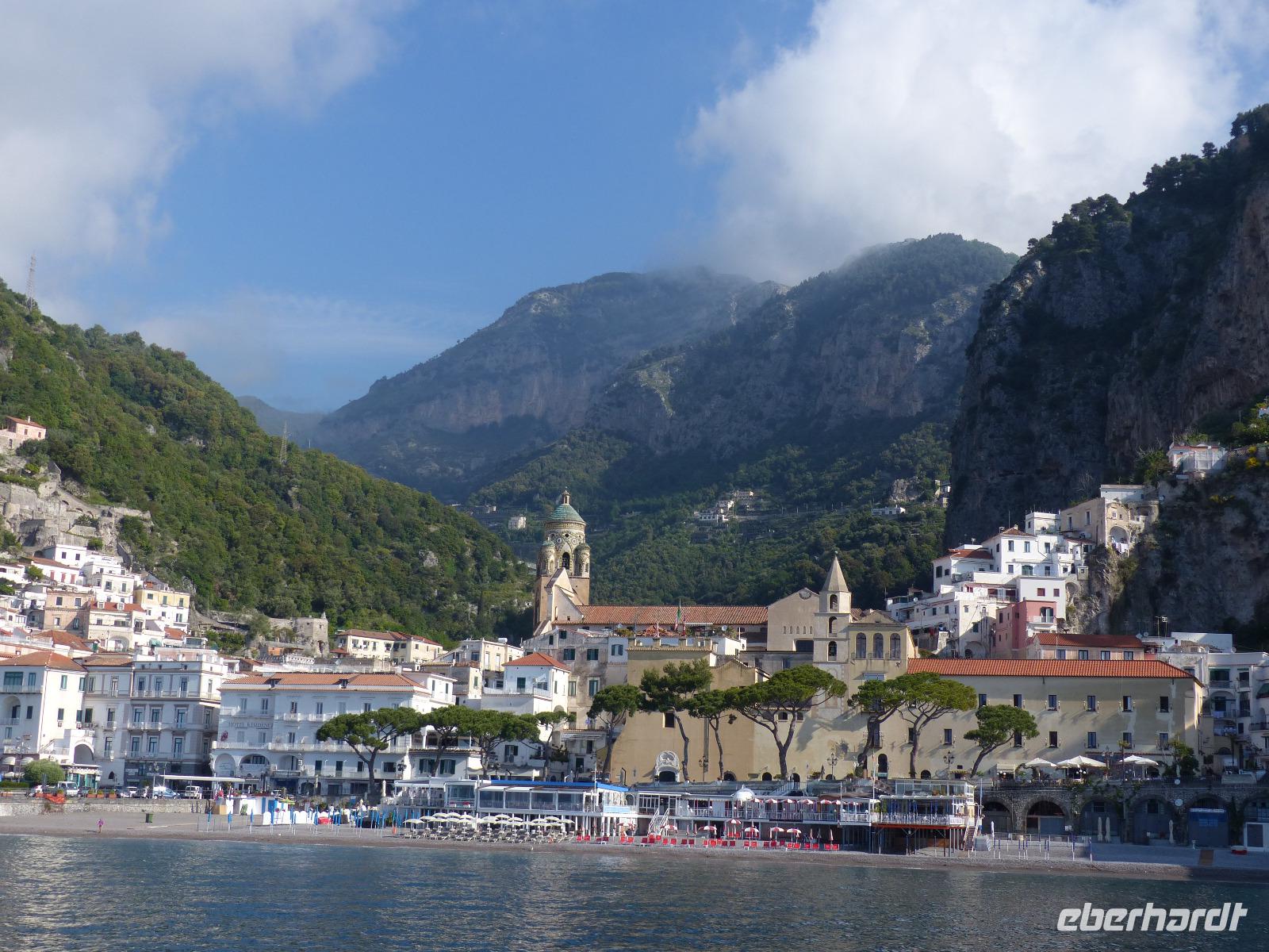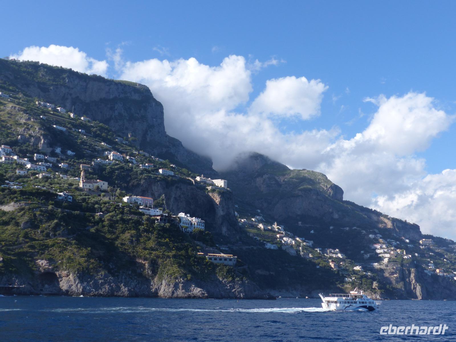 Unsere Gäste von Leipzig und Dresden flogen nach München, wo sie auf die Reiseleiterin trafen, die von Berlin aus angeflogen kam und wo auch unsere Münchner zur Gruppe fanden. Unsere Frankfurter dagegen trafen wir erst in Neapel am Flughafen. Die Anreise klappte genau so wie geplant. Keinerlei größere Hindernisse erschwerten uns diesen Anreisetag. In Neapel stiegen wir um in einen Bus, der uns nach Minori, unseren Urlaubsort brachte. Graue Wolken zogen über den Himmel, aber es war trocken. Wir umrundeten die Stadt Neapel und sausten auf der Autobahn am wolkenverhangenen Vesuv vorüber, passierten Pompei und erreichten bei Vietri sul Mare schließlich die Amalfitana, die Südküste der Monte Lateri. Nun arbeitete sich der Bus auf der Küstenstraße entlang, die sich hoch über dem Meer am Hang zwischen Zitronenplantagen und Hotels entlang windet und die malerischen Orte der Küste miteinander verbindet. Italien hatte bisher ein regenreiches Frühjahr durchlebt, denn nachdem ich an Ostern Gäste bei blitzblauem Himmel durch diese Region geführt hatte, begann wieder eine feuchte Zeit, wie schon im März, wo es auch so viel geregnet hatte. Und die Wettervorhersage war auch nicht wirklich erheiternd. Aber das Wetter wurde dann im Laufe der Woche doch wieder wunderschön, allen Unkenrufen zum Trotz. Gegen Abend erreichten noch unsere beiden Stuttgarter das Hotel, bevor wir uns das leckere Abendessen im Hotel gut schmecken ließen. Danach verschwanden die meisten Gäste ziemlich schnell ins Bett, denn Anreisetage machen müde.
