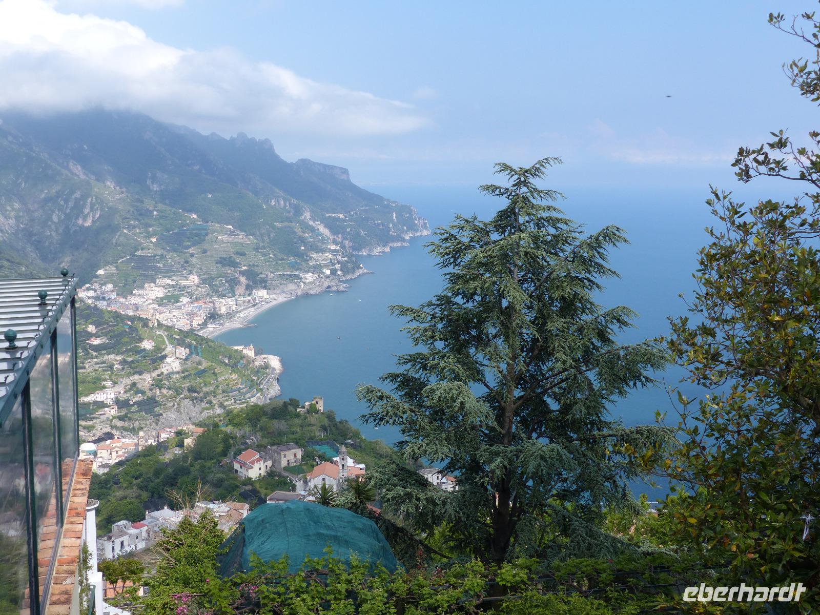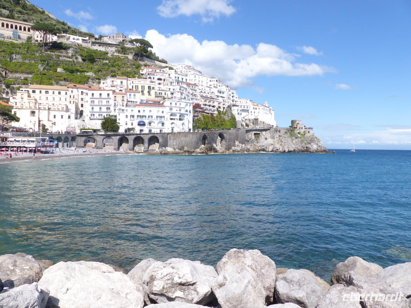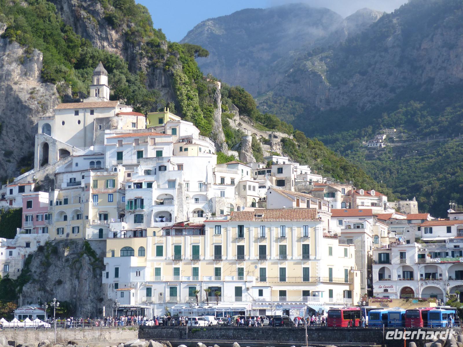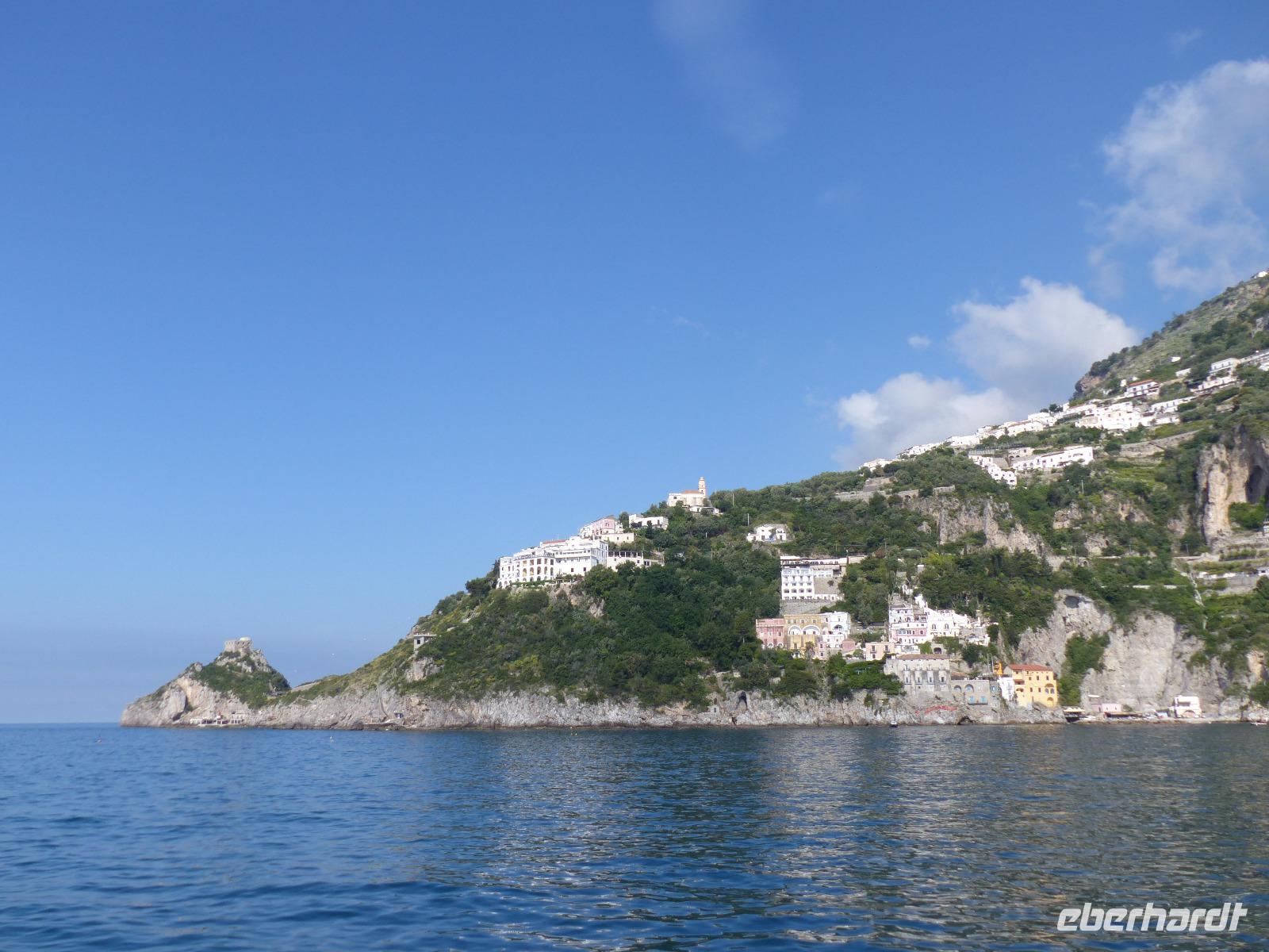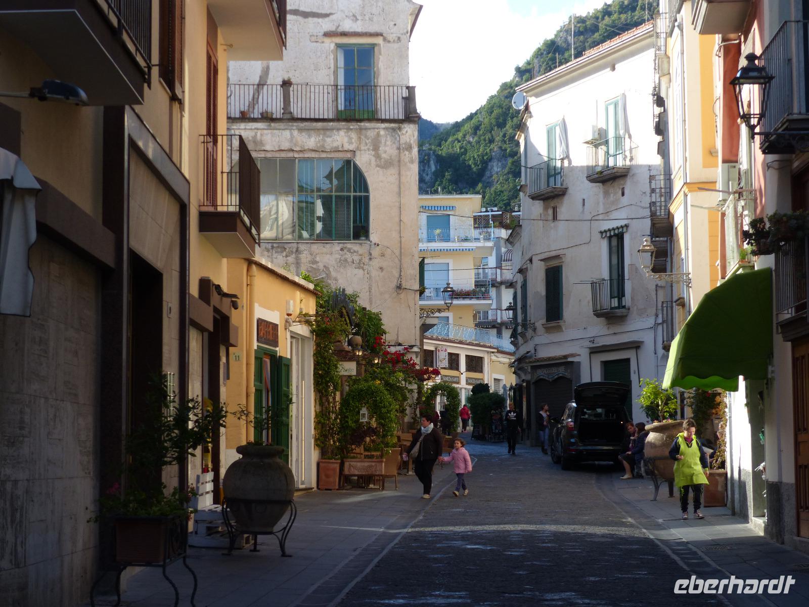 Unsere Gäste von Leipzig und Dresden flogen nach München, wo sie auf die Reiseleiterin trafen, die von Berlin aus angeflogen kam und wo auch unsere Münchner zur Gruppe fanden. Unsere Frankfurter dagegen trafen wir erst in Neapel am Flughafen. Die Anreise klappte genau so wie geplant. Keinerlei größere Hindernisse erschwerten uns diesen Anreisetag. In Neapel stiegen wir um in einen Bus, der uns nach Minori, unseren Urlaubsort brachte. Graue Wolken zogen über den Himmel, aber es war trocken. Wir umrundeten die Stadt Neapel und sausten auf der Autobahn am wolkenverhangenen Vesuv vorüber, passierten Pompei und erreichten bei Vietri sul Mare schließlich die Amalfitana, die Südküste der Monte Lateri. Nun arbeitete sich der Bus auf der Küstenstraße entlang, die sich hoch über dem Meer am Hang zwischen Zitronenplantagen und Hotels entlang windet und die malerischen Orte der Küste miteinander verbindet. Italien hatte bisher ein regenreiches Frühjahr durchlebt, denn nachdem ich an Ostern Gäste bei blitzblauem Himmel durch diese Region geführt hatte, begann wieder eine feuchte Zeit, wie schon im März, wo es auch so viel geregnet hatte. Und die Wettervorhersage war auch nicht wirklich erheiternd. Aber das Wetter wurde dann im Laufe der Woche doch wieder wunderschön, allen Unkenrufen zum Trotz. Gegen Abend erreichten noch unsere beiden Stuttgarter das Hotel, bevor wir uns das leckere Abendessen im Hotel gut schmecken ließen. Danach verschwanden die meisten Gäste ziemlich schnell ins Bett, denn Anreisetage machen müde.