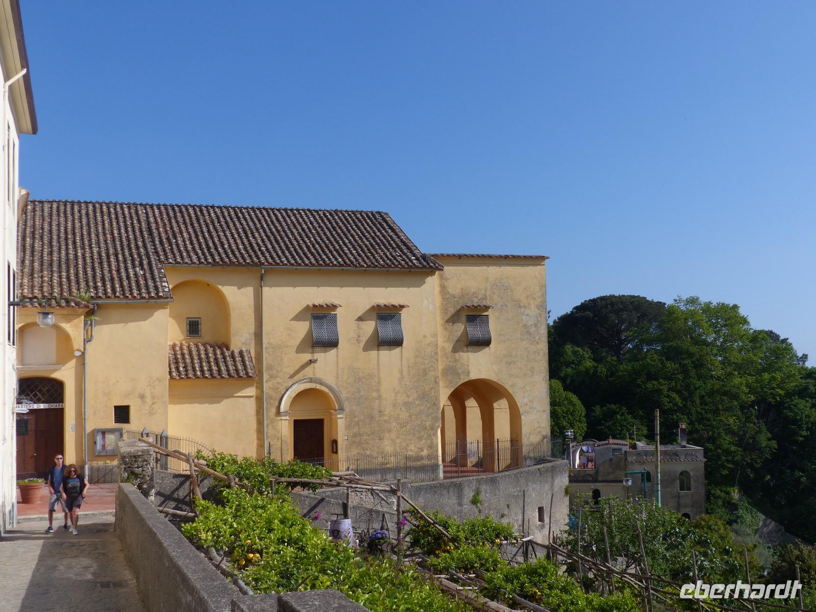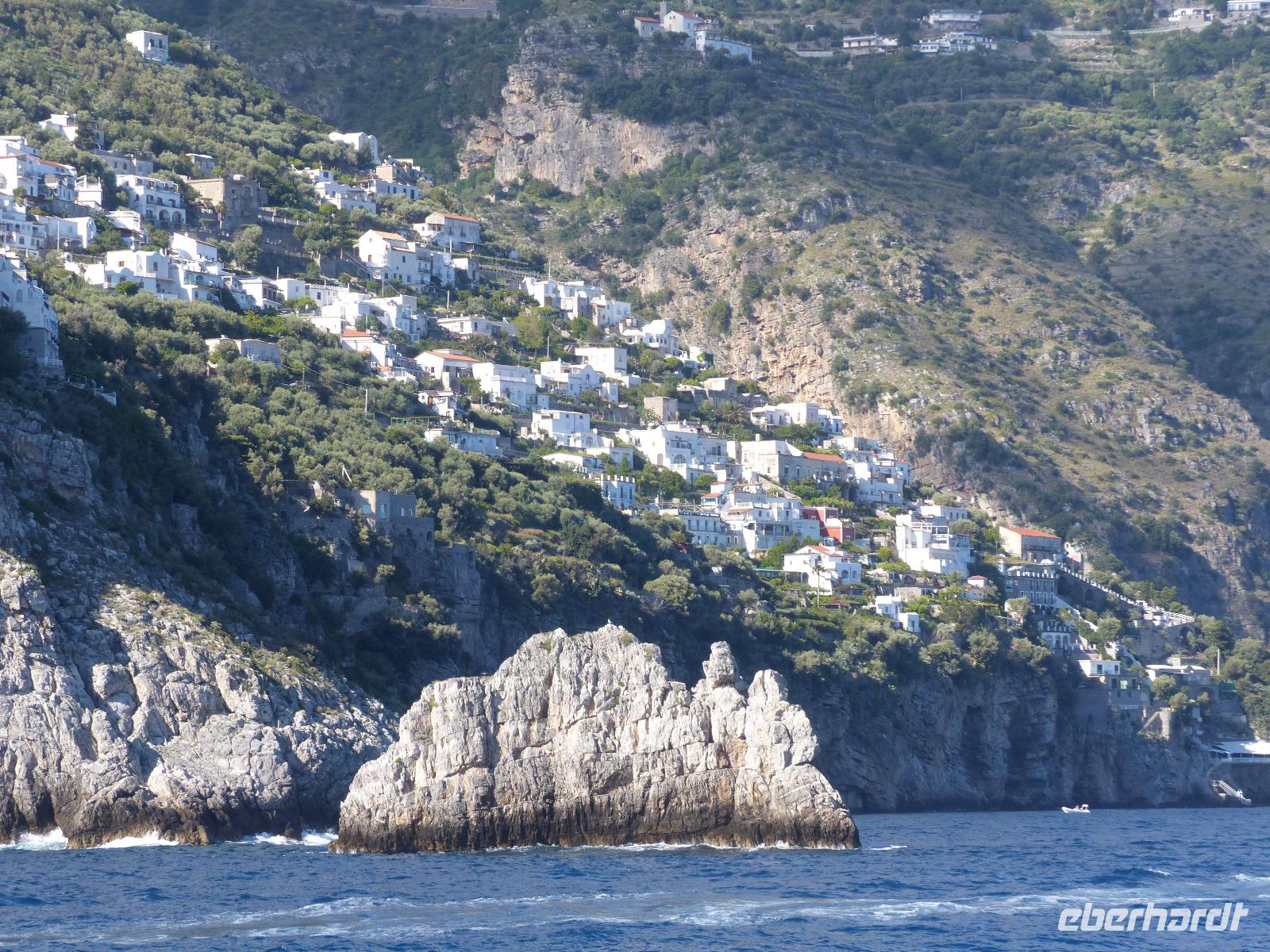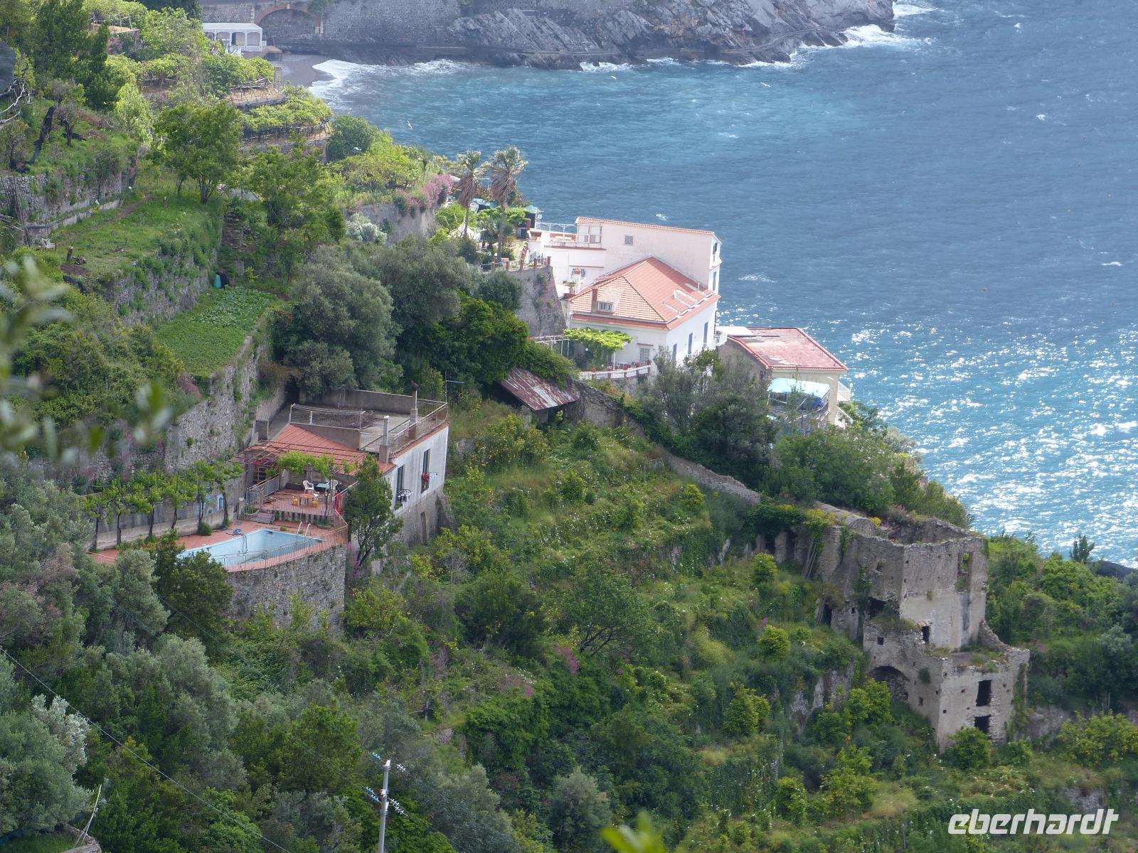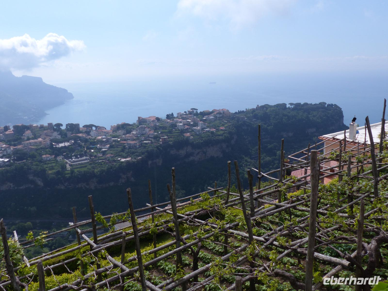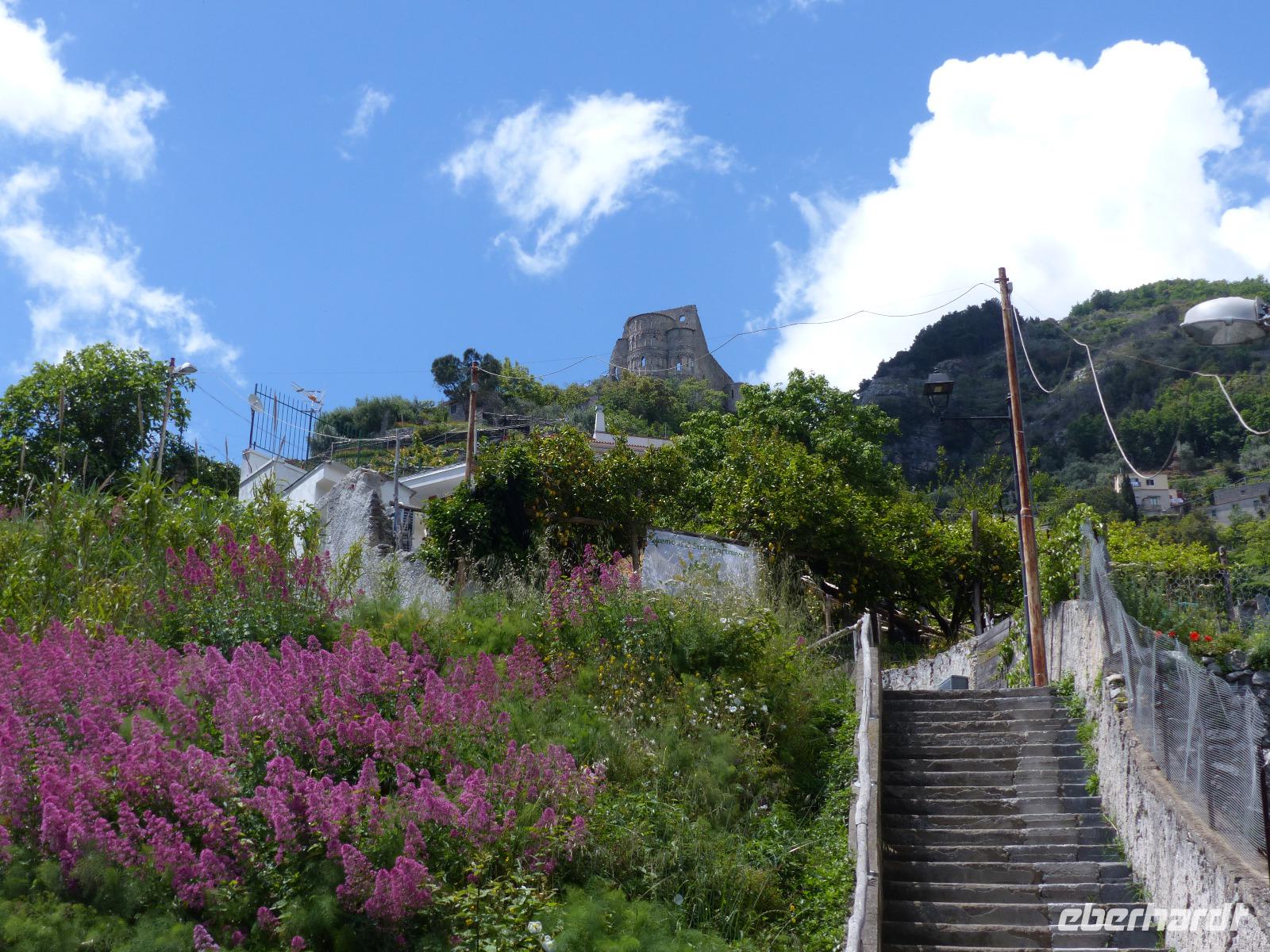 Unsere Gäste von Leipzig und Dresden flogen nach München, wo sie auf die Reiseleiterin trafen, die von Berlin aus angeflogen kam und wo auch unsere Münchner zur Gruppe fanden. Unsere Frankfurter dagegen trafen wir erst in Neapel am Flughafen. Die Anreise klappte genau so wie geplant. Keinerlei größere Hindernisse erschwerten uns diesen Anreisetag. In Neapel stiegen wir um in einen Bus, der uns nach Minori, unseren Urlaubsort brachte. Graue Wolken zogen über den Himmel, aber es war trocken. Wir umrundeten die Stadt Neapel und sausten auf der Autobahn am wolkenverhangenen Vesuv vorüber, passierten Pompei und erreichten bei Vietri sul Mare schließlich die Amalfitana, die Südküste der Monte Lateri. Nun arbeitete sich der Bus auf der Küstenstraße entlang, die sich hoch über dem Meer am Hang zwischen Zitronenplantagen und Hotels entlang windet und die malerischen Orte der Küste miteinander verbindet. Italien hatte bisher ein regenreiches Frühjahr durchlebt, denn nachdem ich an Ostern Gäste bei blitzblauem Himmel durch diese Region geführt hatte, begann wieder eine feuchte Zeit, wie schon im März, wo es auch so viel geregnet hatte. Und die Wettervorhersage war auch nicht wirklich erheiternd. Aber das Wetter wurde dann im Laufe der Woche doch wieder wunderschön, allen Unkenrufen zum Trotz. Gegen Abend erreichten noch unsere beiden Stuttgarter das Hotel, bevor wir uns das leckere Abendessen im Hotel gut schmecken ließen. Danach verschwanden die meisten Gäste ziemlich schnell ins Bett, denn Anreisetage machen müde.