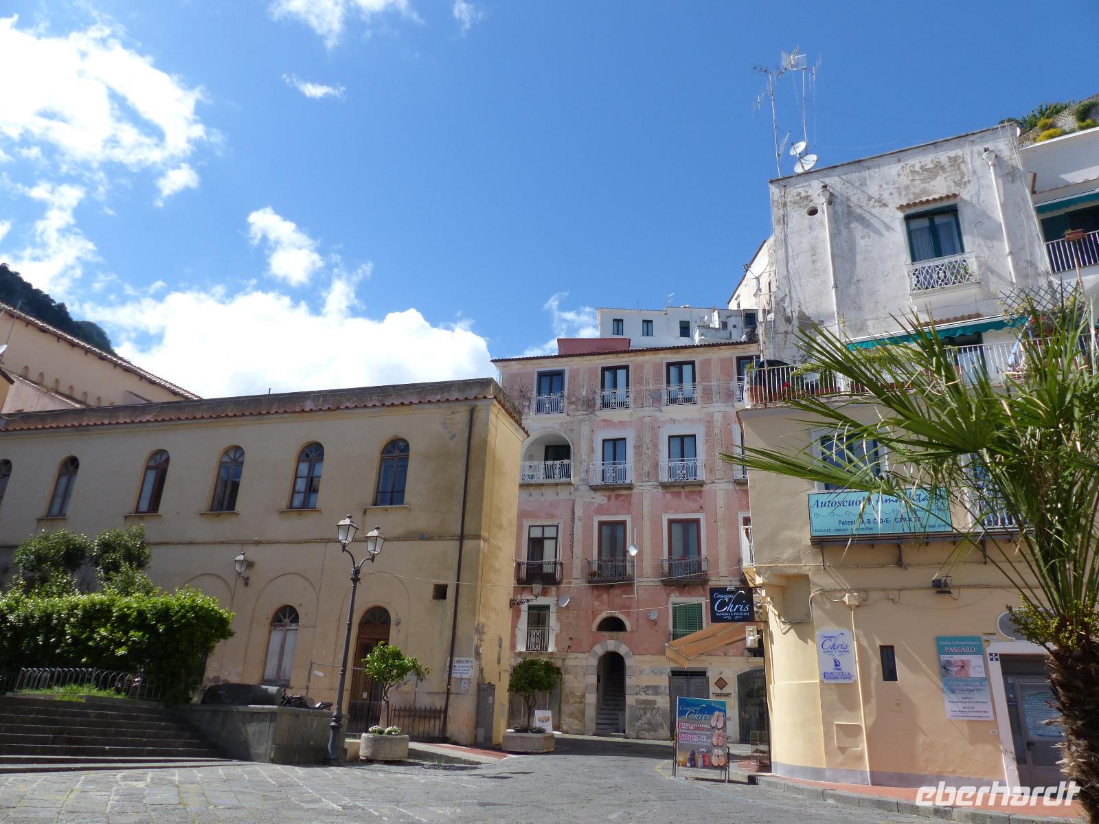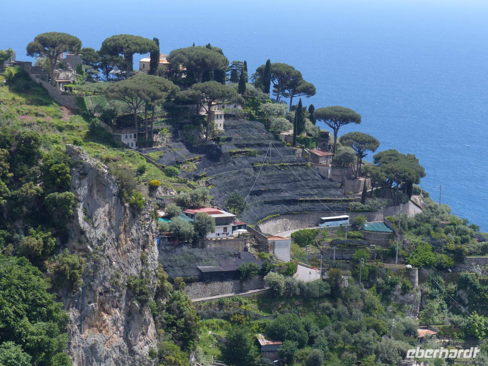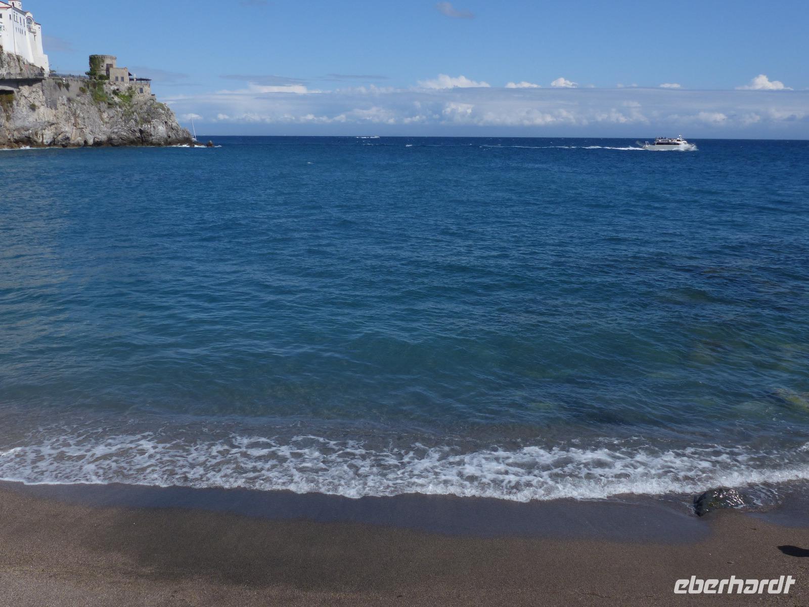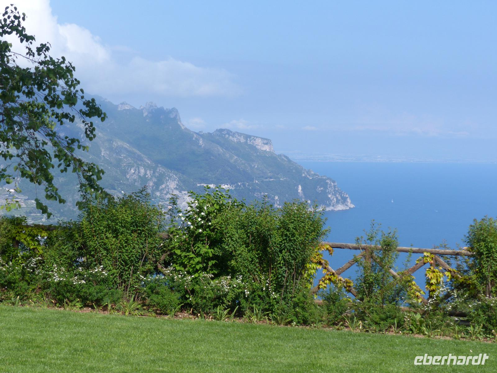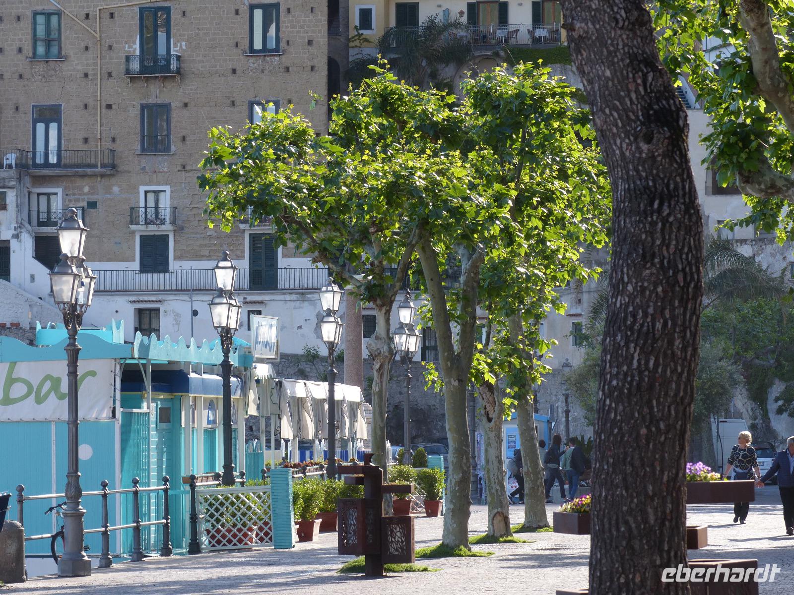 Unsere Gäste von Leipzig und Dresden flogen nach München, wo sie auf die Reiseleiterin trafen, die von Berlin aus angeflogen kam und wo auch unsere Münchner zur Gruppe fanden. Unsere Frankfurter dagegen trafen wir erst in Neapel am Flughafen. Die Anreise klappte genau so wie geplant. Keinerlei größere Hindernisse erschwerten uns diesen Anreisetag. In Neapel stiegen wir um in einen Bus, der uns nach Minori, unseren Urlaubsort brachte. Graue Wolken zogen über den Himmel, aber es war trocken. Wir umrundeten die Stadt Neapel und sausten auf der Autobahn am wolkenverhangenen Vesuv vorüber, passierten Pompei und erreichten bei Vietri sul Mare schließlich die Amalfitana, die Südküste der Monte Lateri. Nun arbeitete sich der Bus auf der Küstenstraße entlang, die sich hoch über dem Meer am Hang zwischen Zitronenplantagen und Hotels entlang windet und die malerischen Orte der Küste miteinander verbindet. Italien hatte bisher ein regenreiches Frühjahr durchlebt, denn nachdem ich an Ostern Gäste bei blitzblauem Himmel durch diese Region geführt hatte, begann wieder eine feuchte Zeit, wie schon im März, wo es auch so viel geregnet hatte. Und die Wettervorhersage war auch nicht wirklich erheiternd. Aber das Wetter wurde dann im Laufe der Woche doch wieder wunderschön, allen Unkenrufen zum Trotz. Gegen Abend erreichten noch unsere beiden Stuttgarter das Hotel, bevor wir uns das leckere Abendessen im Hotel gut schmecken ließen. Danach verschwanden die meisten Gäste ziemlich schnell ins Bett, denn Anreisetage machen müde.