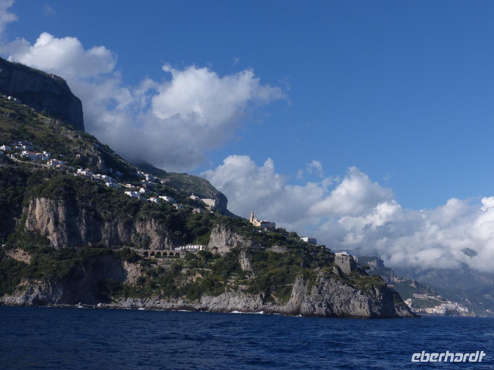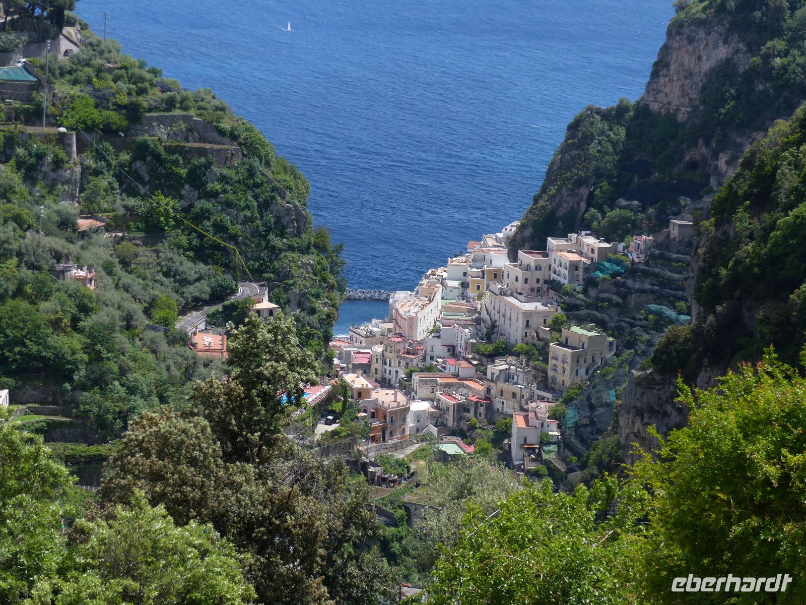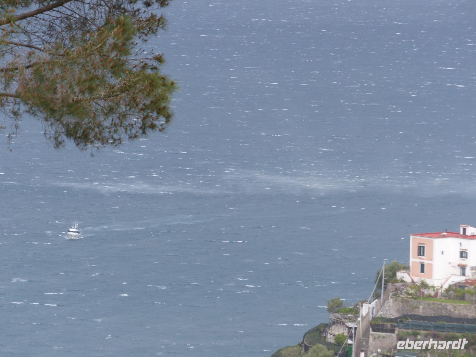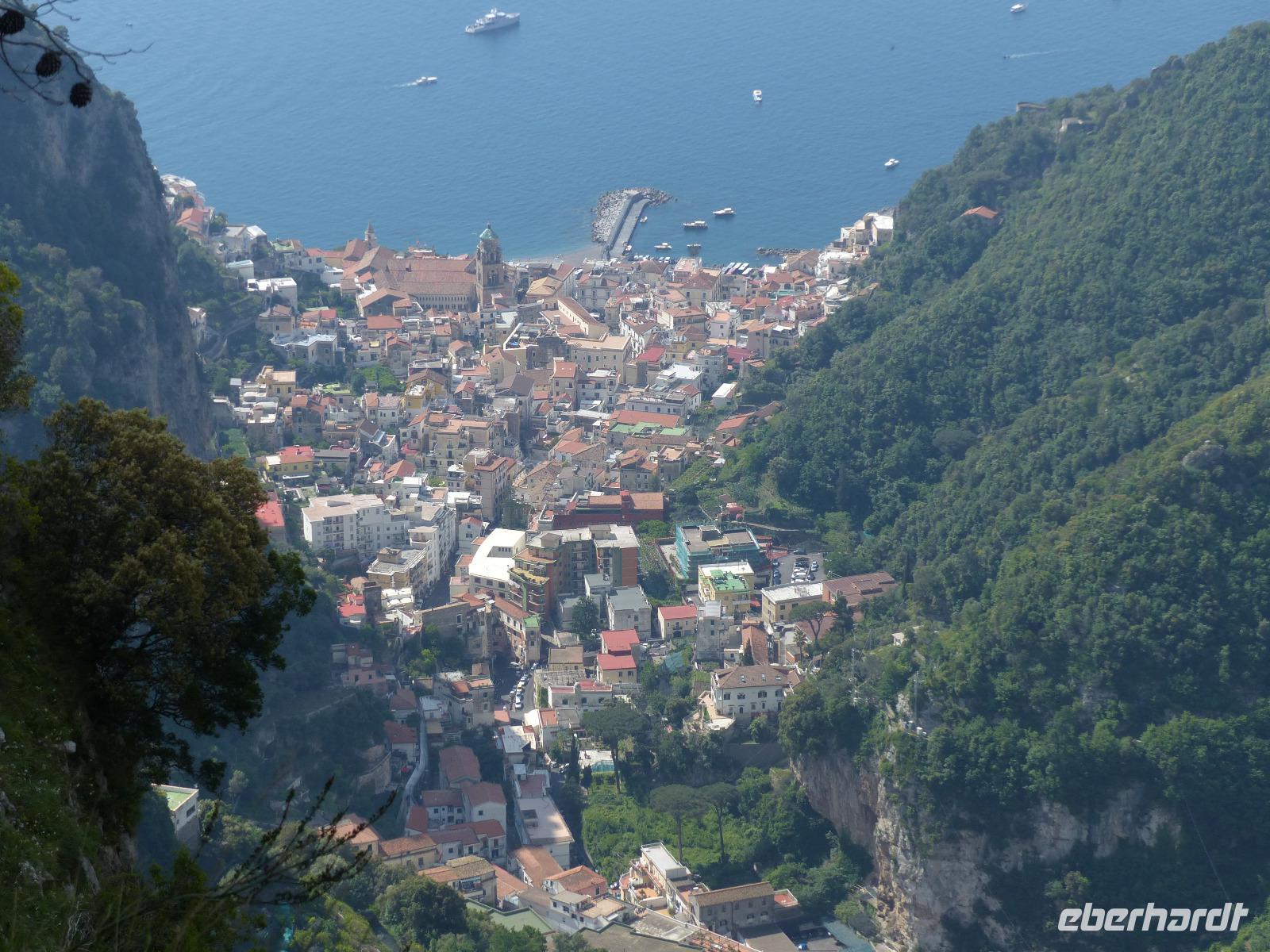 Gewappnet mit Regenkleidung zogen wir los. Per Bus ging es nun nach Amalfi. Von der Hafenmole aus sieht man den Ort wunderschön liegen. Wir durchquerten den geschichtsträchtigen Ort, bewunderten die ganzjährig aufgestellten Weihnachtskrippen und ließen uns dann noch durch das Papiermuseum führen. Danach wanderten wir los, durch Zitronenhaine aufwärts ins Mühlental. Die Regensachen packten wir schnell wieder ein, denn es war zwar grau, aber von Regen keine Spur. „Zeig mir das Land, wo die Zitronen blühn!" Sie blühten und sie trugen gleichzeitig dicke gelbe Früchte. Überall plätscherte das Wasser. Die Regenfälle der vergangenen Wochen hatten üppige Wasserfälle zur Folge. Wir passierten überwucherte alte Gemäuer, die von verfallenden Papiermühlen stammen. Nach einem letzten Anstieg bot sich uns eine herrliche Aussicht auf Amalfi hinunter. Lange konnten wir diesen aber nicht genießen denn nun ging es ganz schnell: Wind kam auf und ein kurzer aber sehr heftiger Regenschauer sorgte dafür, dass wir alle ziemlich nass wurden. Natürlich versuchten wir uns ganz schnell Regenkleidung anzuziehen, aber der Regen war schneller! Zum Glück erreichten wir schon 10 Minuten später Pontone. In Pontone ließen wir uns daher also nicht auf dem Kirchplatz nieder sondern wir strandeten in einem Nebenraum der Kirche - groß und trocken. Hier konnten wir unsere nassen Kleidungsstücke gut trocknen und es wurde uns jetzt eben hier kräftig aufgetischt. Trocken und satt krochen wir am frühen Nachmittag wieder aus unserem Schutzraum hervor - und siehe da: die Welt war frisch gewaschen und erstrahlte in Blau! Bei strahlendem Sonnenschein stiegen wir ab nach Atrani ans Meer. Ein kleines Stück wanderten wir auf der Straße entlang - die ist ziemlich hart, musste ein Gast erfahren, denn genau dort küsste er den Boden. Zum Glück war der Schaden nicht allzu groß und wir konnten gut gelaunt weiterziehen nach Atrani. Dort gab es das erste leckere italienische Eis. Dann wanderten wir weiter nach Amalfi, genossen den Blick auf das blaue Meer und die herrliche Vegetation am Wegesrand und besichtigten in Amalfi den Dom Sant' Andrea, bevor wir in See stachen. Die Rückreise erfolgte nämlich mit dem flotten Linienschiff nach Minori. Zum Abschluss dieses schönen ersten Wandertages ließen wir uns wie jeden Abend das wirklich sehr gute Abendessen schmecken.