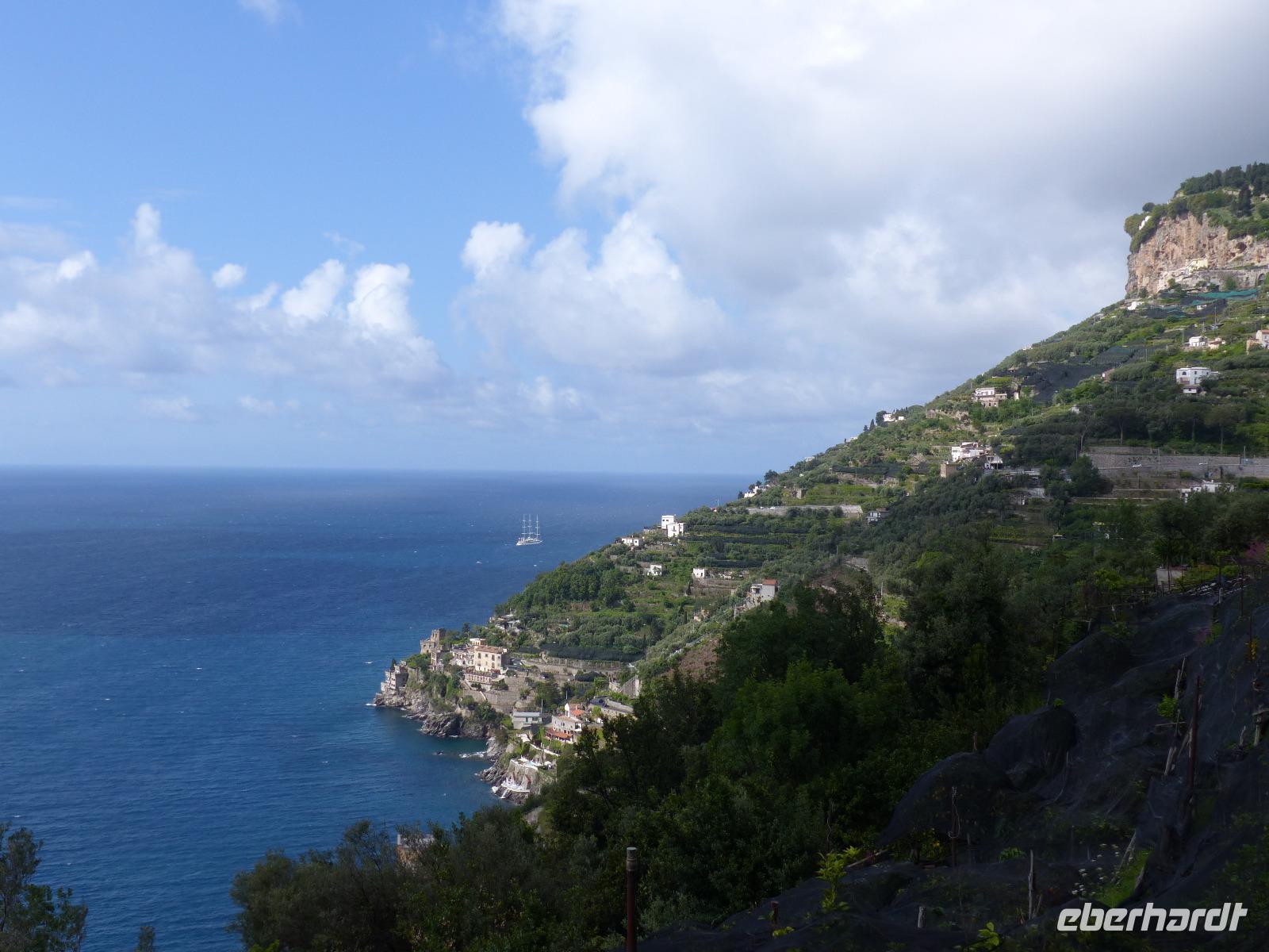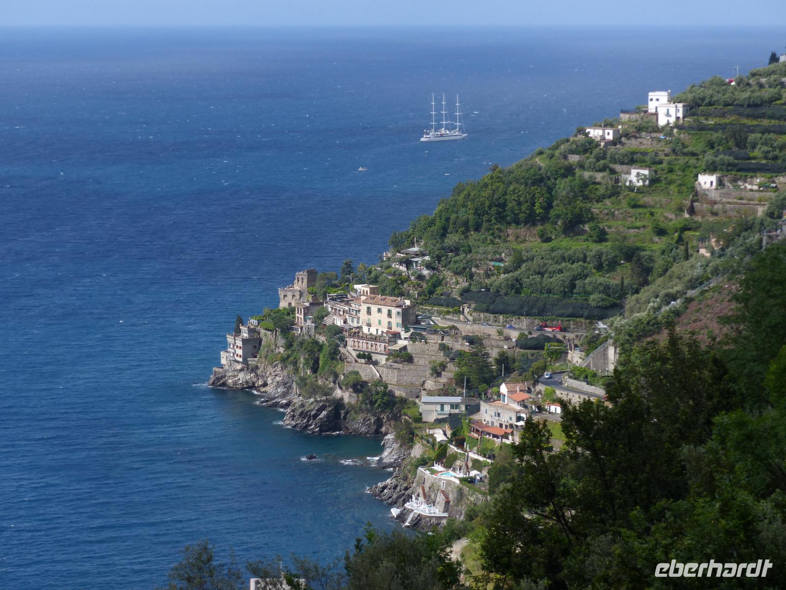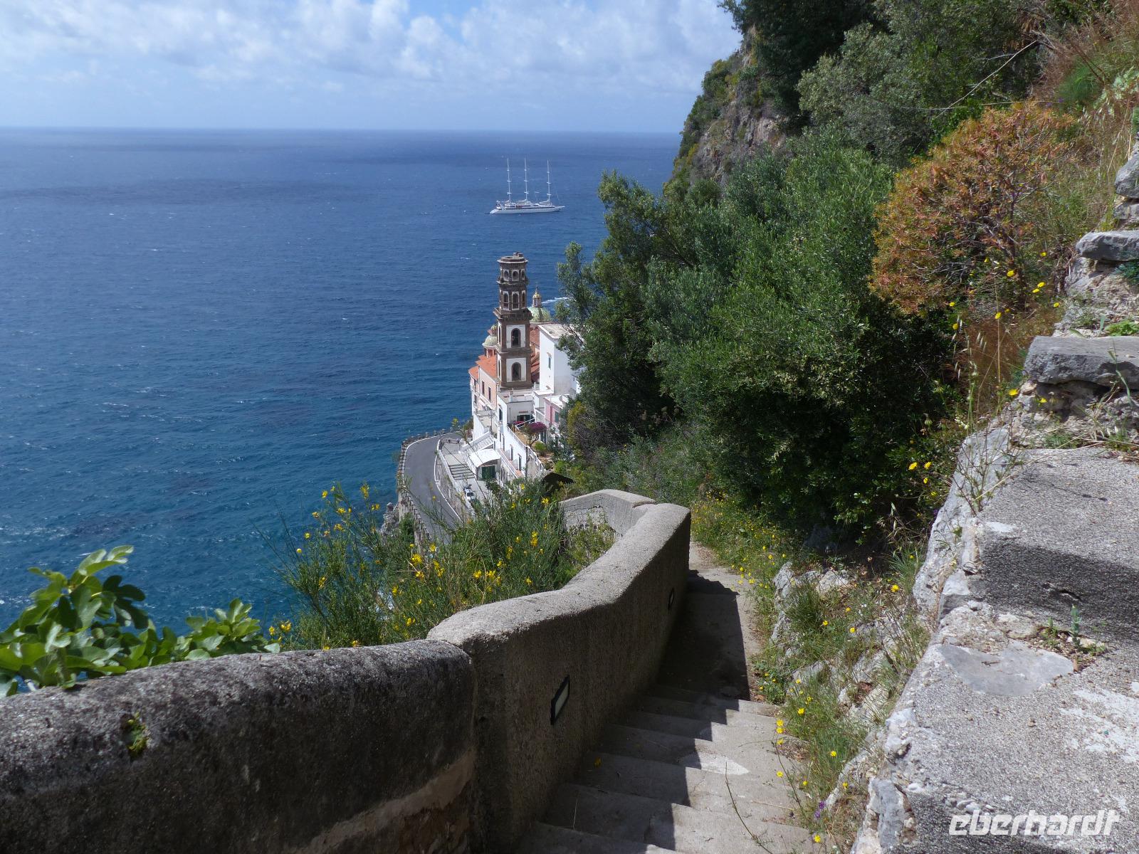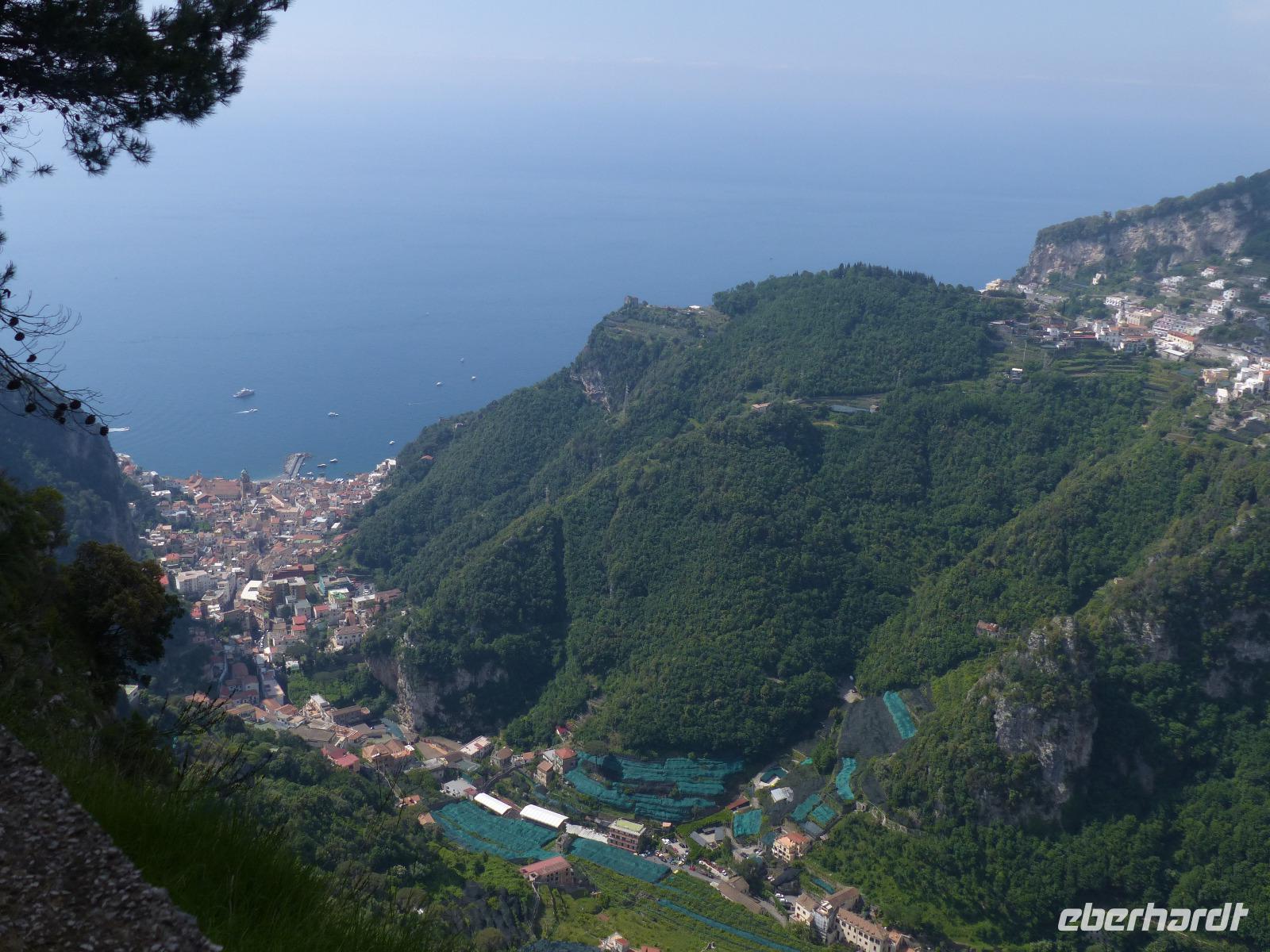 Gewappnet mit Regenkleidung zogen wir los. Per Bus ging es nun nach Amalfi. Von der Hafenmole aus sieht man den Ort wunderschön liegen. Wir durchquerten den geschichtsträchtigen Ort, bewunderten die ganzjährig aufgestellten Weihnachtskrippen und ließen uns dann noch durch das Papiermuseum führen. Danach wanderten wir los, durch Zitronenhaine aufwärts ins Mühlental. Die Regensachen packten wir schnell wieder ein, denn es war zwar grau, aber von Regen keine Spur. „Zeig mir das Land, wo die Zitronen blühn!" Sie blühten und sie trugen gleichzeitig dicke gelbe Früchte. Überall plätscherte das Wasser. Die Regenfälle der vergangenen Wochen hatten üppige Wasserfälle zur Folge. Wir passierten überwucherte alte Gemäuer, die von verfallenden Papiermühlen stammen. Nach einem letzten Anstieg bot sich uns eine herrliche Aussicht auf Amalfi hinunter. Lange konnten wir diesen aber nicht genießen denn nun ging es ganz schnell: Wind kam auf und ein kurzer aber sehr heftiger Regenschauer sorgte dafür, dass wir alle ziemlich nass wurden. Natürlich versuchten wir uns ganz schnell Regenkleidung anzuziehen, aber der Regen war schneller! Zum Glück erreichten wir schon 10 Minuten später Pontone. In Pontone ließen wir uns daher also nicht auf dem Kirchplatz nieder sondern wir strandeten in einem Nebenraum der Kirche - groß und trocken. Hier konnten wir unsere nassen Kleidungsstücke gut trocknen und es wurde uns jetzt eben hier kräftig aufgetischt. Trocken und satt krochen wir am frühen Nachmittag wieder aus unserem Schutzraum hervor - und siehe da: die Welt war frisch gewaschen und erstrahlte in Blau! Bei strahlendem Sonnenschein stiegen wir ab nach Atrani ans Meer. Ein kleines Stück wanderten wir auf der Straße entlang - die ist ziemlich hart, musste ein Gast erfahren, denn genau dort küsste er den Boden. Zum Glück war der Schaden nicht allzu groß und wir konnten gut gelaunt weiterziehen nach Atrani. Dort gab es das erste leckere italienische Eis. Dann wanderten wir weiter nach Amalfi, genossen den Blick auf das blaue Meer und die herrliche Vegetation am Wegesrand und besichtigten in Amalfi den Dom Sant' Andrea, bevor wir in See stachen. Die Rückreise erfolgte nämlich mit dem flotten Linienschiff nach Minori. Zum Abschluss dieses schönen ersten Wandertages ließen wir uns wie jeden Abend das wirklich sehr gute Abendessen schmecken.