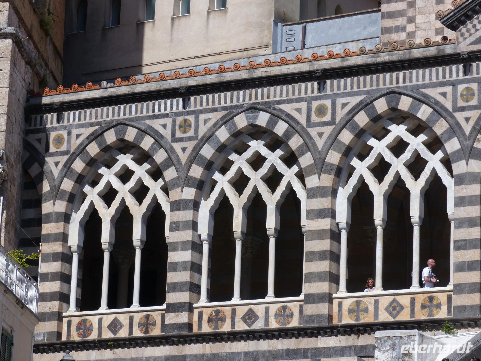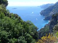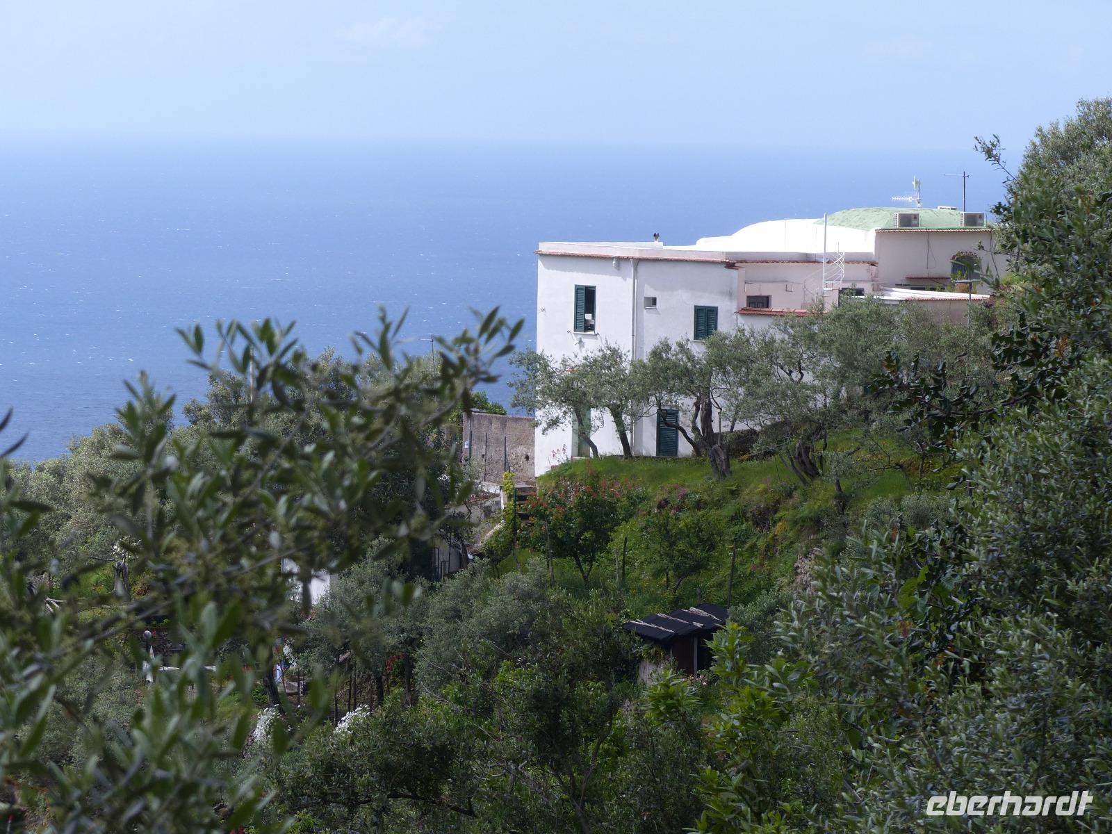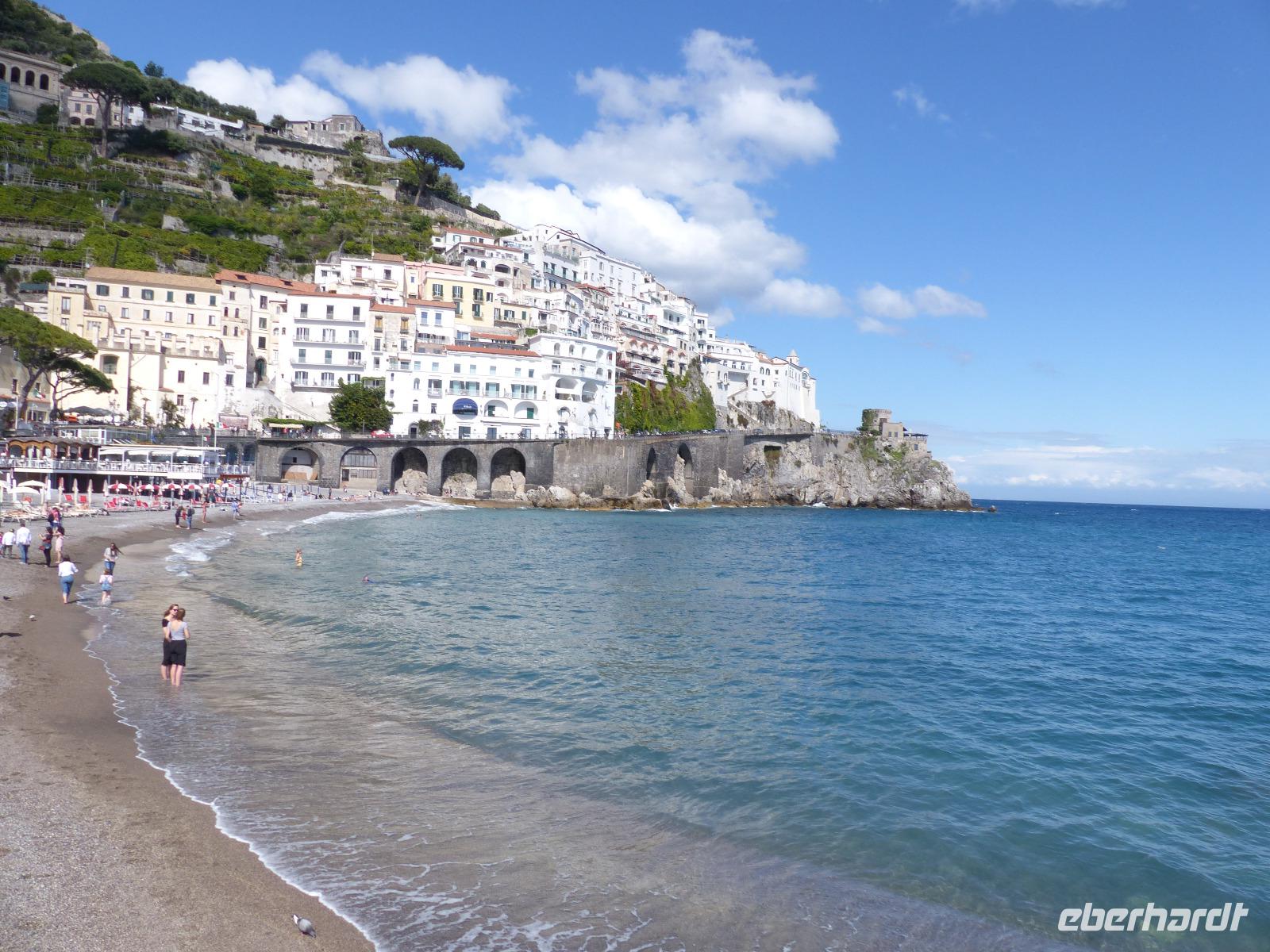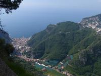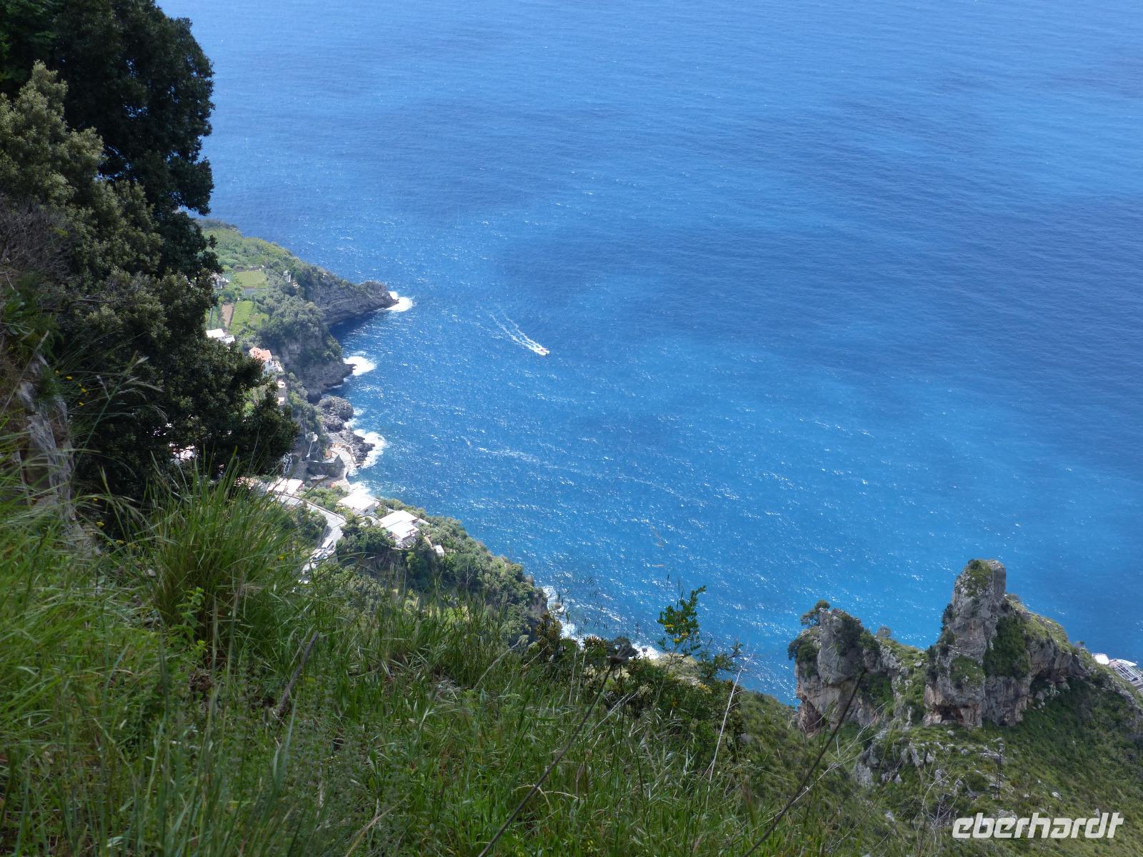 Gewappnet mit Regenkleidung zogen wir los. Per Bus ging es nun nach Amalfi. Von der Hafenmole aus sieht man den Ort wunderschön liegen. Wir durchquerten den geschichtsträchtigen Ort, bewunderten die ganzjährig aufgestellten Weihnachtskrippen und ließen uns dann noch durch das Papiermuseum führen. Danach wanderten wir los, durch Zitronenhaine aufwärts ins Mühlental. Die Regensachen packten wir schnell wieder ein, denn es war zwar grau, aber von Regen keine Spur. „Zeig mir das Land, wo die Zitronen blühn!" Sie blühten und sie trugen gleichzeitig dicke gelbe Früchte. Überall plätscherte das Wasser. Die Regenfälle der vergangenen Wochen hatten üppige Wasserfälle zur Folge. Wir passierten überwucherte alte Gemäuer, die von verfallenden Papiermühlen stammen. Nach einem letzten Anstieg bot sich uns eine herrliche Aussicht auf Amalfi hinunter. Lange konnten wir diesen aber nicht genießen denn nun ging es ganz schnell: Wind kam auf und ein kurzer aber sehr heftiger Regenschauer sorgte dafür, dass wir alle ziemlich nass wurden. Natürlich versuchten wir uns ganz schnell Regenkleidung anzuziehen, aber der Regen war schneller! Zum Glück erreichten wir schon 10 Minuten später Pontone. In Pontone ließen wir uns daher also nicht auf dem Kirchplatz nieder sondern wir strandeten in einem Nebenraum der Kirche - groß und trocken. Hier konnten wir unsere nassen Kleidungsstücke gut trocknen und es wurde uns jetzt eben hier kräftig aufgetischt. Trocken und satt krochen wir am frühen Nachmittag wieder aus unserem Schutzraum hervor - und siehe da: die Welt war frisch gewaschen und erstrahlte in Blau! Bei strahlendem Sonnenschein stiegen wir ab nach Atrani ans Meer. Ein kleines Stück wanderten wir auf der Straße entlang - die ist ziemlich hart, musste ein Gast erfahren, denn genau dort küsste er den Boden. Zum Glück war der Schaden nicht allzu groß und wir konnten gut gelaunt weiterziehen nach Atrani. Dort gab es das erste leckere italienische Eis. Dann wanderten wir weiter nach Amalfi, genossen den Blick auf das blaue Meer und die herrliche Vegetation am Wegesrand und besichtigten in Amalfi den Dom Sant' Andrea, bevor wir in See stachen. Die Rückreise erfolgte nämlich mit dem flotten Linienschiff nach Minori. Zum Abschluss dieses schönen ersten Wandertages ließen wir uns wie jeden Abend das wirklich sehr gute Abendessen schmecken.