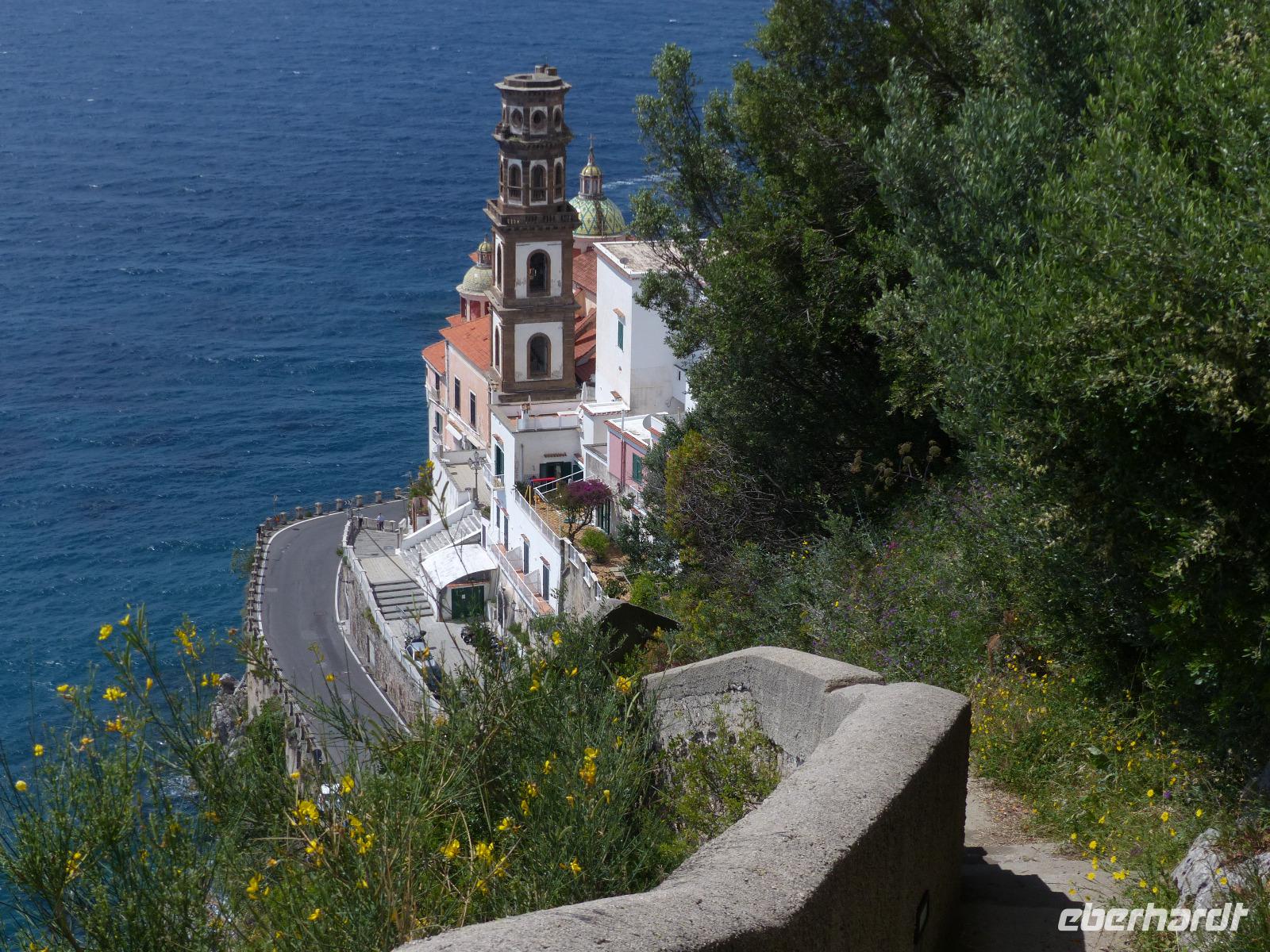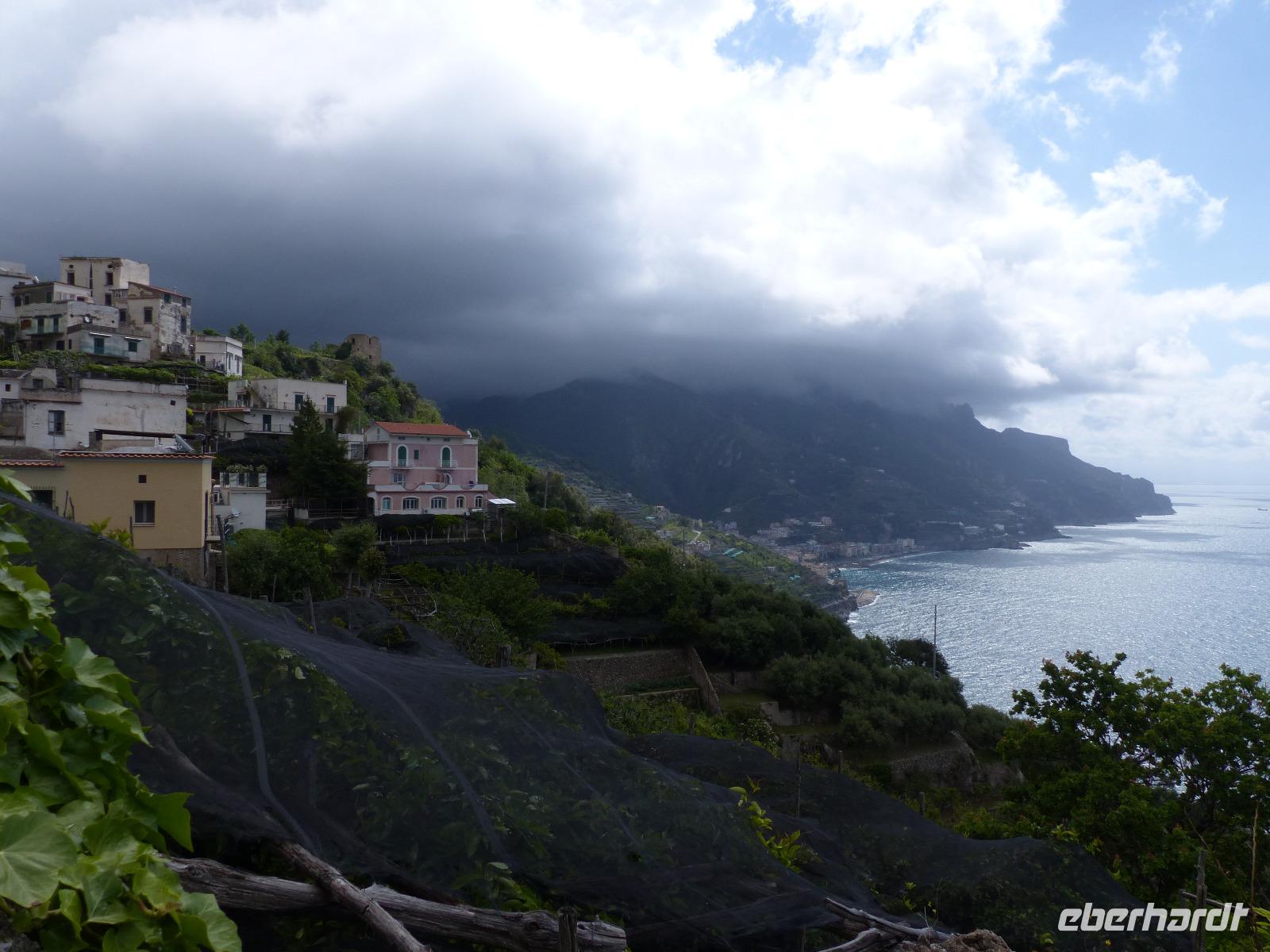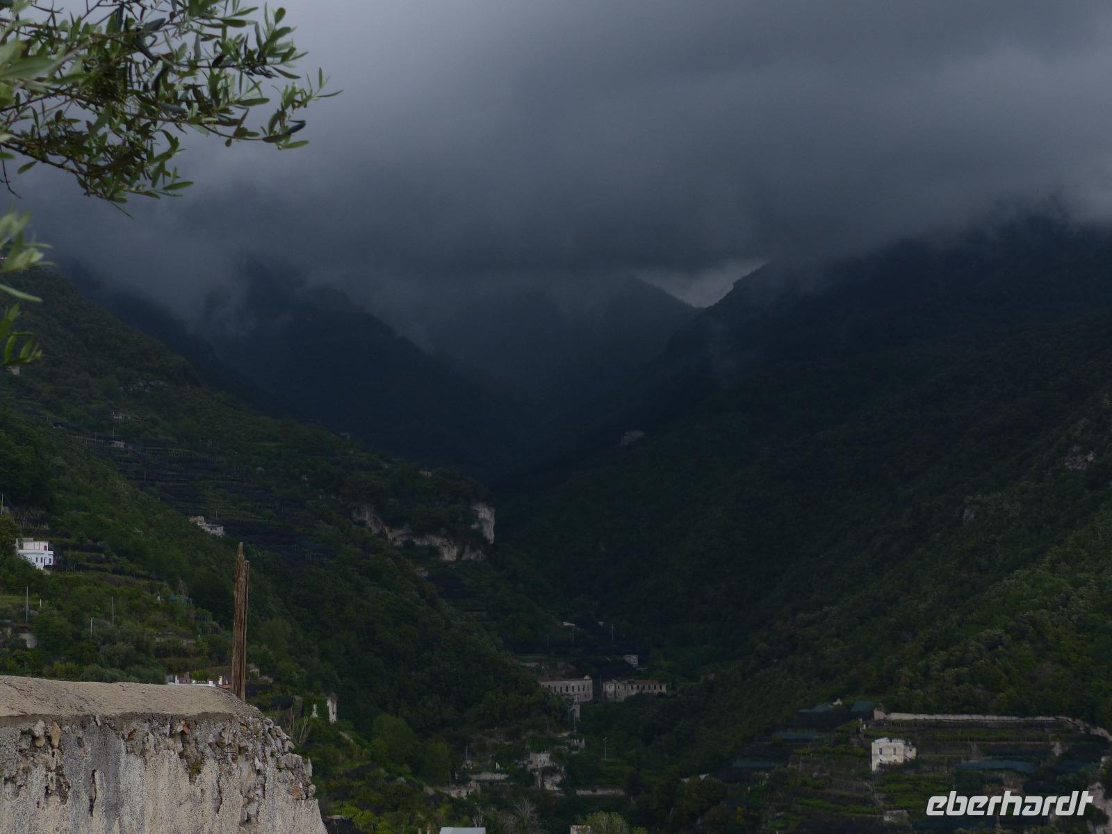 Auf unserem Plan heute Morgen stand eigentlich Ravello. Aber in den Bergen hingen bleigraue Wolken und Blitze hüpften durch die Berge. Das ist kein Wetter fürs Gebirge. Ravello liegt rund 400 m hoch und ich beschloss Plan B. Wir warteten bis der Regen an der Küste aufgehört hatte und dann zogen wir los zum Friedhof von Minori. Dort beginnt ein Treppenweg an der Küste entlang nach Torello, den höchsten Punkt, den wir heute erreichen sollten, denn vor der Kirche bogen wir auf einen Seitenweg ab, der uns durch Zitronenplantagen und Gärten wieder abwärts und dann vorne an der Küste entlang durch Terrassen mit blühenden Gärten und Olivenhainen führte. Wir passierten zahlreiche Villen, die in der Sonne lagen und das Meer schimmerte blitzblau, während wir von den Bergen rechterhand gar nichts sahen, denn die Wolken bildeten in 400-500 Metern Höhe eine undurchdringliche graue Wand. Was für eine herrliche Wanderung war dies doch! Wir genossen die tollen Ausblicke auf die Küste, streckten unsere Nasen der Sonne entgegen und warfen zufriedene Blicke auf die Wolken, die nun mal in den Bergen hingen. Dort waren sie gut aufgehoben und sie ließen uns so in Ruhe wandern. Bei Atrani erreichten wir mit herrlichen Blicken auf die Kirche der Maria Magdalena das Meer und nun entdeckte ich etwas Neues: zwischen Atrani und Amalfi gibt es einen Tunnel für Fußgänger! Sehr praktisch war das, denn das ersparte uns einen weiteren Aufstieg und ein Wegstück, das wir ja bereits kannten. Per Bus ging es dann wieder nach Minori zurück. Die Gäste, die Plan B dank der grauen Wolken nicht begeistert hatte, trafen wir nun im Hotel. Auch in Minori war die Sonne aufgetaucht und nun stiegen wir alle zusammen hoch in die Terrassenfelder zur Villa Maria. Dort erwartete uns ein leckeres Menü mit Lasagne. Der Limoncello, den uns Vicenzo verkaufen wollte, fand viele Liebhaber. Als wir so ungefähr startklar waren sah ich wieder bleigraue Wolken übers Meer ziehen. Ich bleibe noch und warte bis dieses Gewitter vorüber ist, ließ ich die Gäste wissen. Einige zogen gleich los, aber ein lustiger harter Kern vergnügte sich noch bei einem Glas Wein und wartete auf die Sonne. Trockenen Fußes kamen wir schließlich gegen Abend in beschwingt guter Laune wieder ins Hotel zurück.