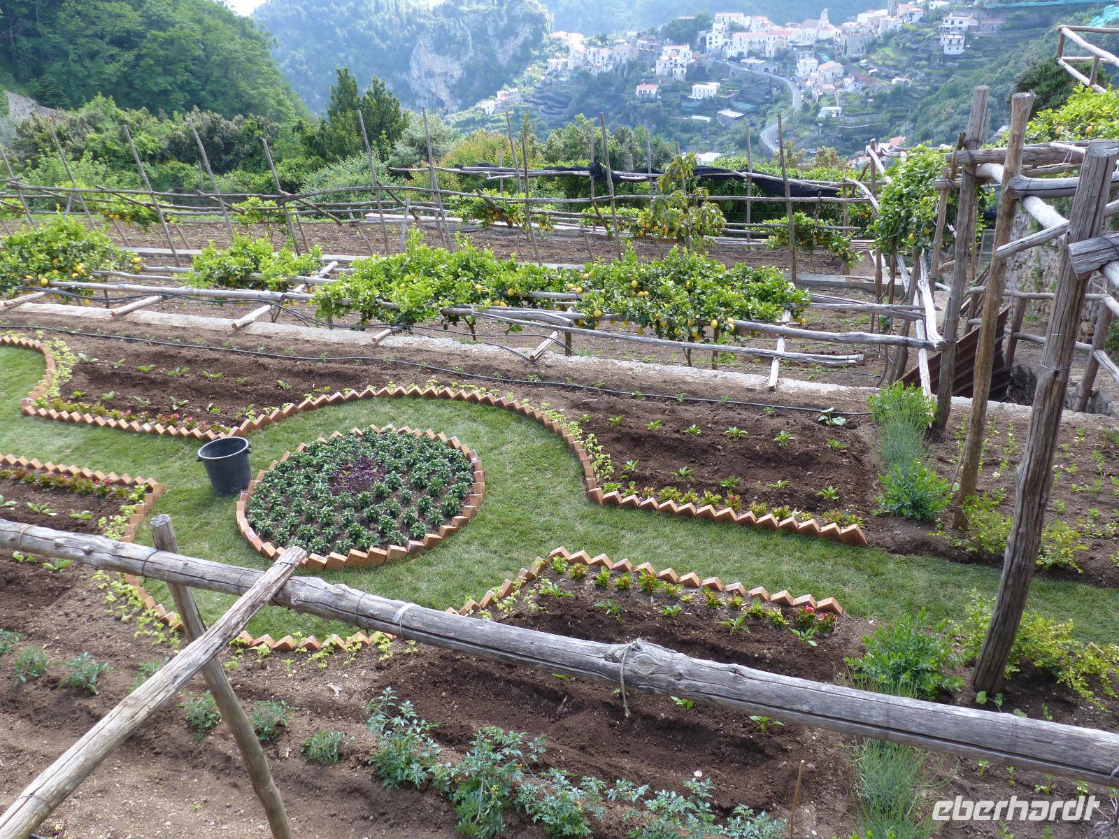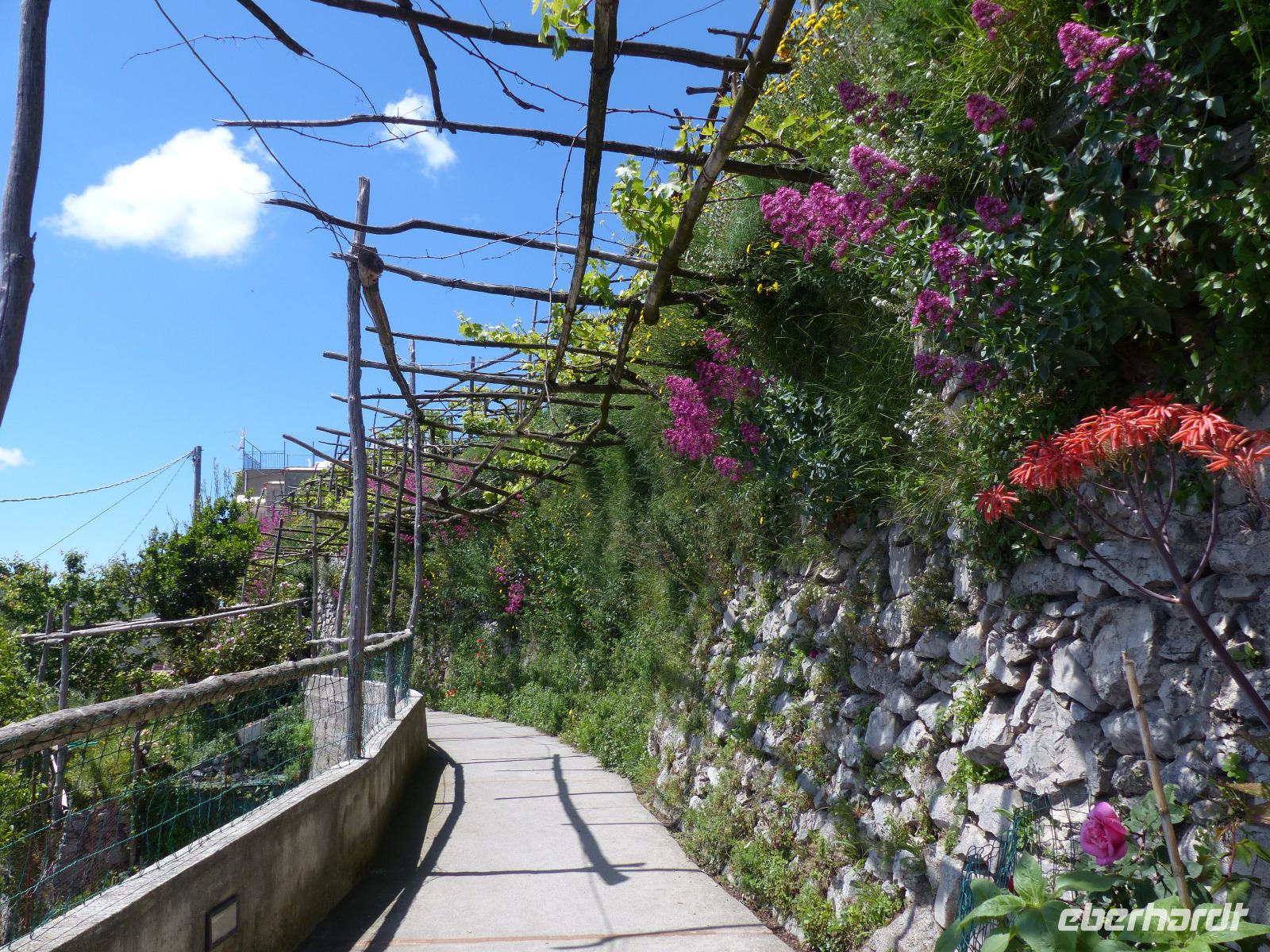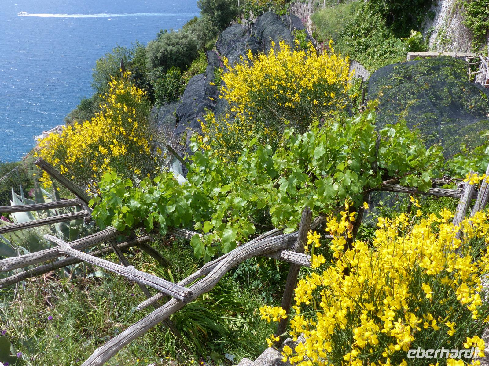 Auf unserem Plan heute Morgen stand eigentlich Ravello. Aber in den Bergen hingen bleigraue Wolken und Blitze hüpften durch die Berge. Das ist kein Wetter fürs Gebirge. Ravello liegt rund 400 m hoch und ich beschloss Plan B. Wir warteten bis der Regen an der Küste aufgehört hatte und dann zogen wir los zum Friedhof von Minori. Dort beginnt ein Treppenweg an der Küste entlang nach Torello, den höchsten Punkt, den wir heute erreichen sollten, denn vor der Kirche bogen wir auf einen Seitenweg ab, der uns durch Zitronenplantagen und Gärten wieder abwärts und dann vorne an der Küste entlang durch Terrassen mit blühenden Gärten und Olivenhainen führte. Wir passierten zahlreiche Villen, die in der Sonne lagen und das Meer schimmerte blitzblau, während wir von den Bergen rechterhand gar nichts sahen, denn die Wolken bildeten in 400-500 Metern Höhe eine undurchdringliche graue Wand. Was für eine herrliche Wanderung war dies doch! Wir genossen die tollen Ausblicke auf die Küste, streckten unsere Nasen der Sonne entgegen und warfen zufriedene Blicke auf die Wolken, die nun mal in den Bergen hingen. Dort waren sie gut aufgehoben und sie ließen uns so in Ruhe wandern. Bei Atrani erreichten wir mit herrlichen Blicken auf die Kirche der Maria Magdalena das Meer und nun entdeckte ich etwas Neues: zwischen Atrani und Amalfi gibt es einen Tunnel für Fußgänger! Sehr praktisch war das, denn das ersparte uns einen weiteren Aufstieg und ein Wegstück, das wir ja bereits kannten. Per Bus ging es dann wieder nach Minori zurück. Die Gäste, die Plan B dank der grauen Wolken nicht begeistert hatte, trafen wir nun im Hotel. Auch in Minori war die Sonne aufgetaucht und nun stiegen wir alle zusammen hoch in die Terrassenfelder zur Villa Maria. Dort erwartete uns ein leckeres Menü mit Lasagne. Der Limoncello, den uns Vicenzo verkaufen wollte, fand viele Liebhaber. Als wir so ungefähr startklar waren sah ich wieder bleigraue Wolken übers Meer ziehen. Ich bleibe noch und warte bis dieses Gewitter vorüber ist, ließ ich die Gäste wissen. Einige zogen gleich los, aber ein lustiger harter Kern vergnügte sich noch bei einem Glas Wein und wartete auf die Sonne. Trockenen Fußes kamen wir schließlich gegen Abend in beschwingt guter Laune wieder ins Hotel zurück.