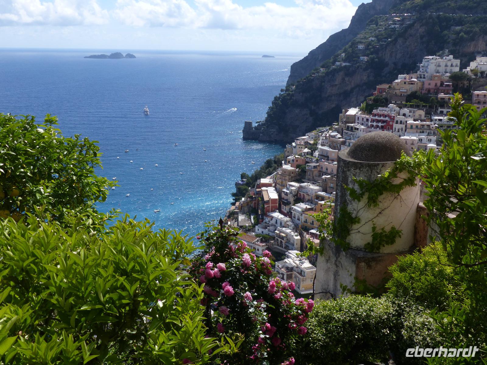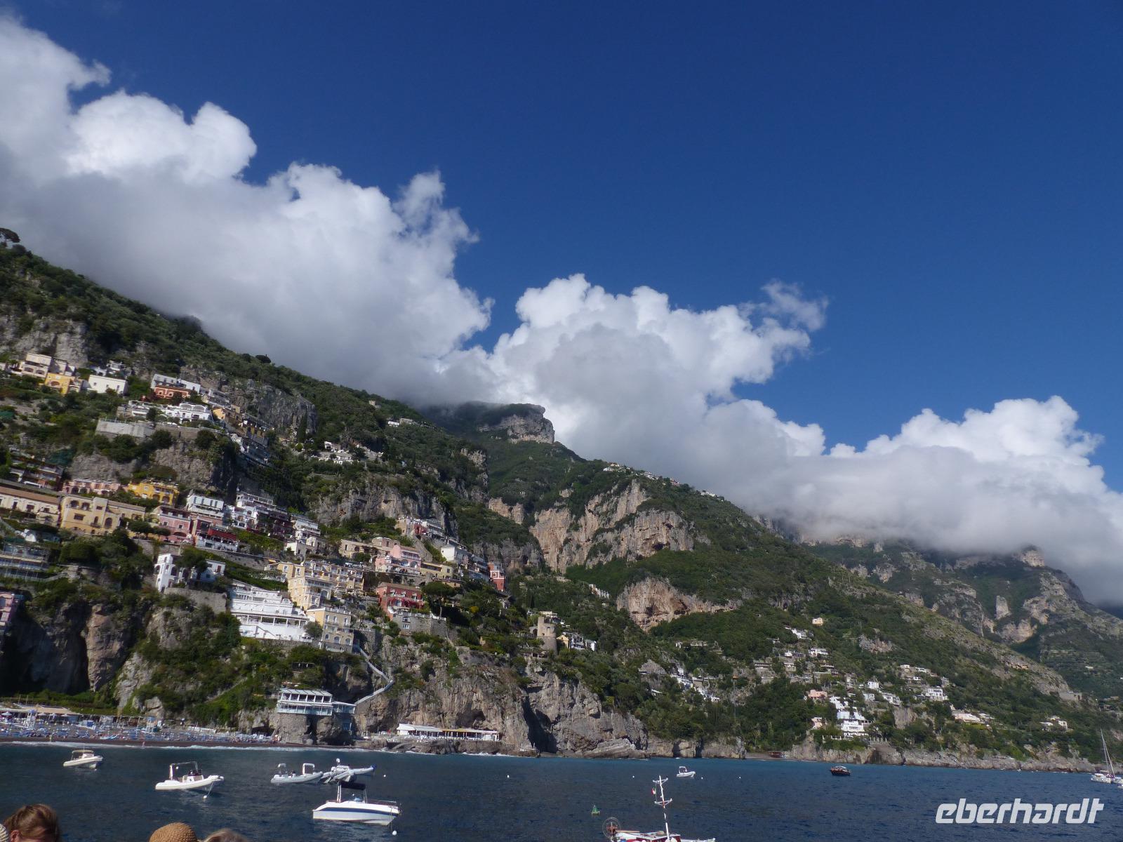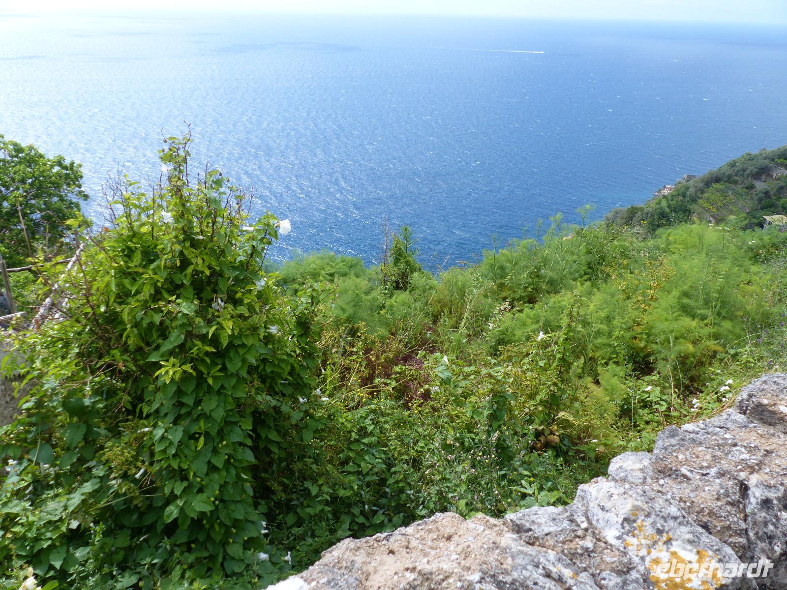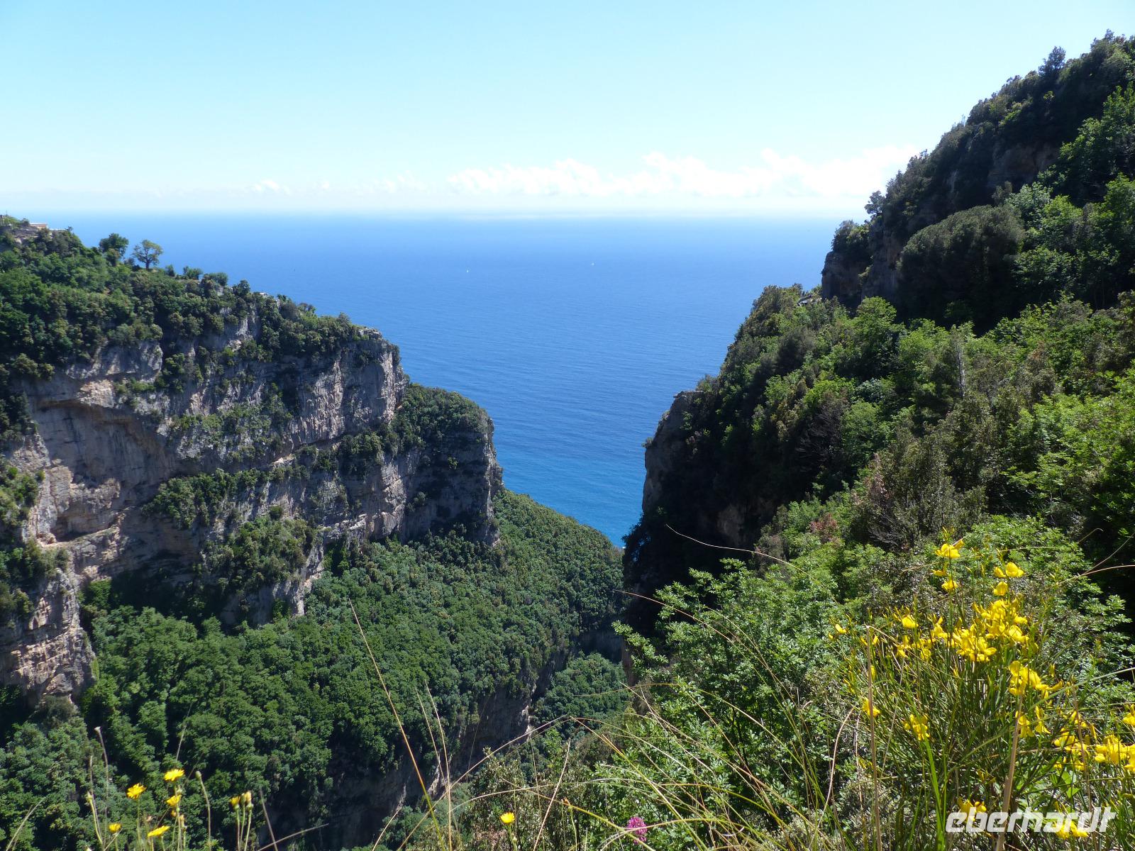 Die Nacht war für einige Gäste etwas kürzer, da uns drei Hotelgäste, die zum Glück an diesem Tag das Hotel verließen, den Schlaf etwas verkürzten. Das Hotel war ausgebucht und alle anderen Hotelgäste waren rücksichtsvolle, angenehme Menschen. Aber wir ließen uns die gute Laune nicht rauben. Auch die Wettervorhersage war mal wieder durchwachsen. Als wir im Bus saßen empfingen uns die Berge zunächst mit Nieselregen. Dieser wich, als wir in Bomerano ausstiegen, trockenem Mausgrau. In Bomerano gönnten wir uns noch einen Kaffee. Dann ging's los. Es waren nur sehr wenige Gruppen hier, denn die meisten blieben wegen der schlechten Wettervorhersage dem Götterpfad fern. Aber das Wetter tat mal wieder nicht das, was es tun sollte laut Meteorologen. Es wurde nämlich bald schon blitzblau! Eine kleine Pause machten wir an einer aussichtsreichen Stelle unter einer Felswand. Nun war die Sonne da. Und der schwierigere Teil der Wanderung begann bei herrlichem Wetter. Die große Pause folgte dann in Nocelle, einem kleinen Weiler, der hoch oben am Hang klebt. Hier erwartete uns mal wieder Leckeres aus der Küche. Mit meinem Hinweis „Wenn Ihr die Toilette besucht vergesst auch die Kamera nicht...", brachte ich einige zum Lachen. Was gibt es denn auf der Toilette zu fotografieren?? Nein, nicht die Toilette ist so interessant. Die Aussicht wenn man vor der Toilette unter der Wäscheleine hindurch geht. Die ist schön... Ja, das ist ne tolle Aussicht. Wir waren uns einig. Niemand wollte Bus fahren, alle wanderten mit mir bis nach Positano hinunter. Olivenhaine, wunderschöne Blumen und kugelrunde Schafe. Und unter uns der bekannte Friedhof von Positano und das blaue Meer. Dann erreichten wir die prächtigen Häuser mit alten Portalen am Ortsrand von Positano. Dort hielt uns ein tolles Violinkonzert in Bann: Lady Gaga und Bradley Cooper haben mit ihrem „Shallow" einen Hit gelandet, den die Welt nicht so schnell vergisst. Diese Musiker hatten daraus ein Violinkonzert gemacht, das wir nicht so schnell vergessen. Wir wurden begeisterte Zaungäste. Am Hafen versammelten wir uns wieder, denn den Rückweg traten wir übers Wasser an. So kamen wir alle auf unsere Kosten, auch abends beim Essen.