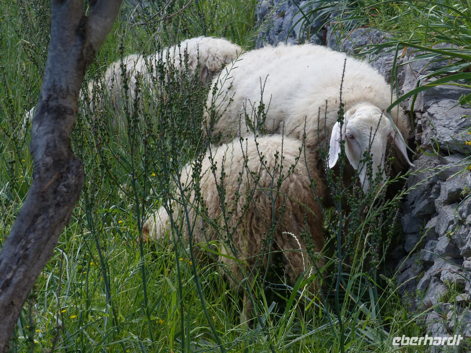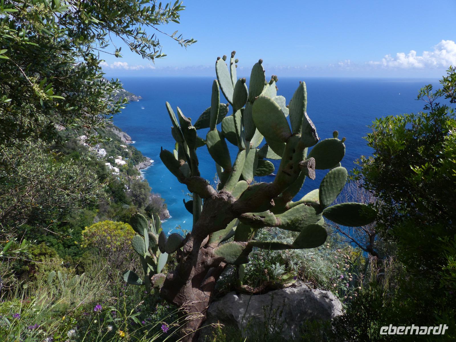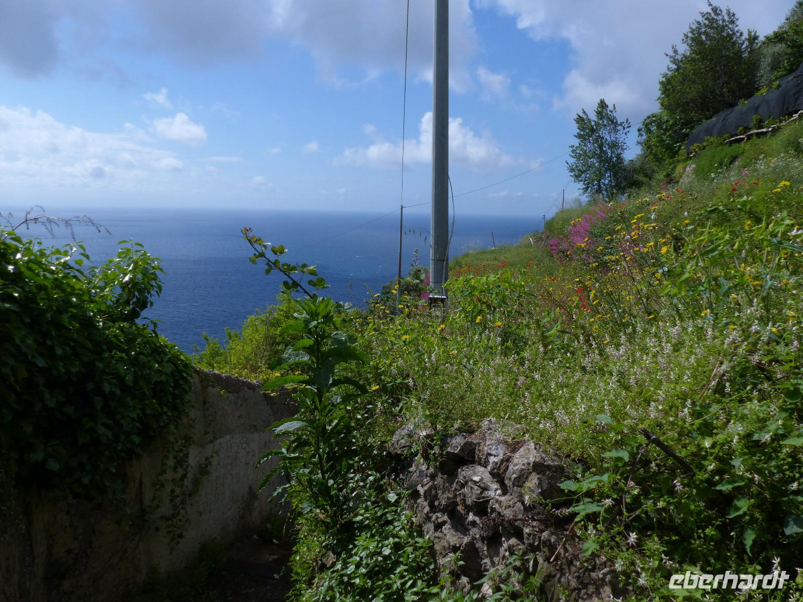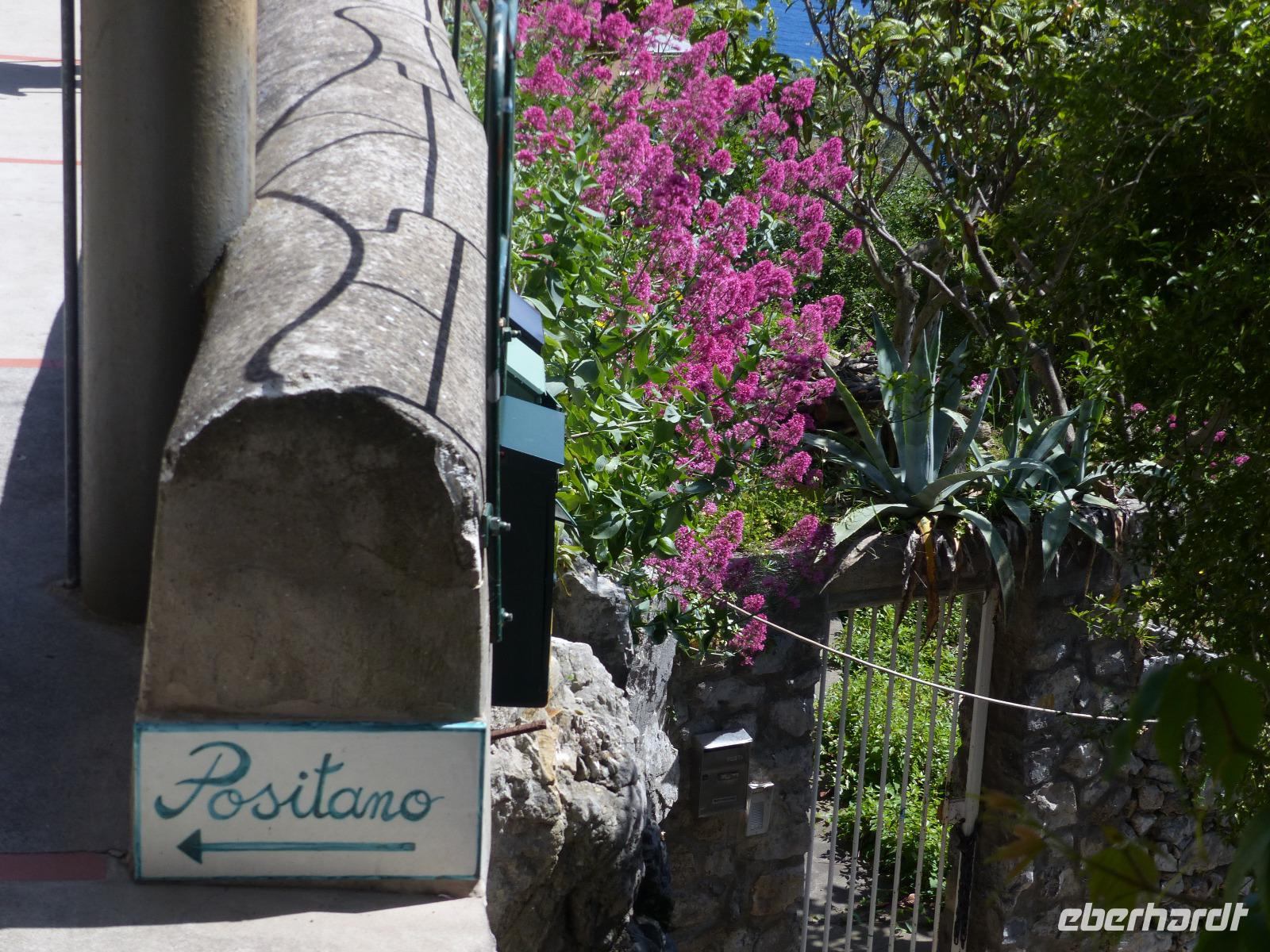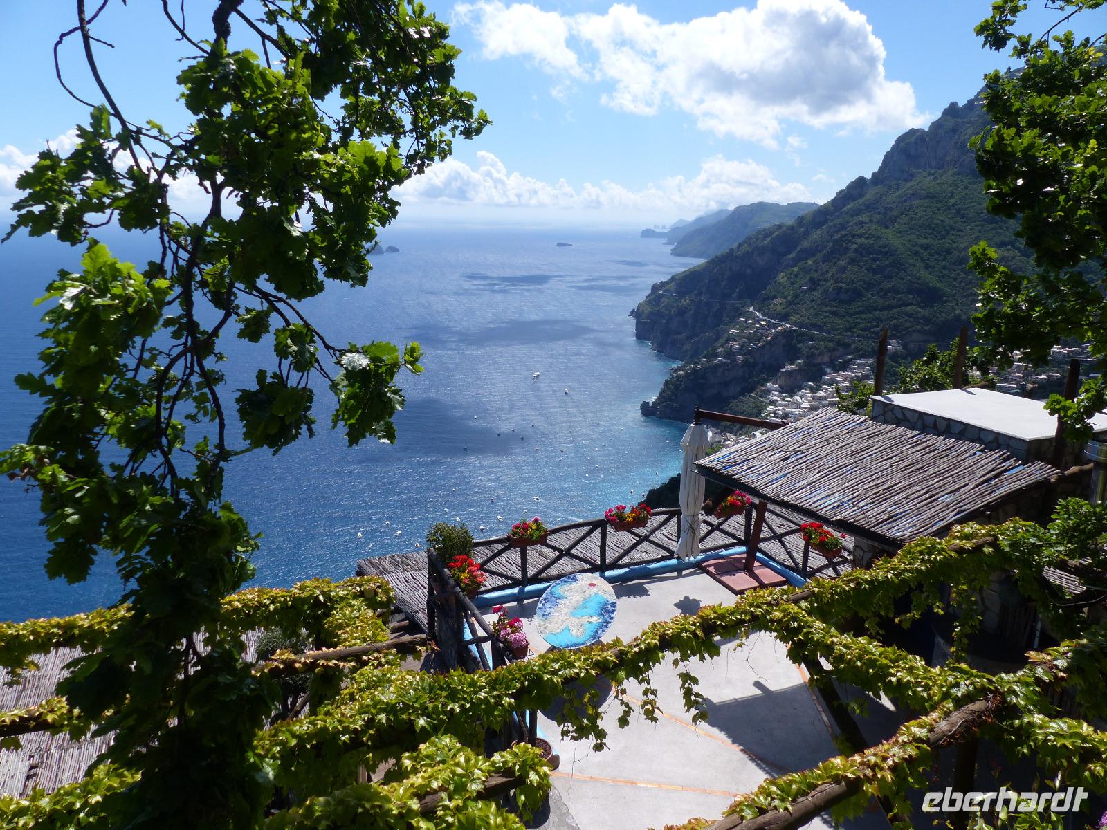 Die Nacht war für einige Gäste etwas kürzer, da uns drei Hotelgäste, die zum Glück an diesem Tag das Hotel verließen, den Schlaf etwas verkürzten. Das Hotel war ausgebucht und alle anderen Hotelgäste waren rücksichtsvolle, angenehme Menschen. Aber wir ließen uns die gute Laune nicht rauben. Auch die Wettervorhersage war mal wieder durchwachsen. Als wir im Bus saßen empfingen uns die Berge zunächst mit Nieselregen. Dieser wich, als wir in Bomerano ausstiegen, trockenem Mausgrau. In Bomerano gönnten wir uns noch einen Kaffee. Dann ging's los. Es waren nur sehr wenige Gruppen hier, denn die meisten blieben wegen der schlechten Wettervorhersage dem Götterpfad fern. Aber das Wetter tat mal wieder nicht das, was es tun sollte laut Meteorologen. Es wurde nämlich bald schon blitzblau! Eine kleine Pause machten wir an einer aussichtsreichen Stelle unter einer Felswand. Nun war die Sonne da. Und der schwierigere Teil der Wanderung begann bei herrlichem Wetter. Die große Pause folgte dann in Nocelle, einem kleinen Weiler, der hoch oben am Hang klebt. Hier erwartete uns mal wieder Leckeres aus der Küche. Mit meinem Hinweis „Wenn Ihr die Toilette besucht vergesst auch die Kamera nicht...", brachte ich einige zum Lachen. Was gibt es denn auf der Toilette zu fotografieren?? Nein, nicht die Toilette ist so interessant. Die Aussicht wenn man vor der Toilette unter der Wäscheleine hindurch geht. Die ist schön... Ja, das ist ne tolle Aussicht. Wir waren uns einig. Niemand wollte Bus fahren, alle wanderten mit mir bis nach Positano hinunter. Olivenhaine, wunderschöne Blumen und kugelrunde Schafe. Und unter uns der bekannte Friedhof von Positano und das blaue Meer. Dann erreichten wir die prächtigen Häuser mit alten Portalen am Ortsrand von Positano. Dort hielt uns ein tolles Violinkonzert in Bann: Lady Gaga und Bradley Cooper haben mit ihrem „Shallow" einen Hit gelandet, den die Welt nicht so schnell vergisst. Diese Musiker hatten daraus ein Violinkonzert gemacht, das wir nicht so schnell vergessen. Wir wurden begeisterte Zaungäste. Am Hafen versammelten wir uns wieder, denn den Rückweg traten wir übers Wasser an. So kamen wir alle auf unsere Kosten, auch abends beim Essen.