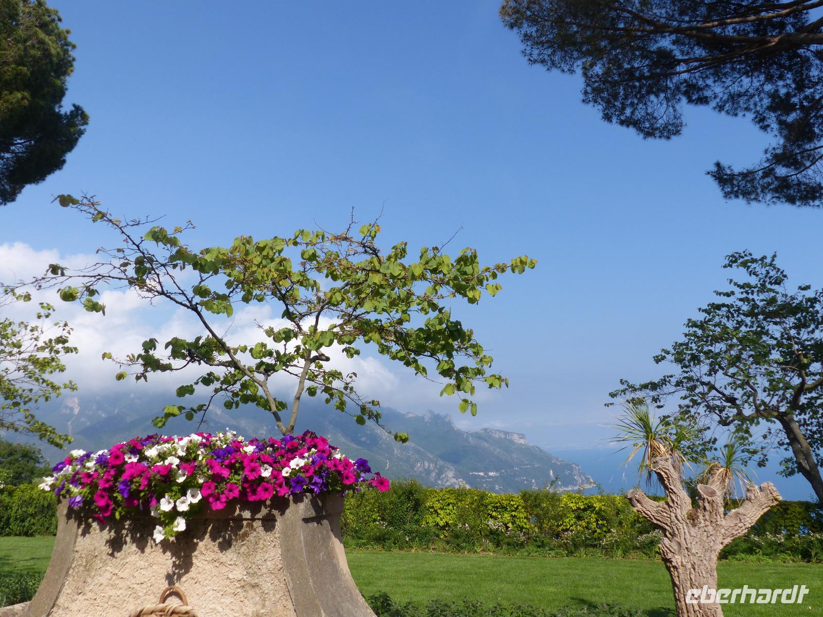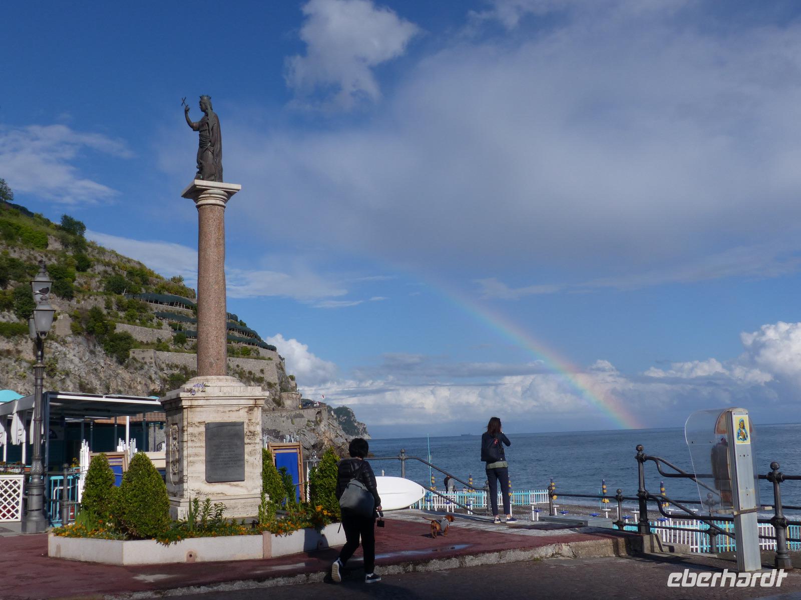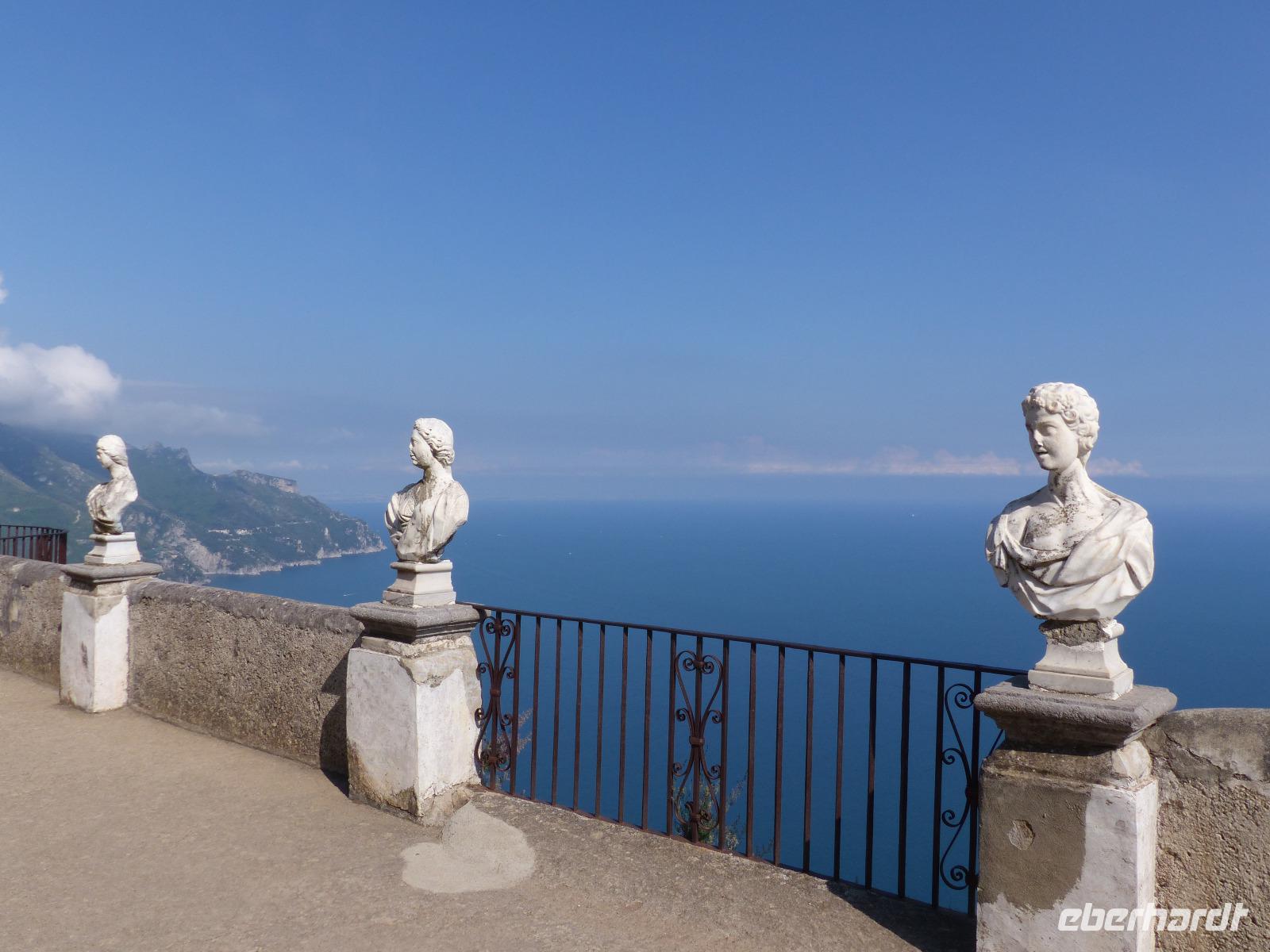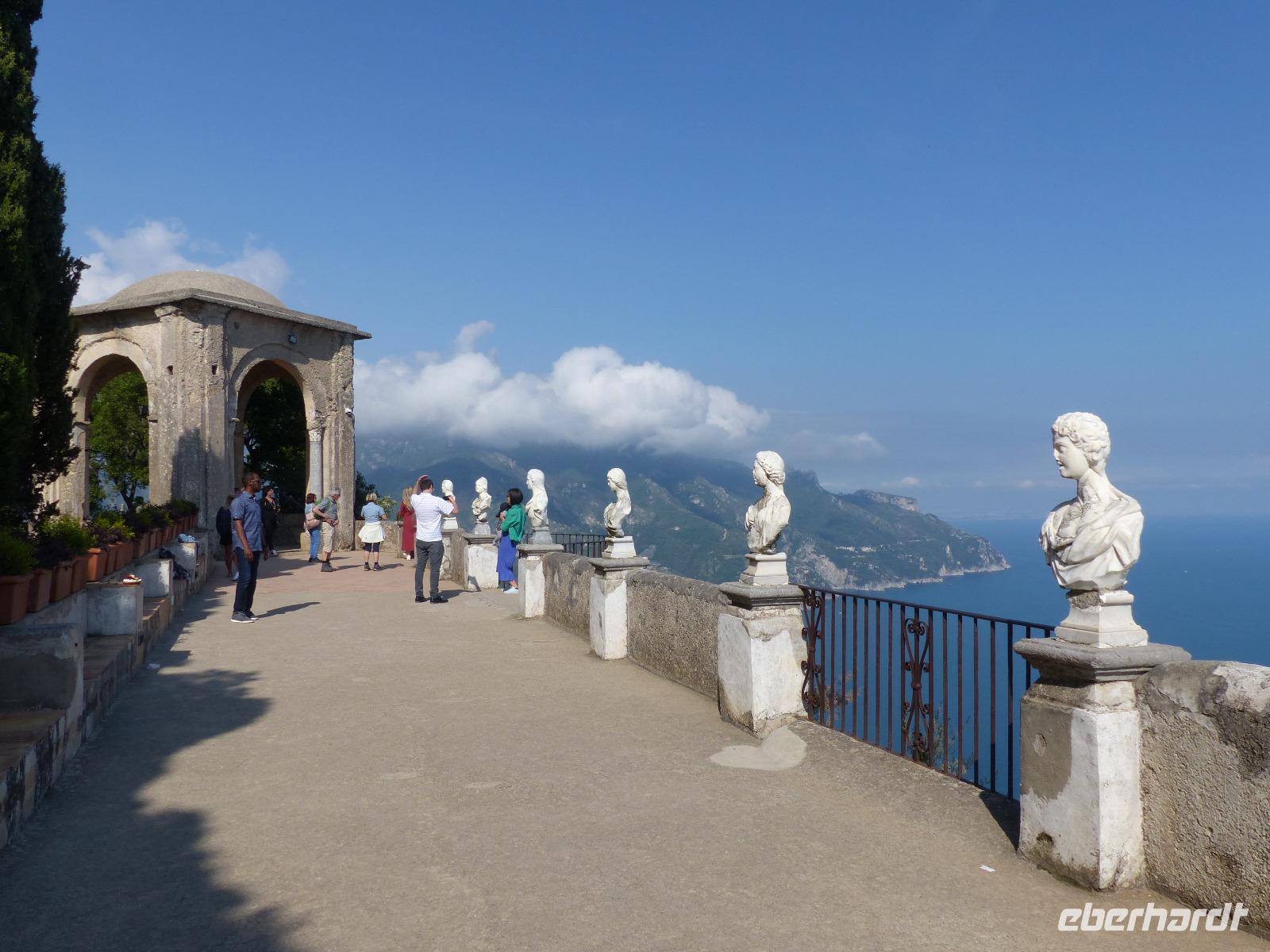 Da ich umgeplant hatte und den Besuch der Villa Cimbrone auf diesen sonnigen Nachmittag geschoben hatte, kam unser Busunternehmen ein bisschen in Verwirrung. „Was, Du willst heute 3 Bustransfers? Ich hatte nicht gedacht, dass Du den am Vormittag auch noch willst..."Und so musste der Sohn des Firmenchefs umplanen und hatte nun die schwierige Aufgabe, uns über schmale Sträßchen nach Campidoglio zu bringen, die er aber mit Bravour löste. Unser Wanderweg schlängelte sich von Campidoglio aus hoch über Ravello am Hang entlang. Dann wanderten wir an Felswänden vorüber in rund 400 m Höhe am Hang entlang zwischen hohen Farnen hindurch. Unten im Tal wurden früher Papiermühlen betrieben, hoch oben in den Bergen standen früher Eisenhütten, die dem oberen Tal den Namen gaben. Hinten im Tal mussten wir bei einem sehr schönen Wasserfall den Bach überqueren, was uns gut gelang. Zur Stärkung hatte ich noch Schokoladen - und Zitronenkekse mitgebracht. Es folgte nun nämlich ein etwas mühsameres Stück. Ein Gast verspührte ein ziemlich starkes Kribbeln im Bauch, aber „with a little help from my friends" (mit ein bisschen Hilfe) schafften es alle auch diese etwas ausgesetzten Stellen hinter sich zu lassen. „Ich hab's geschafft, ich bin ja so stolz auf mich!" Wenn man nicht schwindelfrei ist, kostet diese Wanderung ganz schön viel Überwindung. Gratuliere! Tolle Leistung. Alle freuten sich, dass es geklappt hat. Abwärts durchstreiften wir Esskastanienplantagen. Und wir hatten fast das ganze Tal für uns. In Pogerola wurde uns dann nebst leckerer Antipasti auch noch eine Pizza aufgetischt. Da ich am Montag die Blitze und Gewitter in den Bergen gefürchtet hatte und daher umgeplant hatte, fuhren wir nun am Nachmittag mit dem Bus noch hinauf nach Ravello. An einem Aussichtspunkt fand gerade eine Hochzeit statt. Wir bewunderten die Garderobe der illustren Gäste und zogen weiter zur Villa Cimbrone. Strahlend blaue Aussichten auf die Küste. Hier stand Romy Schneider als Sissi vor der Kamera und nun waren wir da! Zwischen den im Park eingebetteten Plastiken fanden sich einzelne bunte Farbtupfer. Wir genossen die Abendstimmung und kehrten zum Domplatz zurück. Zwischenzeitlich war der Dom wieder geöffnet, der über den Nachmittag geschlossen ist. Und während sich einige Gäste beim Aperol Spritz vergnügten, zog es andere nun in die Kirche. Am Abend, nach unserer Rückkehr nach Minori, gab es noch ein Abschiedsgedicht von mir und unser letztes leckeres Essen im Hotel folgte, bevor wir uns ans Kofferpacken machten.