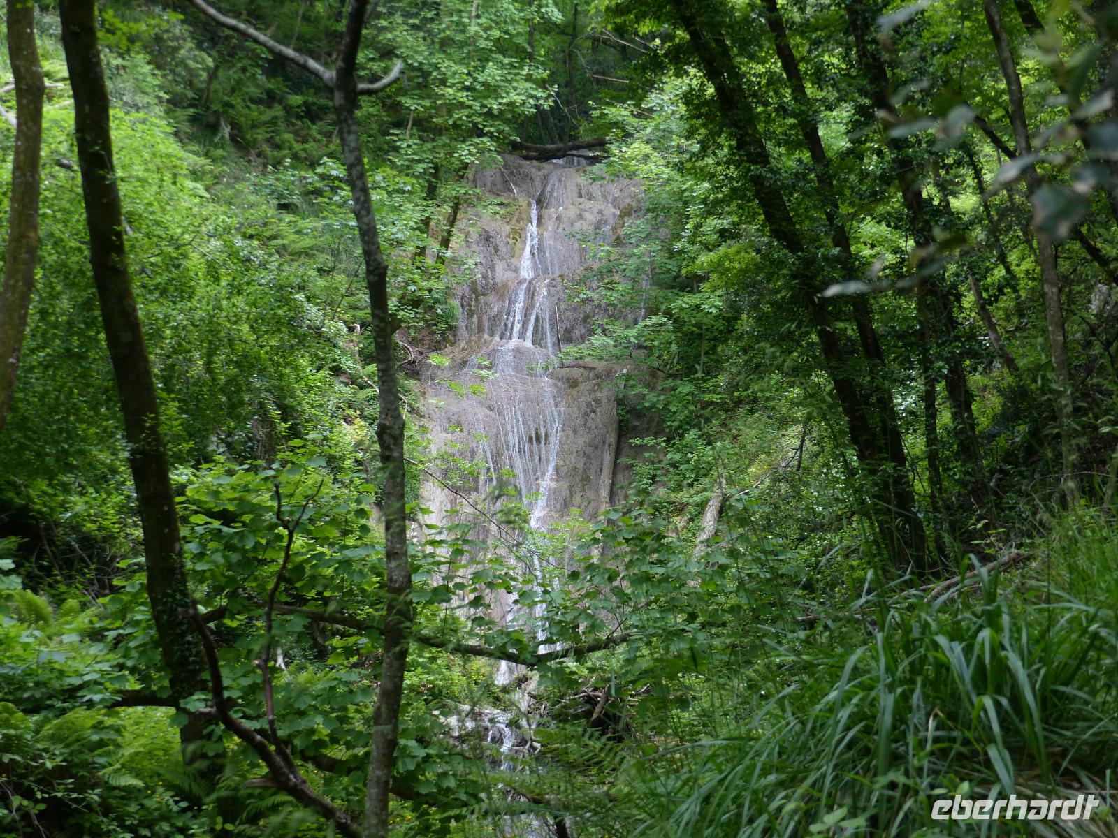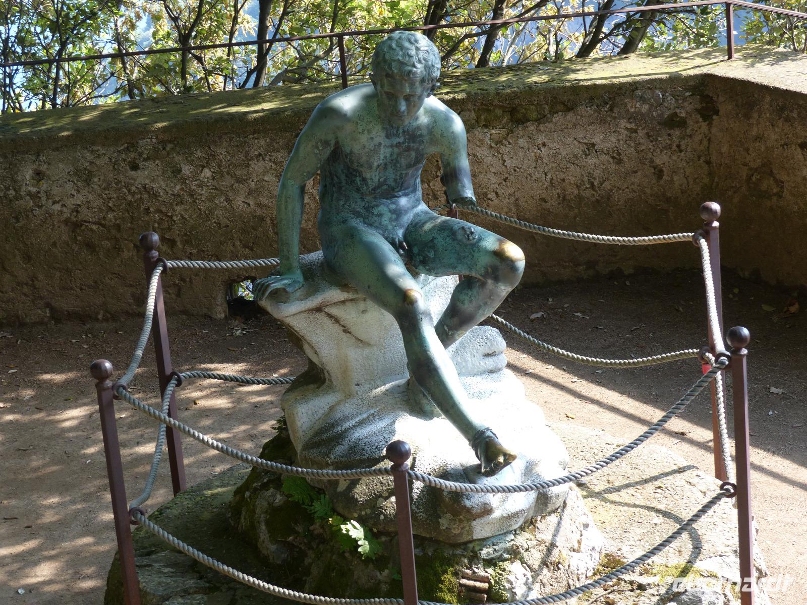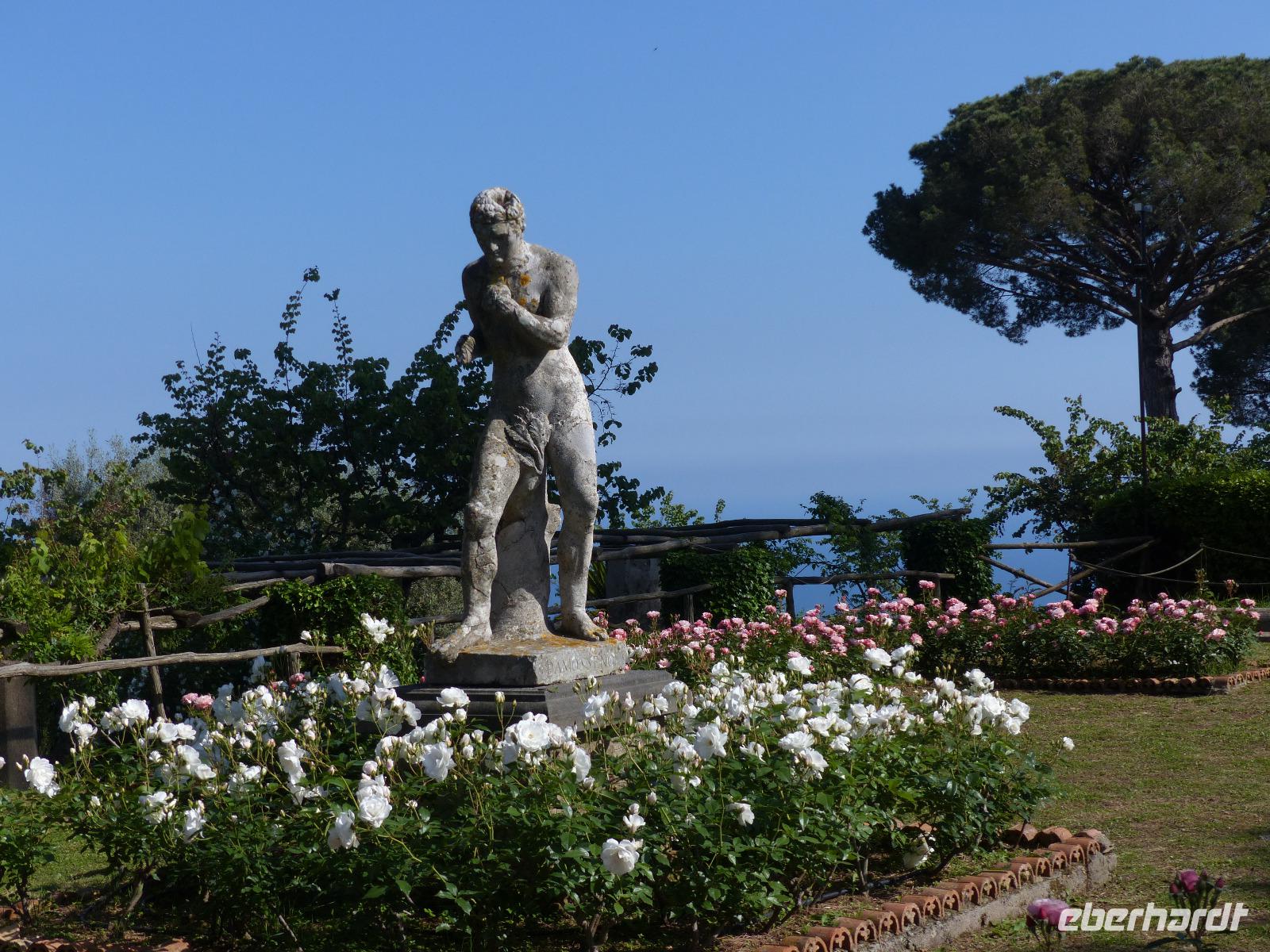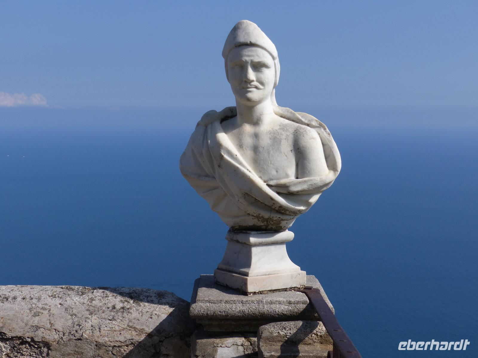 Da ich umgeplant hatte und den Besuch der Villa Cimbrone auf diesen sonnigen Nachmittag geschoben hatte, kam unser Busunternehmen ein bisschen in Verwirrung. „Was, Du willst heute 3 Bustransfers? Ich hatte nicht gedacht, dass Du den am Vormittag auch noch willst..."Und so musste der Sohn des Firmenchefs umplanen und hatte nun die schwierige Aufgabe, uns über schmale Sträßchen nach Campidoglio zu bringen, die er aber mit Bravour löste. Unser Wanderweg schlängelte sich von Campidoglio aus hoch über Ravello am Hang entlang. Dann wanderten wir an Felswänden vorüber in rund 400 m Höhe am Hang entlang zwischen hohen Farnen hindurch. Unten im Tal wurden früher Papiermühlen betrieben, hoch oben in den Bergen standen früher Eisenhütten, die dem oberen Tal den Namen gaben. Hinten im Tal mussten wir bei einem sehr schönen Wasserfall den Bach überqueren, was uns gut gelang. Zur Stärkung hatte ich noch Schokoladen - und Zitronenkekse mitgebracht. Es folgte nun nämlich ein etwas mühsameres Stück. Ein Gast verspührte ein ziemlich starkes Kribbeln im Bauch, aber „with a little help from my friends" (mit ein bisschen Hilfe) schafften es alle auch diese etwas ausgesetzten Stellen hinter sich zu lassen. „Ich hab's geschafft, ich bin ja so stolz auf mich!" Wenn man nicht schwindelfrei ist, kostet diese Wanderung ganz schön viel Überwindung. Gratuliere! Tolle Leistung. Alle freuten sich, dass es geklappt hat. Abwärts durchstreiften wir Esskastanienplantagen. Und wir hatten fast das ganze Tal für uns. In Pogerola wurde uns dann nebst leckerer Antipasti auch noch eine Pizza aufgetischt. Da ich am Montag die Blitze und Gewitter in den Bergen gefürchtet hatte und daher umgeplant hatte, fuhren wir nun am Nachmittag mit dem Bus noch hinauf nach Ravello. An einem Aussichtspunkt fand gerade eine Hochzeit statt. Wir bewunderten die Garderobe der illustren Gäste und zogen weiter zur Villa Cimbrone. Strahlend blaue Aussichten auf die Küste. Hier stand Romy Schneider als Sissi vor der Kamera und nun waren wir da! Zwischen den im Park eingebetteten Plastiken fanden sich einzelne bunte Farbtupfer. Wir genossen die Abendstimmung und kehrten zum Domplatz zurück. Zwischenzeitlich war der Dom wieder geöffnet, der über den Nachmittag geschlossen ist. Und während sich einige Gäste beim Aperol Spritz vergnügten, zog es andere nun in die Kirche. Am Abend, nach unserer Rückkehr nach Minori, gab es noch ein Abschiedsgedicht von mir und unser letztes leckeres Essen im Hotel folgte, bevor wir uns ans Kofferpacken machten.
