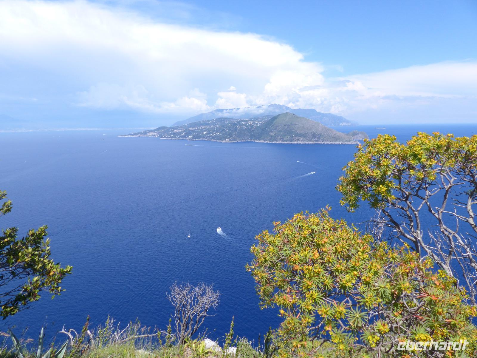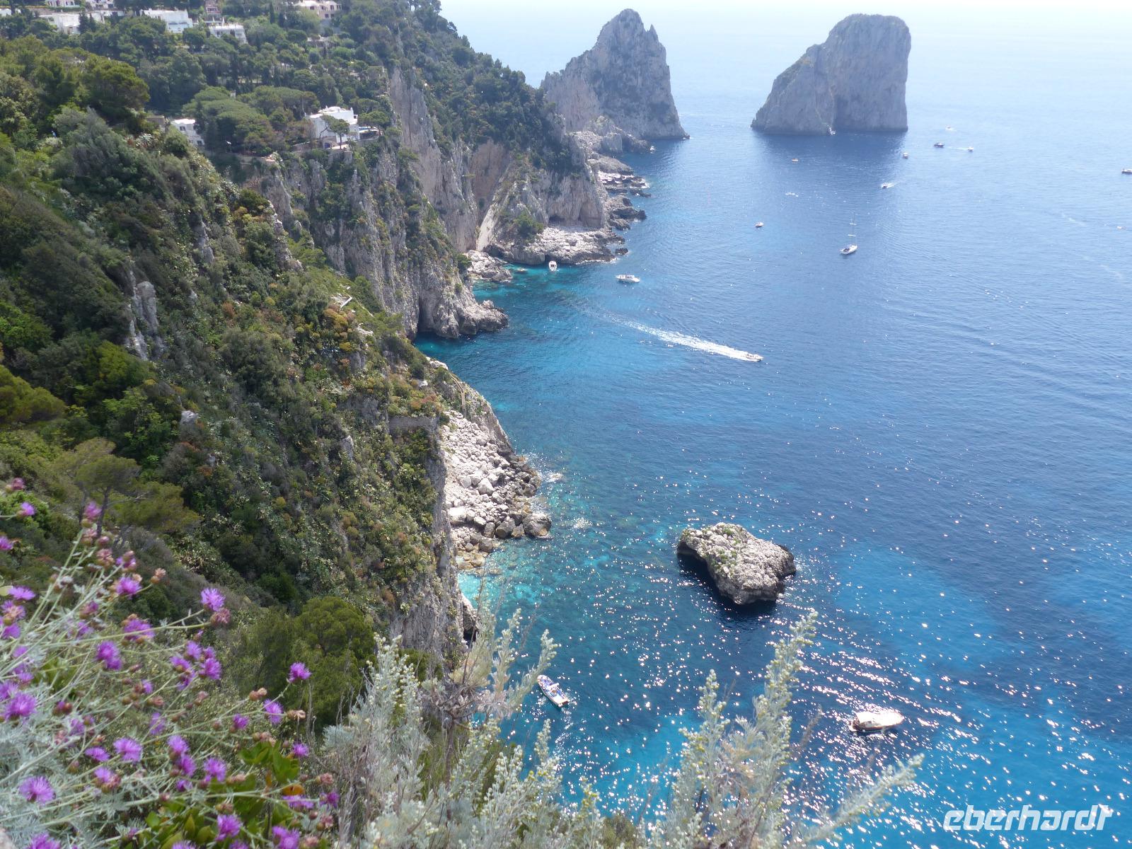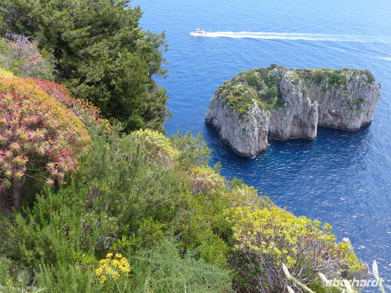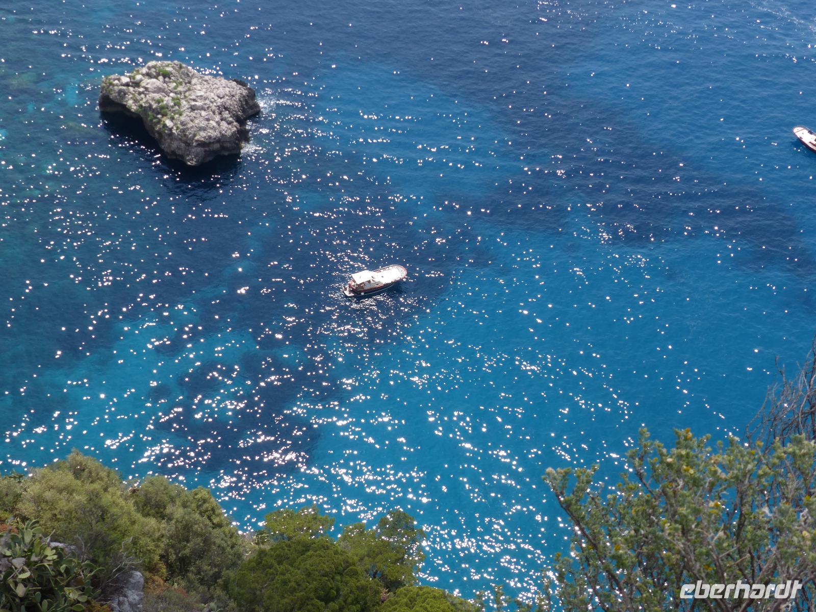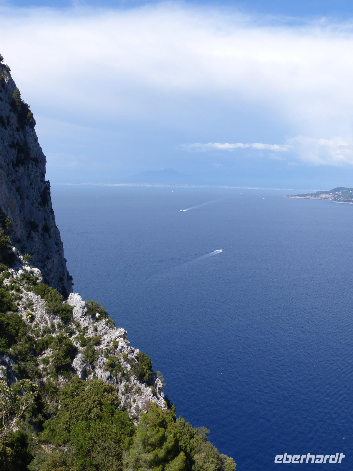 Da einige Gäste die Reise noch um ein paar Tage auf Capri verlängern wollten, nahmen diese sich heute Zeit für einen Bummel durch Amalfi und Ravello. Alle anderen wollten mit mir nach Capri. Und so zogen wir bei blitzblauem Himmel am frühen Morgen los zum Hafen von Minori. Wir konnten alle oben an Deck sitzen. Dann fuhren wir über Amalfi und Positano nach Capri. Herrliches Wetter, Spiegelungen im Wasser, schönes Licht. Das Meer war glatt und wellenlos. Wir fuhren an der Südküste Capris entlang, sahen hinauf zur Villa Malapartes und näherten uns den berühmten Faraglioni-Inseln. Unser Kapitän steuerte gekonnt das Boot durch den natürlichen Felsentunnel der mittleren Insel hindurch. Dann bekamen wir eine Inselumrundung geboten, fuhren am Leuchtturm vorüber zur Westküste, am Eingang der blauen Grotte vorbei bis zum Hafen Marina Grande und gingen an Land. In Marina Grande besorgte ich ein Picknick für uns alle und ab ging's mit der Funicolare aufwärts zum Hauptplatz von Capri. Wir spazierten zu den Augustusgärten und genossen den Ausblick auf die Via Krupp, die sich nach Marina Piccola den Hang hinunter schlängelt. Und ausgerechnet auf dem Areal, das Friedrich Alfred Krupp der Gemeinde Capri geschenkt hatte, ließ diese ein Denkmal für Lenin errichten. Das hätte dem alten Krupp sicher nicht allzu gut gefallen... Das Meer schimmerte in türkisblauen Tönen und wir wanderten los zur Punta Tragara. Für unser Picknick hatten wir eine hübsche Stelle im Halbschatten gefunden. Dann wanderten wir oberhalb der Villa Malaparte vorüber, stiegen hoch zur Grotte Matermania und machten einen Abstecher zum Felsentor Arco Naturale. Und auch hinter dem Felsentor, das da aus den leuchtend grünen Bäumen ragt, schimmerte das Meer blitzblau. Nun wanderten wir zurück nach Capri. Hier trennten wir uns, denn einige Gäste wollten den Nachmittag etwas ruhiger angehen. Die anderen wanderten noch weiter mit mir hoch zur Villa Jovis. Der Weg führt zwischen stattlichen Villen mit hübschen Gärten hindurch. Dann genossen wir die Aussicht auf die Küste vom Palast des römischen Kaisers Tiberius. Er hatte sich schon ein sehr schönes Plätzchen für seinen Sitz ausgesucht! Der Vesuv war von Wolken umgeben, aber die Farben und das Licht waren toll. Und der benachbarte Parco Astarita war geöffnet, was leider nicht immer der Fall ist. Wir waren eine flotte Gruppe und ich hatte schon vorher ein bisschen aufs Tempo gedrückt, so dass uns noch 25 Minuten Zeit blieben, um die tollen Aussichtspunkte, die teils mitten in einer Felswand liegen, die dieser Park bietet, aufzusuchen. Herrliches Blau in Blau! Dann ging's wieder abwärts, an blühenden Gärten vorüber zur Funicolare, die uns wieder abwärts zum Hafen brachte. Am Hafen von Marina Grande trafen wir uns alle wieder und zum Abschluss besorgte ich noch Eis für alle. Danach genossen wir die Abendstimmung dieses herrlichen Tages auf dem Wasser bei unserer Rückreise auf dem Ausflugsboot.