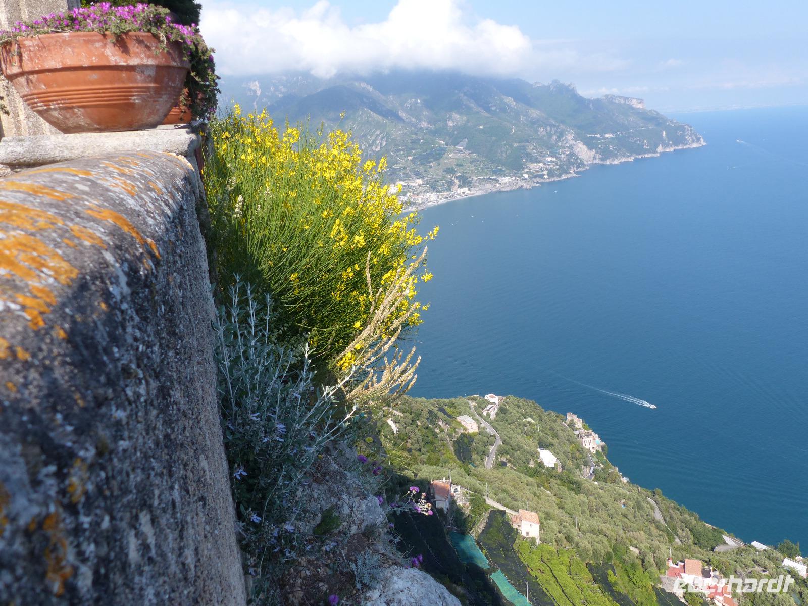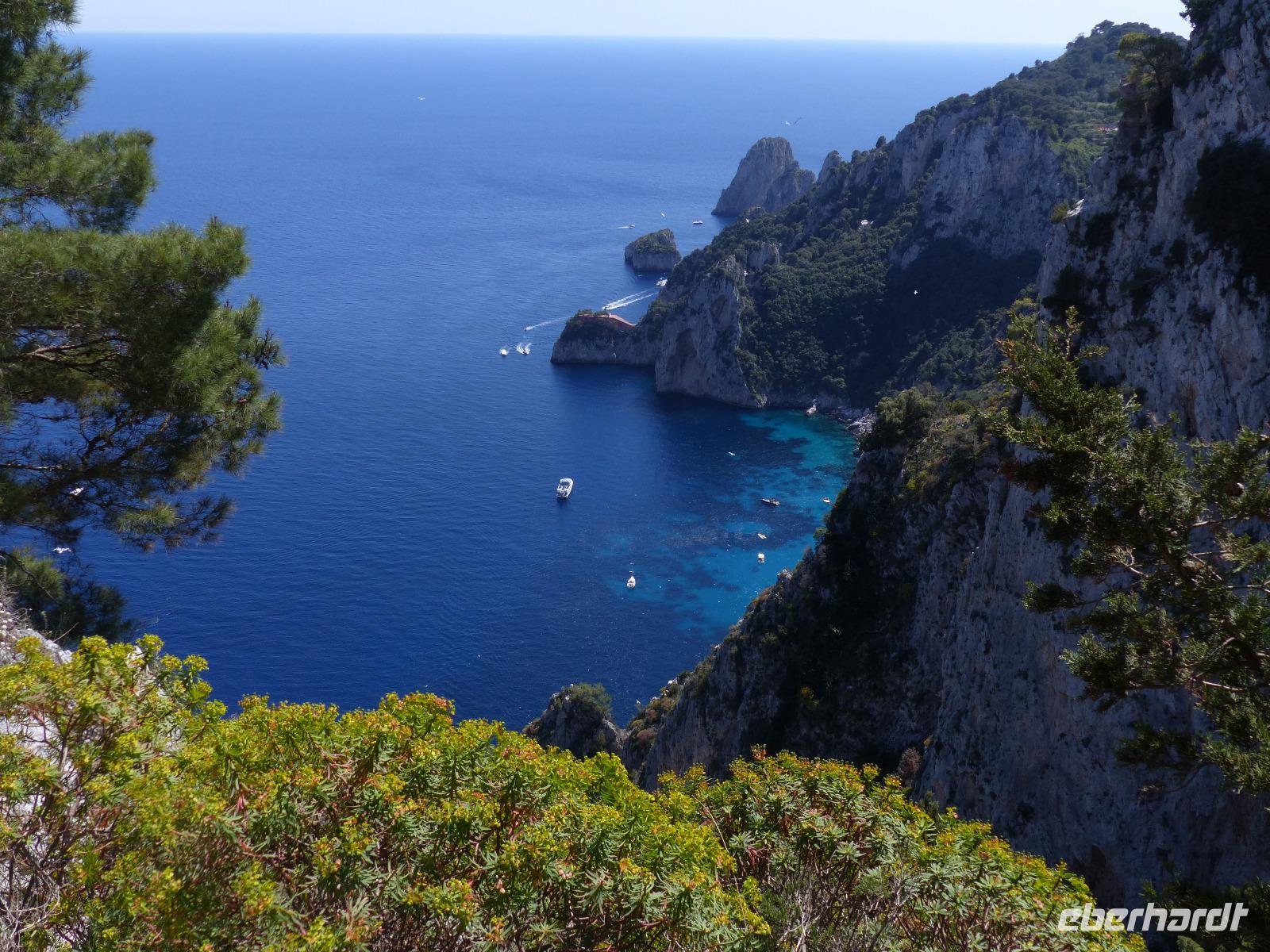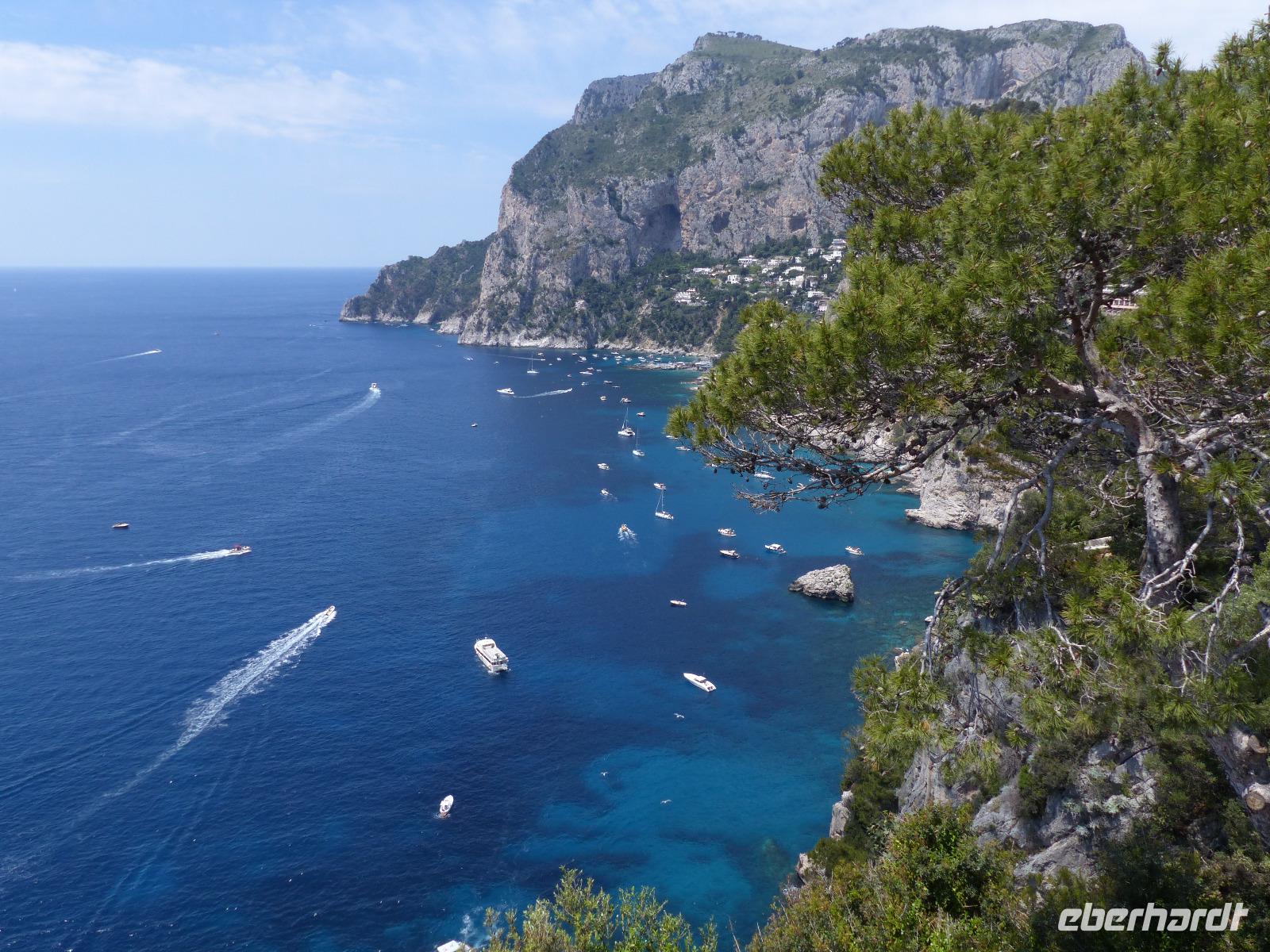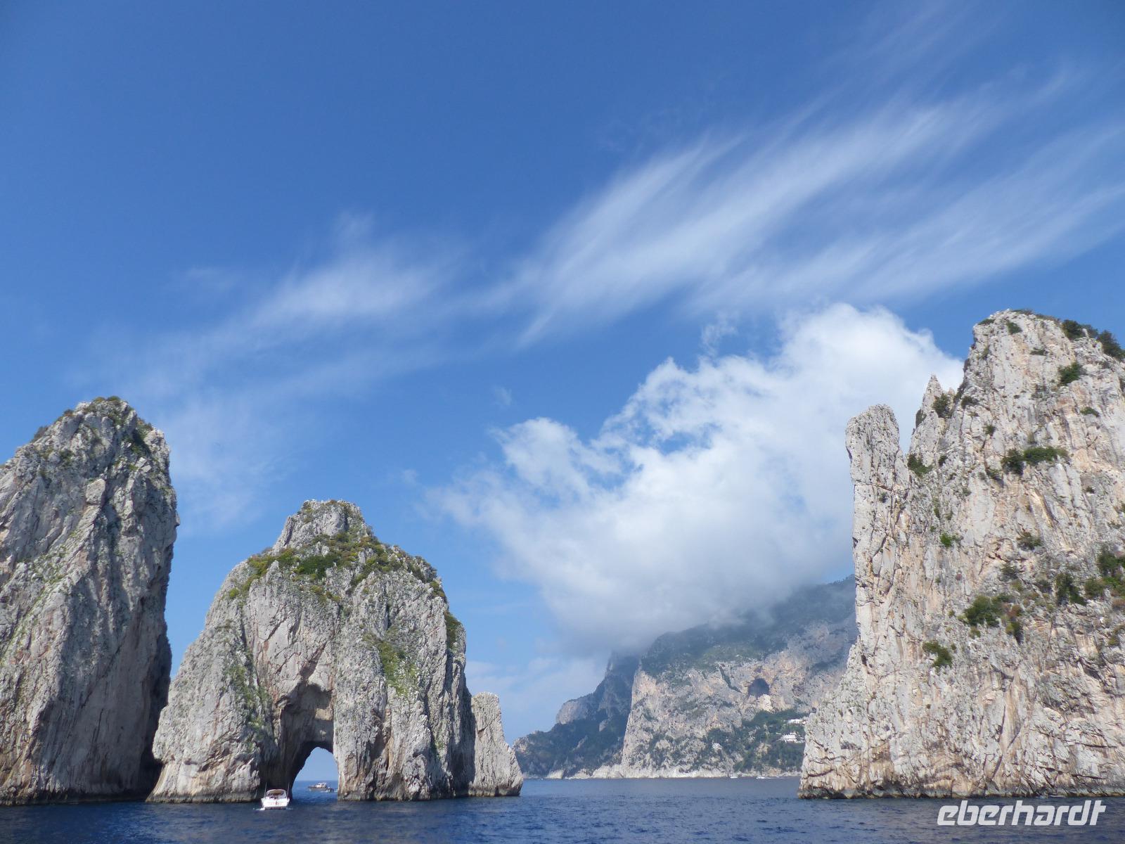 Da einige Gäste die Reise noch um ein paar Tage auf Capri verlängern wollten, nahmen diese sich heute Zeit für einen Bummel durch Amalfi und Ravello. Alle anderen wollten mit mir nach Capri. Und so zogen wir bei blitzblauem Himmel am frühen Morgen los zum Hafen von Minori. Wir konnten alle oben an Deck sitzen. Dann fuhren wir über Amalfi und Positano nach Capri. Herrliches Wetter, Spiegelungen im Wasser, schönes Licht. Das Meer war glatt und wellenlos. Wir fuhren an der Südküste Capris entlang, sahen hinauf zur Villa Malapartes und näherten uns den berühmten Faraglioni-Inseln. Unser Kapitän steuerte gekonnt das Boot durch den natürlichen Felsentunnel der mittleren Insel hindurch. Dann bekamen wir eine Inselumrundung geboten, fuhren am Leuchtturm vorüber zur Westküste, am Eingang der blauen Grotte vorbei bis zum Hafen Marina Grande und gingen an Land. In Marina Grande besorgte ich ein Picknick für uns alle und ab ging's mit der Funicolare aufwärts zum Hauptplatz von Capri. Wir spazierten zu den Augustusgärten und genossen den Ausblick auf die Via Krupp, die sich nach Marina Piccola den Hang hinunter schlängelt. Und ausgerechnet auf dem Areal, das Friedrich Alfred Krupp der Gemeinde Capri geschenkt hatte, ließ diese ein Denkmal für Lenin errichten. Das hätte dem alten Krupp sicher nicht allzu gut gefallen... Das Meer schimmerte in türkisblauen Tönen und wir wanderten los zur Punta Tragara. Für unser Picknick hatten wir eine hübsche Stelle im Halbschatten gefunden. Dann wanderten wir oberhalb der Villa Malaparte vorüber, stiegen hoch zur Grotte Matermania und machten einen Abstecher zum Felsentor Arco Naturale. Und auch hinter dem Felsentor, das da aus den leuchtend grünen Bäumen ragt, schimmerte das Meer blitzblau. Nun wanderten wir zurück nach Capri. Hier trennten wir uns, denn einige Gäste wollten den Nachmittag etwas ruhiger angehen. Die anderen wanderten noch weiter mit mir hoch zur Villa Jovis. Der Weg führt zwischen stattlichen Villen mit hübschen Gärten hindurch. Dann genossen wir die Aussicht auf die Küste vom Palast des römischen Kaisers Tiberius. Er hatte sich schon ein sehr schönes Plätzchen für seinen Sitz ausgesucht! Der Vesuv war von Wolken umgeben, aber die Farben und das Licht waren toll. Und der benachbarte Parco Astarita war geöffnet, was leider nicht immer der Fall ist. Wir waren eine flotte Gruppe und ich hatte schon vorher ein bisschen aufs Tempo gedrückt, so dass uns noch 25 Minuten Zeit blieben, um die tollen Aussichtspunkte, die teils mitten in einer Felswand liegen, die dieser Park bietet, aufzusuchen. Herrliches Blau in Blau! Dann ging's wieder abwärts, an blühenden Gärten vorüber zur Funicolare, die uns wieder abwärts zum Hafen brachte. Am Hafen von Marina Grande trafen wir uns alle wieder und zum Abschluss besorgte ich noch Eis für alle. Danach genossen wir die Abendstimmung dieses herrlichen Tages auf dem Wasser bei unserer Rückreise auf dem Ausflugsboot.