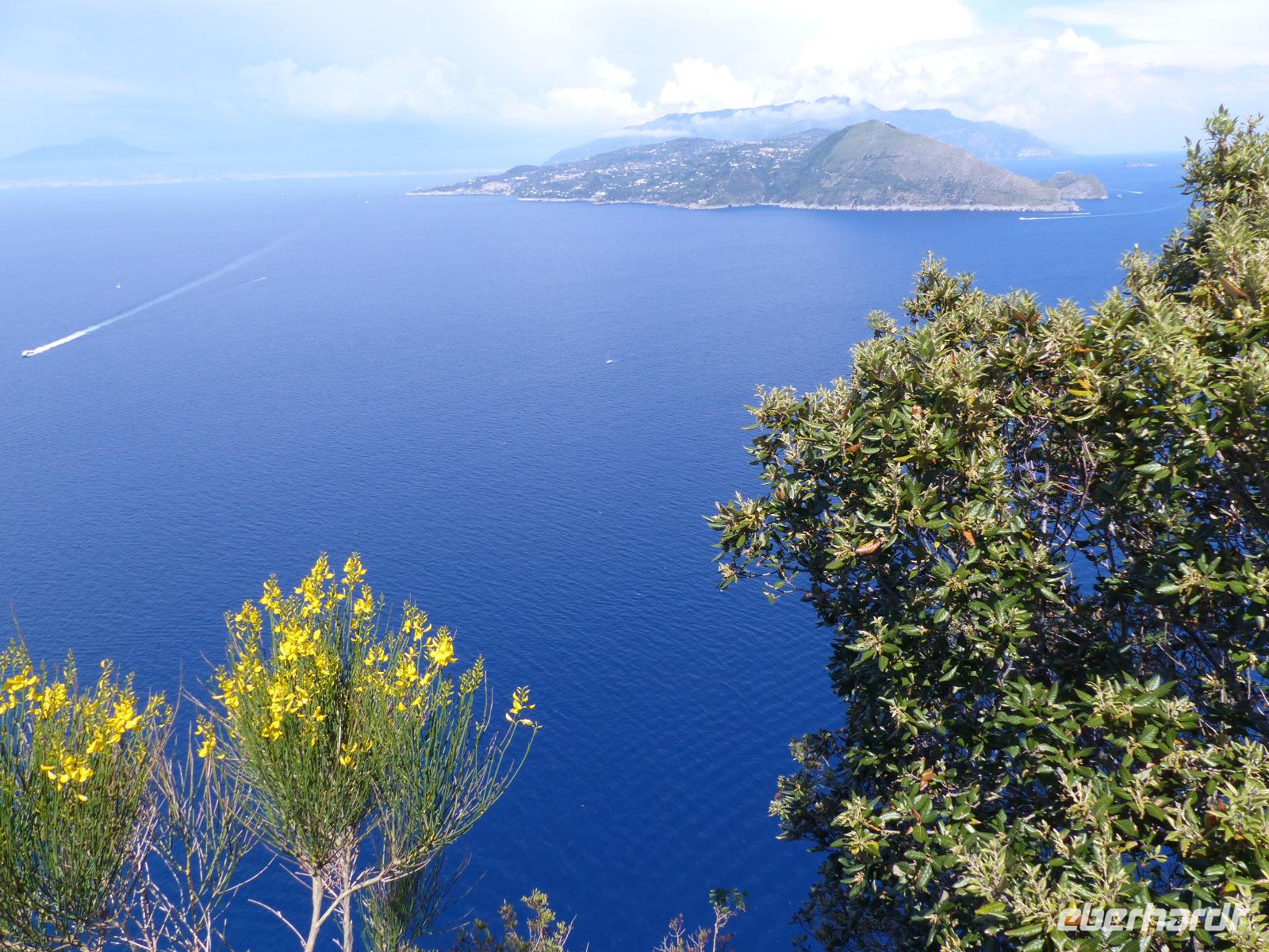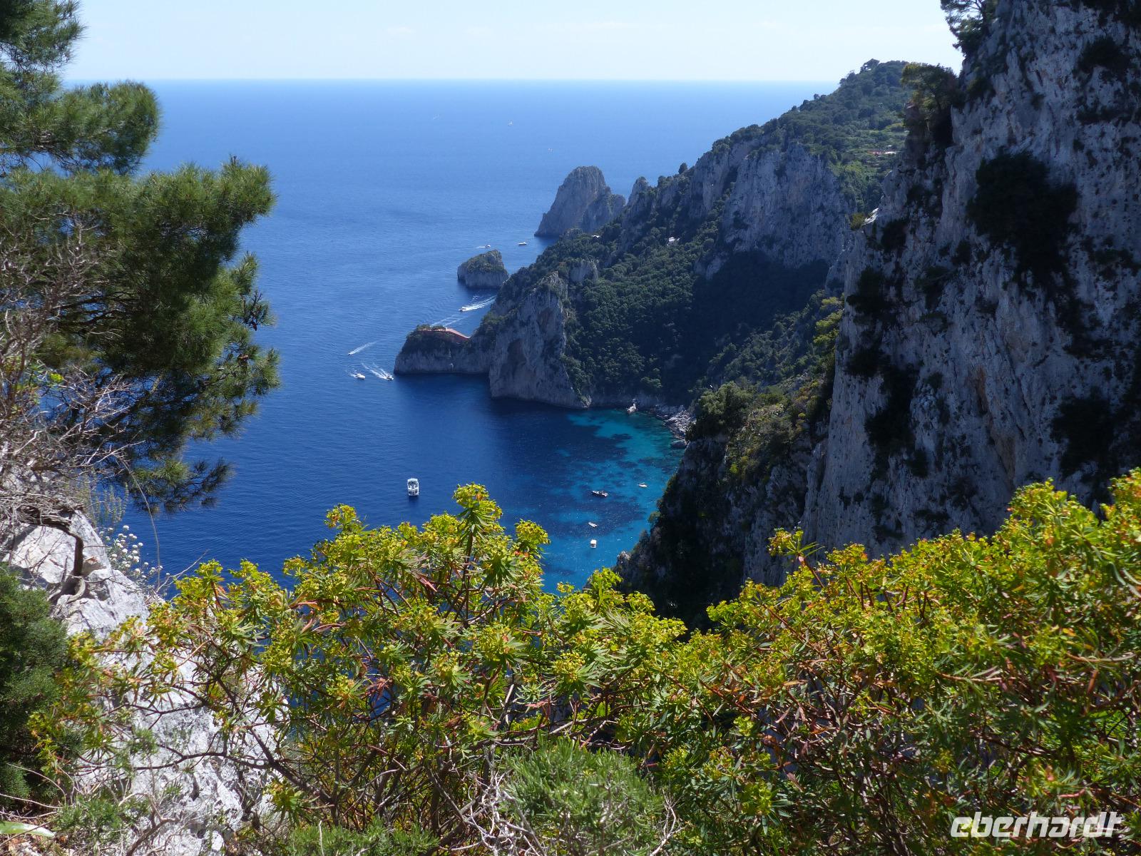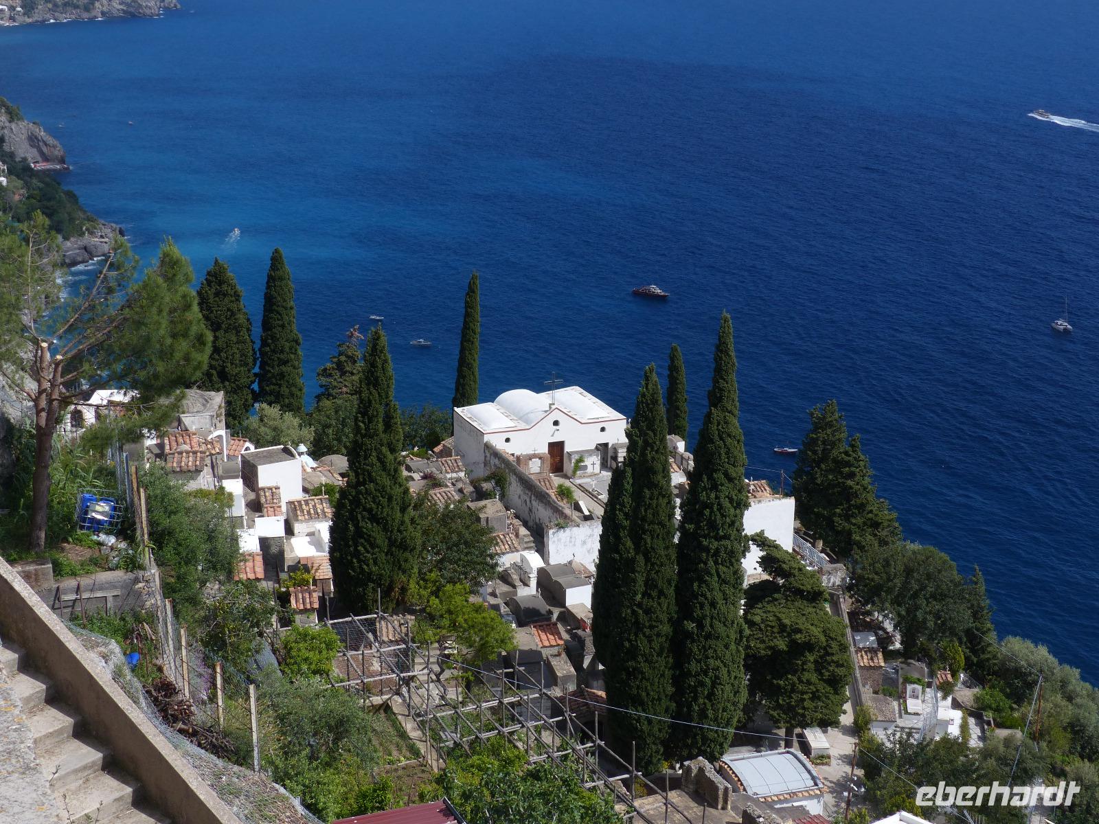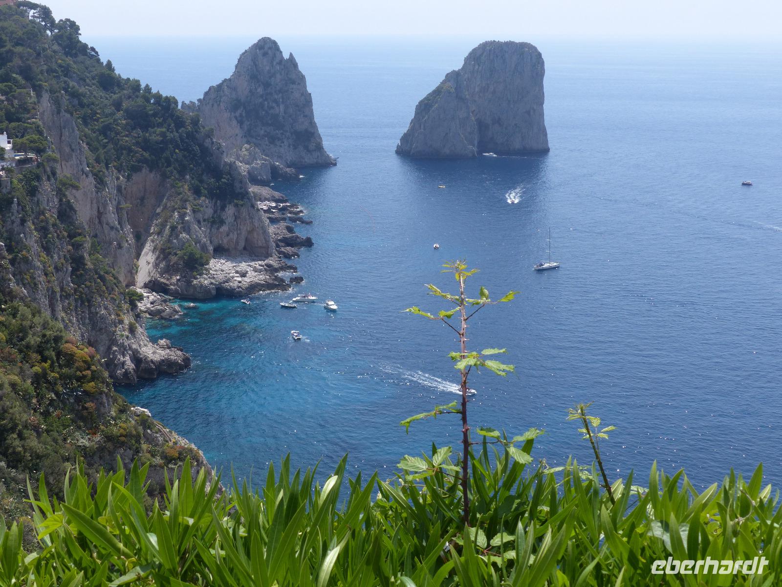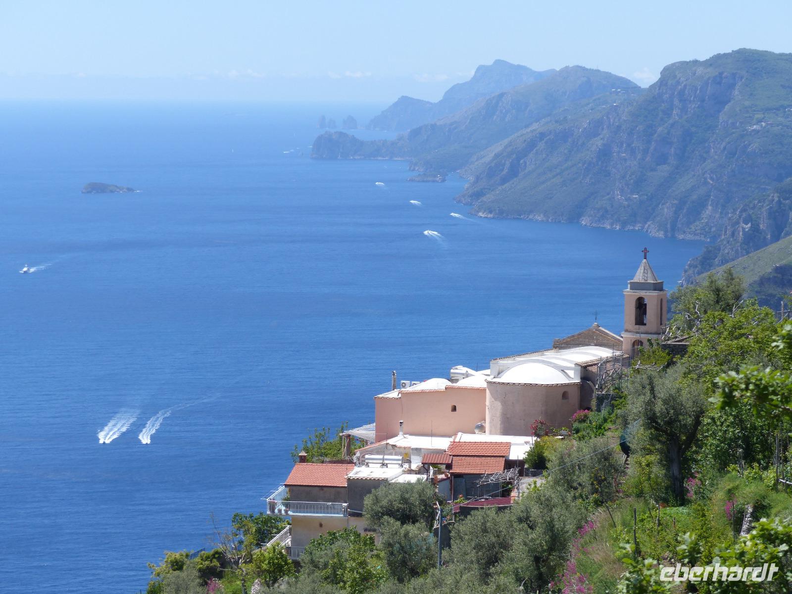 Da einige Gäste die Reise noch um ein paar Tage auf Capri verlängern wollten, nahmen diese sich heute Zeit für einen Bummel durch Amalfi und Ravello. Alle anderen wollten mit mir nach Capri. Und so zogen wir bei blitzblauem Himmel am frühen Morgen los zum Hafen von Minori. Wir konnten alle oben an Deck sitzen. Dann fuhren wir über Amalfi und Positano nach Capri. Herrliches Wetter, Spiegelungen im Wasser, schönes Licht. Das Meer war glatt und wellenlos. Wir fuhren an der Südküste Capris entlang, sahen hinauf zur Villa Malapartes und näherten uns den berühmten Faraglioni-Inseln. Unser Kapitän steuerte gekonnt das Boot durch den natürlichen Felsentunnel der mittleren Insel hindurch. Dann bekamen wir eine Inselumrundung geboten, fuhren am Leuchtturm vorüber zur Westküste, am Eingang der blauen Grotte vorbei bis zum Hafen Marina Grande und gingen an Land. In Marina Grande besorgte ich ein Picknick für uns alle und ab ging's mit der Funicolare aufwärts zum Hauptplatz von Capri. Wir spazierten zu den Augustusgärten und genossen den Ausblick auf die Via Krupp, die sich nach Marina Piccola den Hang hinunter schlängelt. Und ausgerechnet auf dem Areal, das Friedrich Alfred Krupp der Gemeinde Capri geschenkt hatte, ließ diese ein Denkmal für Lenin errichten. Das hätte dem alten Krupp sicher nicht allzu gut gefallen... Das Meer schimmerte in türkisblauen Tönen und wir wanderten los zur Punta Tragara. Für unser Picknick hatten wir eine hübsche Stelle im Halbschatten gefunden. Dann wanderten wir oberhalb der Villa Malaparte vorüber, stiegen hoch zur Grotte Matermania und machten einen Abstecher zum Felsentor Arco Naturale. Und auch hinter dem Felsentor, das da aus den leuchtend grünen Bäumen ragt, schimmerte das Meer blitzblau. Nun wanderten wir zurück nach Capri. Hier trennten wir uns, denn einige Gäste wollten den Nachmittag etwas ruhiger angehen. Die anderen wanderten noch weiter mit mir hoch zur Villa Jovis. Der Weg führt zwischen stattlichen Villen mit hübschen Gärten hindurch. Dann genossen wir die Aussicht auf die Küste vom Palast des römischen Kaisers Tiberius. Er hatte sich schon ein sehr schönes Plätzchen für seinen Sitz ausgesucht! Der Vesuv war von Wolken umgeben, aber die Farben und das Licht waren toll. Und der benachbarte Parco Astarita war geöffnet, was leider nicht immer der Fall ist. Wir waren eine flotte Gruppe und ich hatte schon vorher ein bisschen aufs Tempo gedrückt, so dass uns noch 25 Minuten Zeit blieben, um die tollen Aussichtspunkte, die teils mitten in einer Felswand liegen, die dieser Park bietet, aufzusuchen. Herrliches Blau in Blau! Dann ging's wieder abwärts, an blühenden Gärten vorüber zur Funicolare, die uns wieder abwärts zum Hafen brachte. Am Hafen von Marina Grande trafen wir uns alle wieder und zum Abschluss besorgte ich noch Eis für alle. Danach genossen wir die Abendstimmung dieses herrlichen Tages auf dem Wasser bei unserer Rückreise auf dem Ausflugsboot.