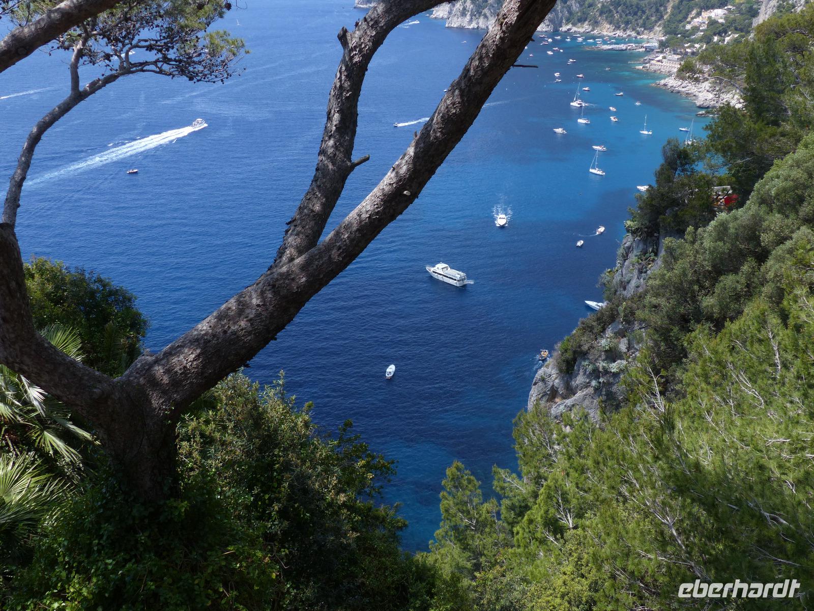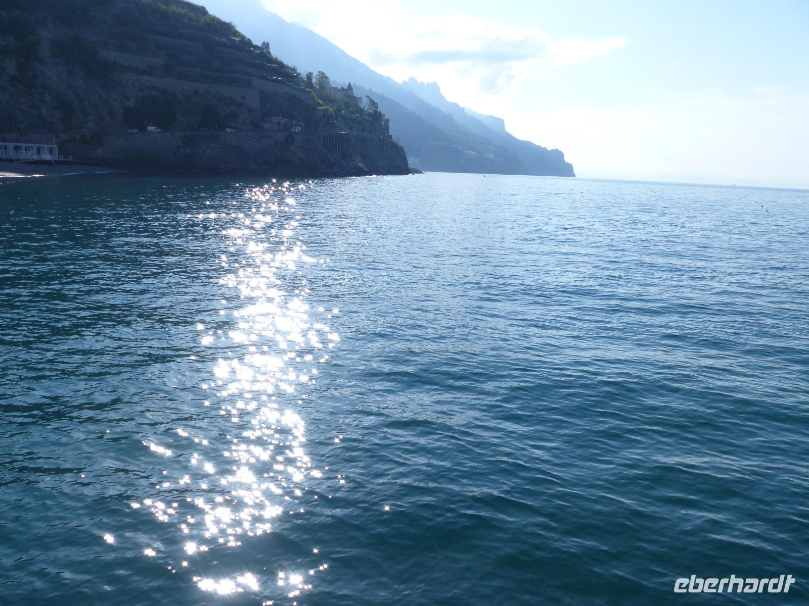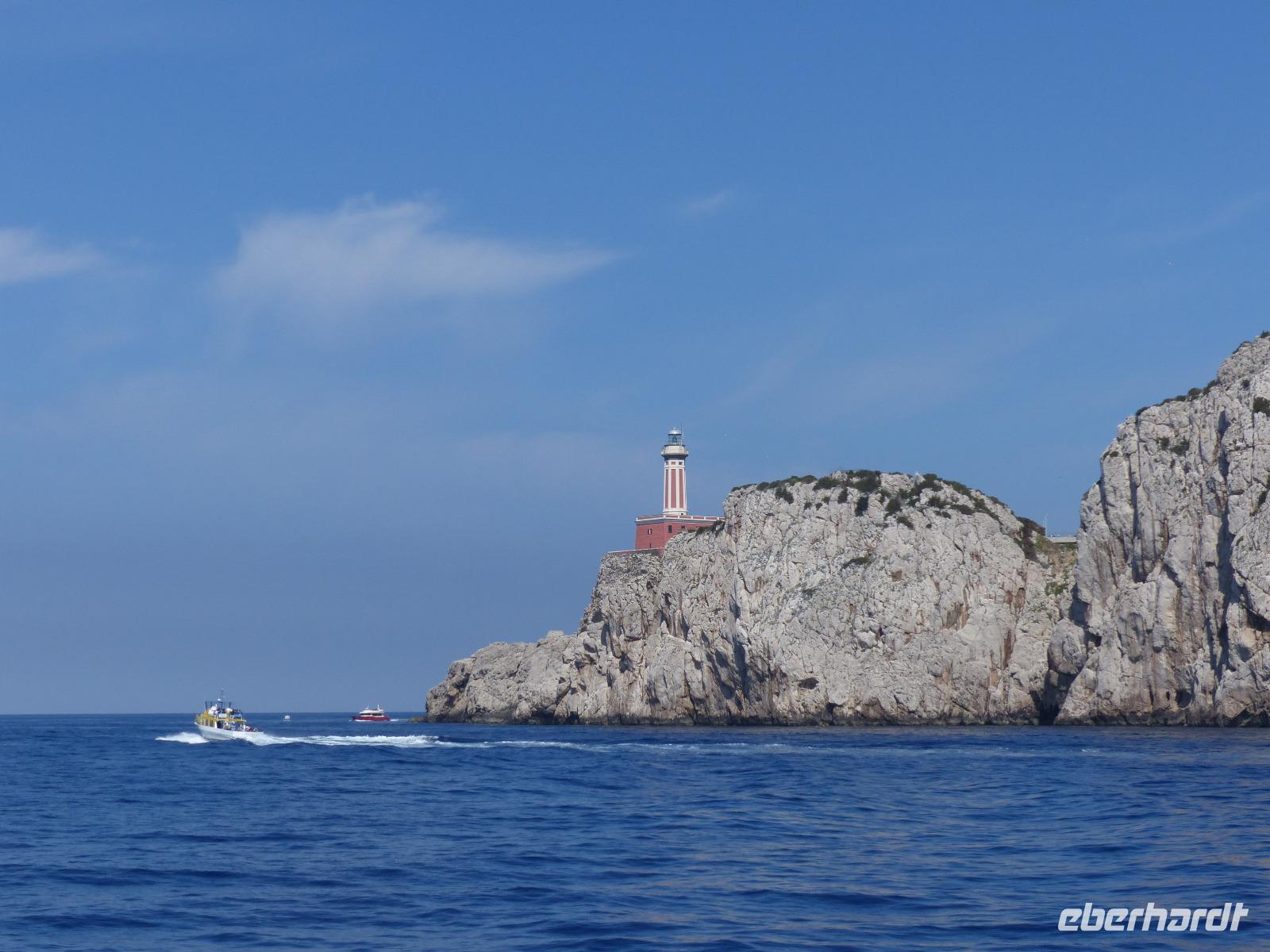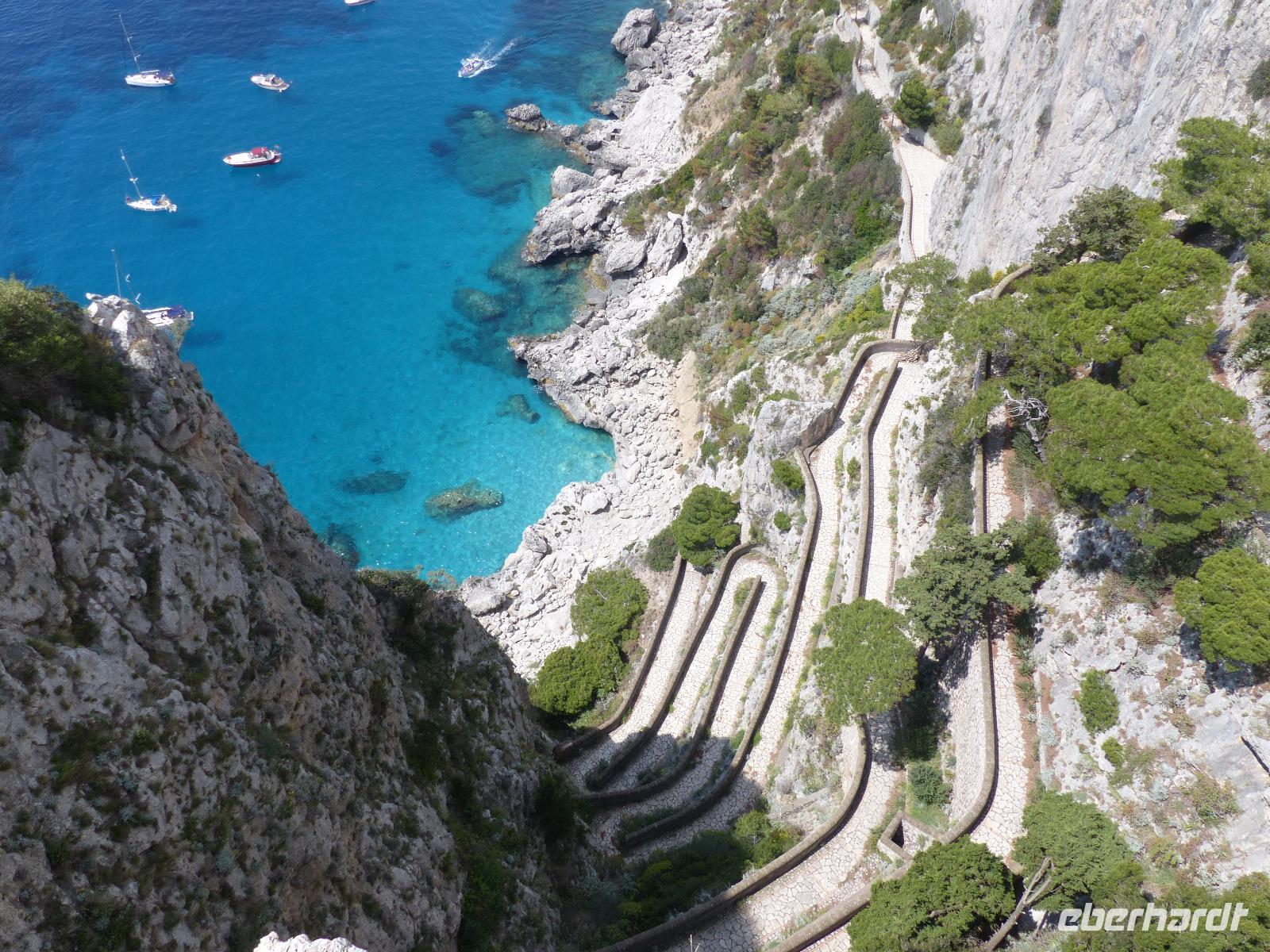 Da einige Gäste die Reise noch um ein paar Tage auf Capri verlängern wollten, nahmen diese sich heute Zeit für einen Bummel durch Amalfi und Ravello. Alle anderen wollten mit mir nach Capri. Und so zogen wir bei blitzblauem Himmel am frühen Morgen los zum Hafen von Minori. Wir konnten alle oben an Deck sitzen. Dann fuhren wir über Amalfi und Positano nach Capri. Herrliches Wetter, Spiegelungen im Wasser, schönes Licht. Das Meer war glatt und wellenlos. Wir fuhren an der Südküste Capris entlang, sahen hinauf zur Villa Malapartes und näherten uns den berühmten Faraglioni-Inseln. Unser Kapitän steuerte gekonnt das Boot durch den natürlichen Felsentunnel der mittleren Insel hindurch. Dann bekamen wir eine Inselumrundung geboten, fuhren am Leuchtturm vorüber zur Westküste, am Eingang der blauen Grotte vorbei bis zum Hafen Marina Grande und gingen an Land. In Marina Grande besorgte ich ein Picknick für uns alle und ab ging's mit der Funicolare aufwärts zum Hauptplatz von Capri. Wir spazierten zu den Augustusgärten und genossen den Ausblick auf die Via Krupp, die sich nach Marina Piccola den Hang hinunter schlängelt. Und ausgerechnet auf dem Areal, das Friedrich Alfred Krupp der Gemeinde Capri geschenkt hatte, ließ diese ein Denkmal für Lenin errichten. Das hätte dem alten Krupp sicher nicht allzu gut gefallen... Das Meer schimmerte in türkisblauen Tönen und wir wanderten los zur Punta Tragara. Für unser Picknick hatten wir eine hübsche Stelle im Halbschatten gefunden. Dann wanderten wir oberhalb der Villa Malaparte vorüber, stiegen hoch zur Grotte Matermania und machten einen Abstecher zum Felsentor Arco Naturale. Und auch hinter dem Felsentor, das da aus den leuchtend grünen Bäumen ragt, schimmerte das Meer blitzblau. Nun wanderten wir zurück nach Capri. Hier trennten wir uns, denn einige Gäste wollten den Nachmittag etwas ruhiger angehen. Die anderen wanderten noch weiter mit mir hoch zur Villa Jovis. Der Weg führt zwischen stattlichen Villen mit hübschen Gärten hindurch. Dann genossen wir die Aussicht auf die Küste vom Palast des römischen Kaisers Tiberius. Er hatte sich schon ein sehr schönes Plätzchen für seinen Sitz ausgesucht! Der Vesuv war von Wolken umgeben, aber die Farben und das Licht waren toll. Und der benachbarte Parco Astarita war geöffnet, was leider nicht immer der Fall ist. Wir waren eine flotte Gruppe und ich hatte schon vorher ein bisschen aufs Tempo gedrückt, so dass uns noch 25 Minuten Zeit blieben, um die tollen Aussichtspunkte, die teils mitten in einer Felswand liegen, die dieser Park bietet, aufzusuchen. Herrliches Blau in Blau! Dann ging's wieder abwärts, an blühenden Gärten vorüber zur Funicolare, die uns wieder abwärts zum Hafen brachte. Am Hafen von Marina Grande trafen wir uns alle wieder und zum Abschluss besorgte ich noch Eis für alle. Danach genossen wir die Abendstimmung dieses herrlichen Tages auf dem Wasser bei unserer Rückreise auf dem Ausflugsboot.
